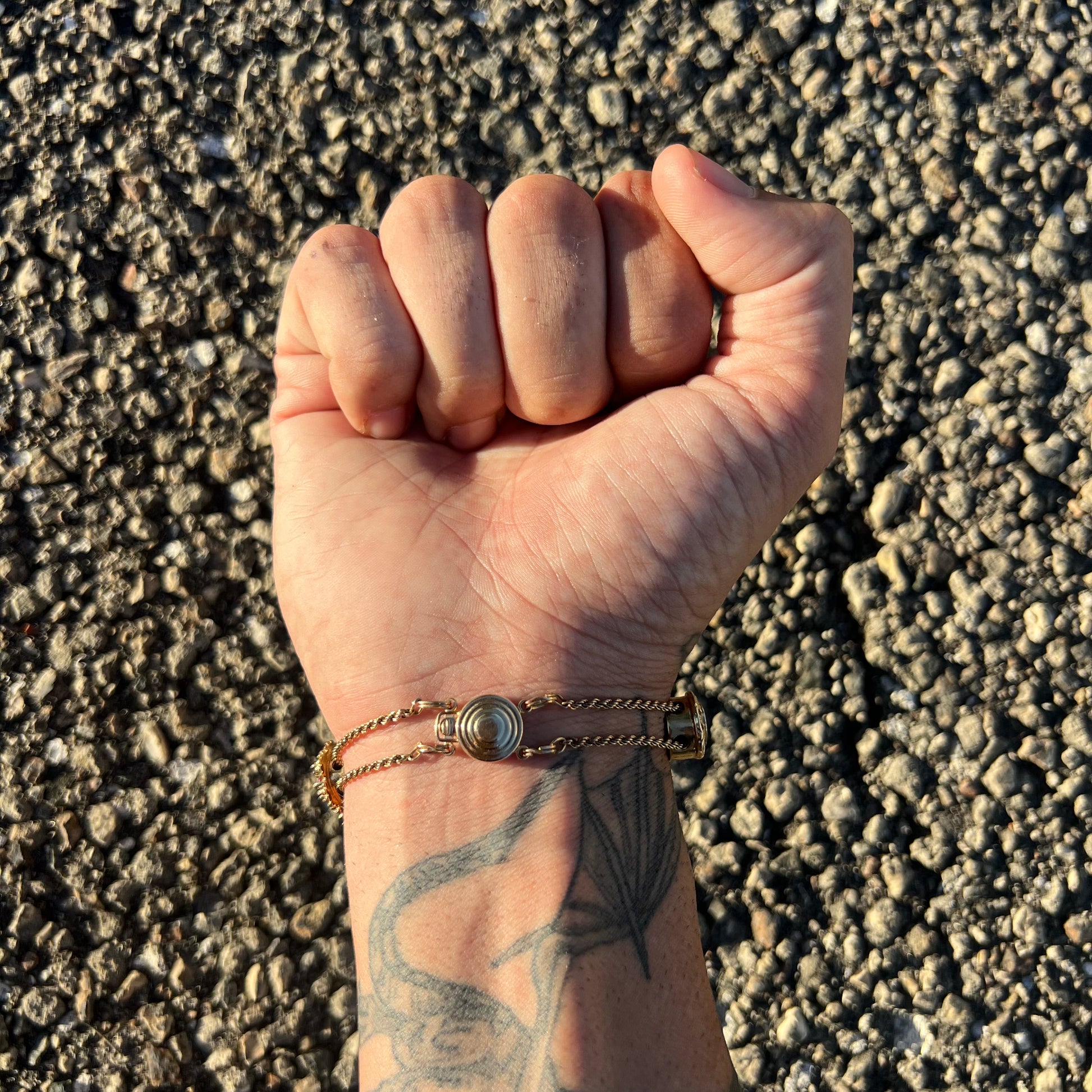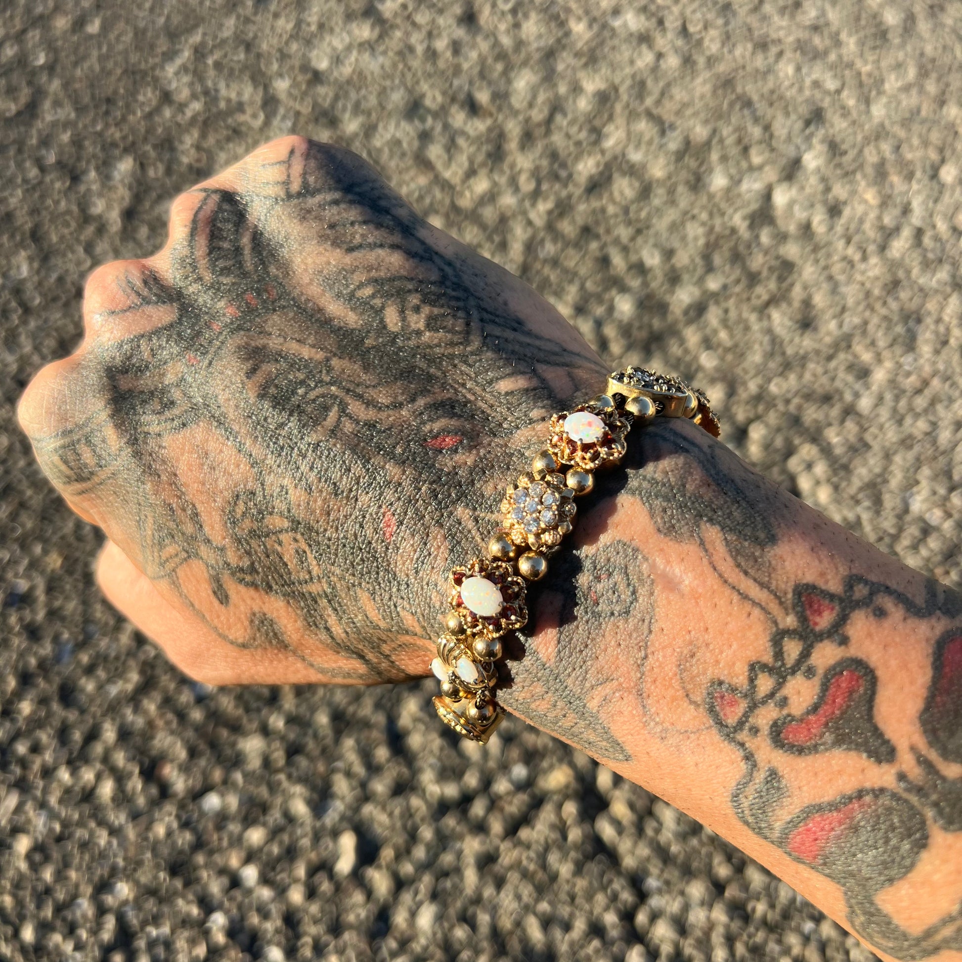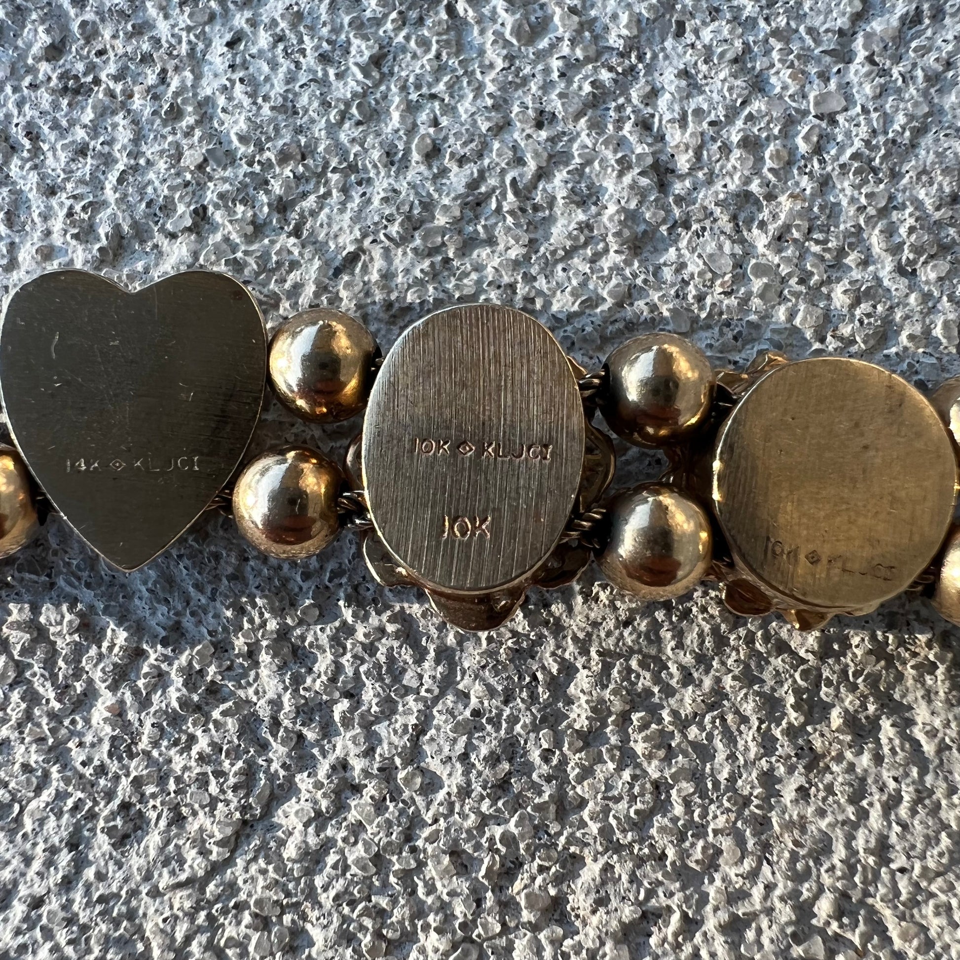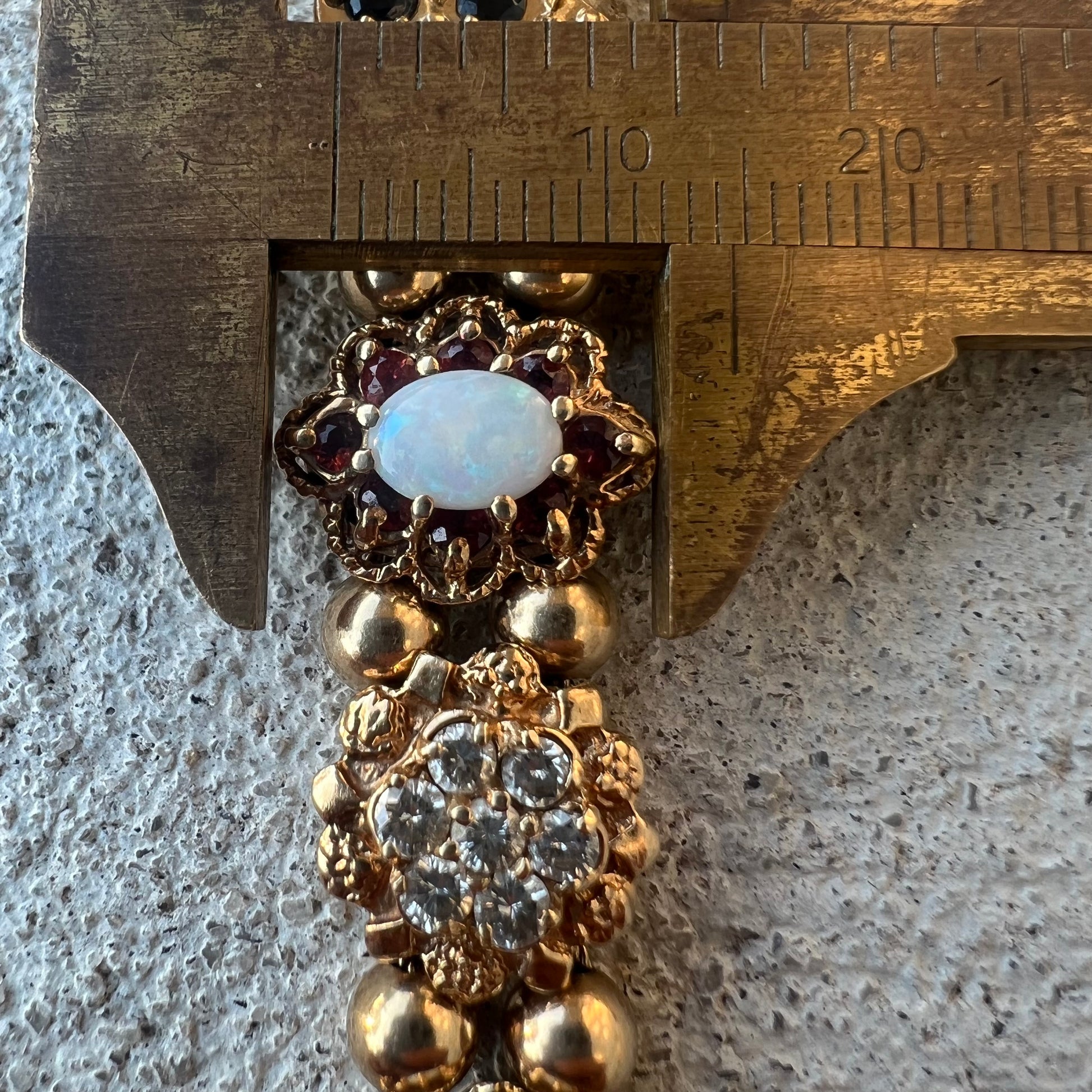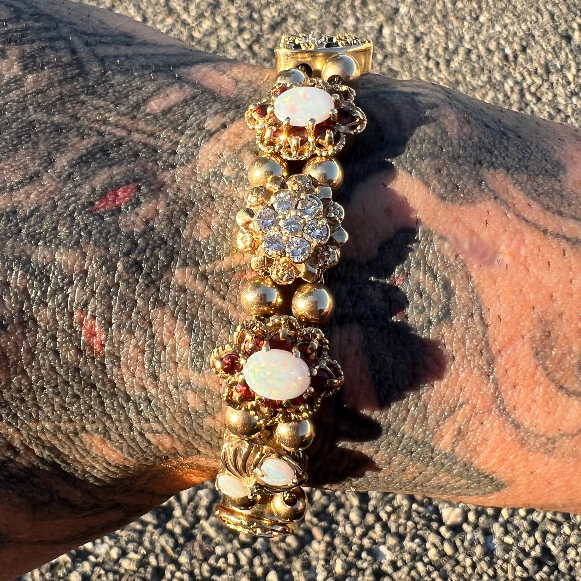 Coveted among jewelry connoisseur’s all around the world are these vintage slider bracelets by KLJCI. Just each slide on this bracelet sells for a minimum of $300 on the resale market with others selling for over $500. With a total of 7 yellow gold slides consisting of 14k and 10k natural multi precious stones. Diamonds, opals, sapphire, Ruby, and garnets a with yellow gold beads for spacing each slider from one another. Keep it as it is or collect and buy more slides to add to your bracelet making it your own. The bracelet it’s self is solid 14k yellow gold measuring 7.5” and each slide around 10-14mm while it weighing a total of 23.5g.