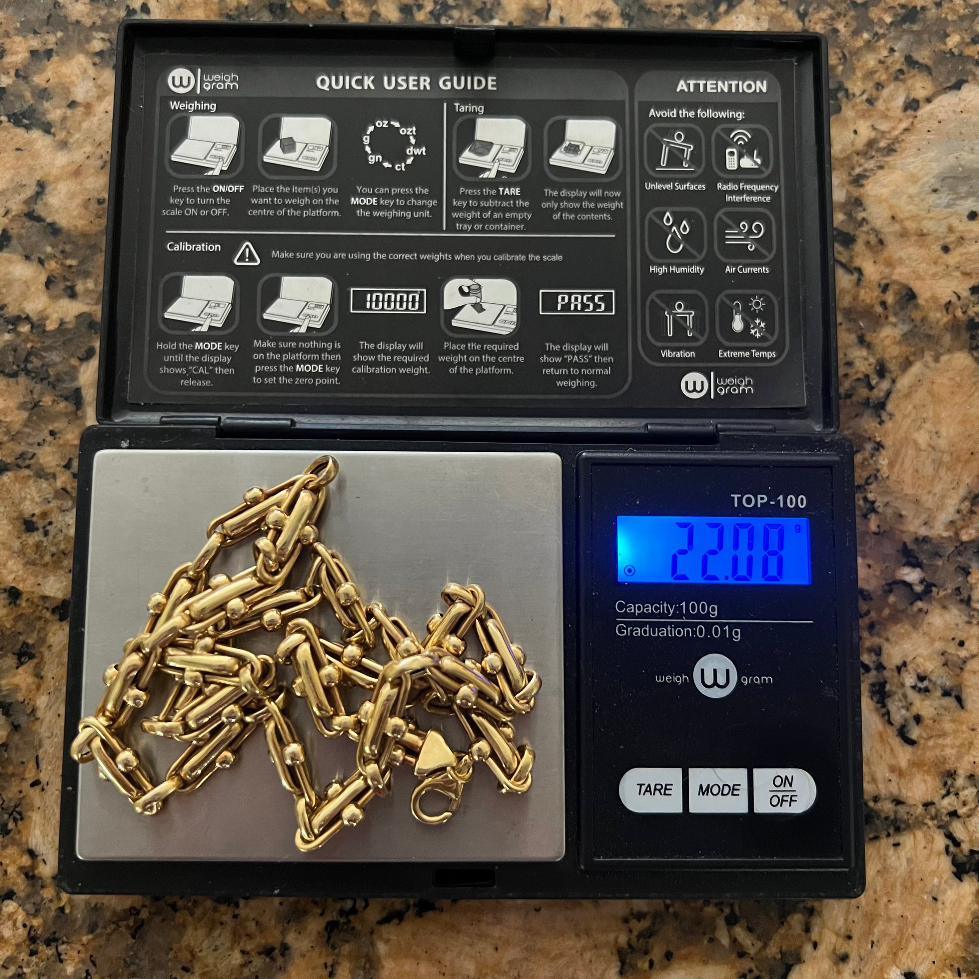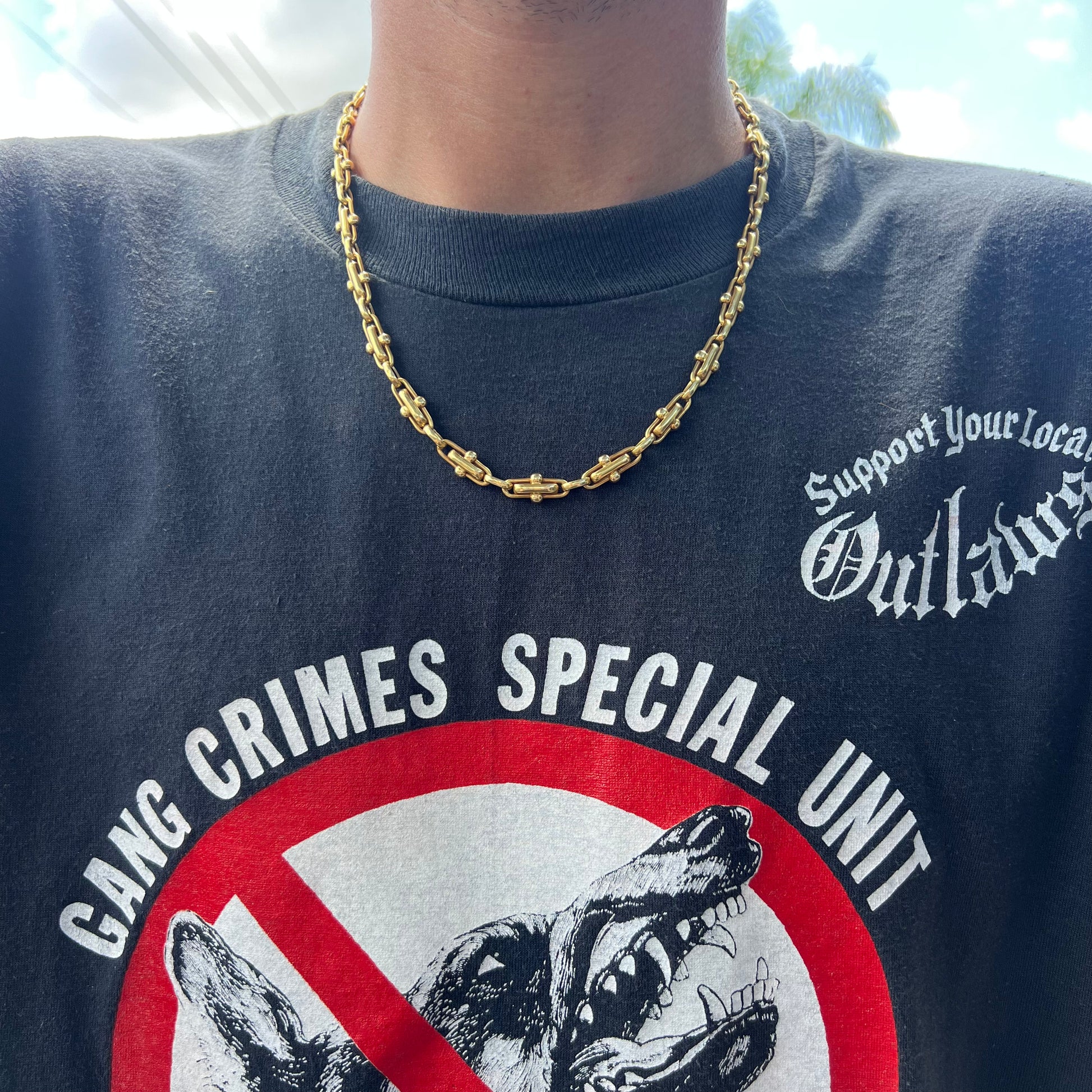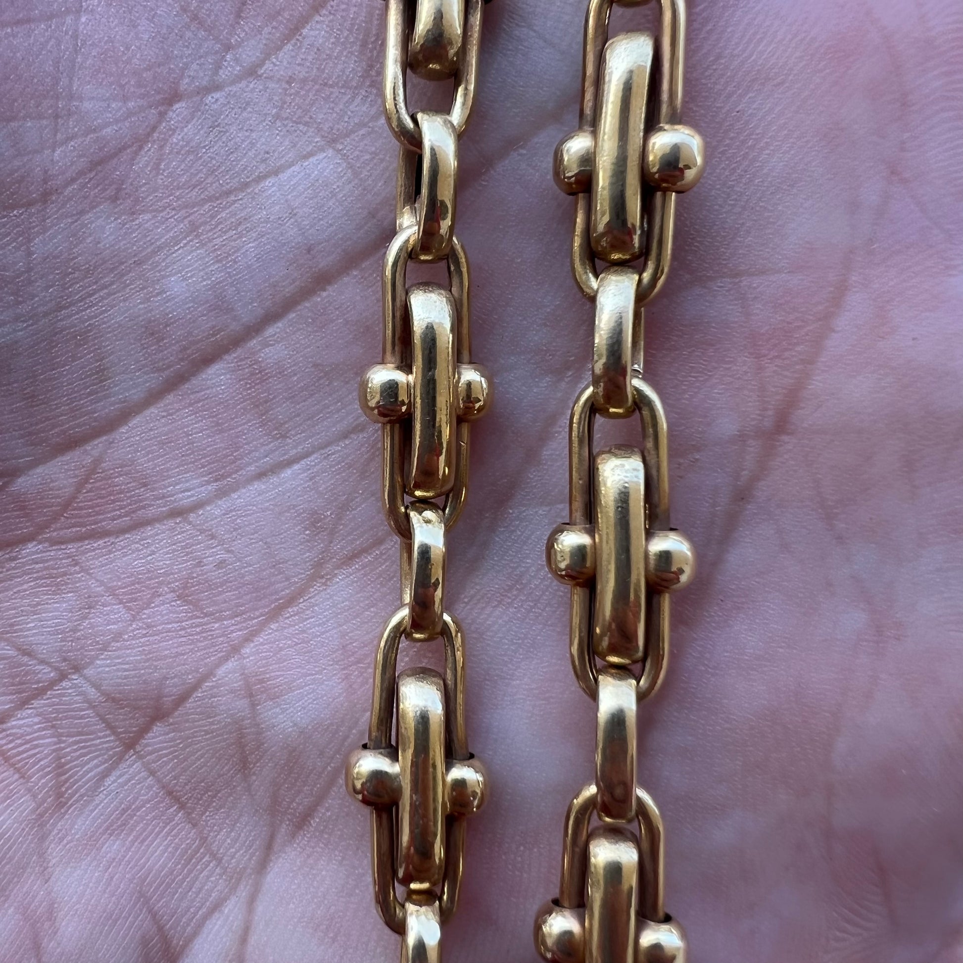 This is a one of a kind chain. You won’t see anyone else or be able to find one of these chains even if you search for it high and low. Crafted in Italy out of 14k yellow gold each link appears to be floating as the center slides back and forth on the outside oval link. This has a chunky flat high polish look to it and measures 20.25” by 8mm wide and just over 22g.