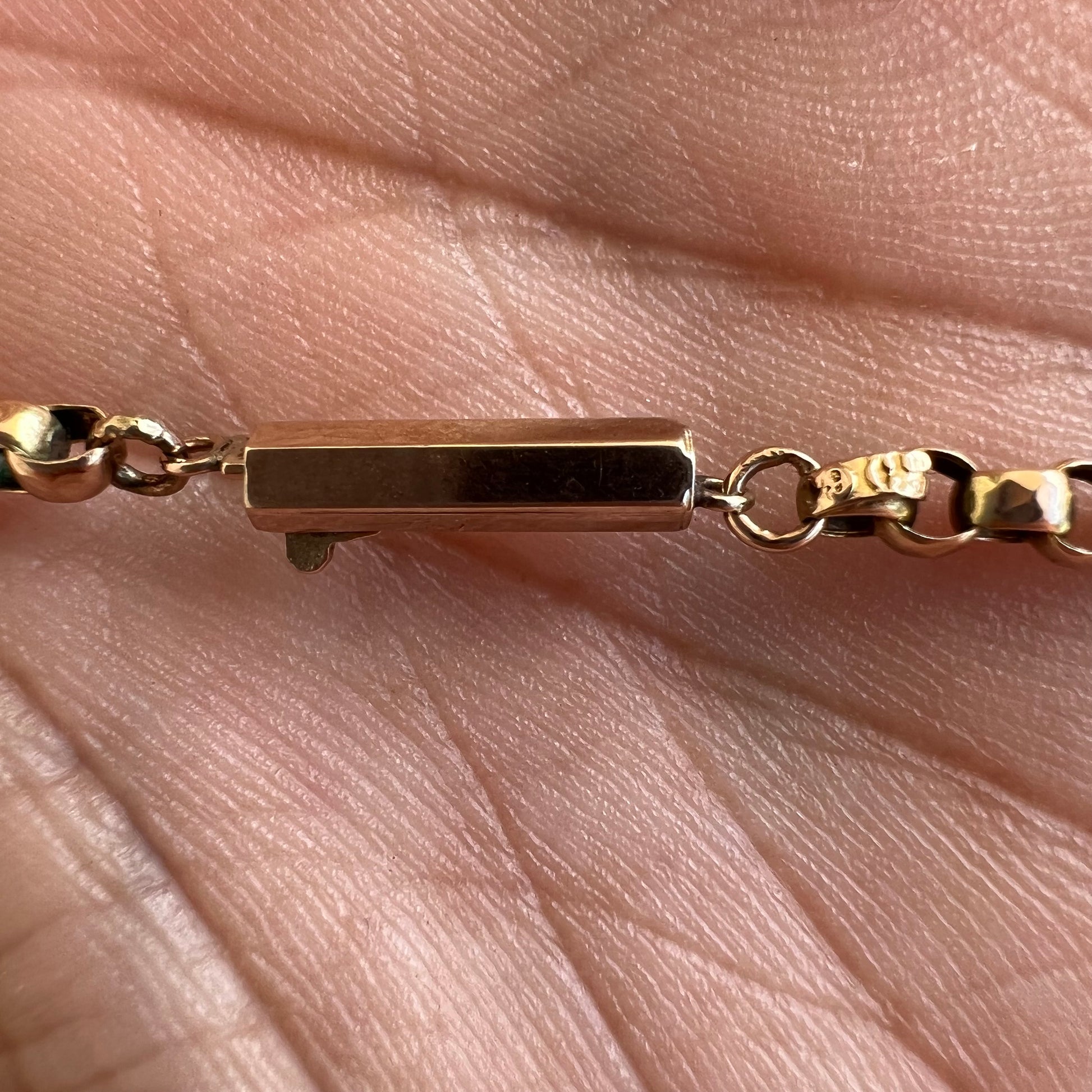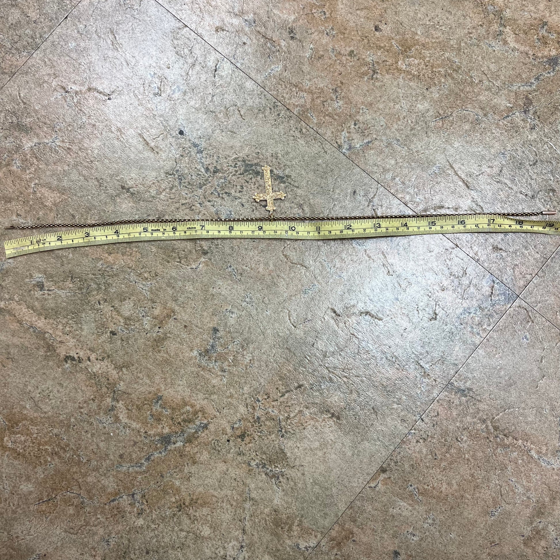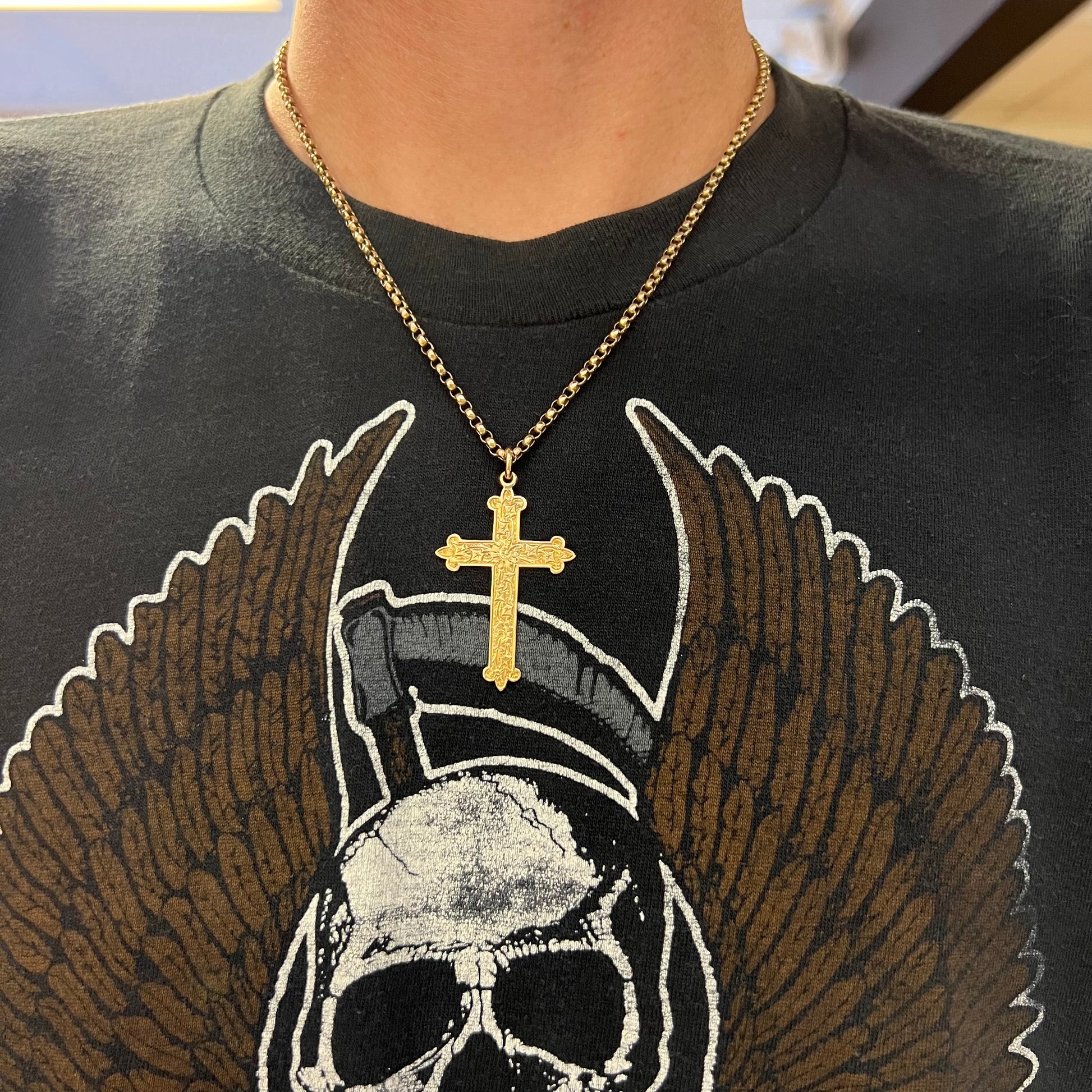 Hallmarked out of Birmingham, England in 1904 is a rare and beautiful 9k gold gothic style floral engraved cross pendant still with the original chain. The chain is a unique rolo style link with slightly angled edges giving off s a more sinister yet pretty look. Measuring approximately 19” in length by 3mm thick and weighing just under 11g finding something like this at this price is a needle in a haystack. On the open market pieces like this are selling for over $1000 on the low end.