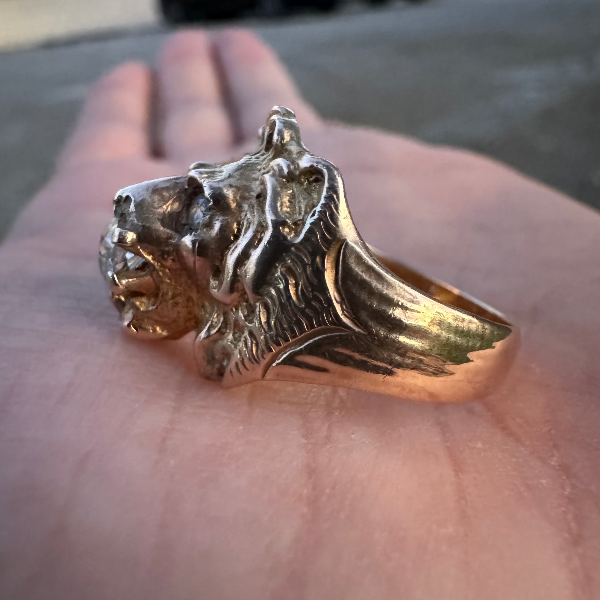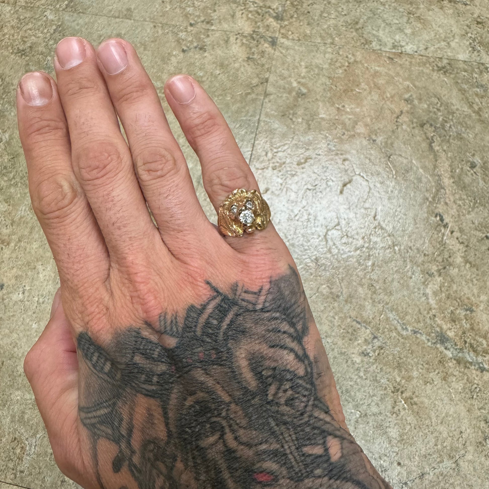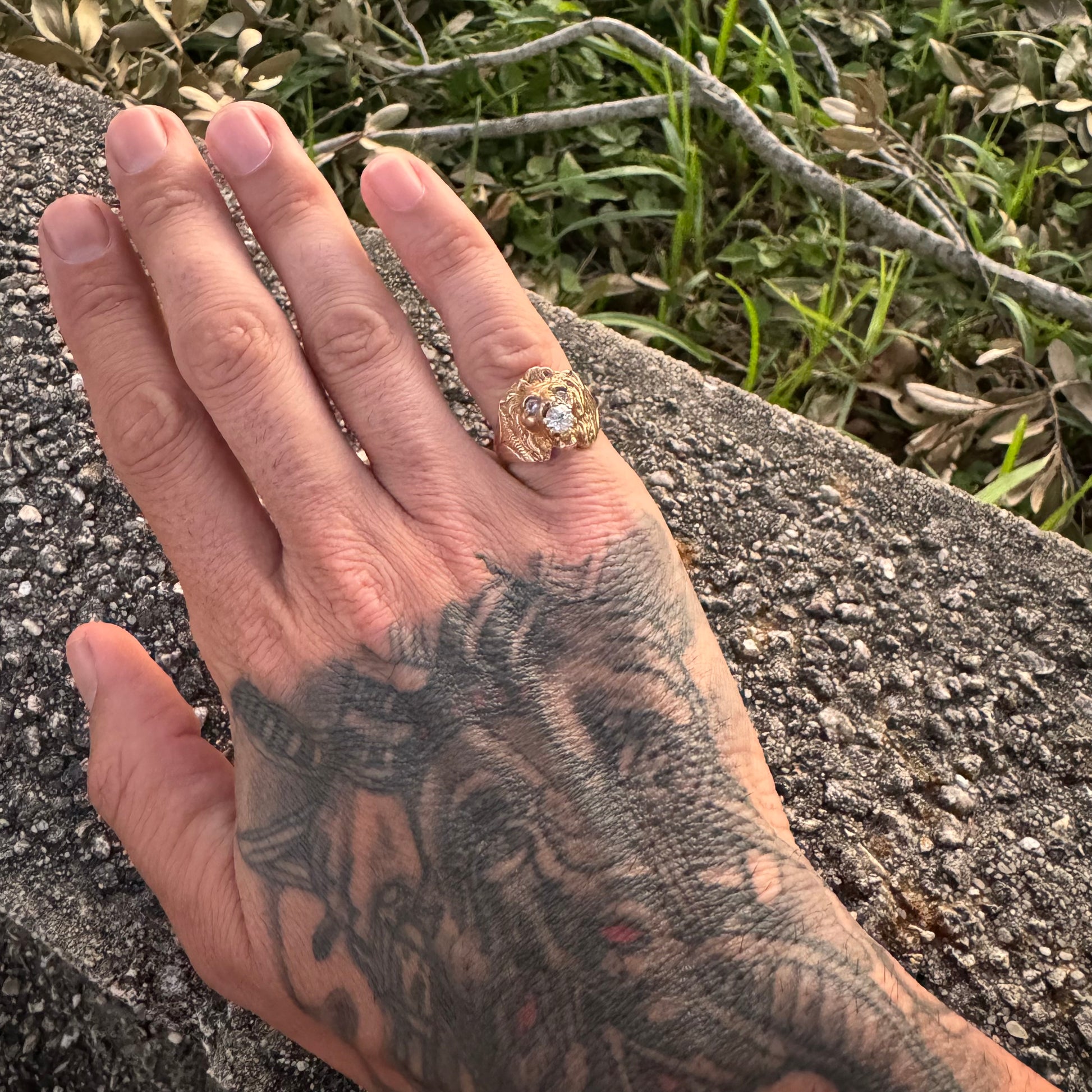 By far the most vicious looking lion ring I’ve ever encountered. Crafted out of solid 14k yellow gold sometime around the late 1800’s to early 1900’s this ring has 9 lives to tell and many more to live and give. As it appears to have been through what seems to be wars and nightmares with a “scar” over his right eye and going down his cheek this ring isn’t plain Jane, it has so much added character and grit so if you’re looking for a ring that’s new and pretty and in perfect condition this IS NOT the ring for you seeing as it’s been worn and thrived over 100 years. With 3 natural diamonds encrusted throughout, the main center stone clenched in the lion’s mouth is a .50ct natural old euro cut measuring 5mm. Chunky and clean with sharp faceted cuts you can’t tell at all when wearing it or looking at it with the plain eye but under the magnifying loupe there is small chip on the side. To me it’s something that isn’t even worth mentioning as it doesn’t take away from the ring but in my opinion actually adds more value to the piece giving it that natural grimy look that we all seek out in certain style rings like this one. If you were to watch the movie “The Lion King” some like Simba, some root for Mufasa, then there are some who have a dark yet powerful fascination with Scar and this ring reminds me of Scar. Battle Hardened and War ready with its shoulders straight back and walking with pride when you see this one in person and put it on your finger you’ll truly feel what I mean when I explain this. A size:7.5 this ring weighs approximately 8g.