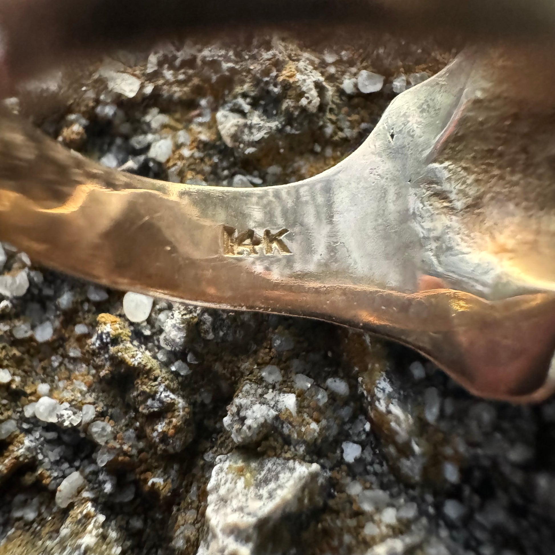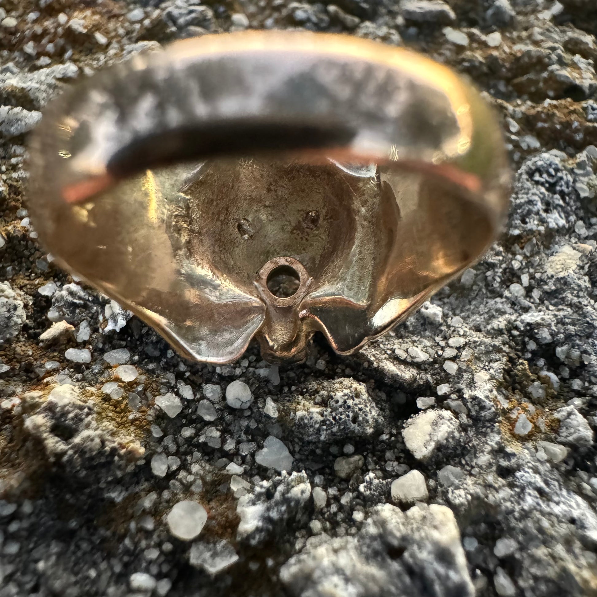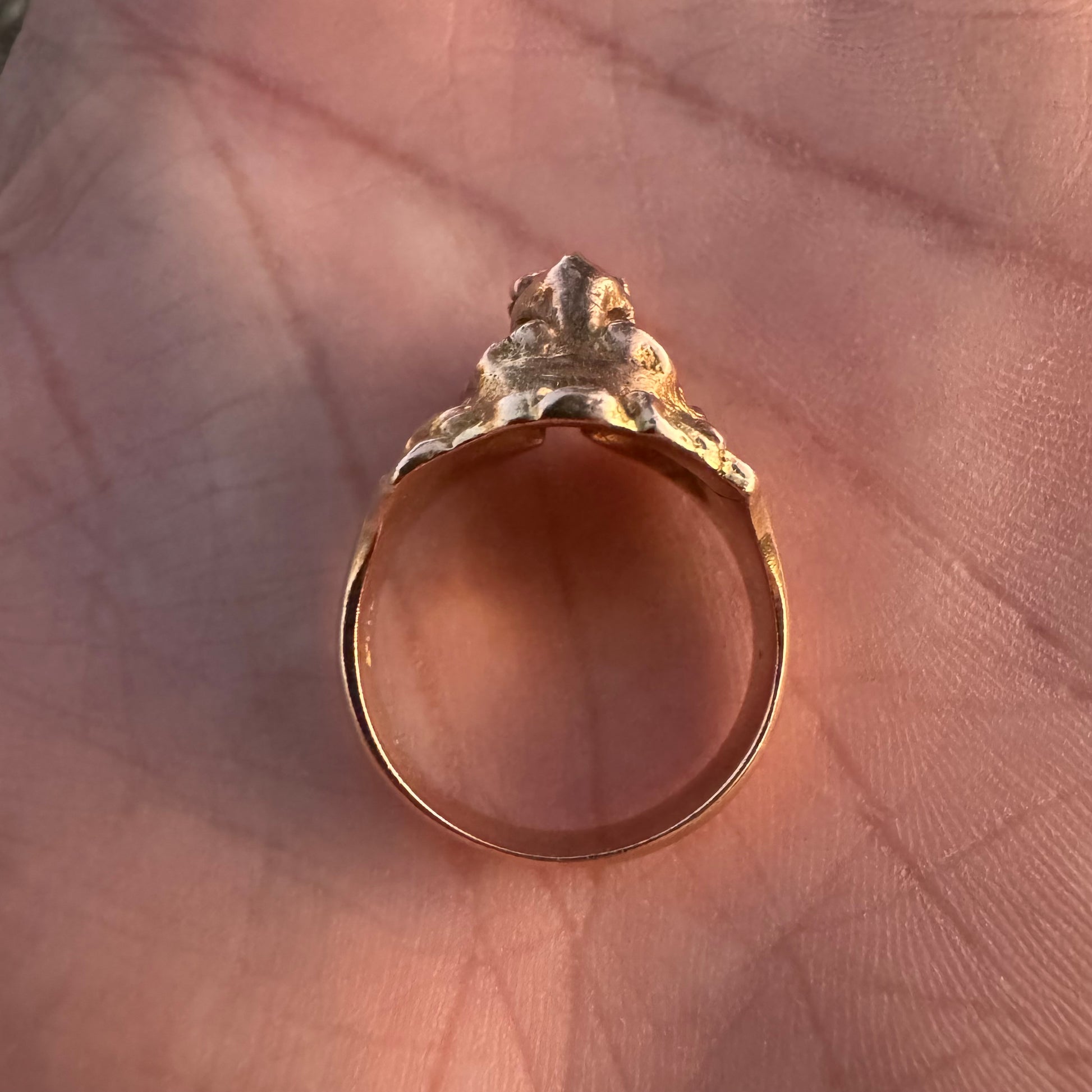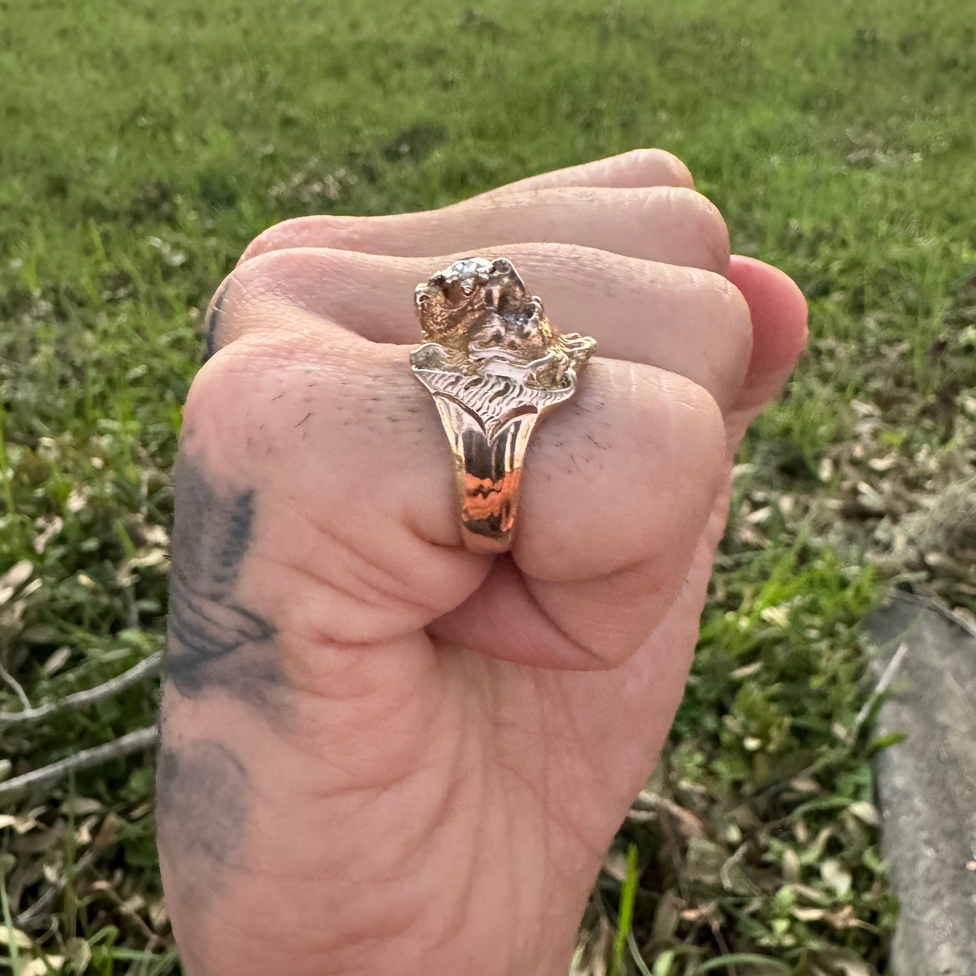 By far the most vicious looking lion ring I’ve ever encountered. Crafted out of solid 14k yellow gold sometime around the late 1800’s to early 1900’s this ring has 9 lives to tell and many more to live and give. As it appears to have been through what seems to be wars and nightmares with a “scar” over his right eye and going down his cheek this ring isn’t plain Jane, it has so much added character and grit so if you’re looking for a ring that’s new and pretty and in perfect condition this IS NOT the ring for you seeing as it’s been worn and thrived over 100 years. With 3 natural diamonds encrusted throughout, the main center stone clenched in the lion’s mouth is a .50ct natural old euro cut measuring 5mm. Chunky and clean with sharp faceted cuts you can’t tell at all when wearing it or looking at it with the plain eye but under the magnifying loupe there is small chip on the side. To me it’s something that isn’t even worth mentioning as it doesn’t take away from the ring but in my opinion actually adds more value to the piece giving it that natural grimy look that we all seek out in certain style rings like this one. If you were to watch the movie “The Lion King” some like Simba, some root for Mufasa, then there are some who have a dark yet powerful fascination with Scar and this ring reminds me of Scar. Battle Hardened and War ready with its shoulders straight back and walking with pride when you see this one in person and put it on your finger you’ll truly feel what I mean when I explain this. A size:7.5 this ring weighs approximately 8g.