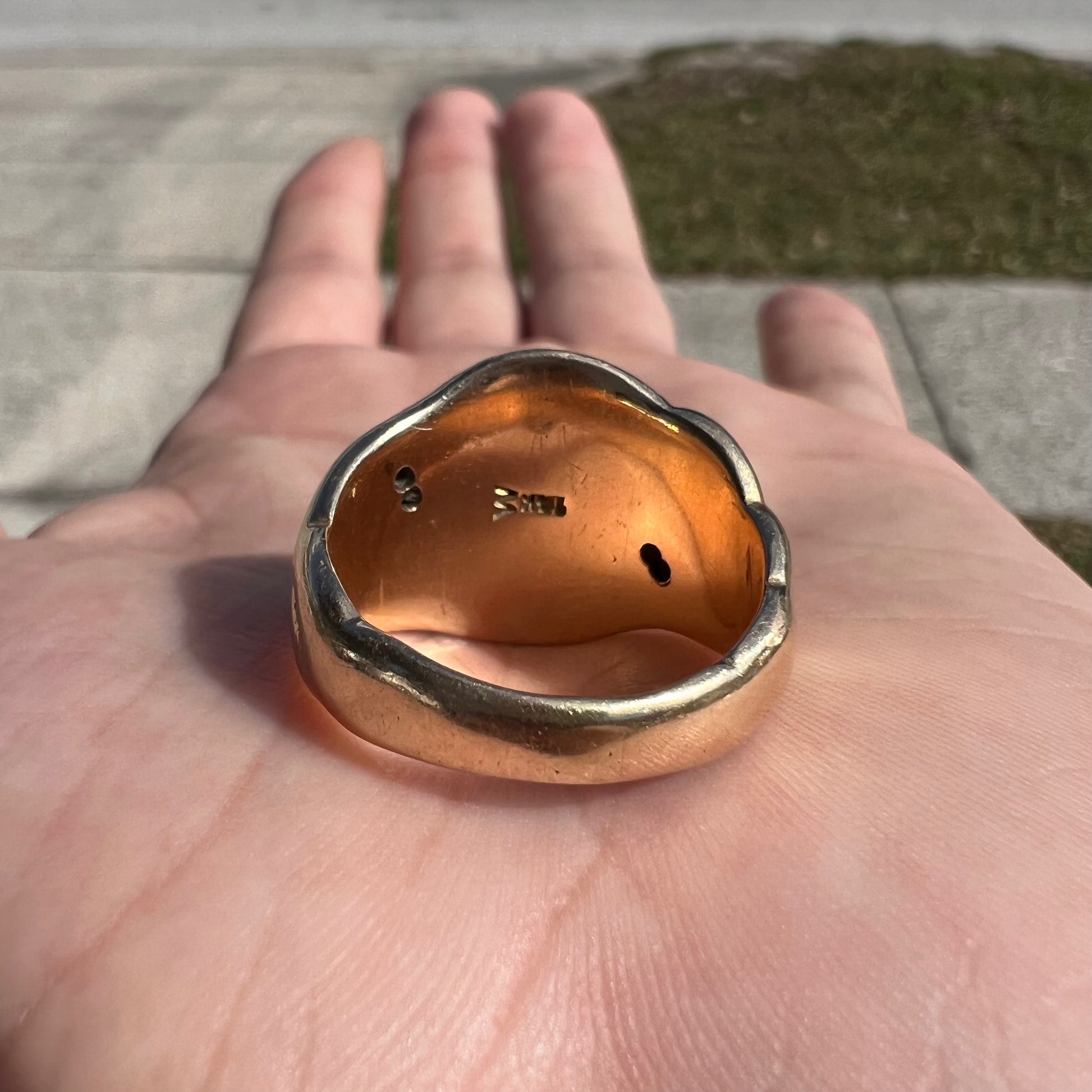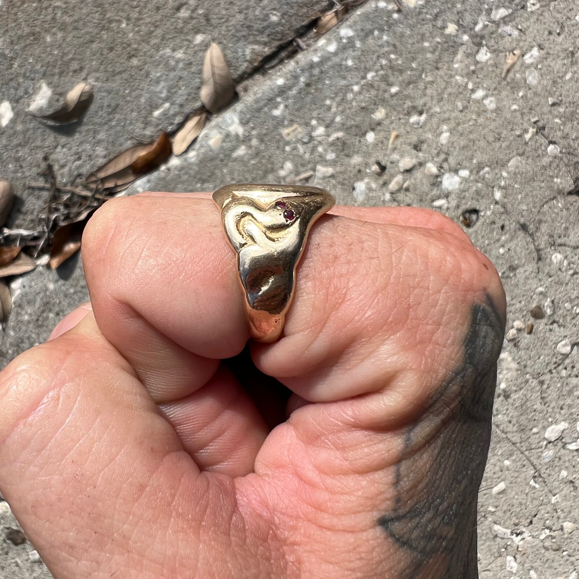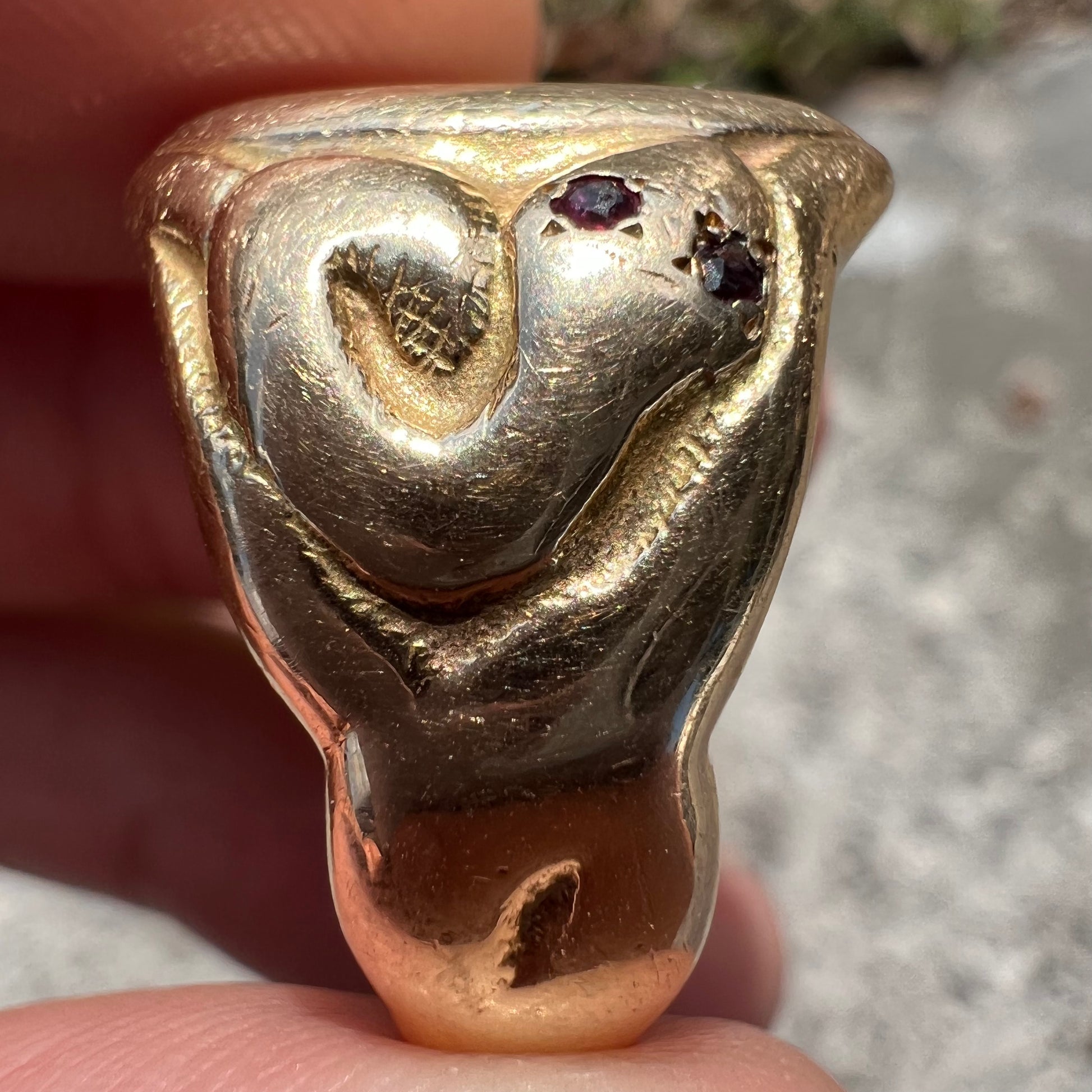 I have been searching high and low for a very long time for a Victorian snake signet ring just like this. Not only did I find one but it’s been left blank to personalize the insignia for whoever ends up with this lifelong keeper of treasure, if you choose to do so. From the late 1800’s-Early 1900’s is a very heavy (just under 17g at 16.96g) solid backed comfort fit 14k yellow gold signet ring. With hand chased protruding snakes slithering up each side of the shoulders to the top and flush set with glowing Ruby eyes this is a truly sought after piece of the past. The ring is sized barely under a size:10 but can be sized up or down if you need to fit your own size. This one is for you to wear for life and then passed down to your loved ones for them to keep the tradition alive. Your loved ones will always remember you wearing this amazing piece and will live on long after you are gone from this earth.