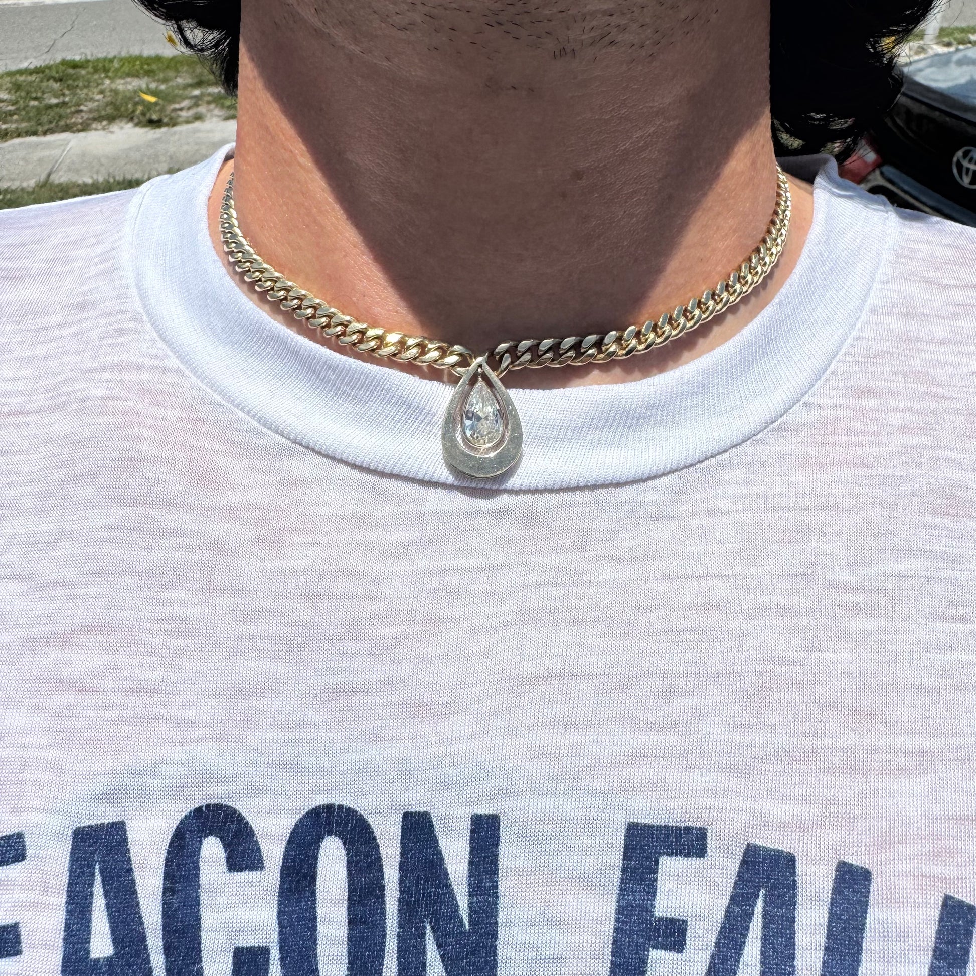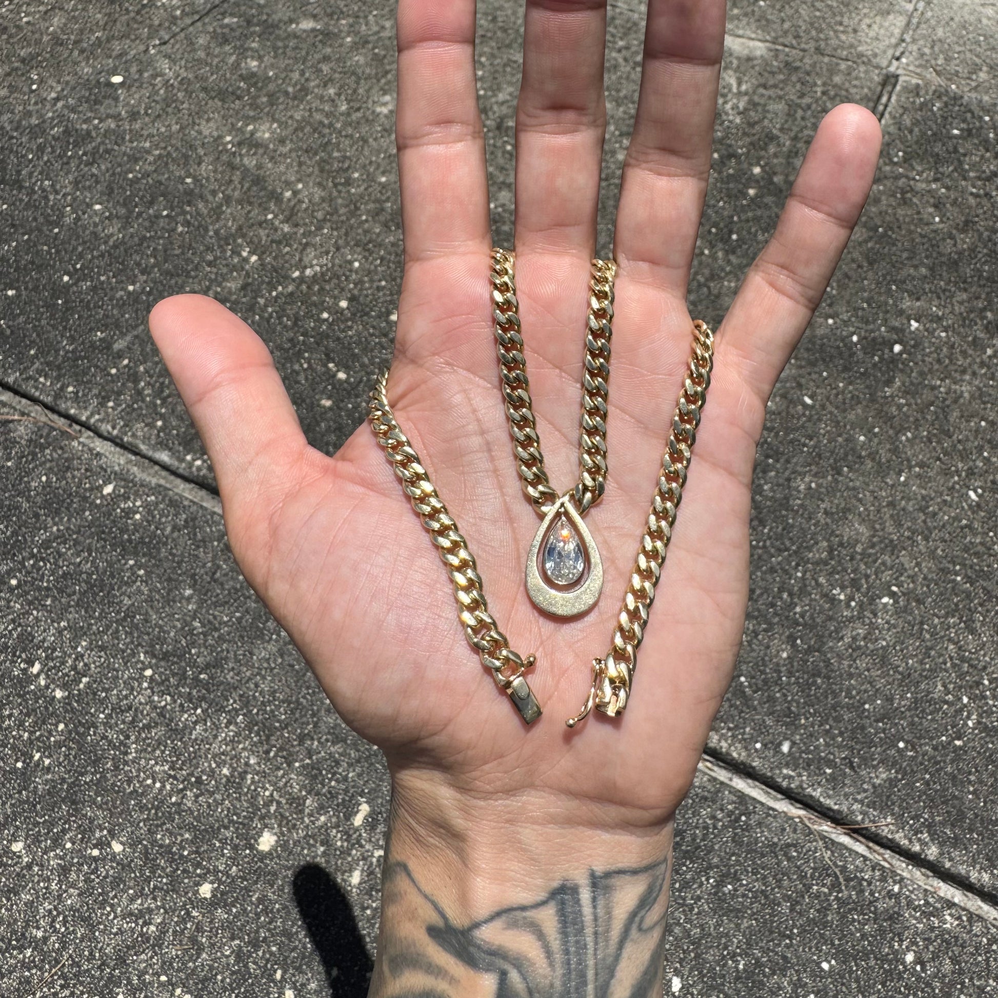 One of the best pieces of jewelry I have ever found and I was able to source it at an incredible deal, meaning I can turn around and sell it to you for an unheard of wholesale price. This diamond has been looked over by a GIA graduated gemologist and is conservatively listed as approximately 1.78ct with SI1 clarity and L/M in color (pictures will show the approximate mm size). All Handcrafted of out of a heavyweight and chunky solid 14k yellow gold Cuban link with the diamond set in a drop pendulum style that swings back and forth. Measuring 16” in total length it fits best at approximately 15.75” and is quite hefty at 6mm wide by 2.75mm thick and weighing in at 46.7g. This is the true definition of a family heirloom piece that will be passed down for generations to come as it increasingly gains in rarity and wealth. A one of a kind masterpiece you won’t see ever again or anyone else have on their neck.