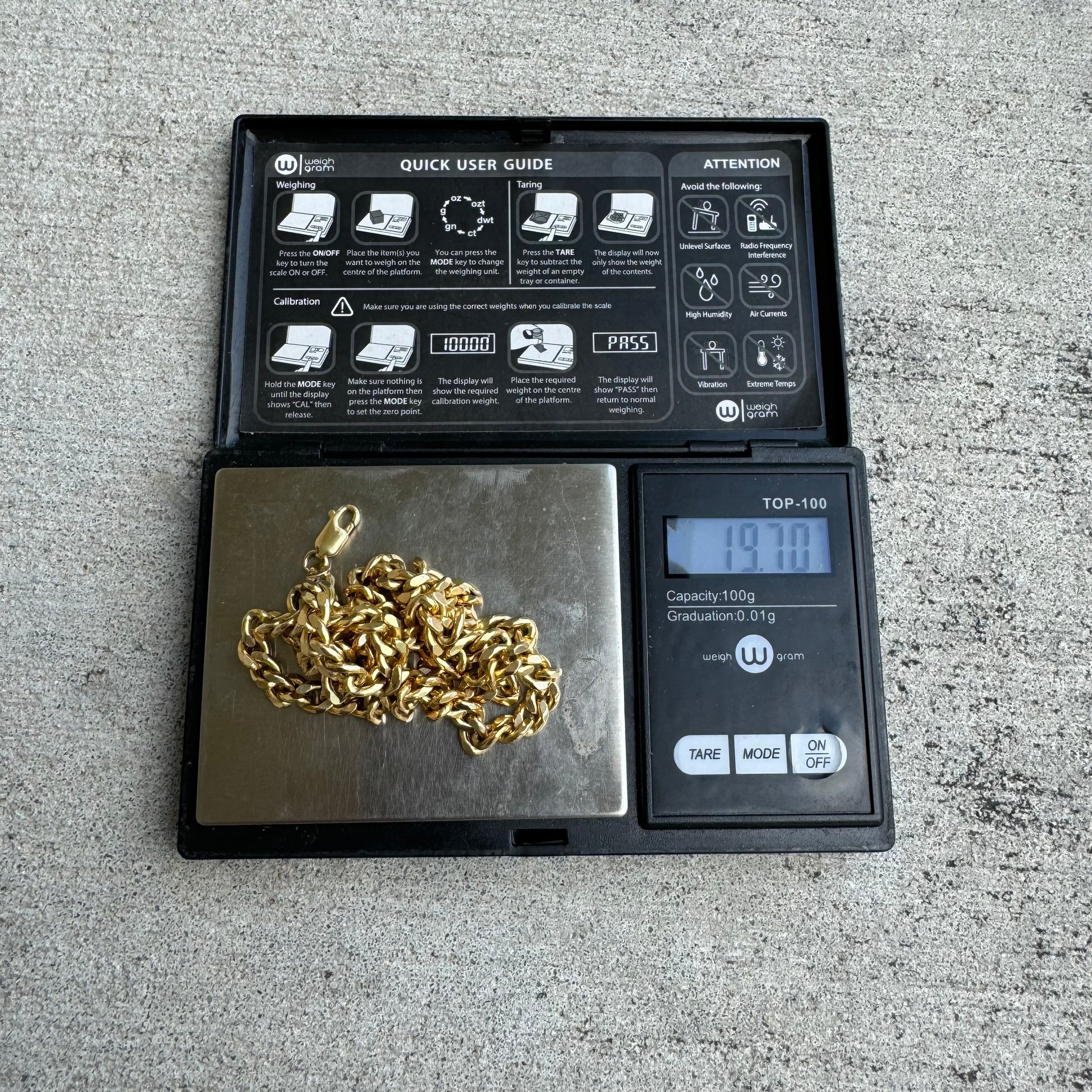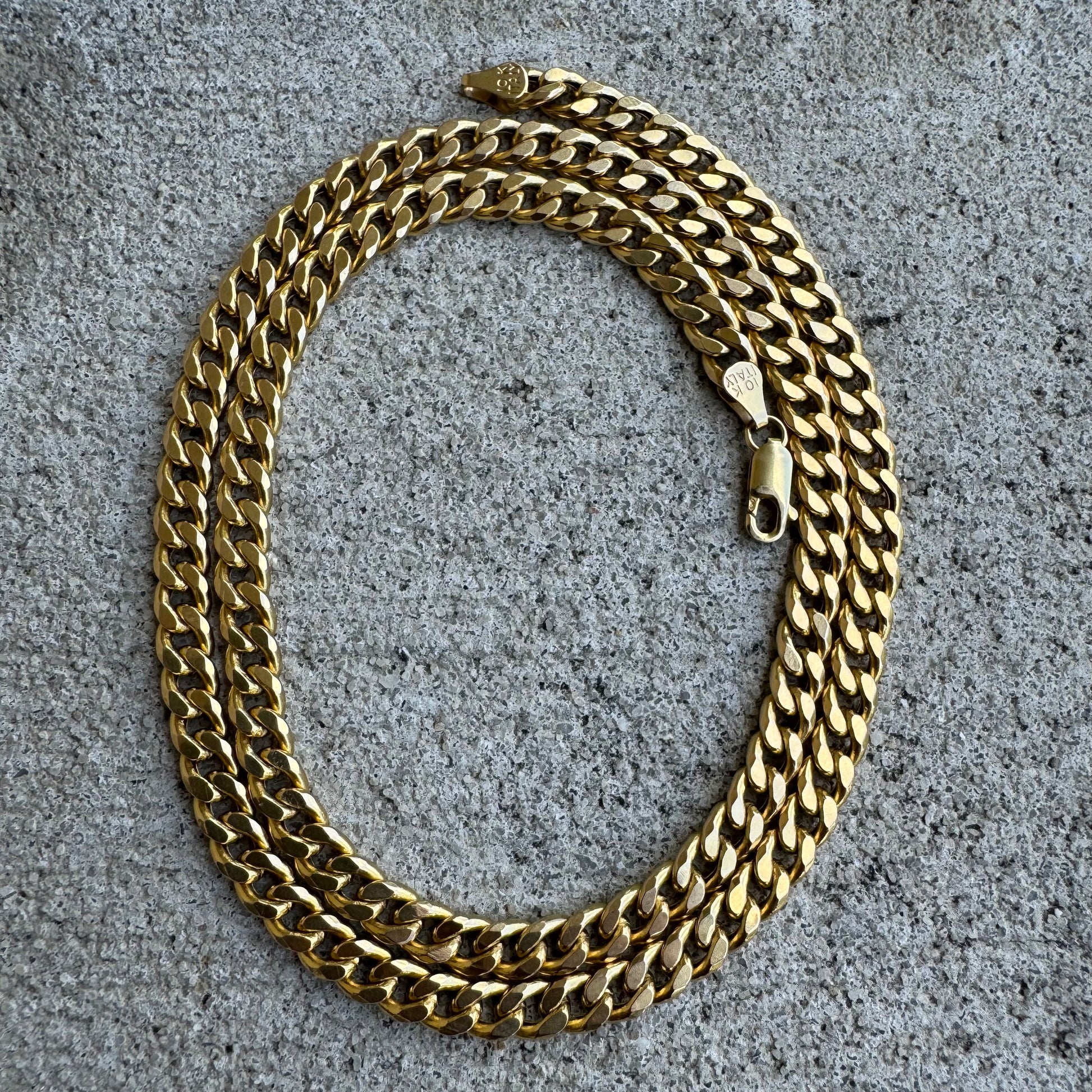 This one has a lot of percs going for it as the tone is a buttery yellow reminiscent of a higher karat gold but yet stronger than that of its counterparts as it’s 10k gold. Made in Arezzo, Italy a hub of high end Italian goldsmiths this vintage chain was made with quality in mind sometime around the 1990’s- early 2000’s. In the hard to find 22” length variant this piece has a big bold look as it weighs 19.7g and is 6mm wide by 2.75mm thick. Each link has what is referred to as a “knife edge” as it gives off more shimmer and sparkle as the light hits it.