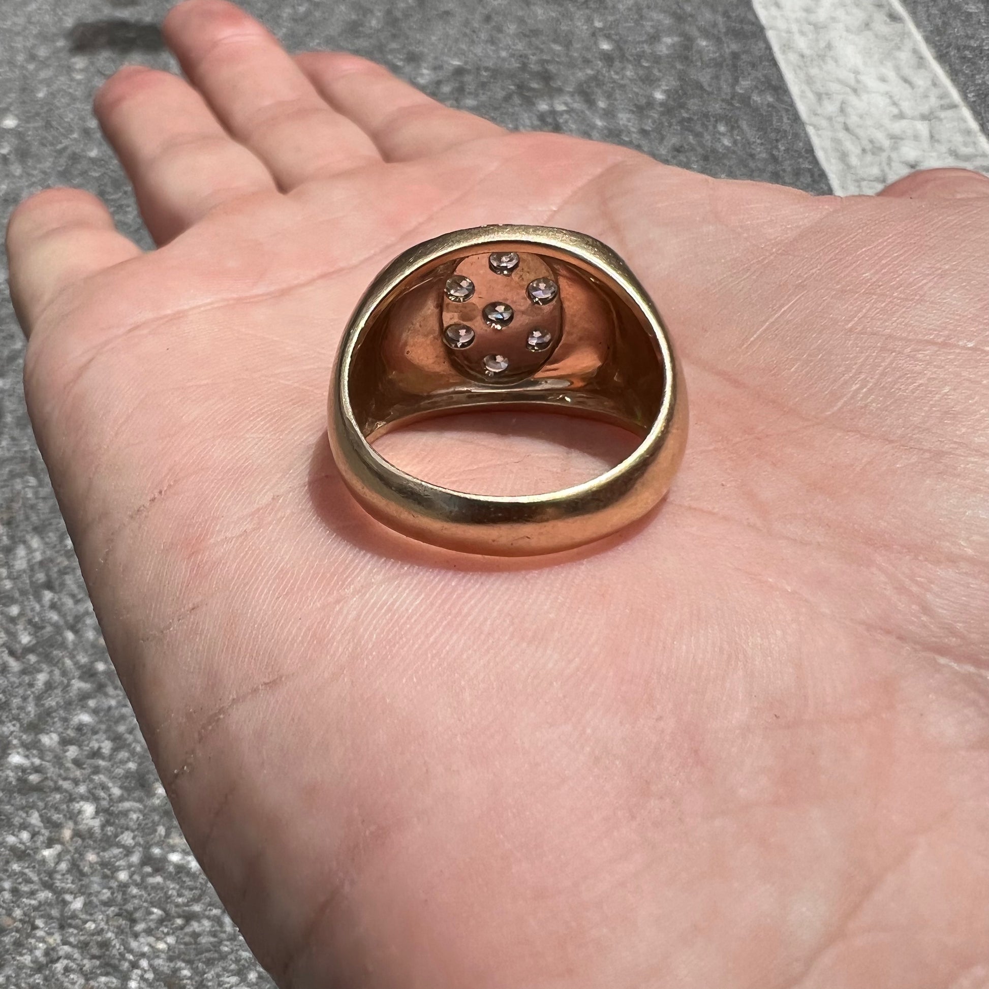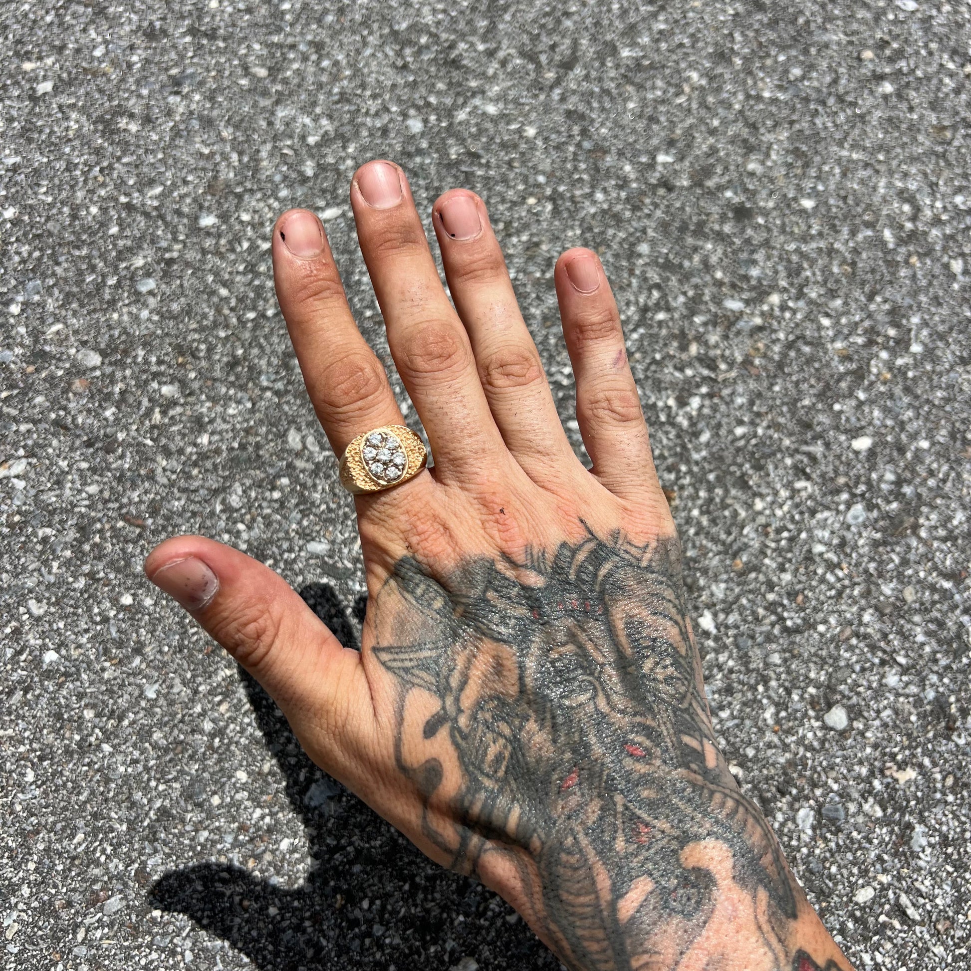 With 7 natural VS quality prong set diamonds weighing in at approximately .15Ct each bringing this 14k yellow gold old school brutalist style Kentucky cluster ring to just about 1.05CTW. This a ring that shows seriously force and let’s people know you don’t play around. This isn’t an easy ring to find nor will it be the right look for everybody. This one is for the real G’s out there. Size:10.5 and 12g
