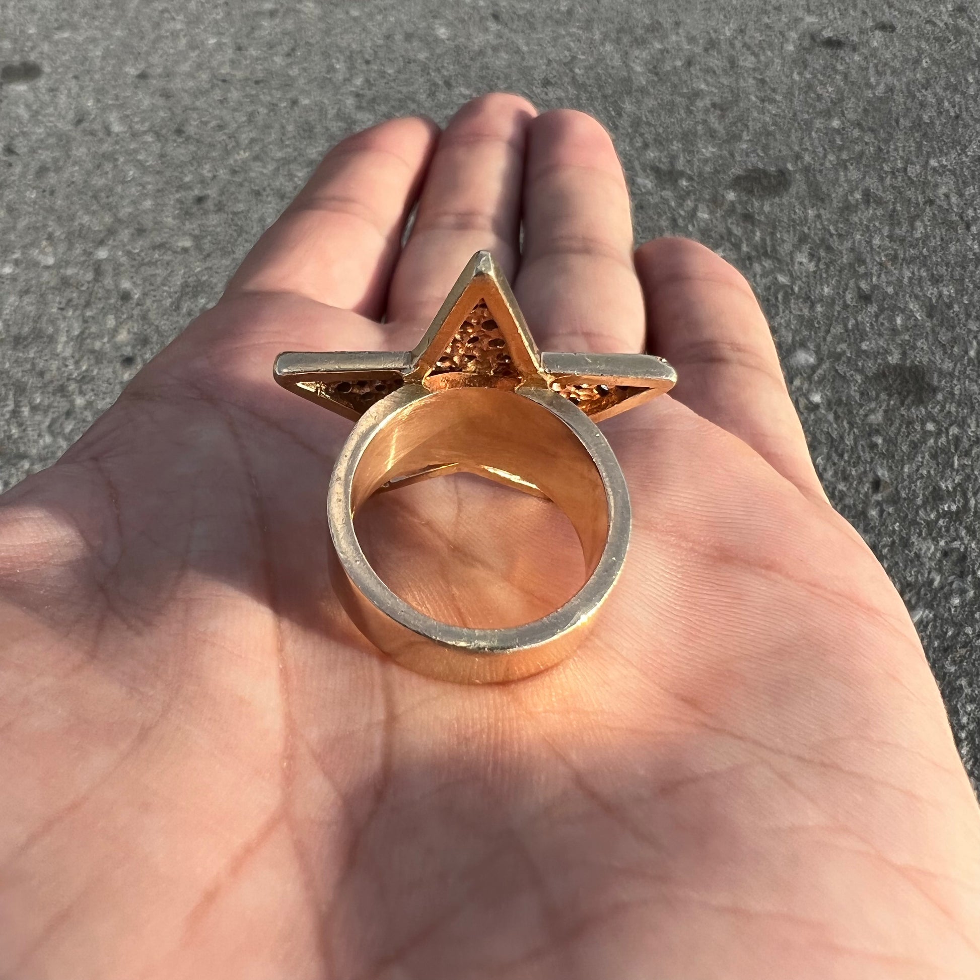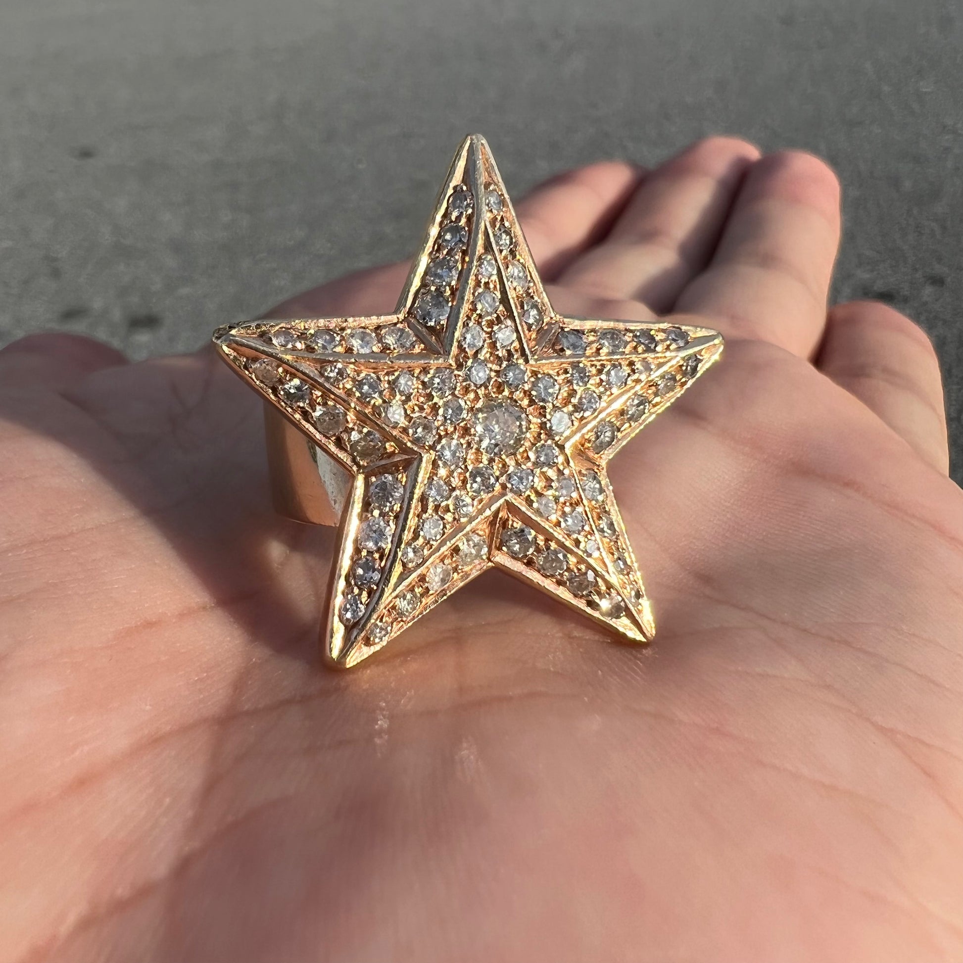 Crafted out of almost 22g of solid 14k yellow gold is the star ring of all star rings. Flooded out in approximately 2.50CTW of bead set natural diamonds ranging from SI-VS clarity. The star ring has been worn all throughout the hip hop industry by almost all of the big name rappers in the last 15-20 years. If you’re a superstar you need that superstar ring and this is the one. A chunky fat wide band at size:8 but can be resized if needed.