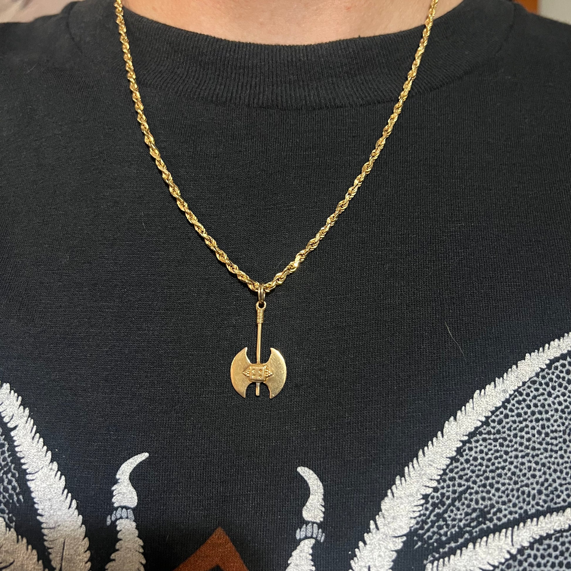 Vintage solid 14k yellow gold medieval Viking battleaxe pendant. Marked .585 with a European makers mark. Good educated guess is this is a Danish made piece. *Quarter shown for size*