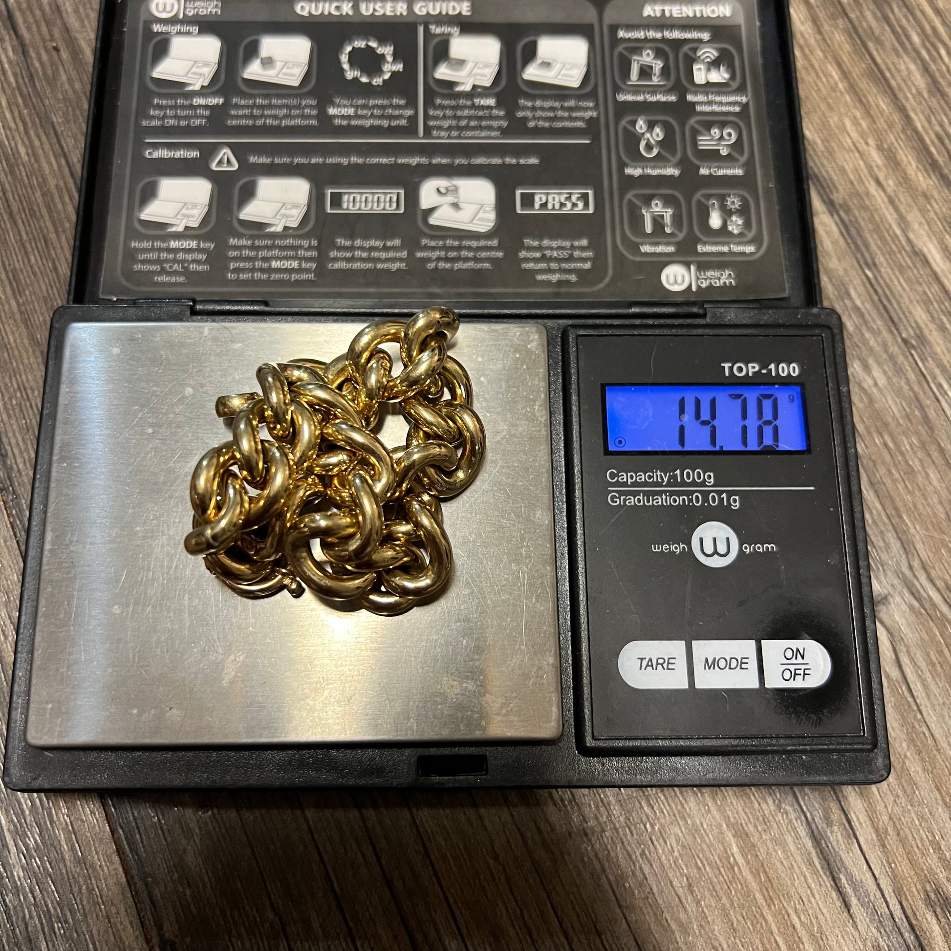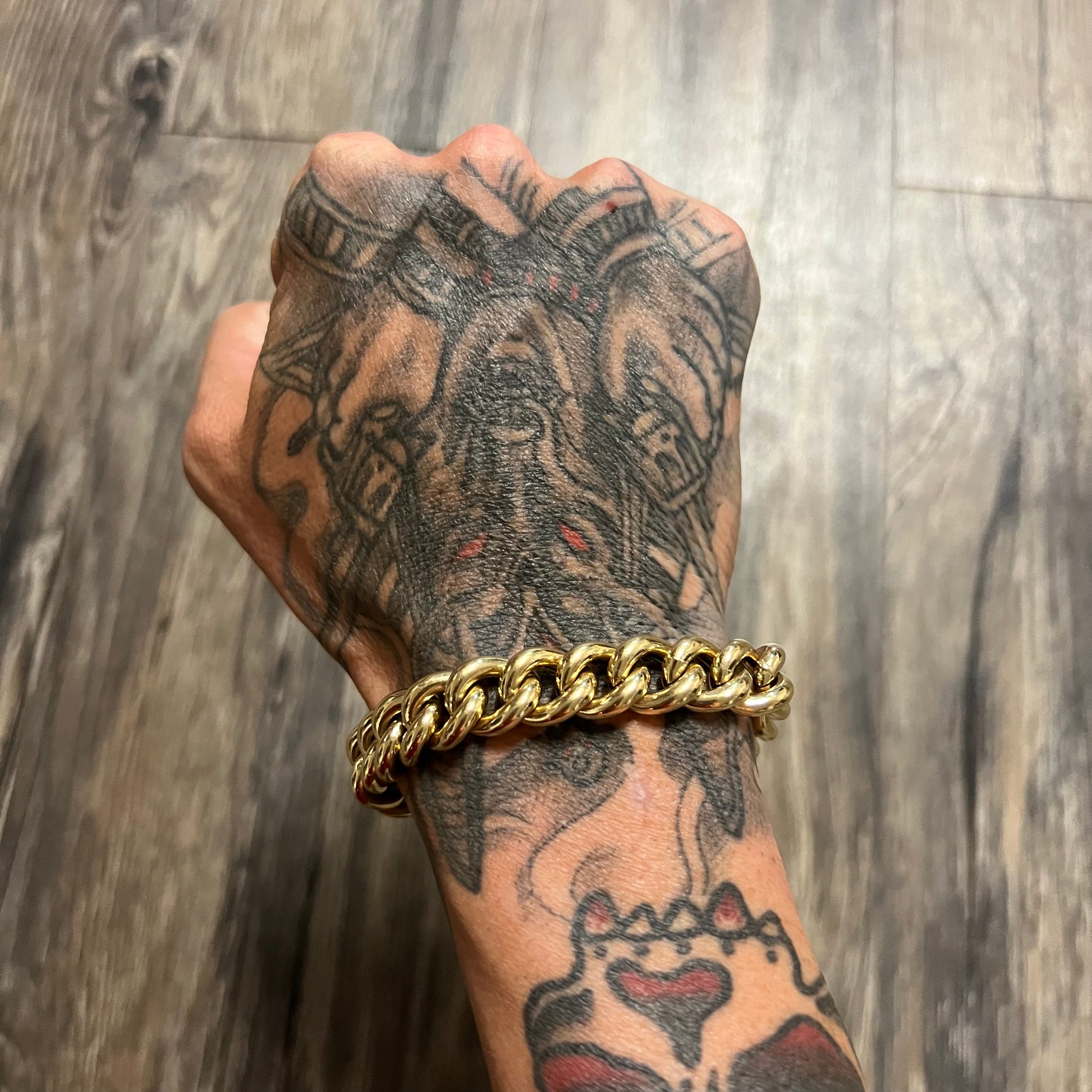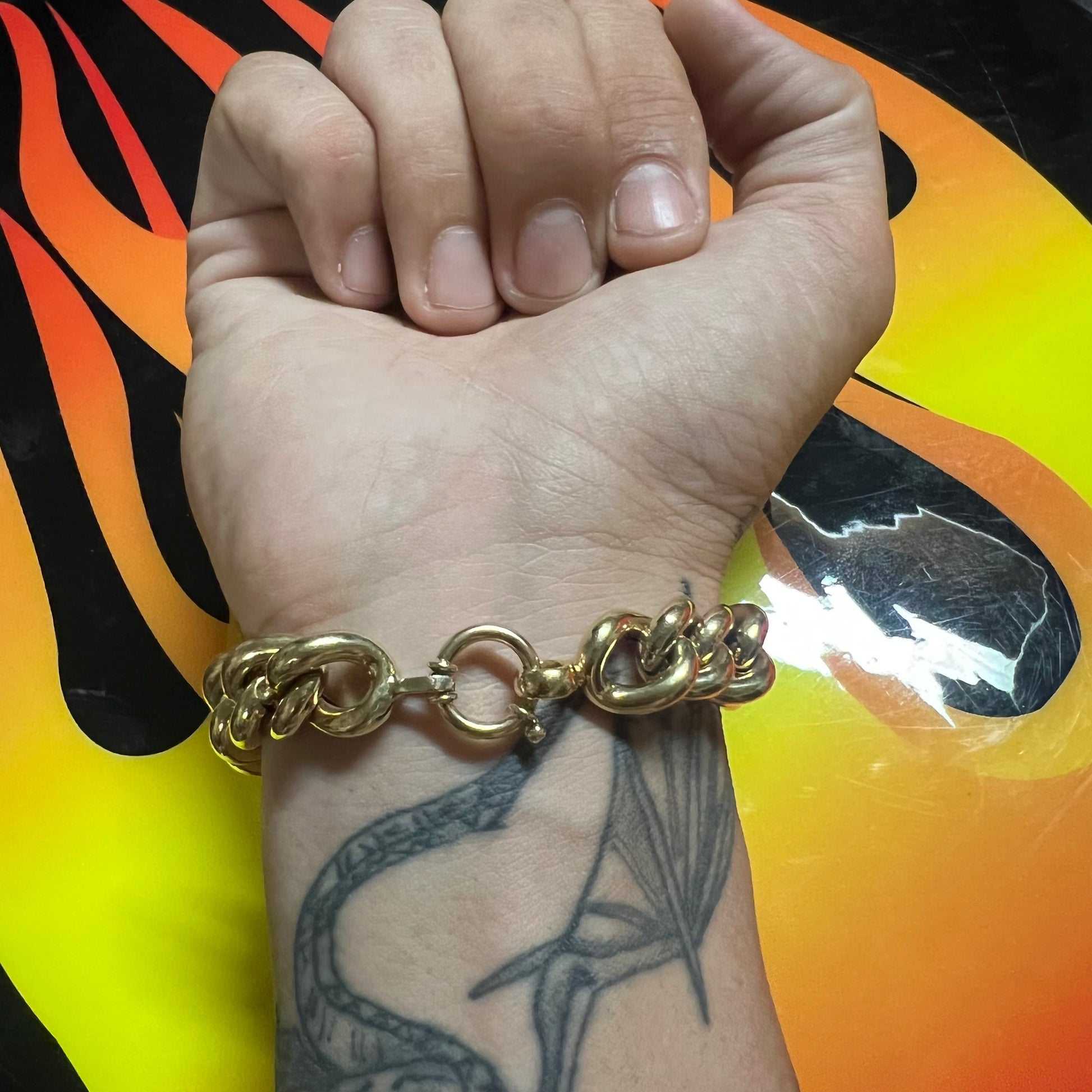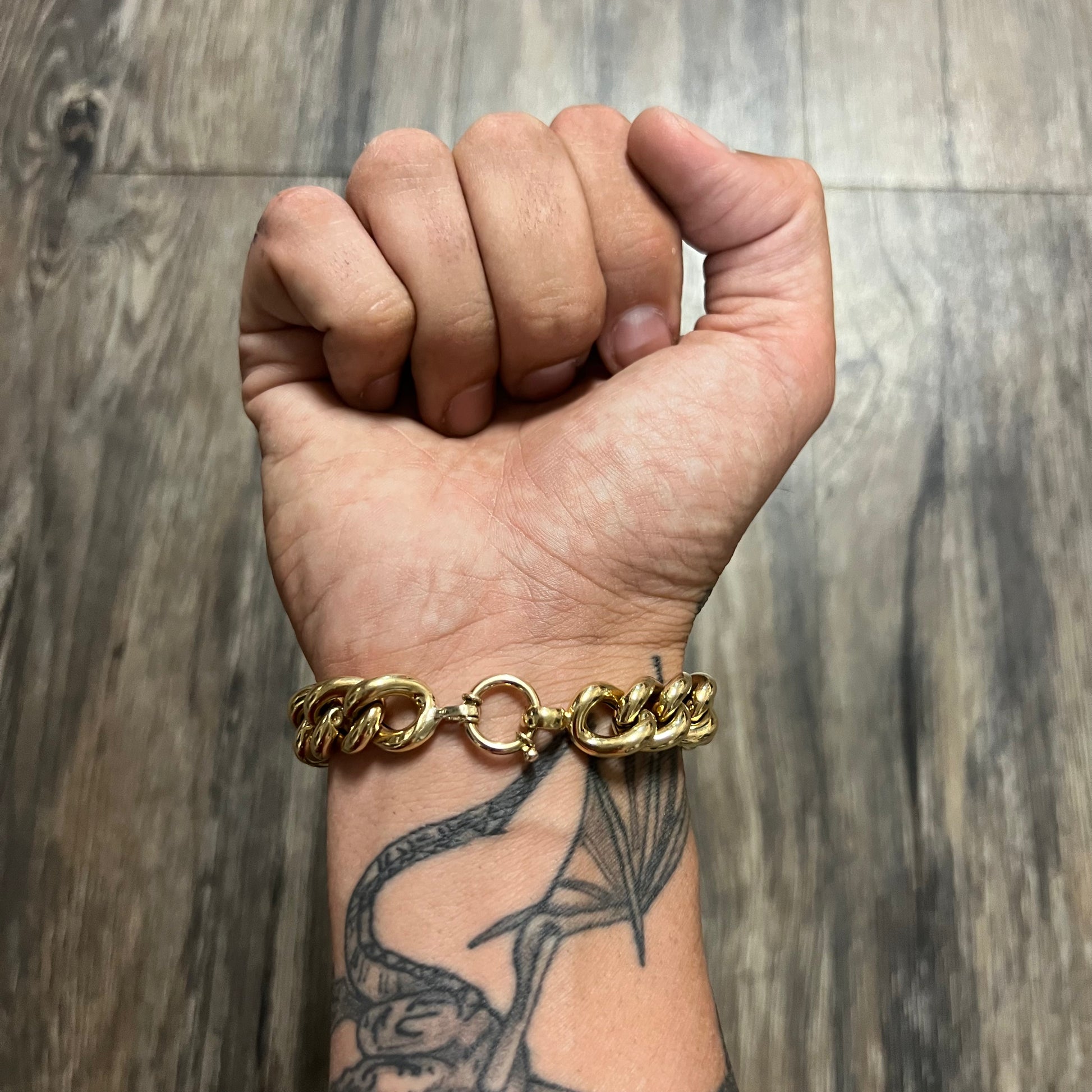 This chunky vintage 14k curb link bracelet by H.W Burdick with amazing spring ring clasp has that elegant yet powerful look that you’re going for. At 7.5”/12mm by 7mm/14.8g this one’s a conversation piece and a show stopper with big money looks for a really great price.