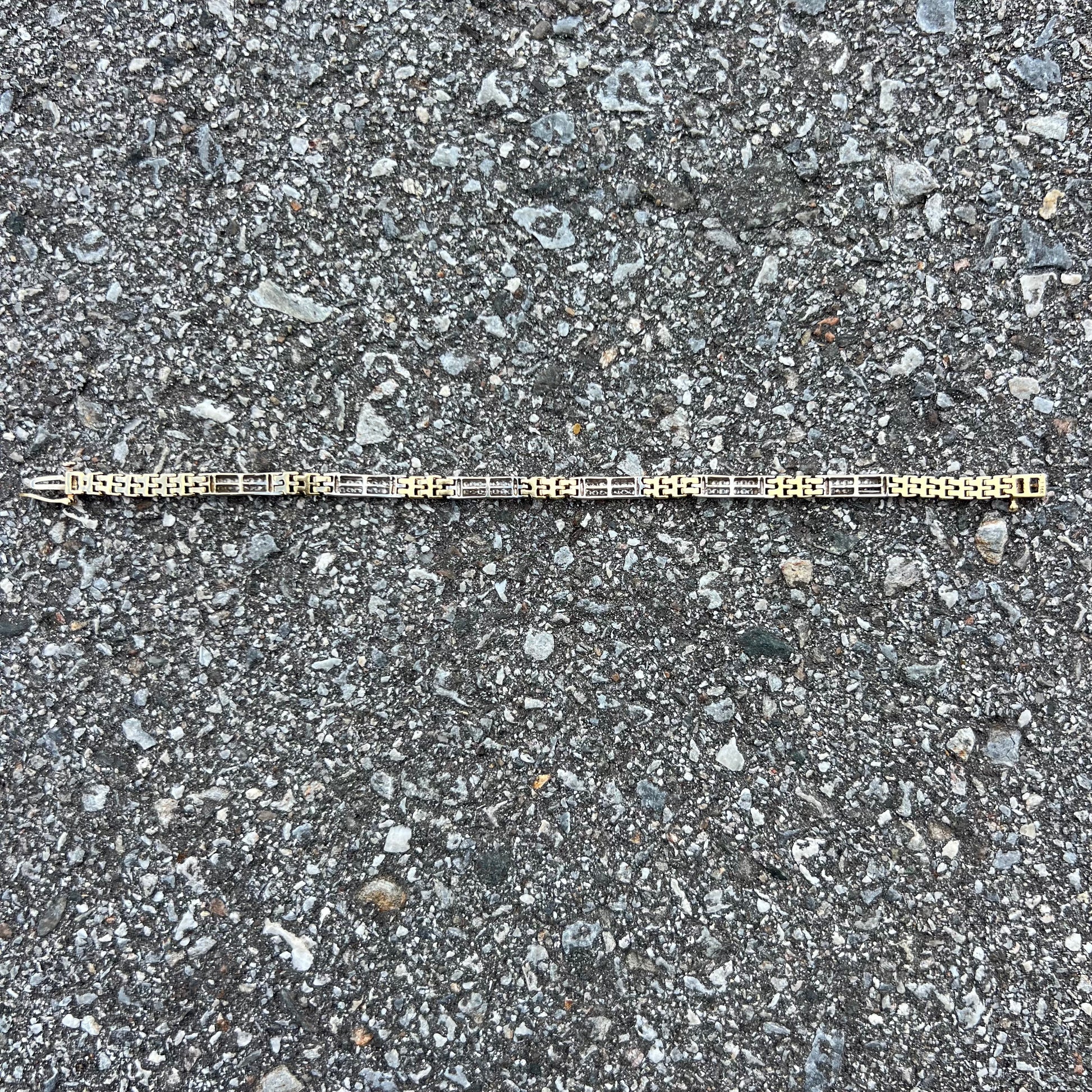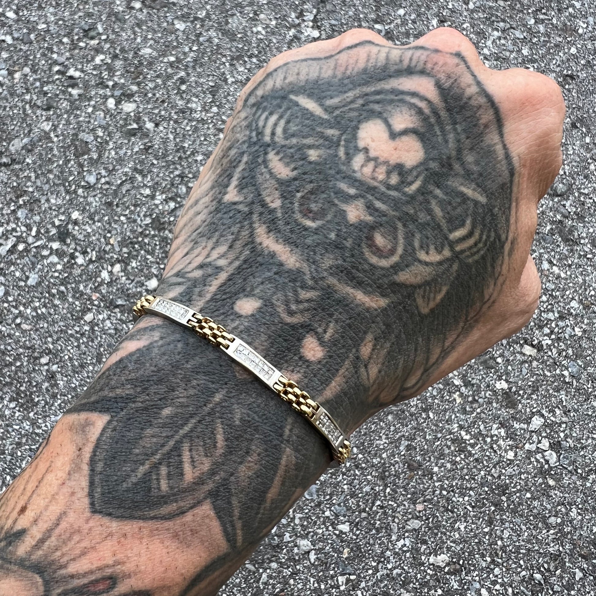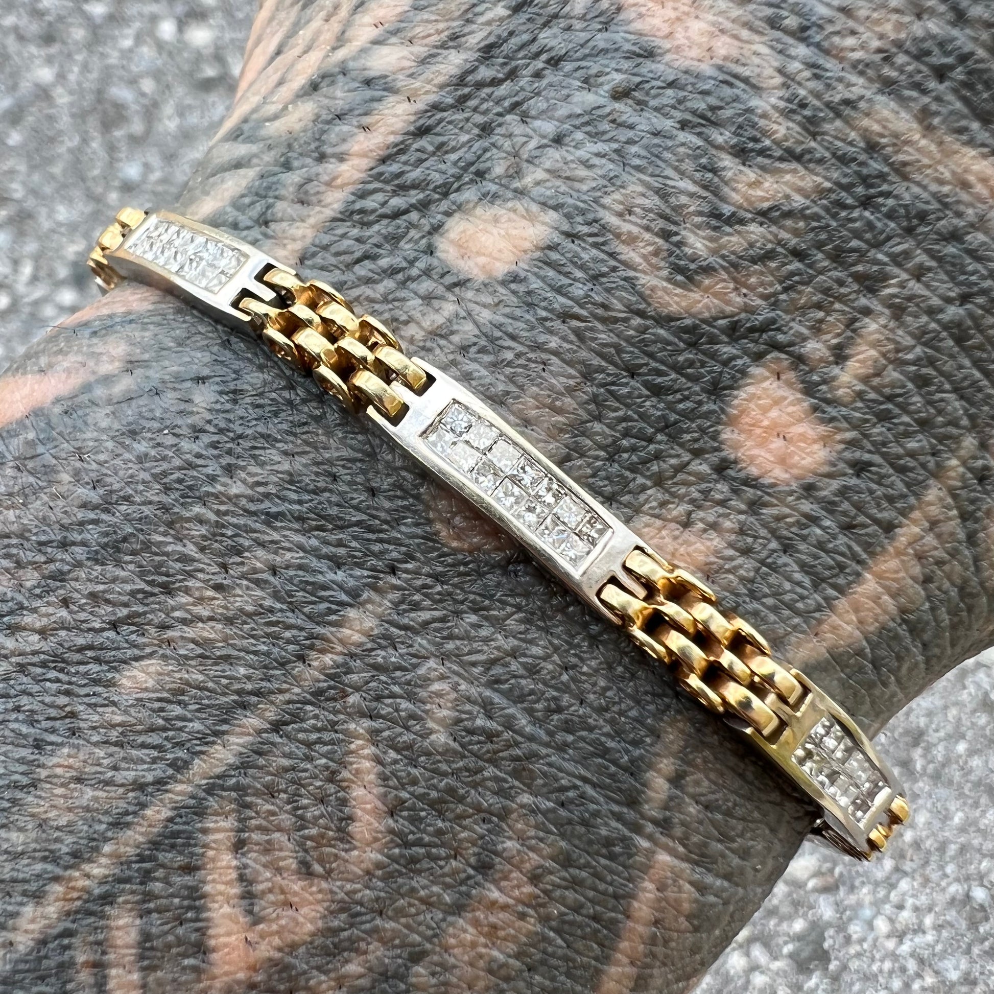 Meticulously made of the highest quality and best materials is this two tone 14k (yellow and white gold) Diamond bracelet. Consisting of approximately 84 clean natural princess cut diamonds (.025ctw each) set inside of the white gold. This one has a tough look to it for either a man or woman. I will definitely be wearing this one around until it sells. 7.25”/4mm/13.7g