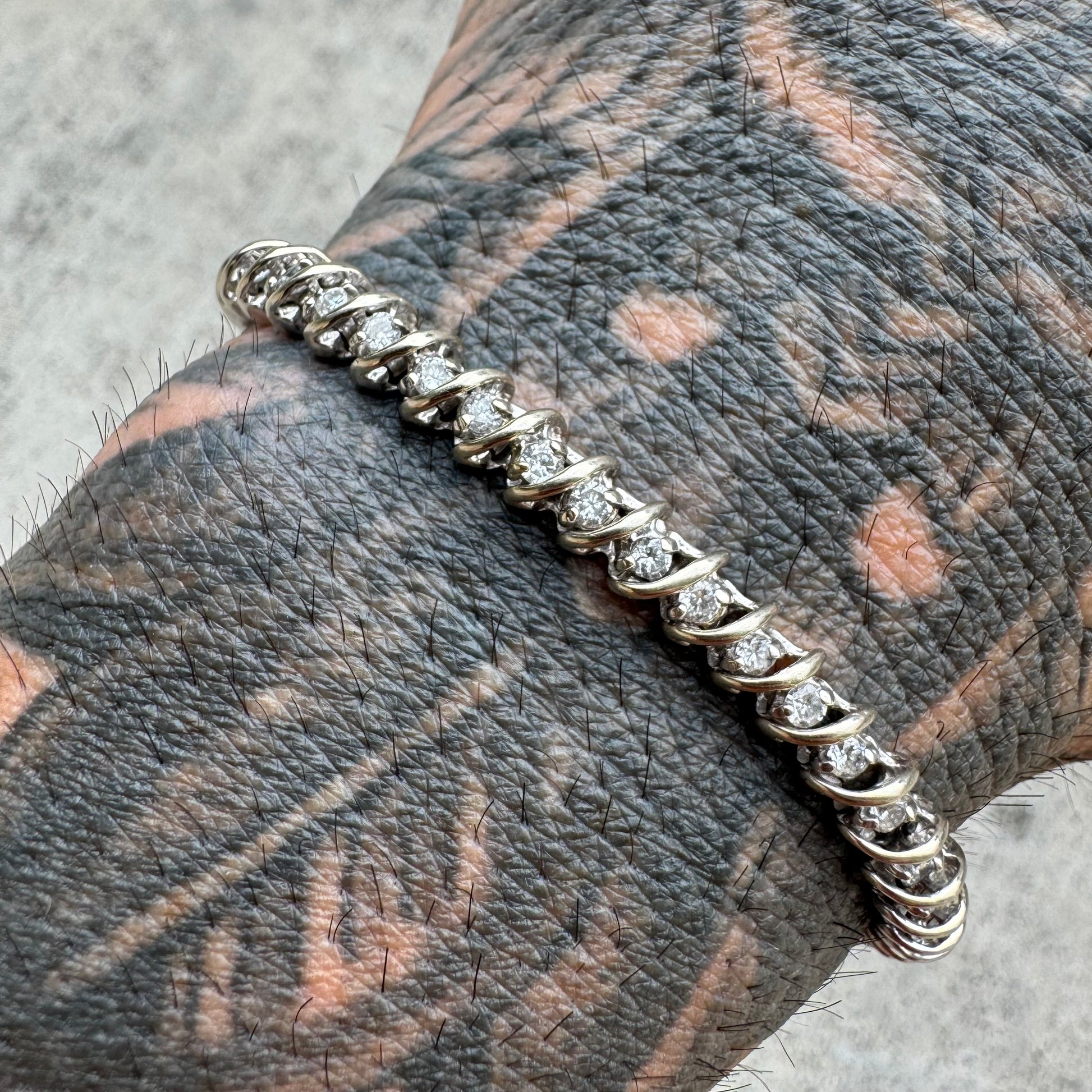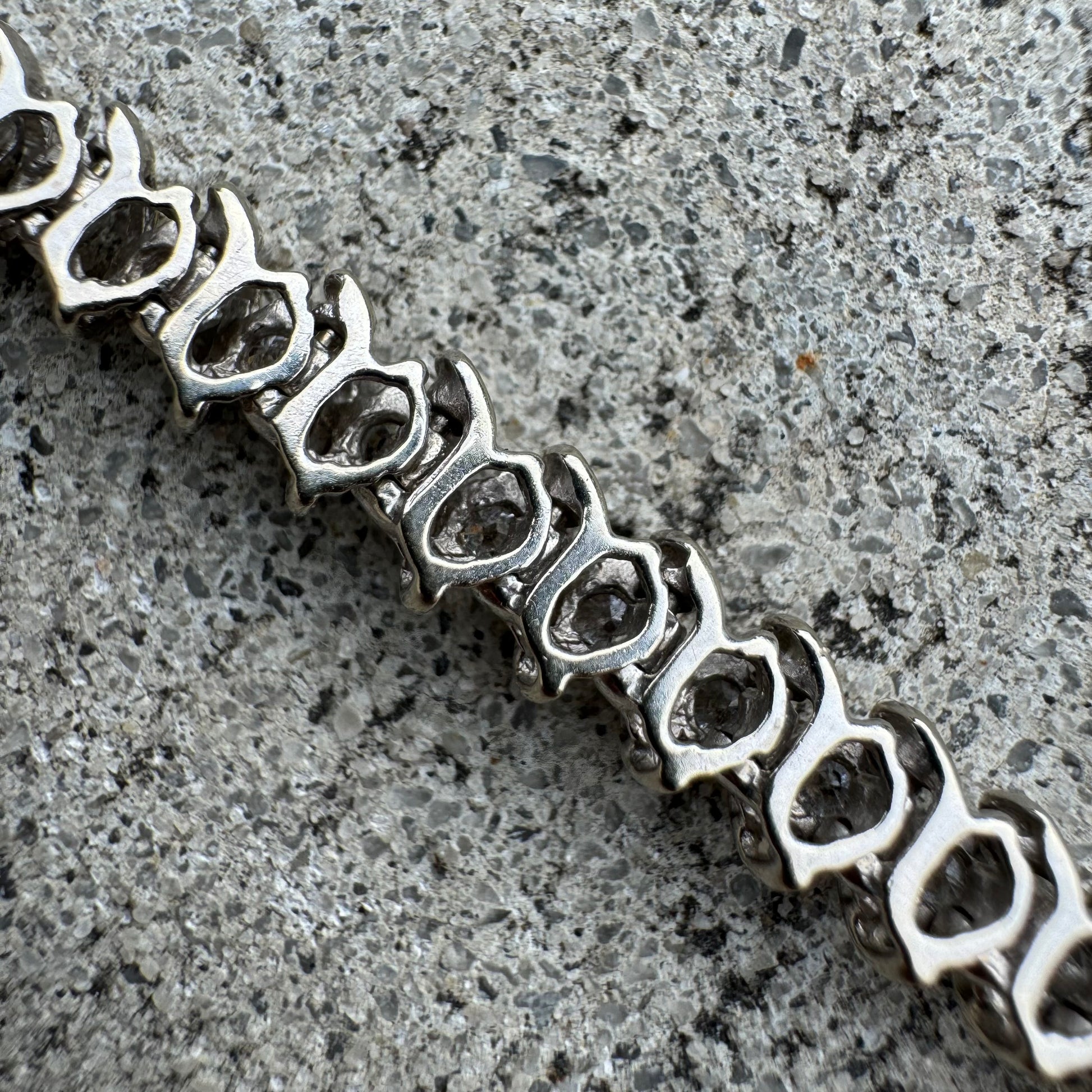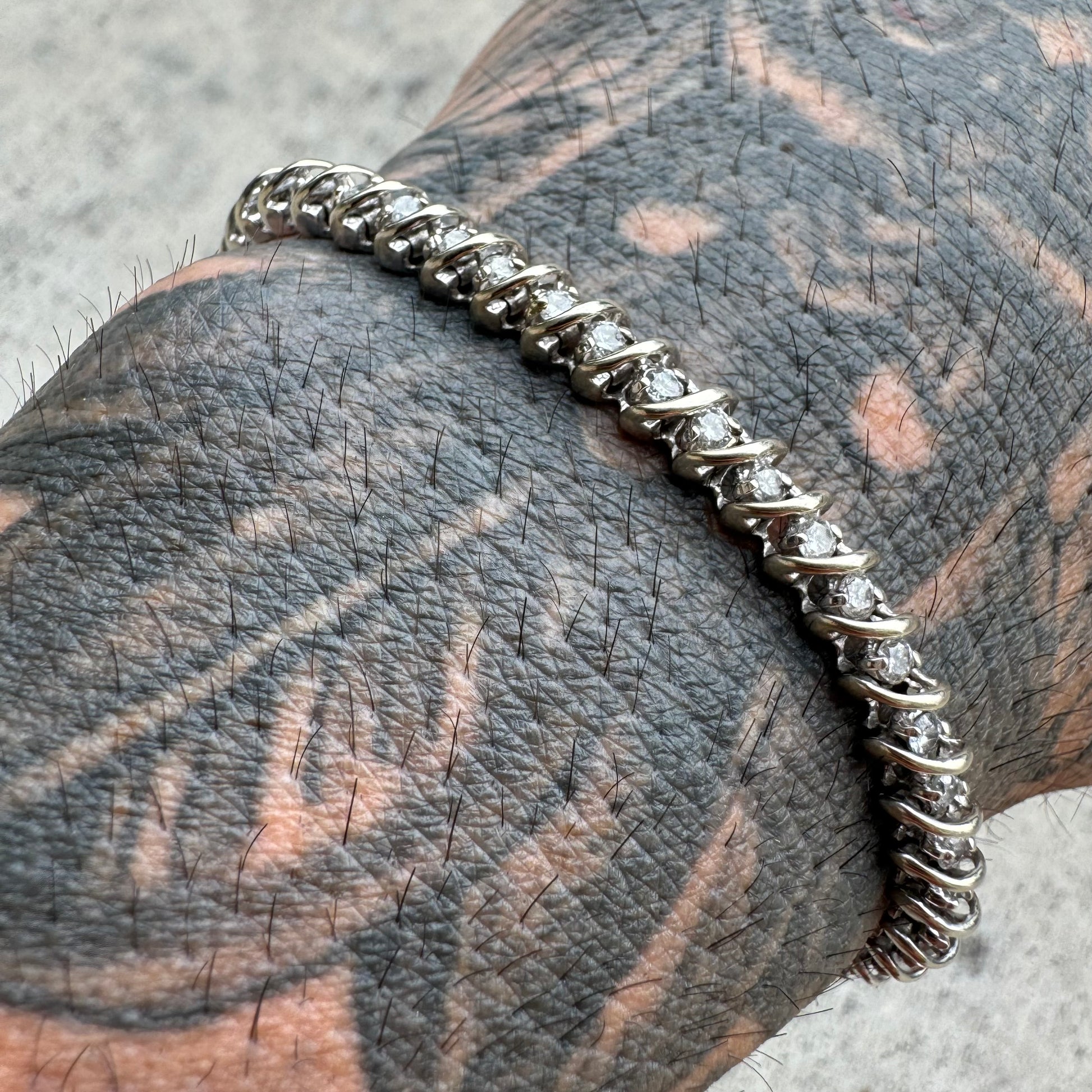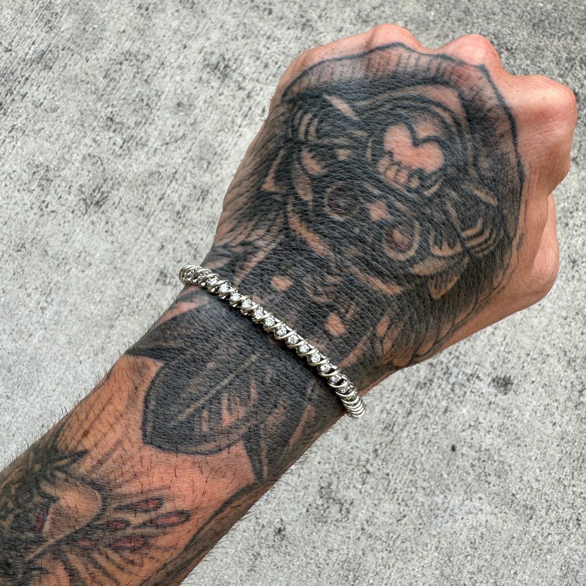 Spectacular and chunky with approximately 2.0ctw of eye clean natural SI diamonds consisting of 50 diamonds at .04ct each this heavyweight 14k white gold bracelet is very well constructed. If you look at the close up pictures of the construction on the back side you can tell how well this bracelet was made as it forms to your wrist and moves with your movement just like the vertebrae in your spine would. Thick look and feel at 5.5mm wide the gold arches in between the diamonds give off not only a protection of the diamonds but also a clean and sparkling effect. 7” wearable length and 13.66g this is an excellent deal.