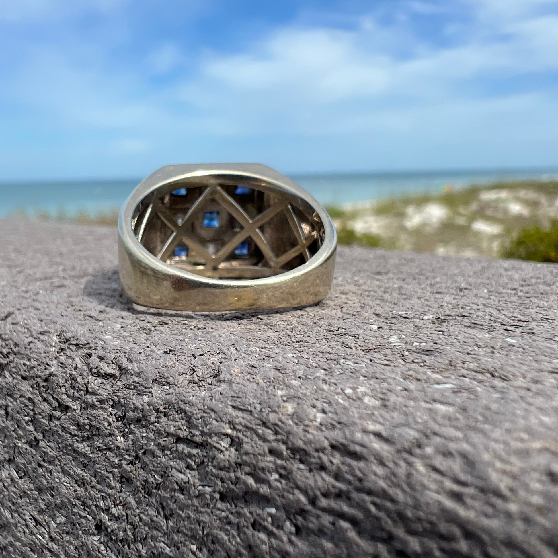 Beautiful quality natural Diamond (.20CTW) and blue Sapphire (.25CTW) heavy 14k white gold masculine ring. This ring could be many things to you as to me it looks like a dice showing a number 5 or a checkerboard pattern. Either way it’s an amazing piece with the hallmark being a K inside of house. Whichever jeweler owns that hallmark make a really high end piece of jewelry. Size:11 at 11.7g for this price point is just a plain steal.