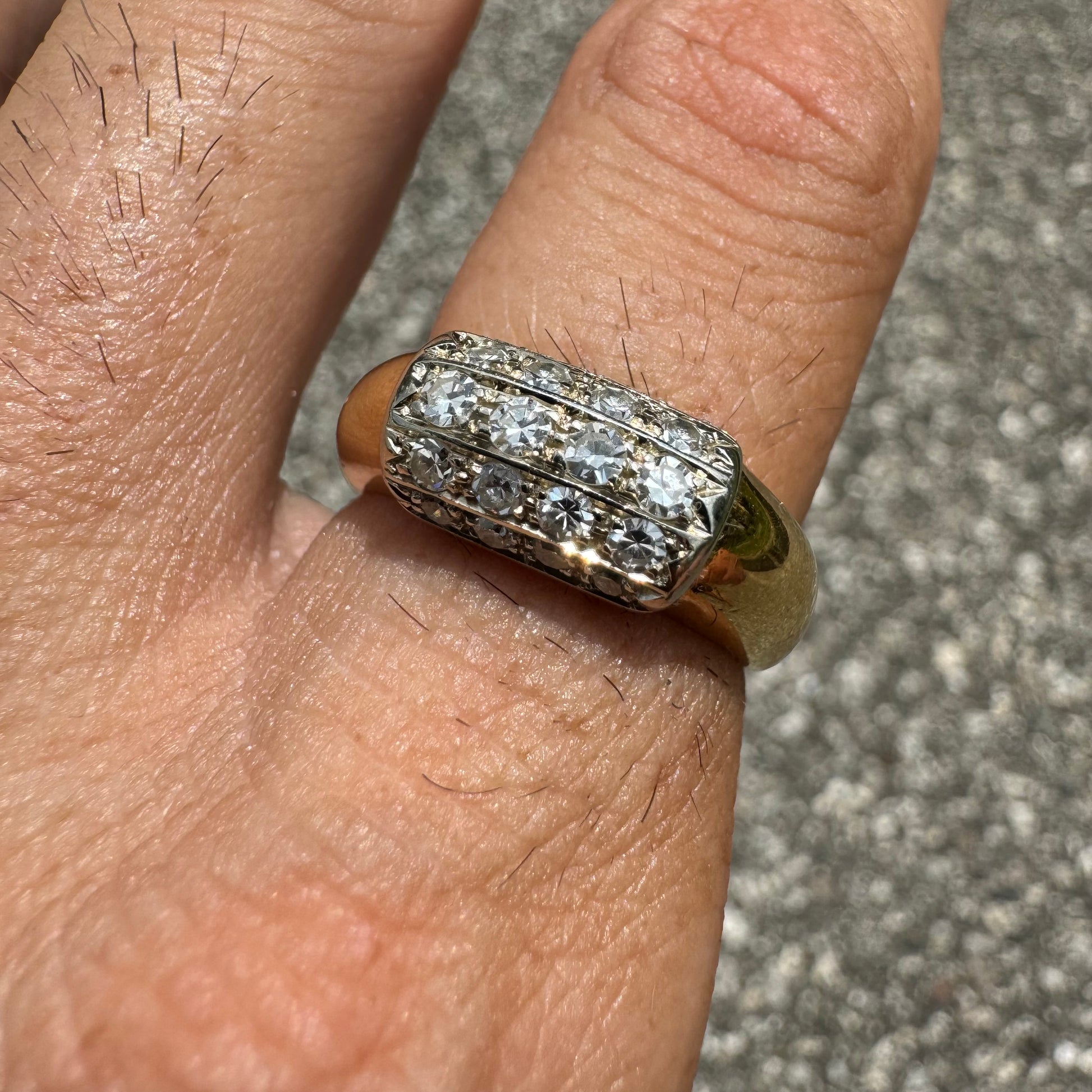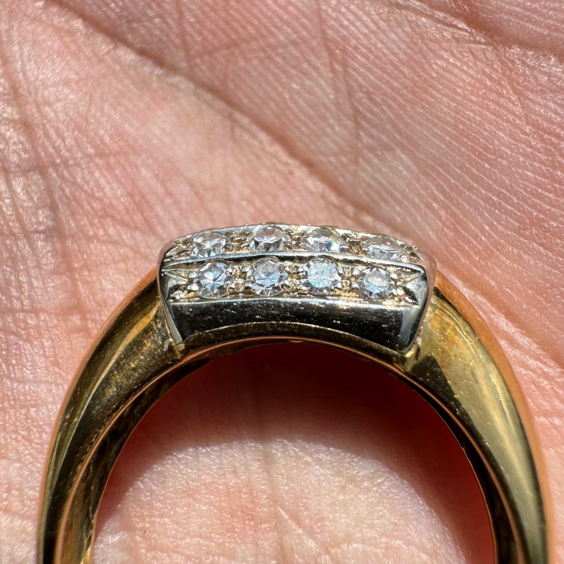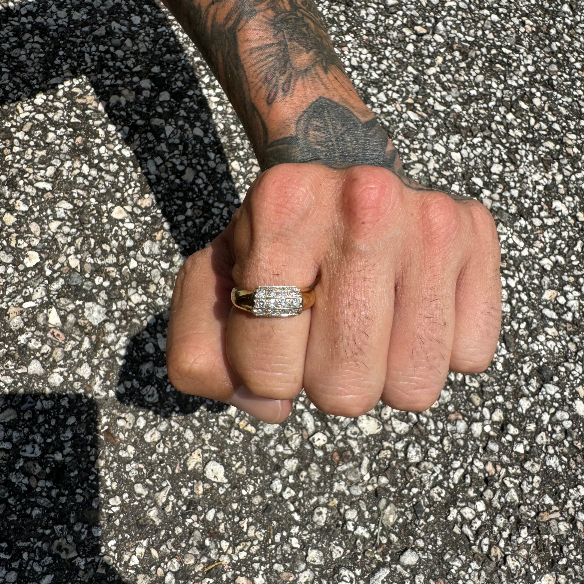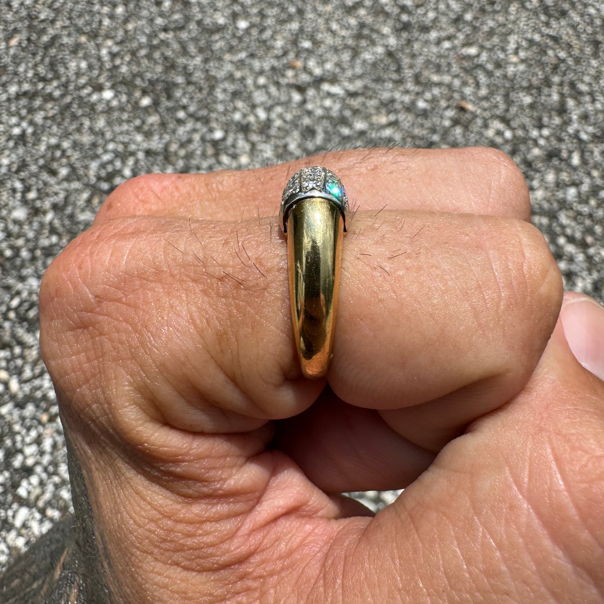 This ring is too exceptionally good to be just your average maker. From what I can see this piece is most definitely high end designer or custom made. Crafted in 2 seperate parts and expertly put together this vibrant 14k yellow gold chunky band is 8mm in width with a 1.0ctw of 20 of the best natural diamonds you can get on the market rated at VVS1/Flawless Clarity and colorless diamonds pave set into a rhodium plated topper setting bonded together to the top of the band (shown from the bottom in picture #17 ). This ring truly is so much better in person than the pictures I tried taking so imagine the best ring and that’s what you have here. A size:8.75 this ring will look killer on any finger as it weighs 6.05g