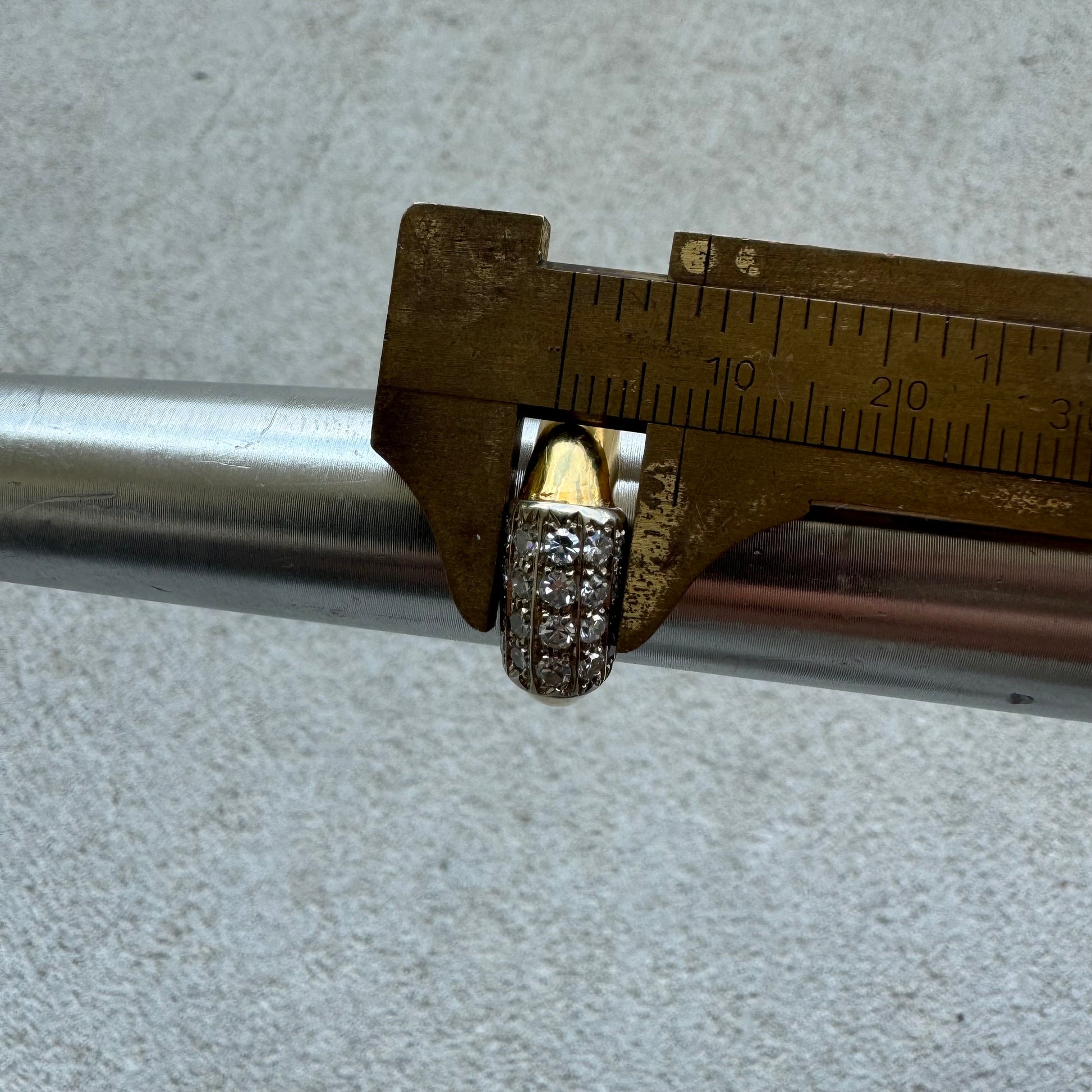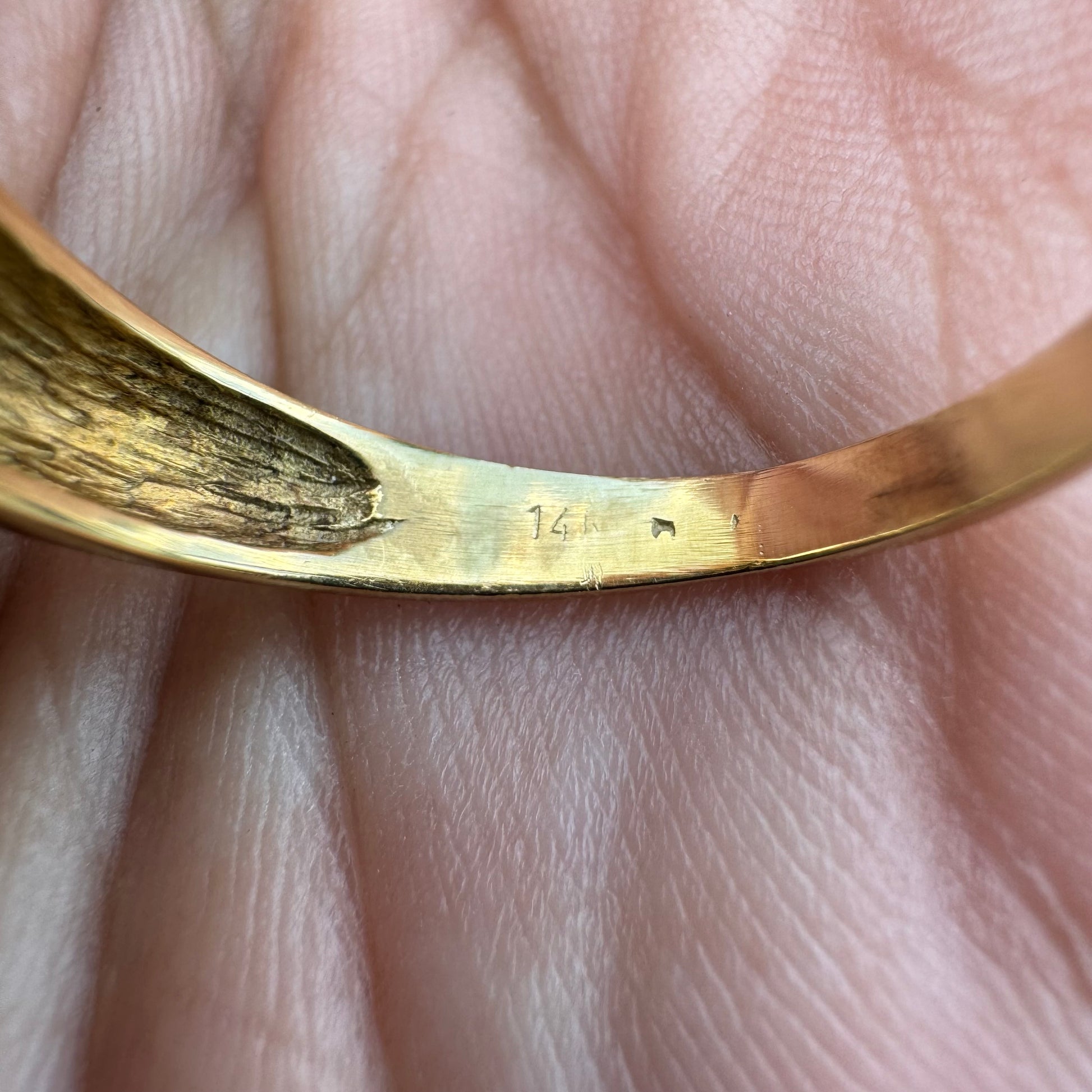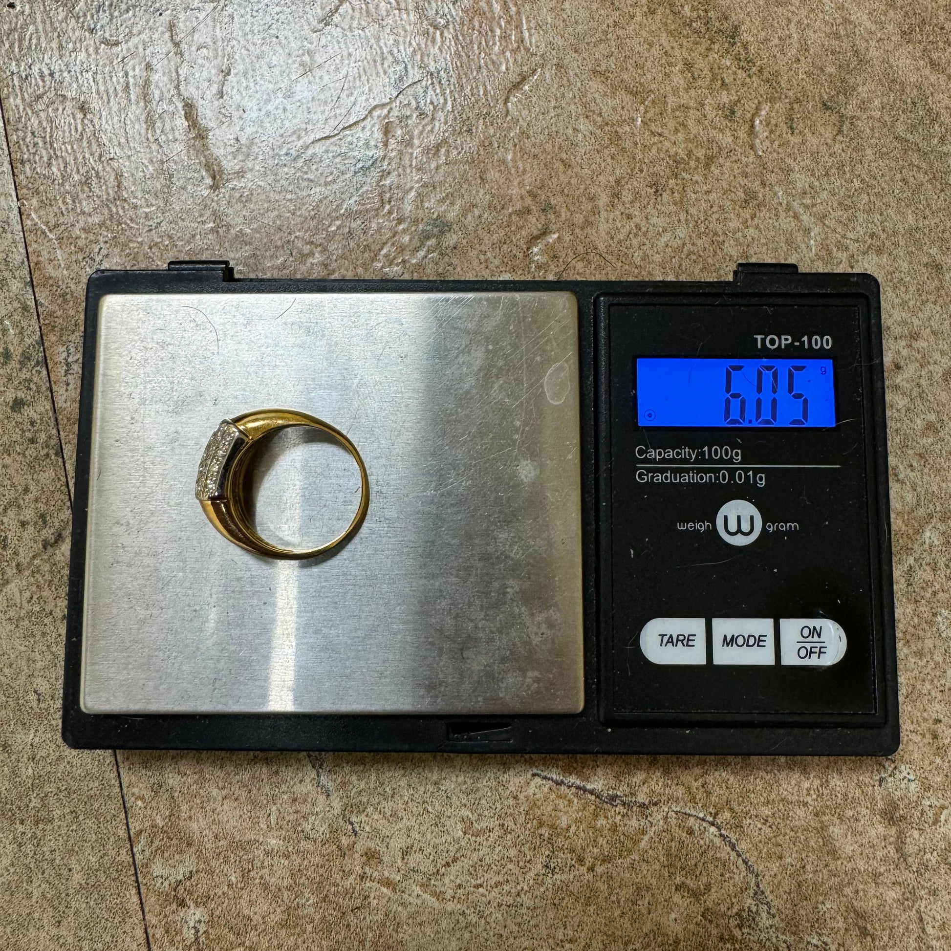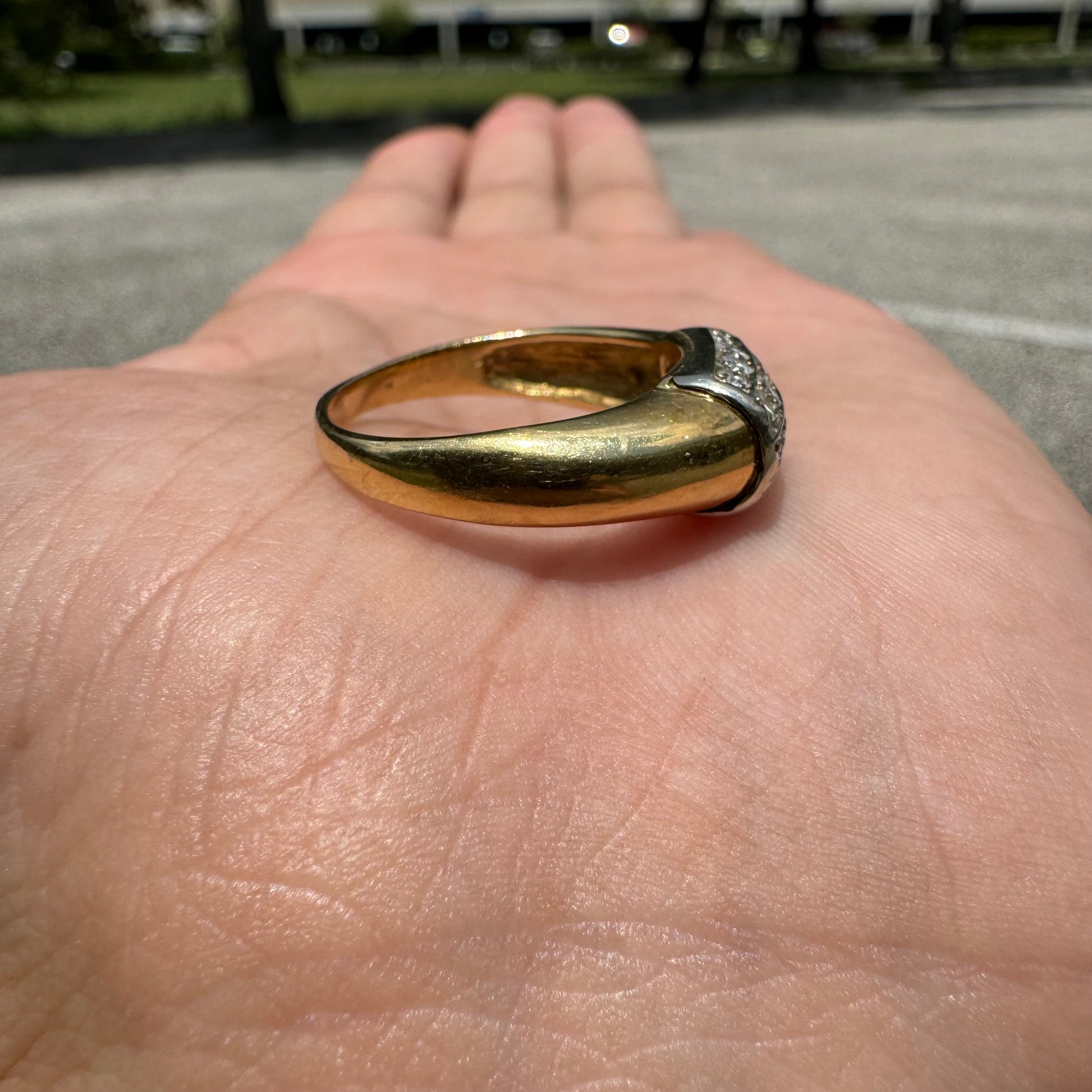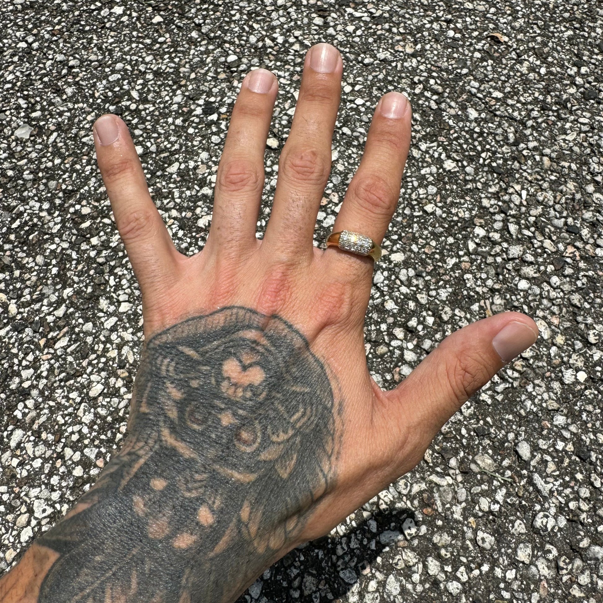 This ring is too exceptionally good to be just your average maker. From what I can see this piece is most definitely high end designer or custom made. Crafted in 2 seperate parts and expertly put together this vibrant 14k yellow gold chunky band is 8mm in width with a 1.0ctw of 20 of the best natural diamonds you can get on the market rated at VVS1/Flawless Clarity and colorless diamonds pave set into a rhodium plated topper setting bonded together to the top of the band (shown from the bottom in picture #17 ). This ring truly is so much better in person than the pictures I tried taking so imagine the best ring and that’s what you have here. A size:8.75 this ring will look killer on any finger as it weighs 6.05g