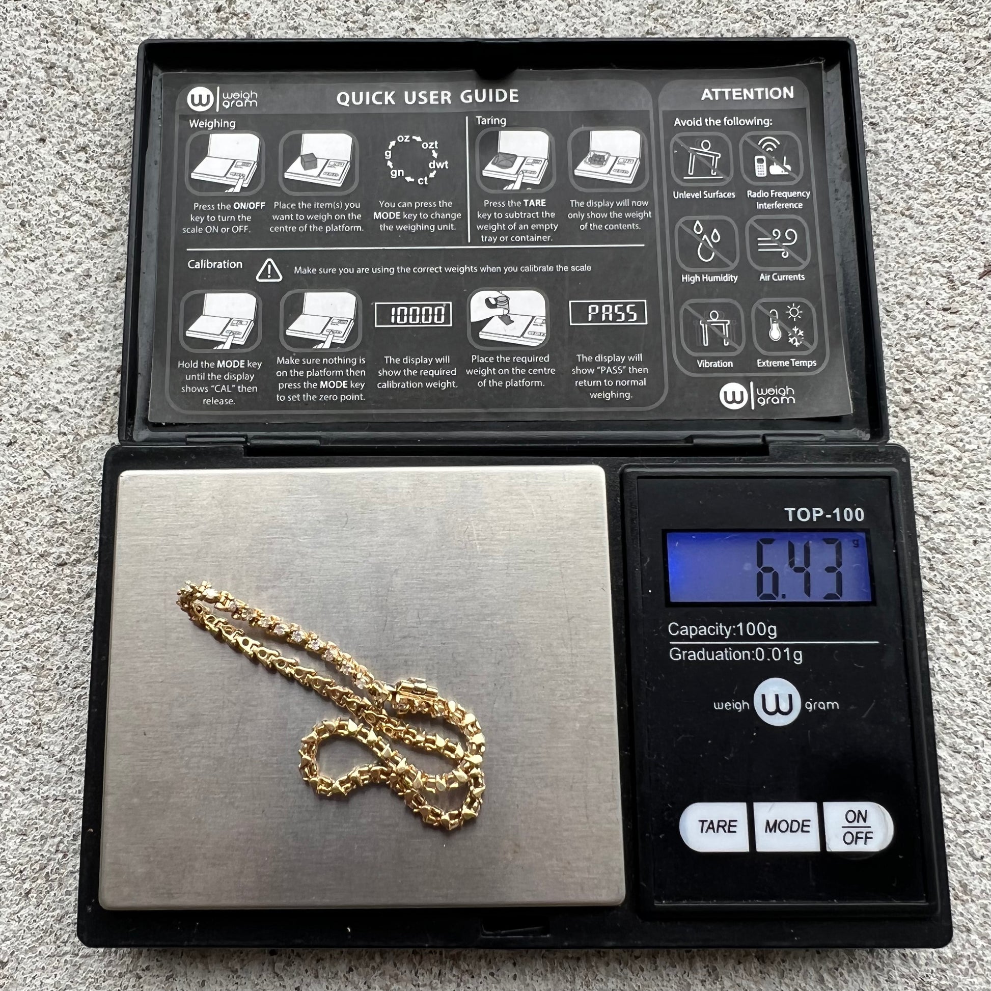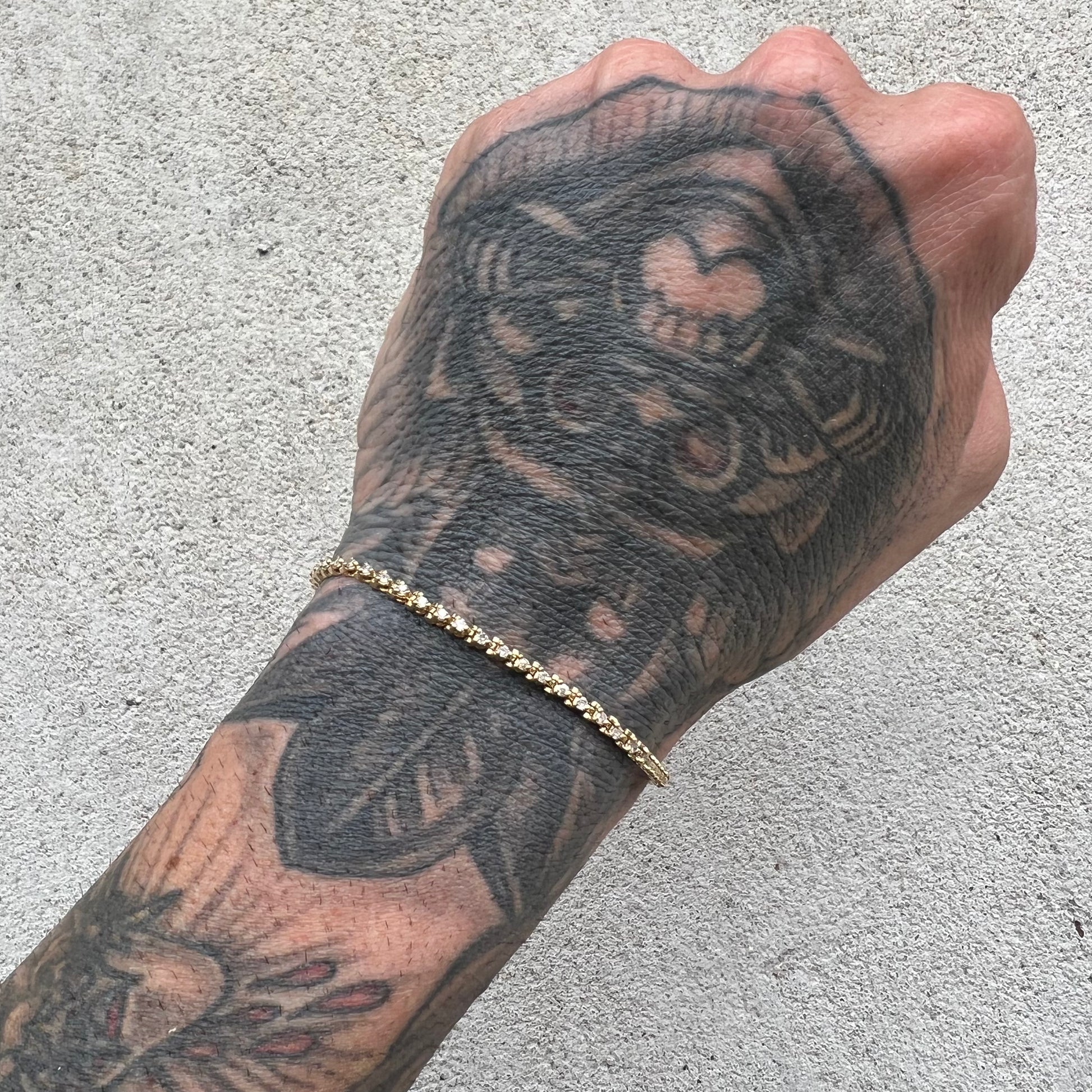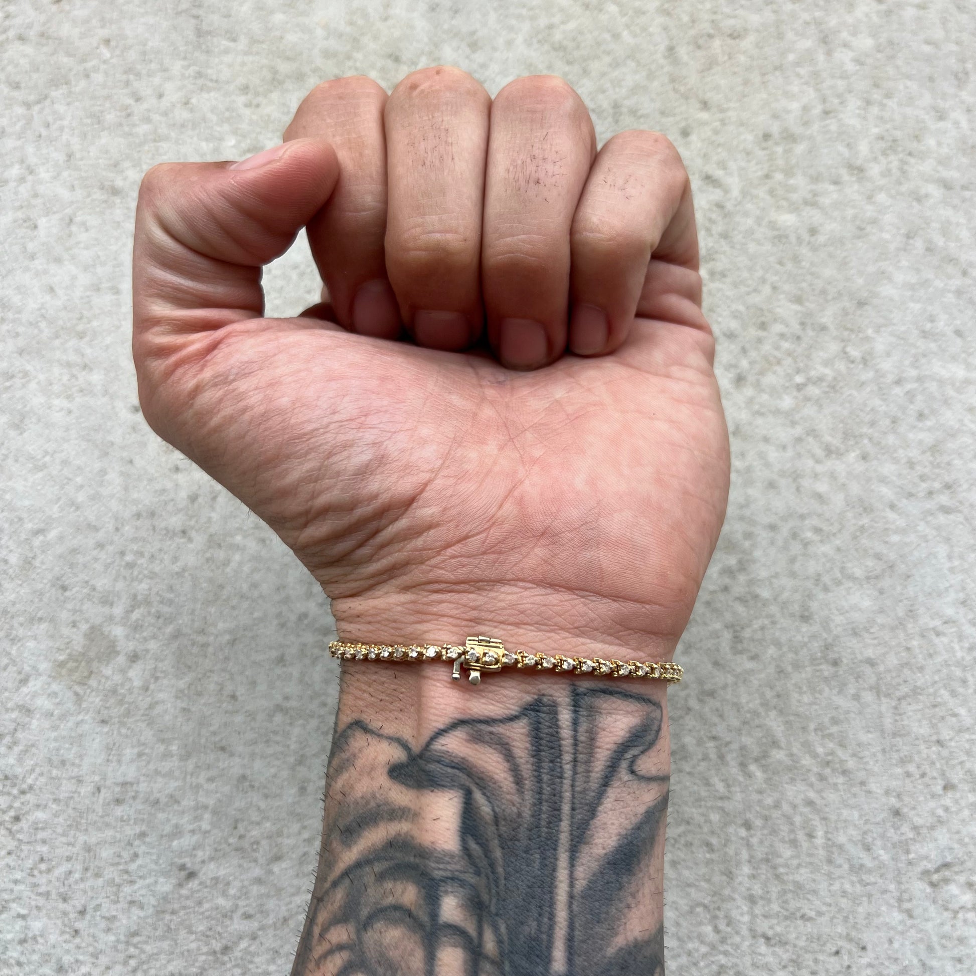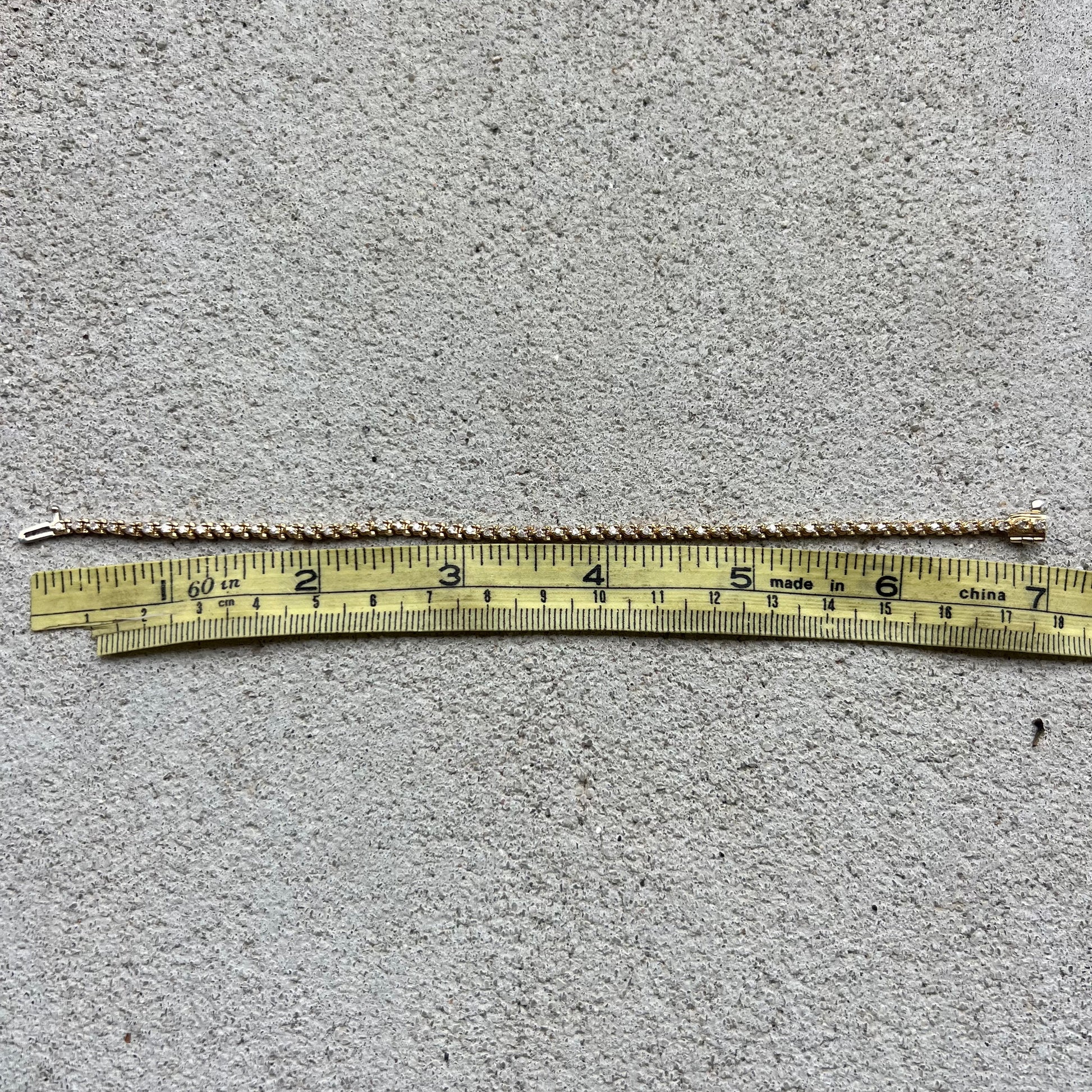 If you’re looking for a Diamond bracelet with flash and quality but not overly showing off and at an incredible price then this is the piece for you. This solid 14k yellow gold is quite heavy duty and secure consisting of a 3 prong setting holding approximately 56 natural diamonds each measuring .02ct each totaling 1.15CTW. The bracelet is made up of a hinged consistency forming and moving with the wrist as it does it’s daily functions. Secured in place with not only a lever action prong but also and under belly latch that closes and locks it in place for secondary security. Measuring approximately 7” in length end to end but fitting of 6.75” and 3mm while weighing just under 6.5g