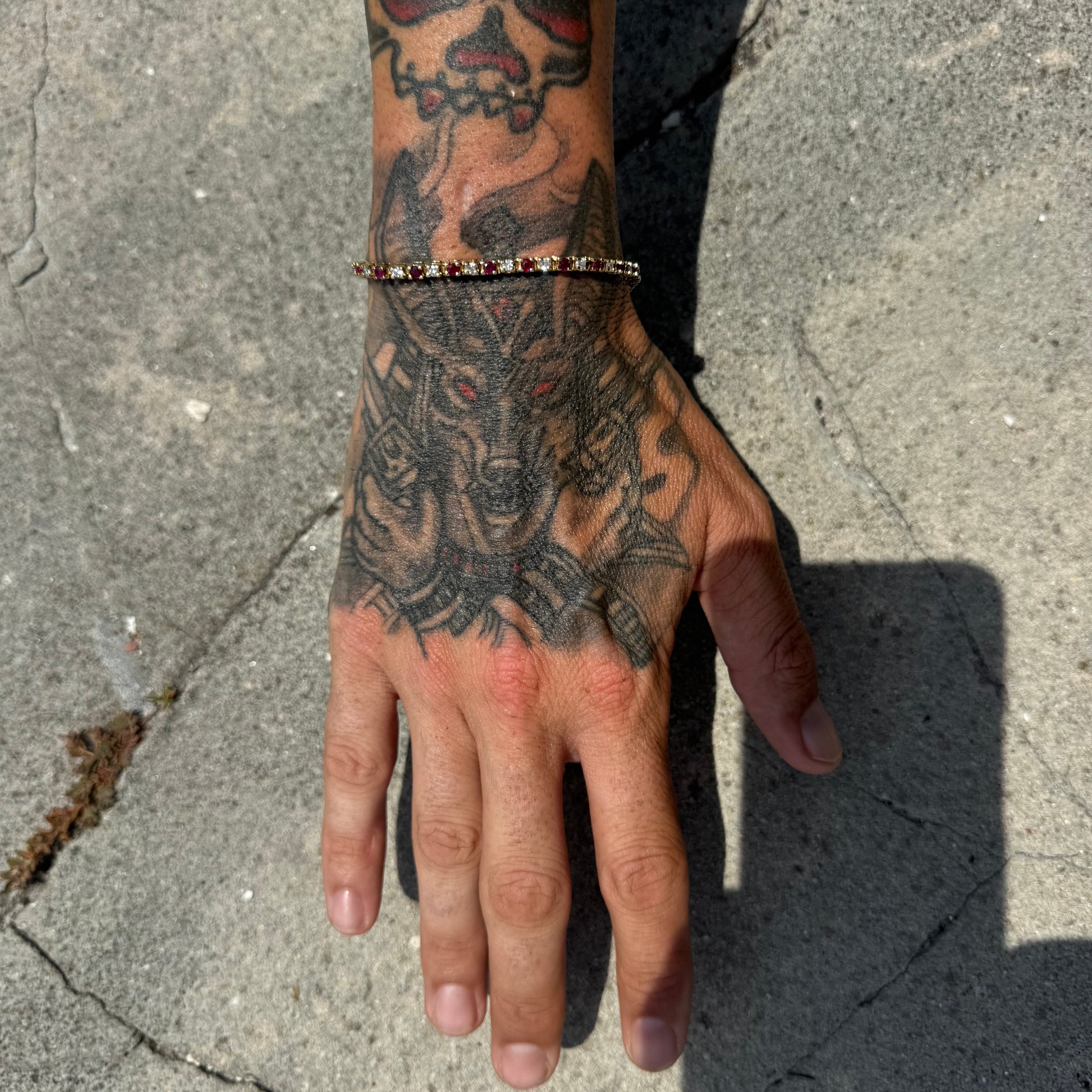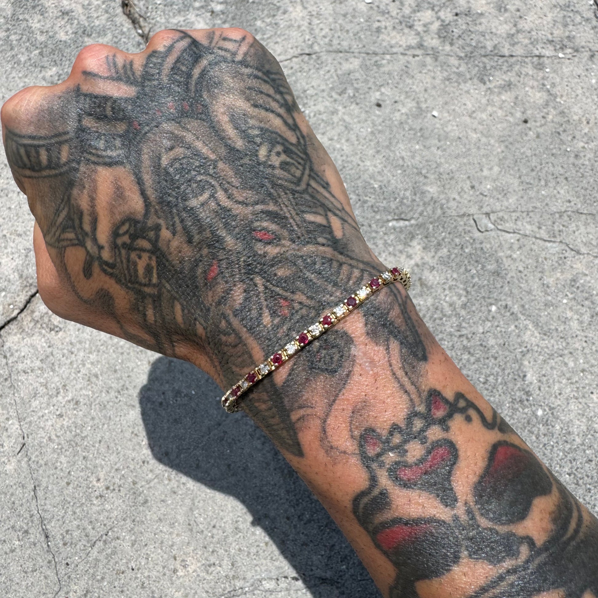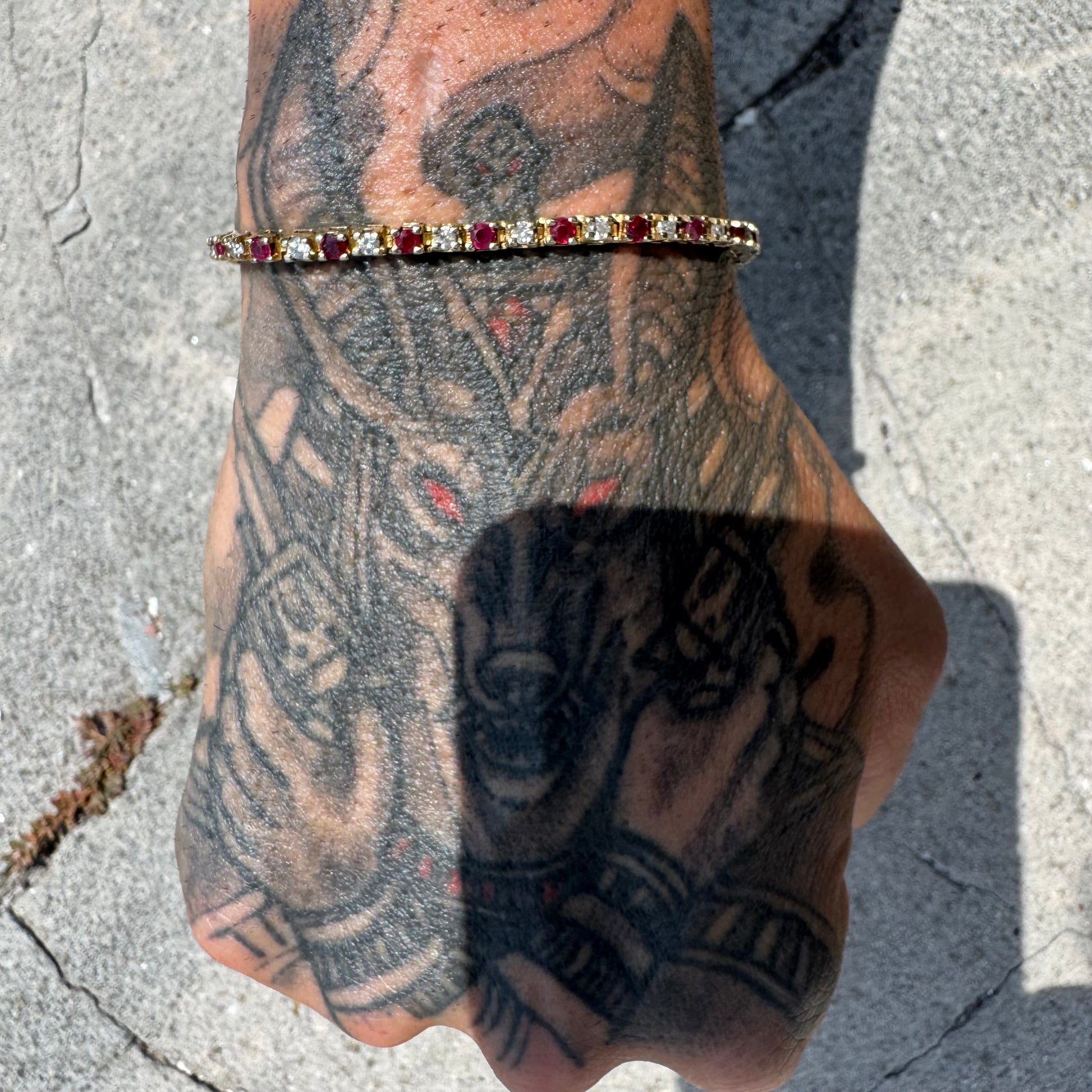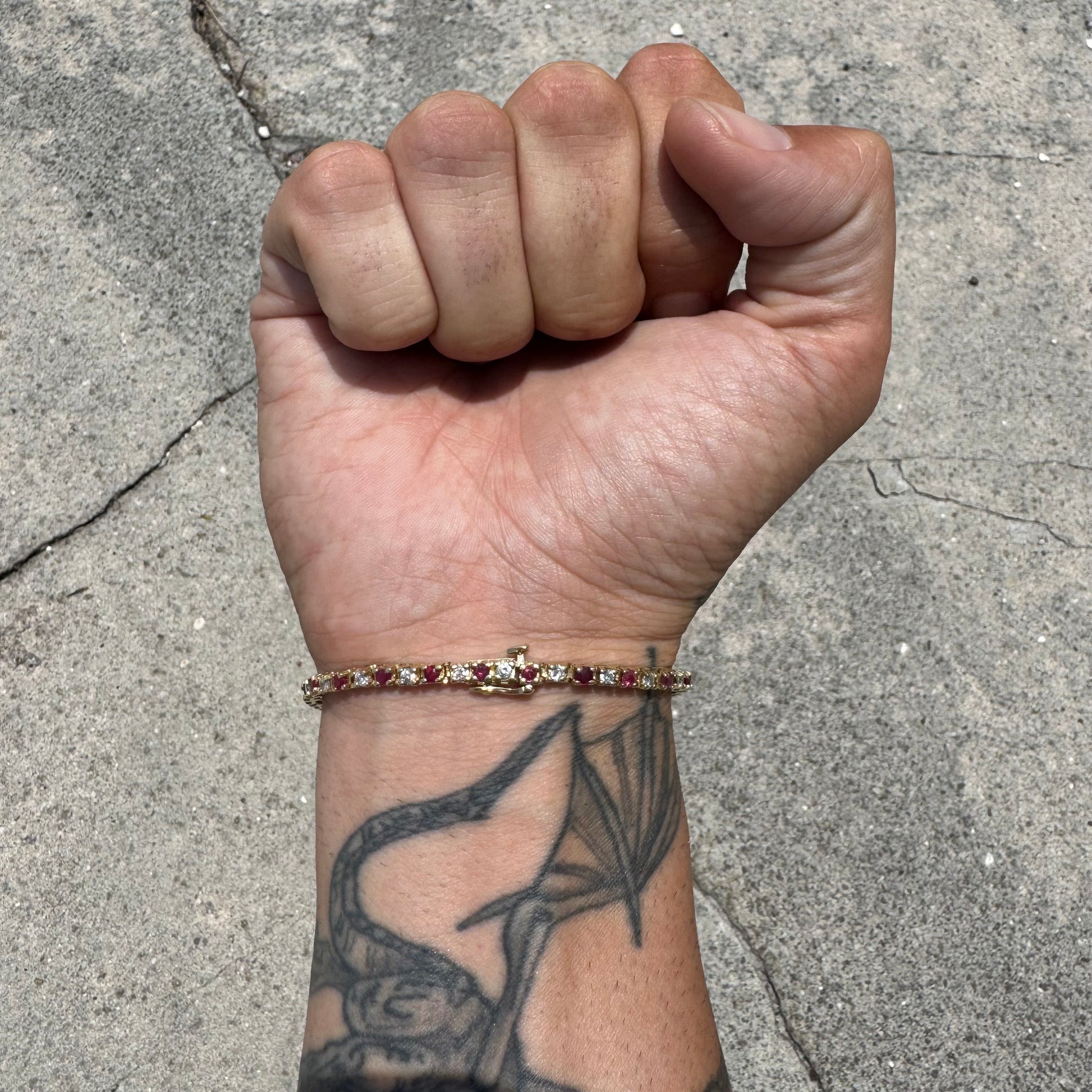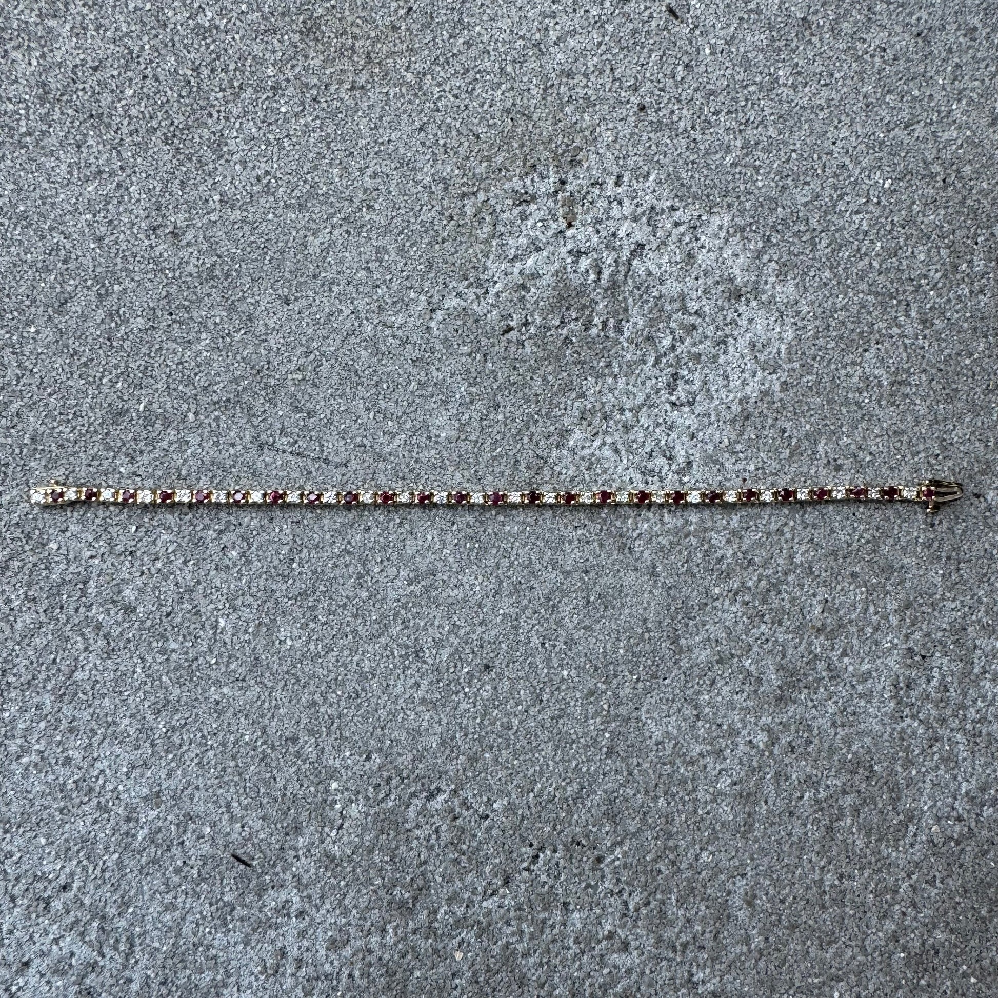Encrusted with a total of 50 natural gemstones each sized at approximately .05ct each consisting of 25 clean bright white natural diamonds (1.25ctw) and 25 pinkish red rubies (1.25ctw) strongly set in a classic style 4 prong tennis bracelet. Crafted out of a 14k yellow gold with extra safety side latch the bracelet measures and fits 7.75” at 3mm wide and weighs in at approximately 9.9g. This is a beautiful piece that looks even better in person.