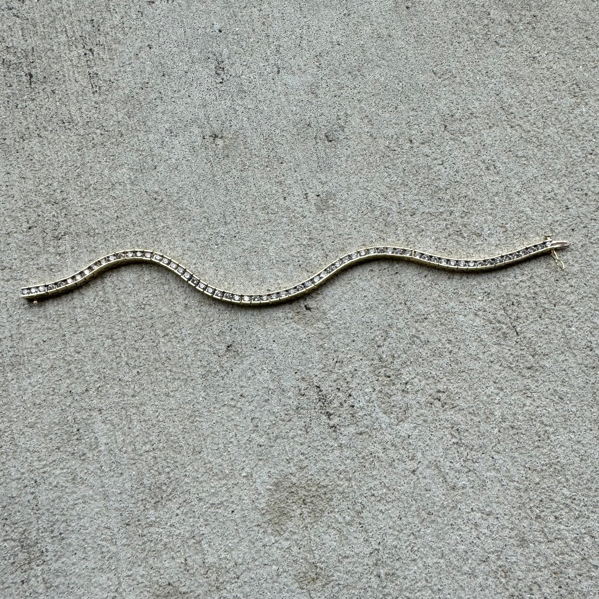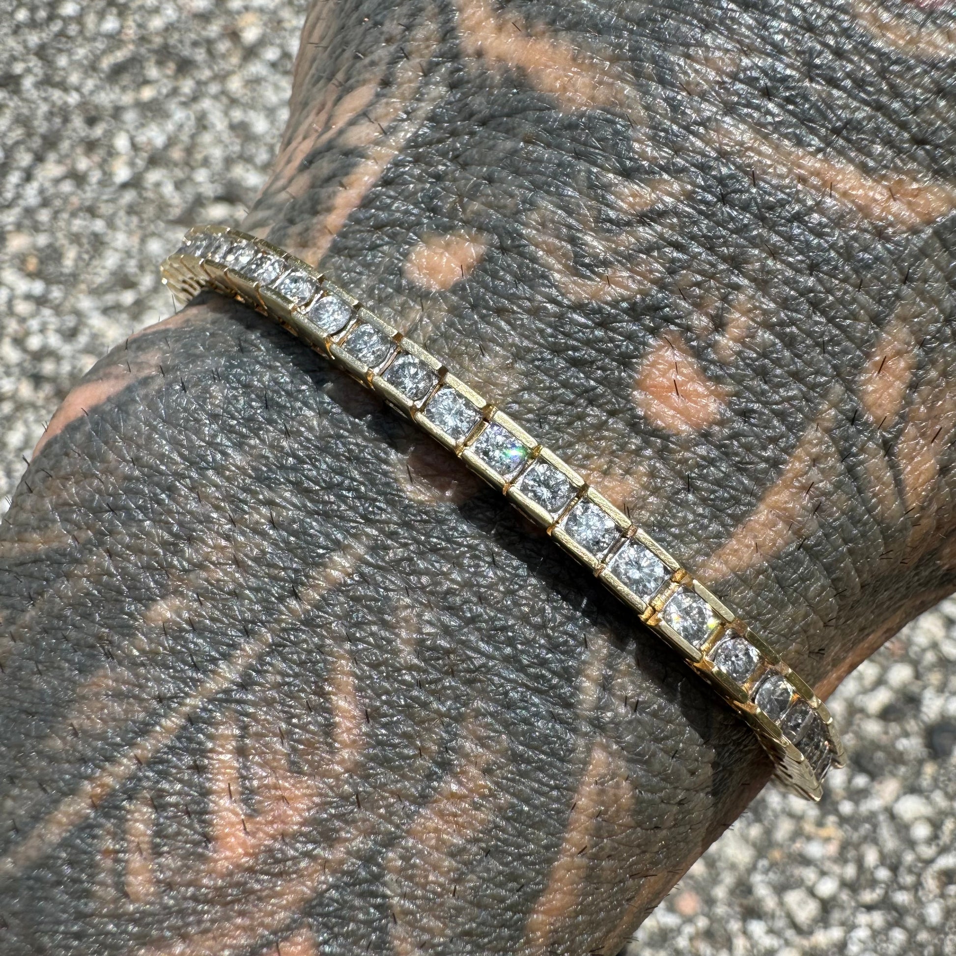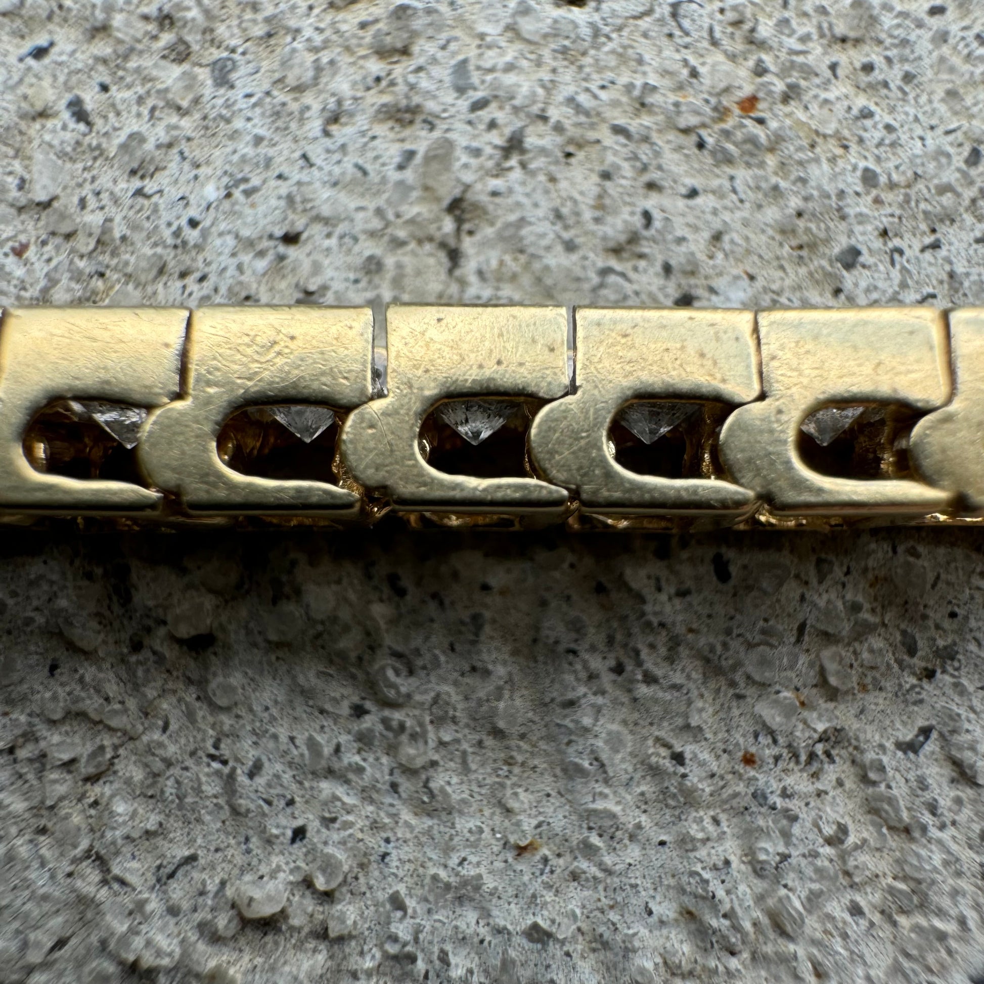 This one is an absolute stunner, In the sun and on the wrist it looks like a disco ball in full effect. With 62 natural diamonds all at approximately .065ct each jumps this pretty lady up to a total of 4.0CTW. Crafted out of a heavy and high quality 14k yellow gold channel set vertebrae style bracelet setting weighing a heavyweight of 15.7g by 4mm wide and a wearable longer length of 8.25”, which is hard to find in the vintage diamond tennis bracelets. Very comfortable and form fitting the bracelet forms to your wrist and moves with your movement just like the vertebrae in your spine would. If you look close at the back and side construction of the bracelet you’ll see exactly the analogy I mean.