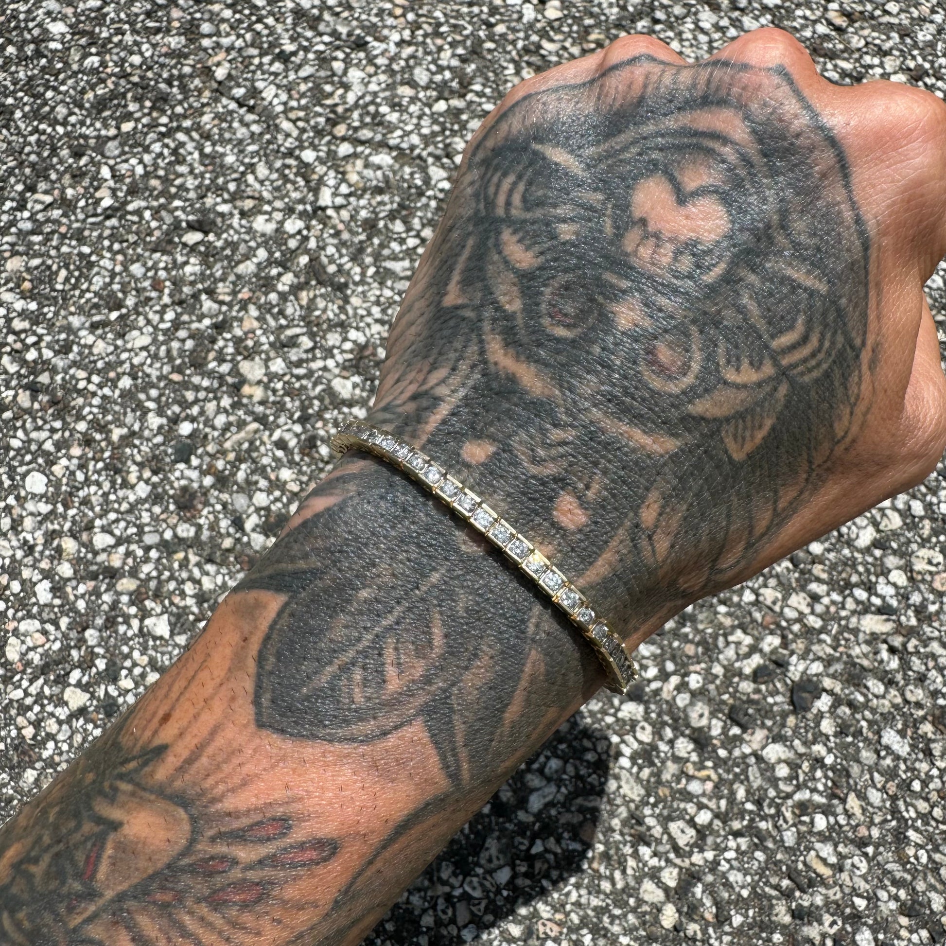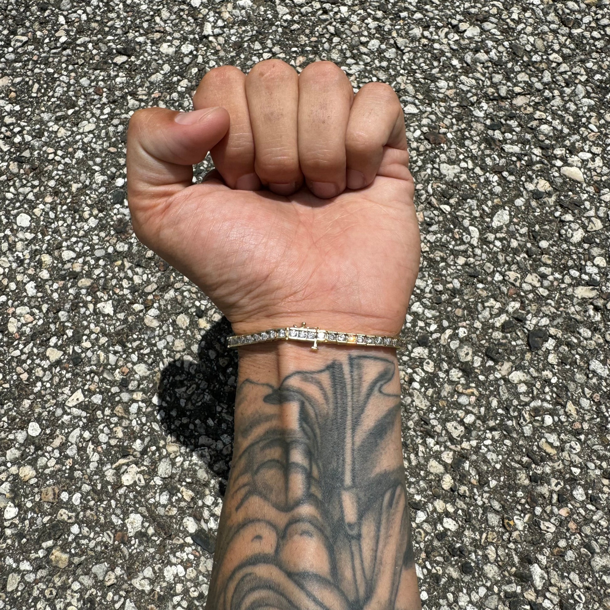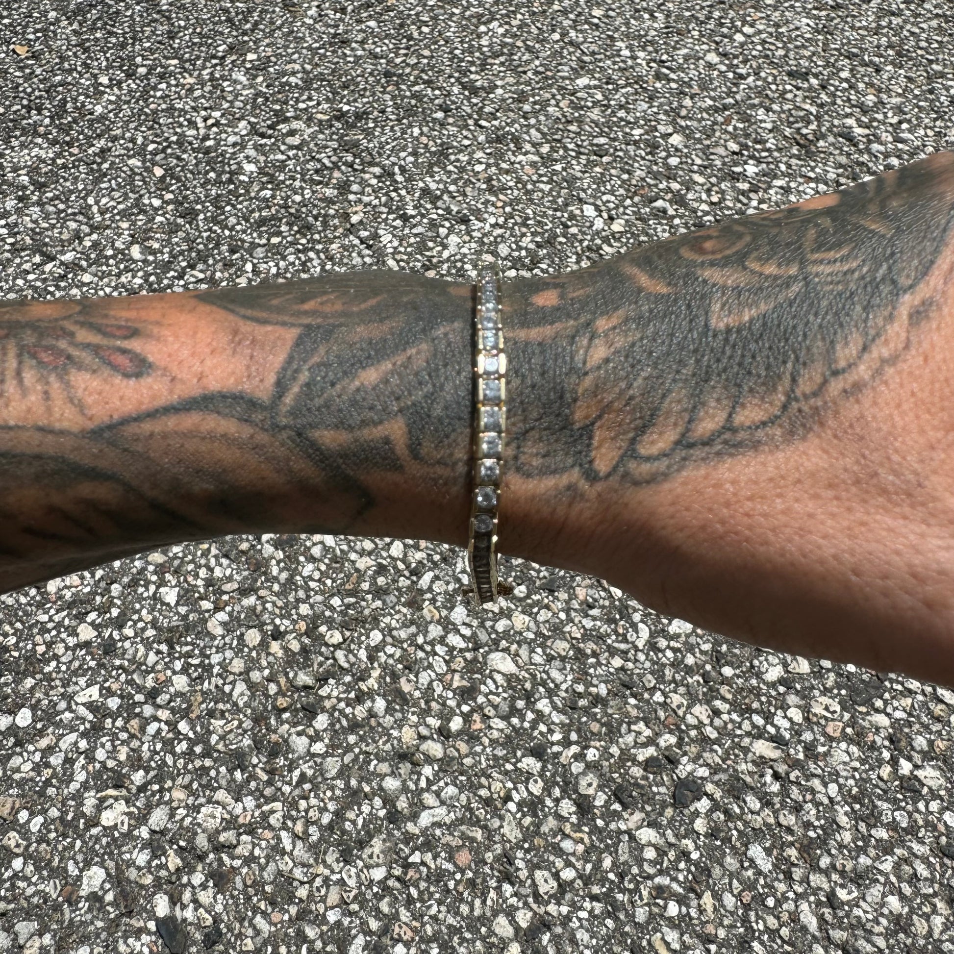 This one is an absolute stunner, In the sun and on the wrist it looks like a disco ball in full effect. With 62 natural diamonds all at approximately .065ct each jumps this pretty lady up to a total of 4.0CTW. Crafted out of a heavy and high quality 14k yellow gold channel set vertebrae style bracelet setting weighing a heavyweight of 15.7g by 4mm wide and a wearable longer length of 8.25”, which is hard to find in the vintage diamond tennis bracelets. Very comfortable and form fitting the bracelet forms to your wrist and moves with your movement just like the vertebrae in your spine would. If you look close at the back and side construction of the bracelet you’ll see exactly the analogy I mean.