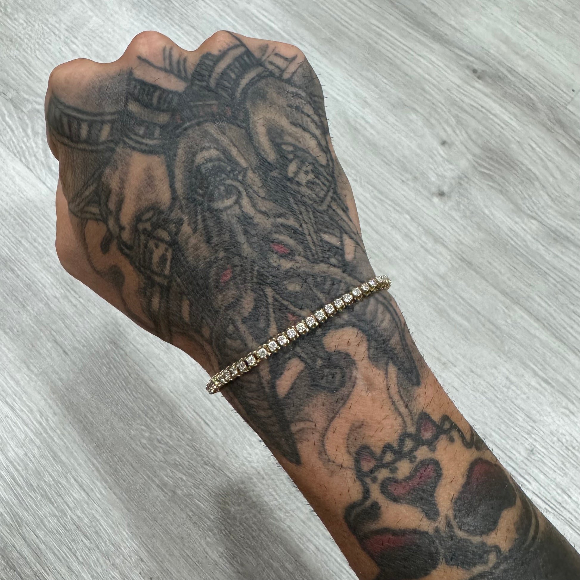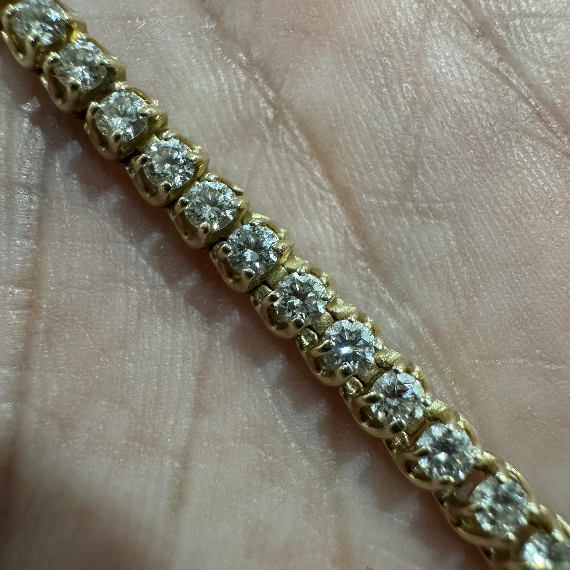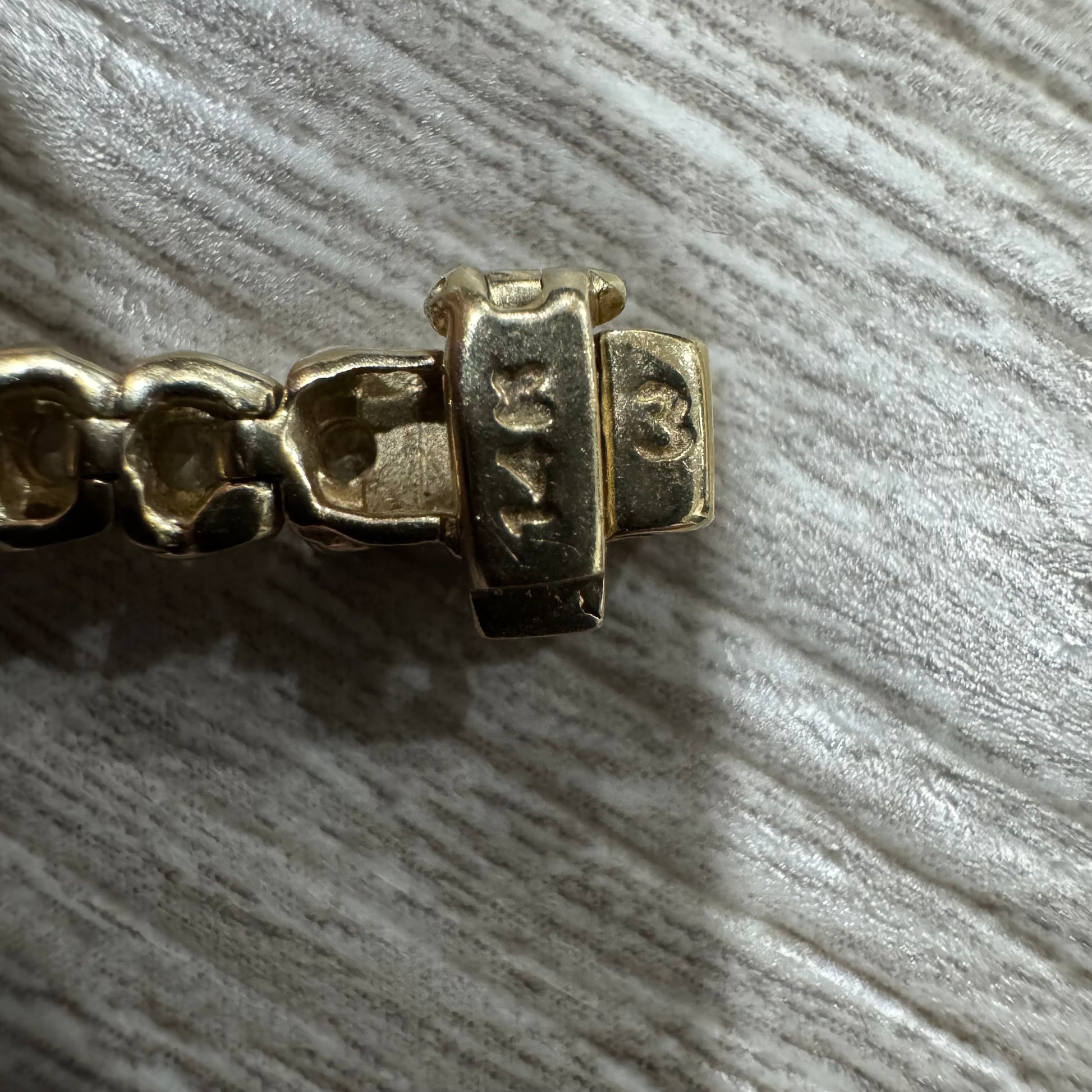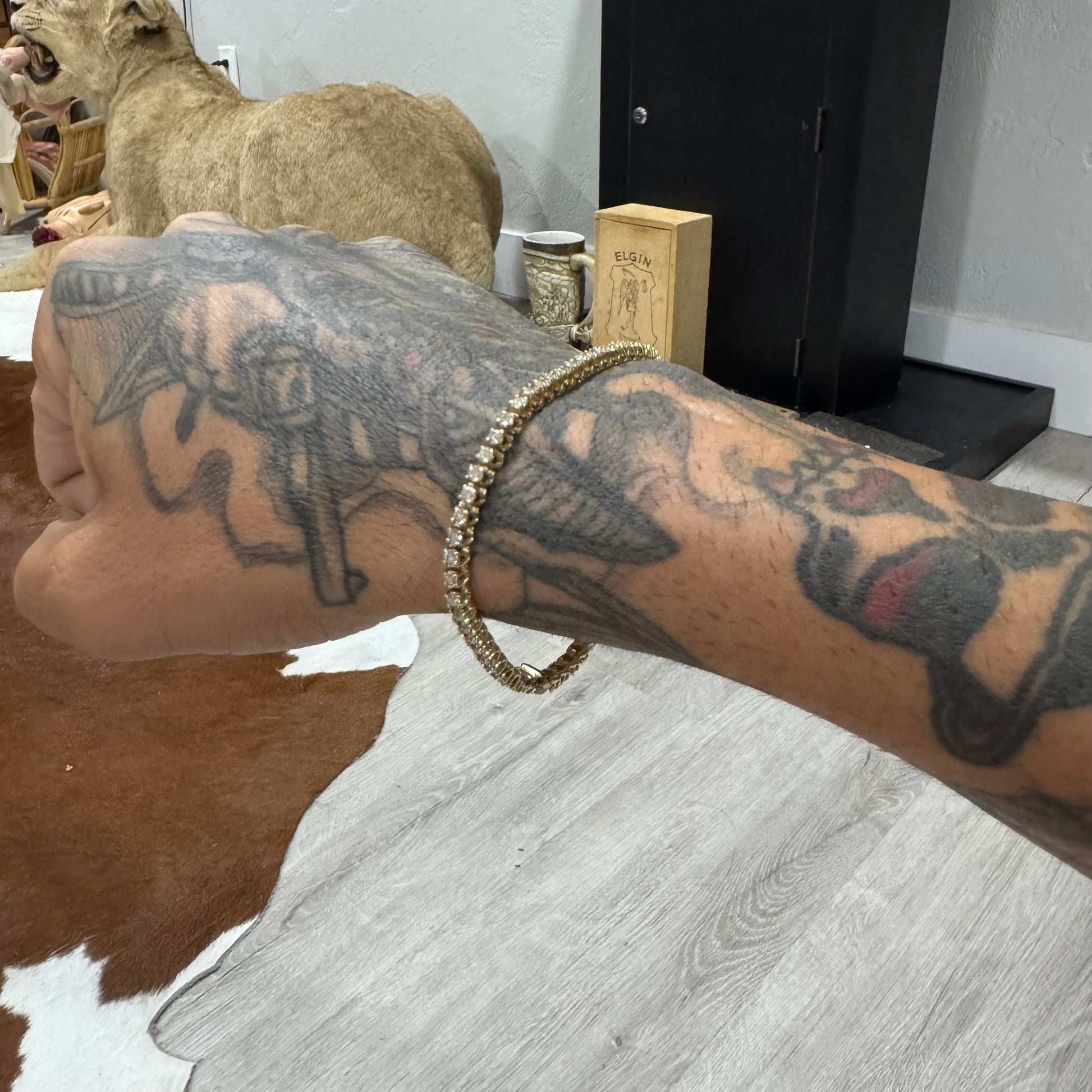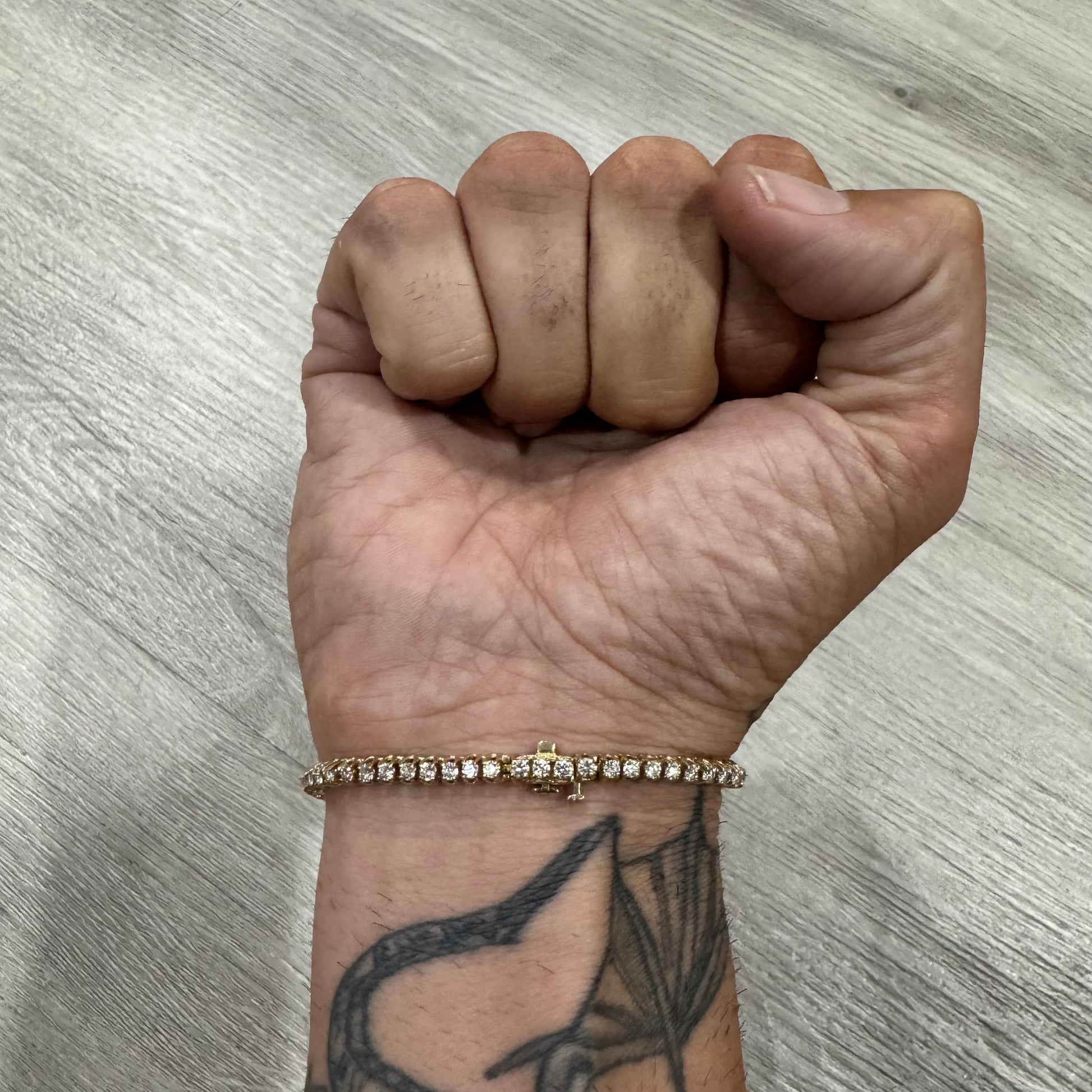 Diamond tennis bracelets have took on many shapes and forms over the years but the classic 4 prong set showing off more Diamond than gold still reigns supreme. All set in a solid 14k yellow gold each link is securely hinged to one another with flexibility and comfortability first and foremost without overly intruding on the diamonds as the main centerpiece. Some tennis bracelets seem to overshadow the diamonds with more chunky gold but this classic style does the opposite. The gold is there as the accent to accentuate the 60 all natural crystal clear and clean diamonds as the focal point this allows for a full view of the diamond without giving the opportunity for the gold bracelet to hide any imperfections therefore only utilizing the cleanest diamonds. Hallmarked with a 3 on the back underside clasp each diamond is approximately .05ct bringing the total of the piece to 3.0ctw. Acting like somewhat of a spine these links will move and bend to the wrist just like that of your vertebrae in the spine would and as you look at the links from the sides and back they give off that exact appearance and performance. Measuring just at a fitting 7” (not including the male portion of the clasp) the bracelet weighs in at 10.5g while 4mm wide. Double safety latching feature allows for extra security with not only the main locking clasp but also the underside safety latch. This is the classic heirloom style tennis bracelet you’ve been searching for that will never go out of style at a more than affordable price point comparative to any other 3.0ctw diamond bracelets on the market. Sidenote; I tried my best to take pictures outside in natural sun light as well inside with artificial lighting but none really capture how beautiful this is in person.