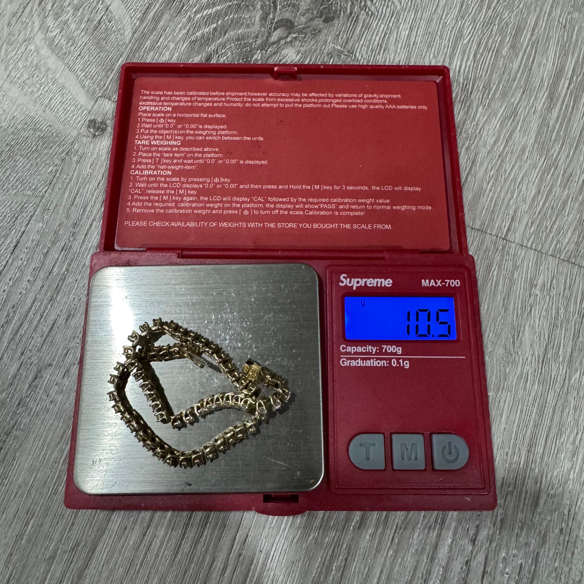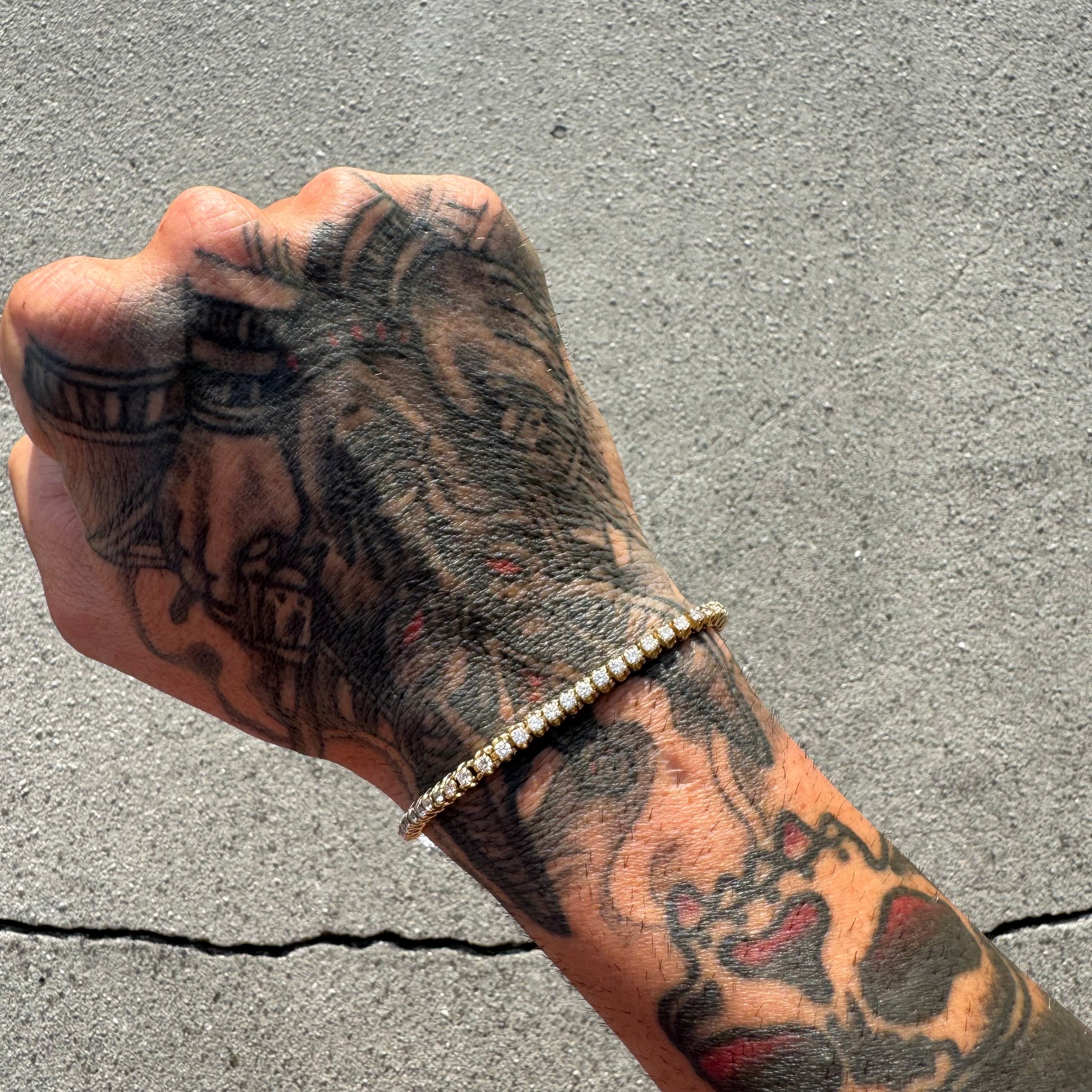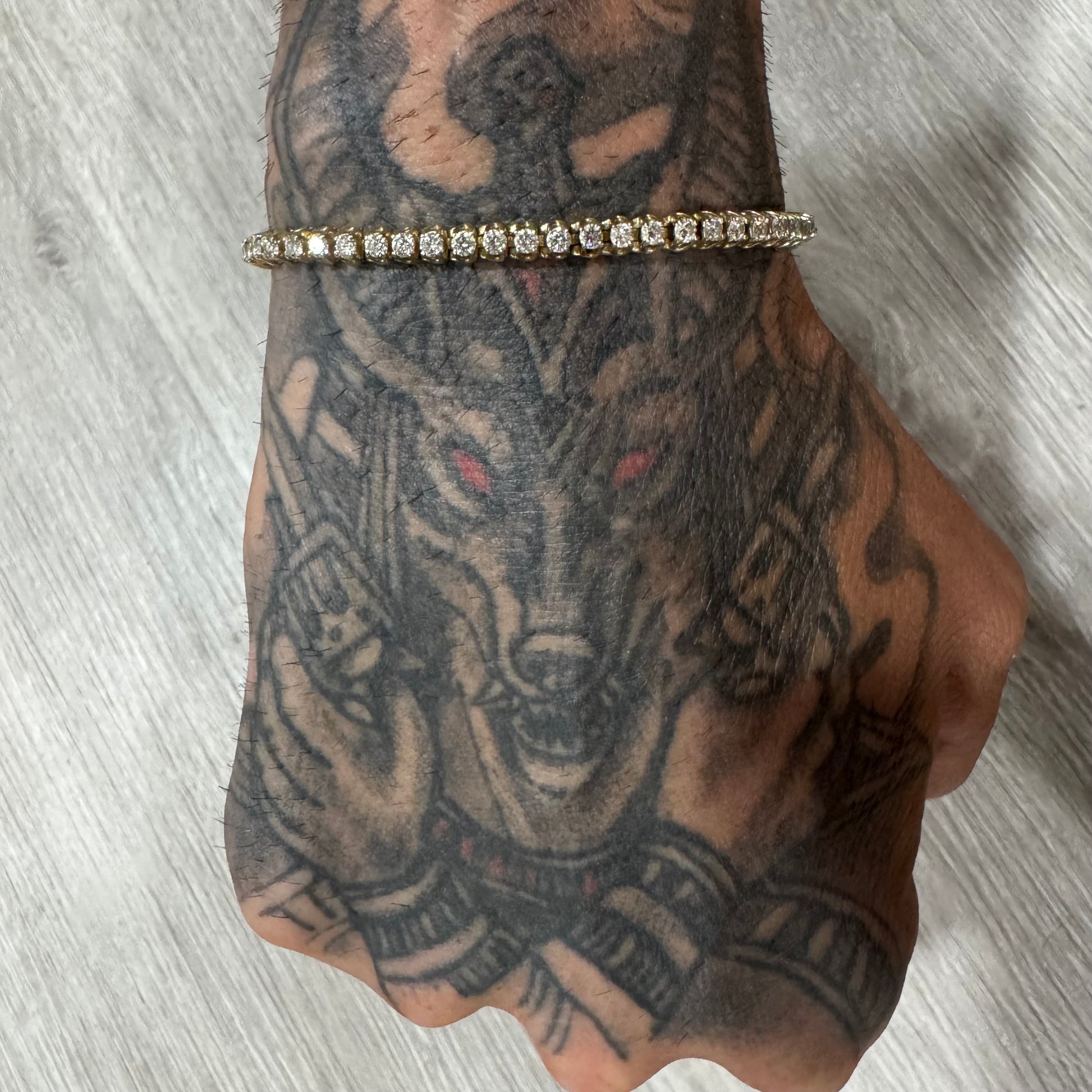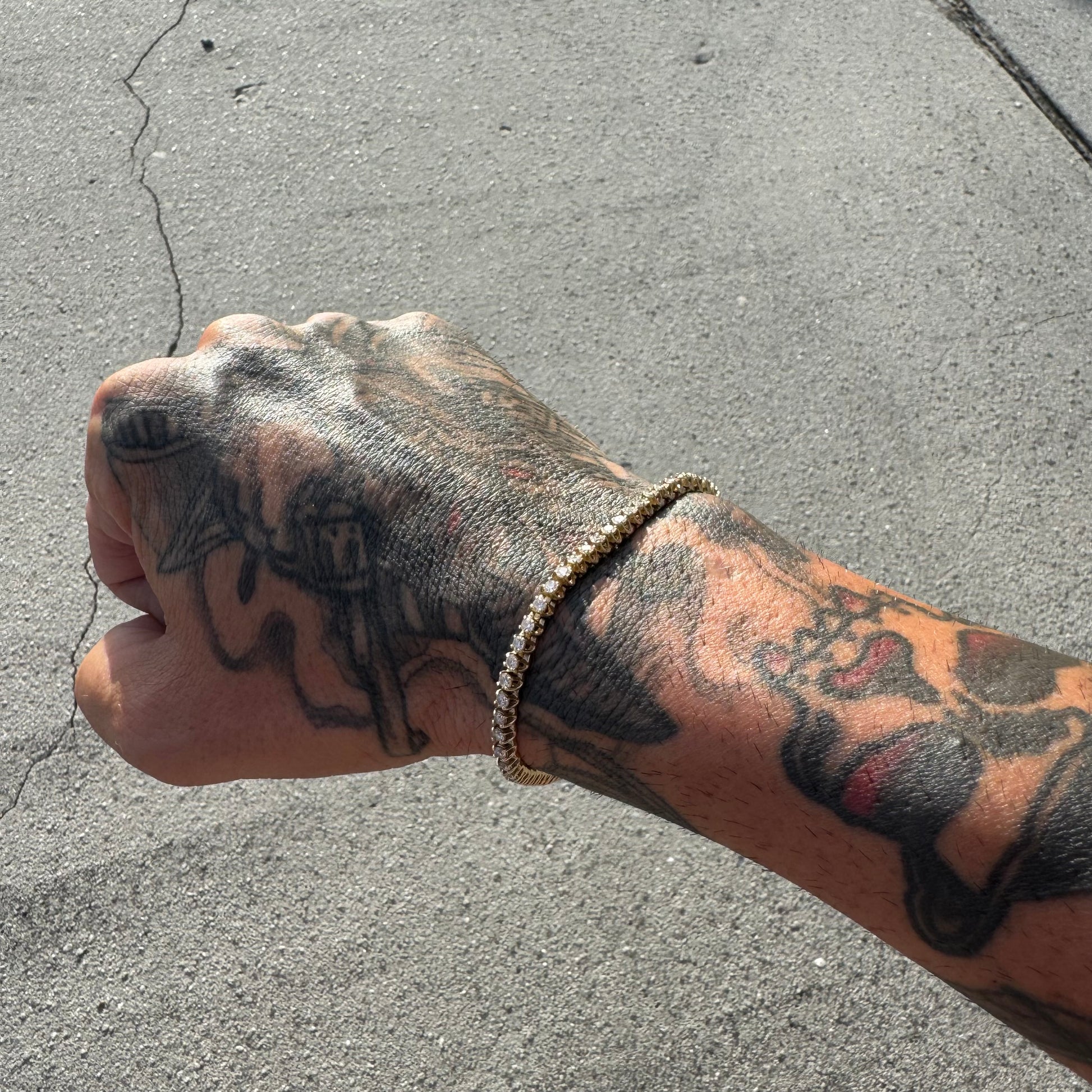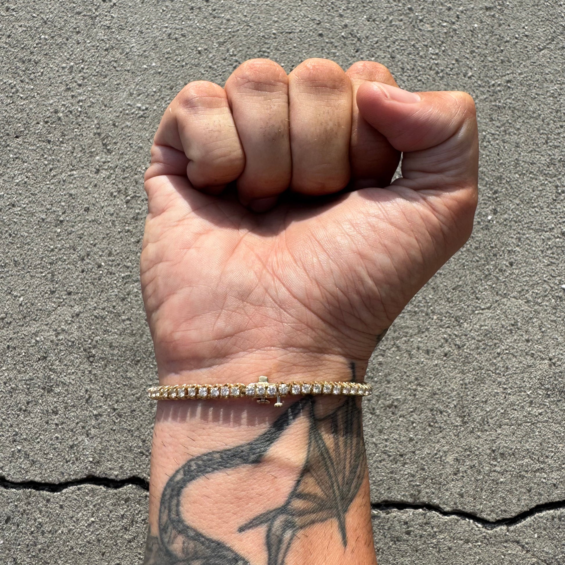 Diamond tennis bracelets have took on many shapes and forms over the years but the classic 4 prong set showing off more Diamond than gold still reigns supreme. All set in a solid 14k yellow gold each link is securely hinged to one another with flexibility and comfortability first and foremost without overly intruding on the diamonds as the main centerpiece. Some tennis bracelets seem to overshadow the diamonds with more chunky gold but this classic style does the opposite. The gold is there as the accent to accentuate the 60 all natural crystal clear and clean diamonds as the focal point this allows for a full view of the diamond without giving the opportunity for the gold bracelet to hide any imperfections therefore only utilizing the cleanest diamonds. Hallmarked with a 3 on the back underside clasp each diamond is approximately .05ct bringing the total of the piece to 3.0ctw. Acting like somewhat of a spine these links will move and bend to the wrist just like that of your vertebrae in the spine would and as you look at the links from the sides and back they give off that exact appearance and performance. Measuring just at a fitting 7” (not including the male portion of the clasp) the bracelet weighs in at 10.5g while 4mm wide. Double safety latching feature allows for extra security with not only the main locking clasp but also the underside safety latch. This is the classic heirloom style tennis bracelet you’ve been searching for that will never go out of style at a more than affordable price point comparative to any other 3.0ctw diamond bracelets on the market. Sidenote; I tried my best to take pictures outside in natural sun light as well inside with artificial lighting but none really capture how beautiful this is in person.