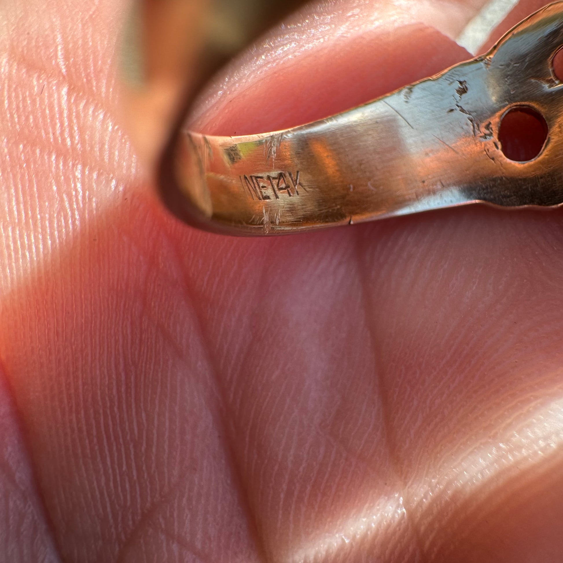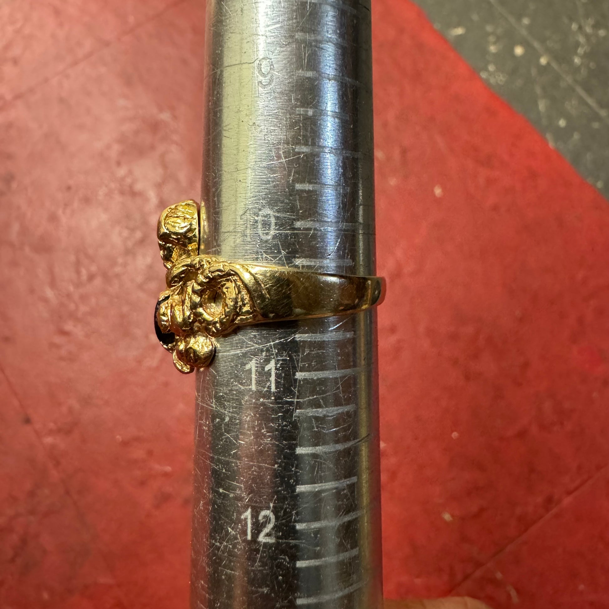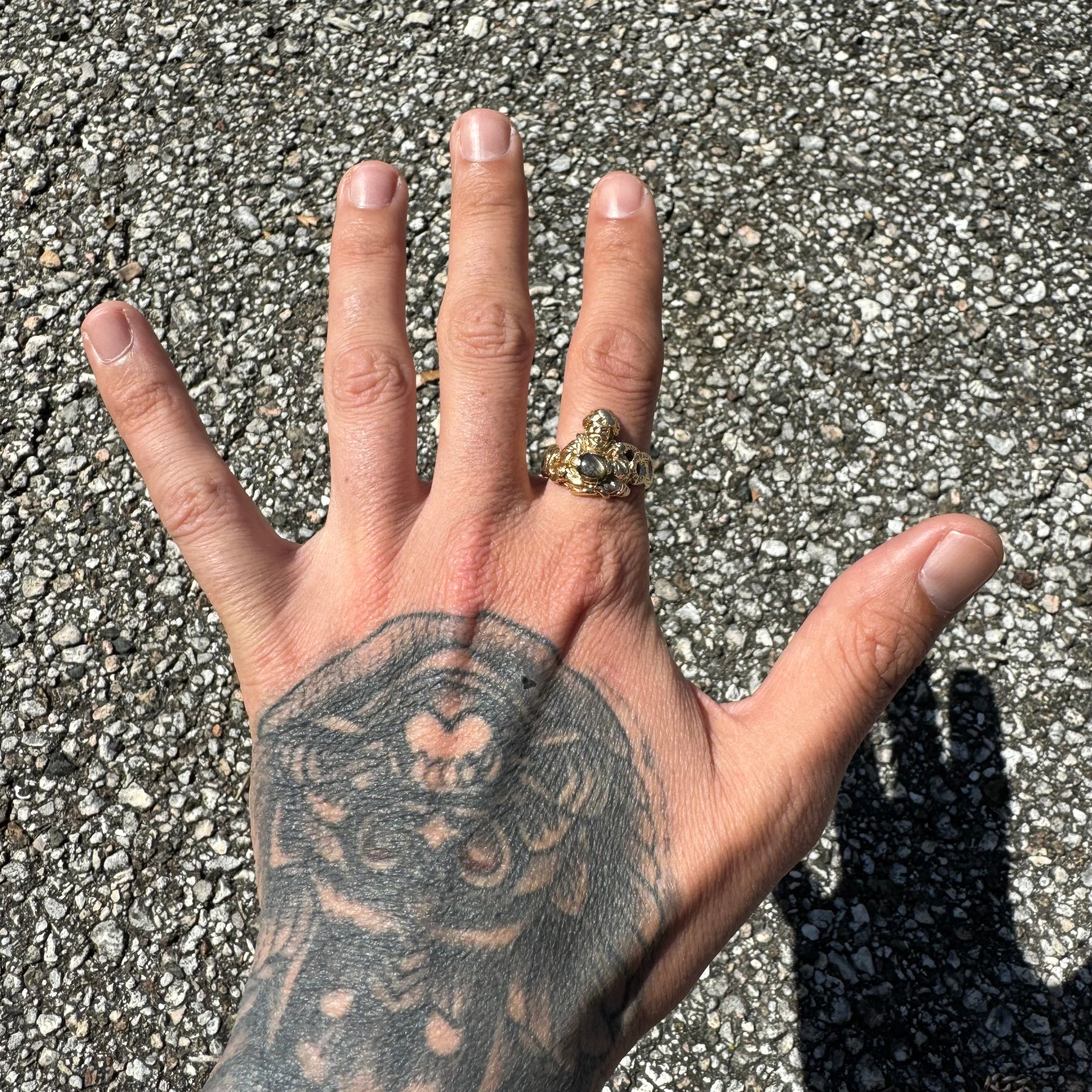 One of the coolest rings I’ve had in a long. A solid 14k yellow gold Gypsy fortune teller snake charmer ring. Protruding double snakes climb up towards the top of the shoulders meeting the gypsy who is handling the crystal ball of an encrusted black star sapphire. Vibrant and filled with fire as you stare into the stone to read your future. Approximately size:10.5 and 8.81g this is a chunky bad ass piece you won’t find.