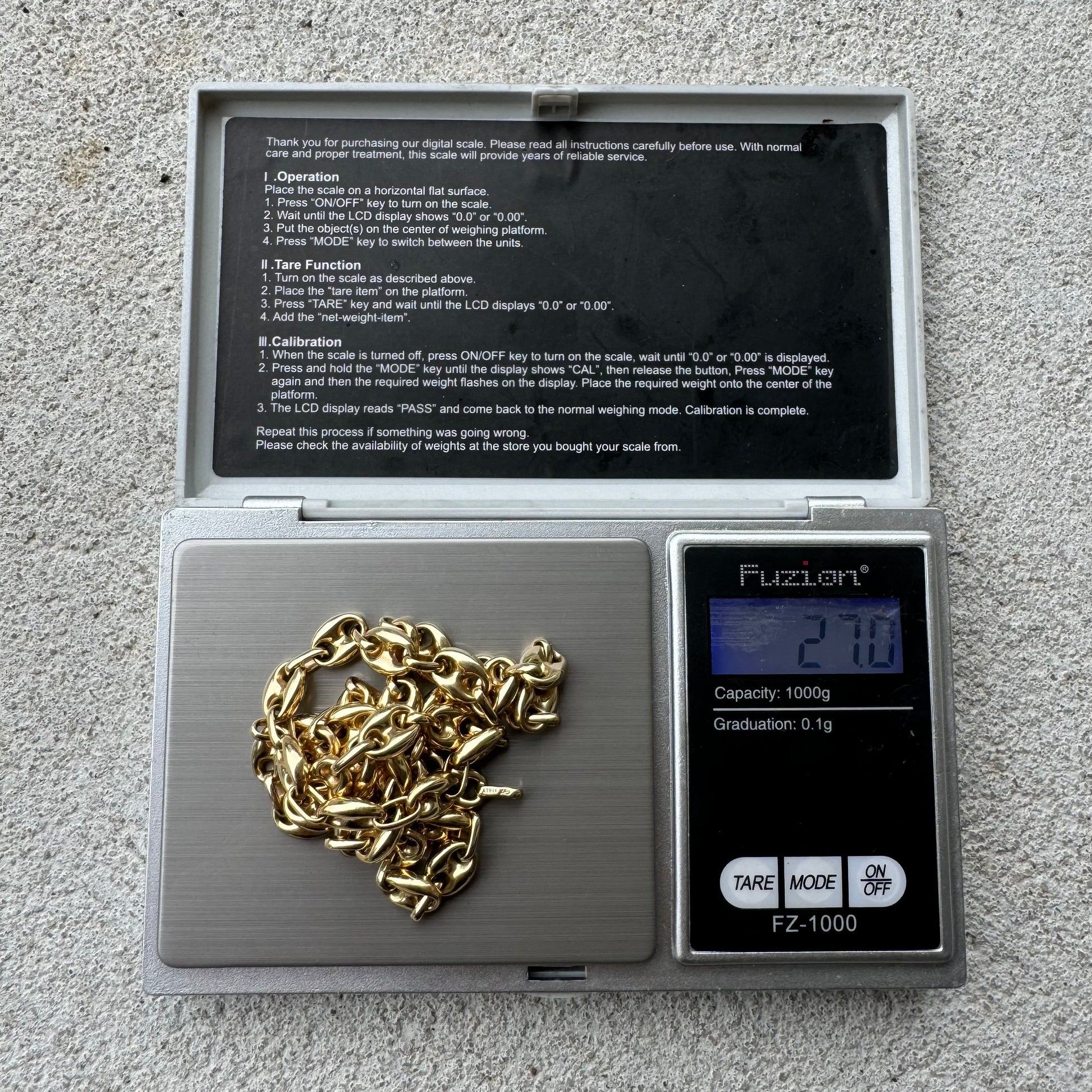 Even with these pictures being taken in stormy and rainy weather this vibrant 14k yellow Italian gold is just what you would want and expect from one of the most classic links, the puffed gucci. This one has awesome features to it and deep cuts giving off a sleek yet chunky pillow look to it. Measuring approximately 21” by 7mm wide and 3mm thick and weighing in at a hefty 27g this chain is in excellent condition even after being around for quite a few years because of how heavily constructed and the attention to detail with the craftsmanship. Thick and heavy lobster clasp has nice and tight action left on it as if this chain wasn’t used or worn much, which is evident in these pictures and really apparent when you have it in hand in person. It’s not often that I can get these link styles in and when I do find them they aren’t always as clean and of great quality like this one is as it’s the perfect size to weight ratio for any type of body build, man or woman.