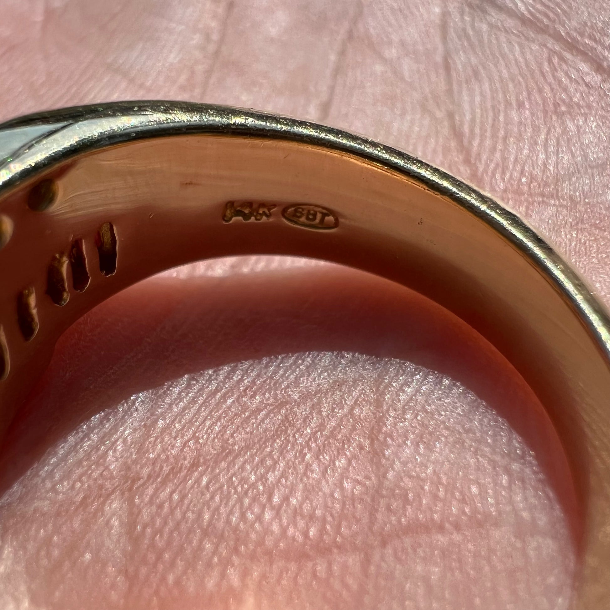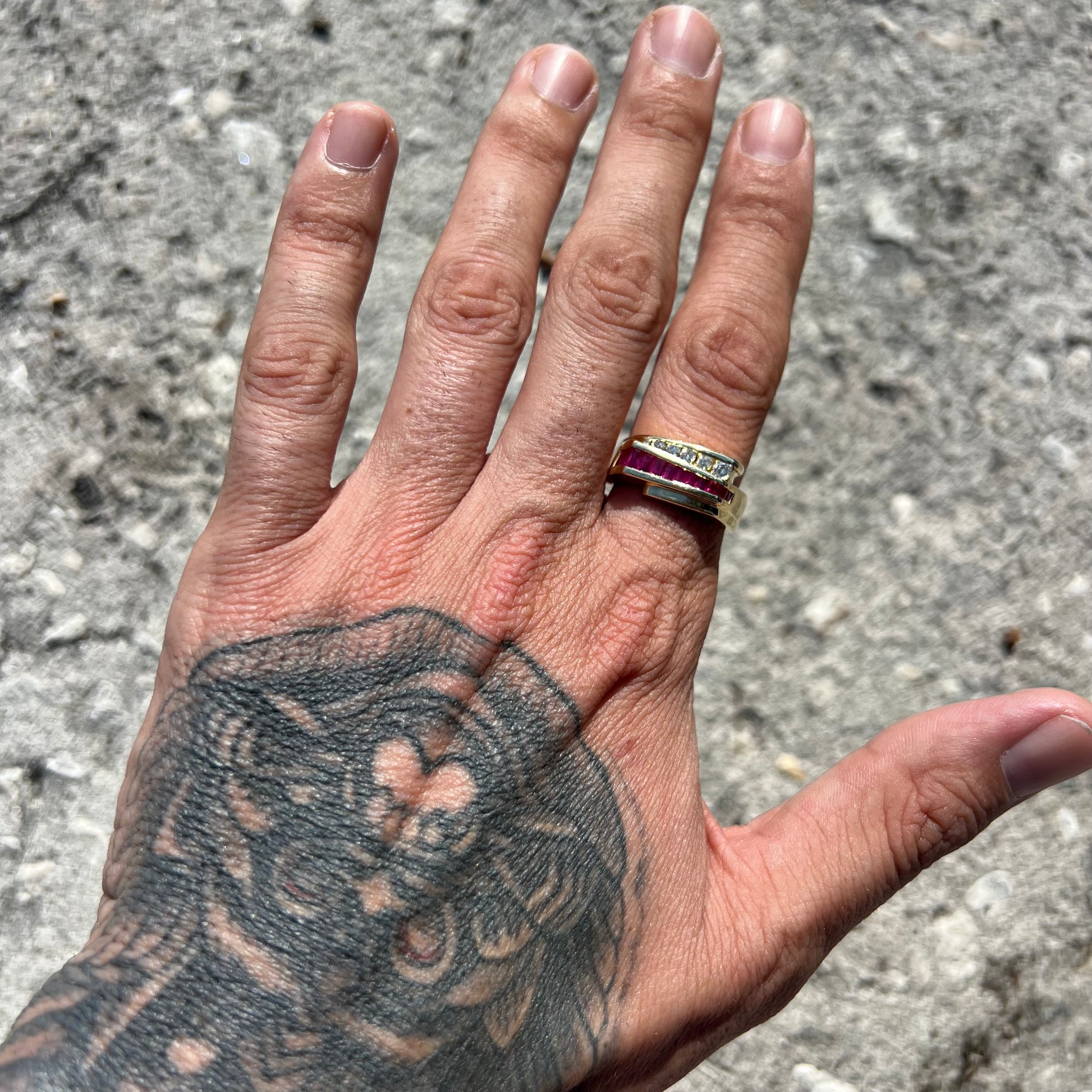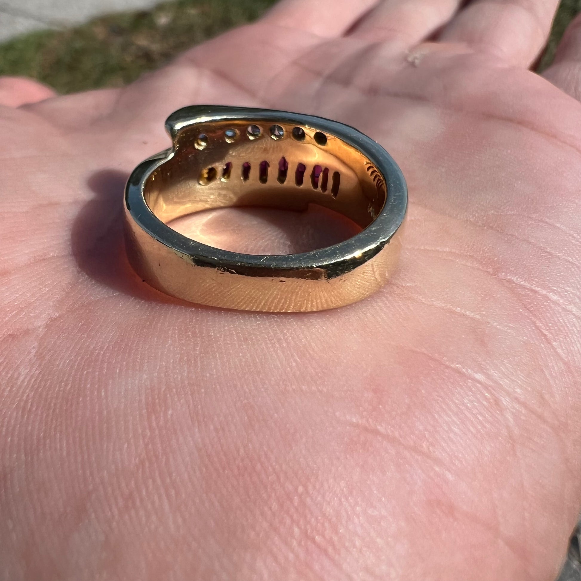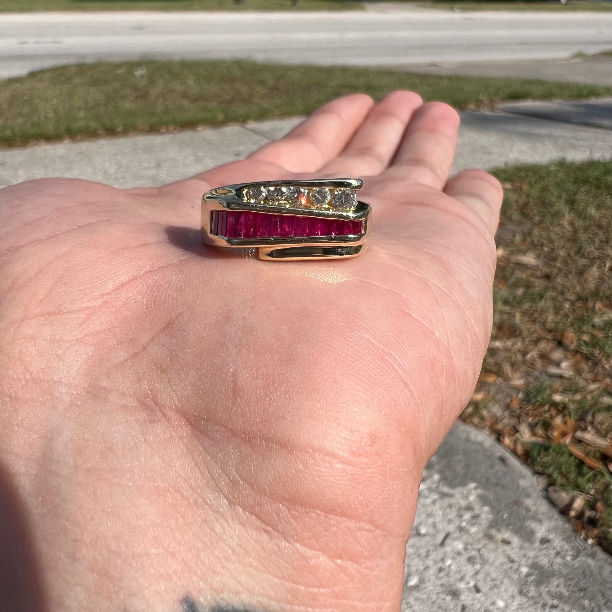 Absolutely stunning condition, looks to have hardly ever been worn, is this vintage solid backed 14k yellow gold modernist style comfort fit ring. Channel set with approximately 1.0CTW natural rubies and .35ctw of natural diamonds of great color and clarity that sparkle and throw off all colors of the spectrum while looking at it. This one has a very sleek yet strong appearance and build at 13.6g and a size:9.5