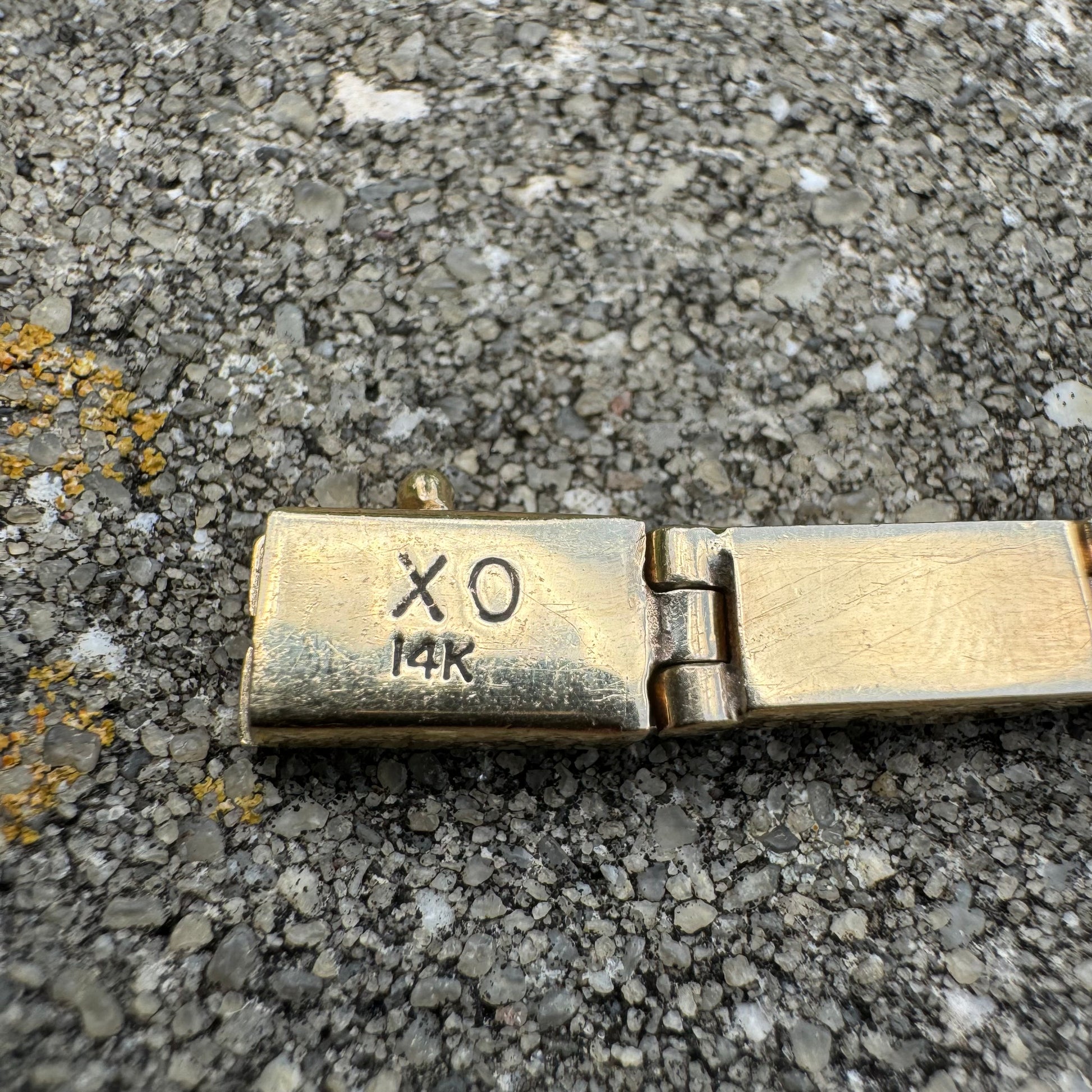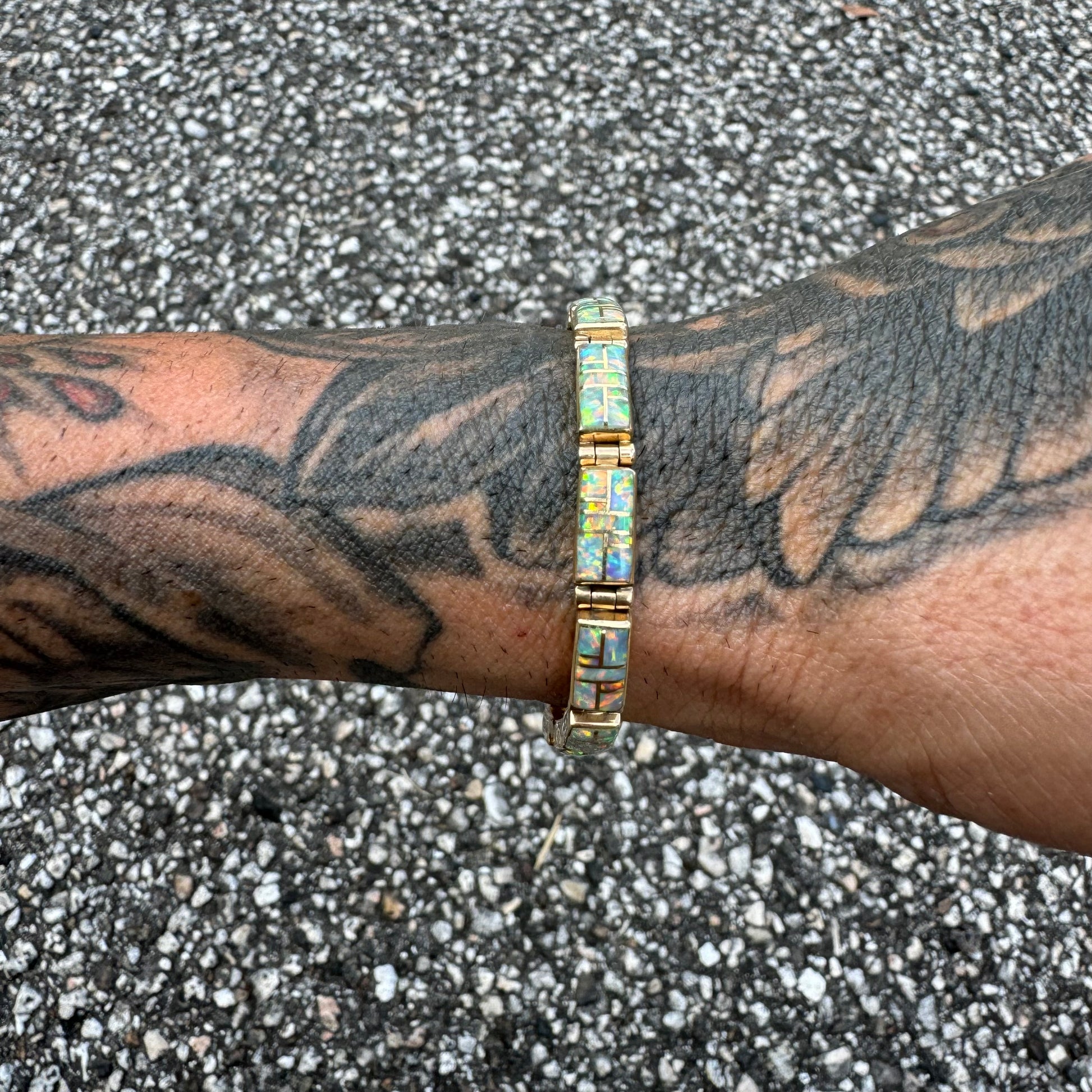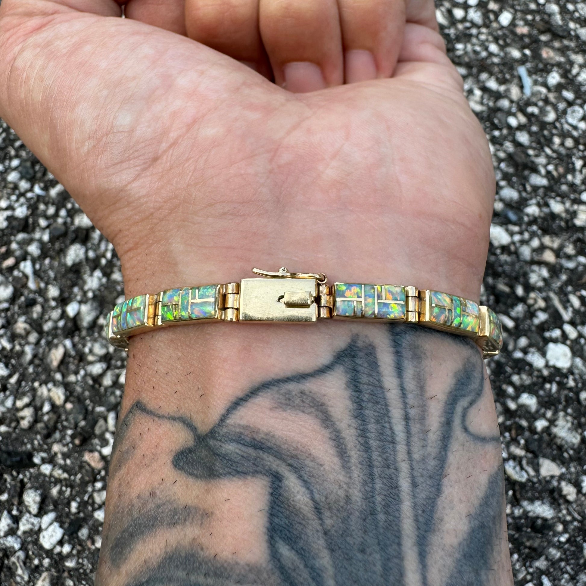 There is so much fire inside these opals that they look as if they’re swirls of tie-dye tshirts. Very seldom made by southwestern artisans in a 14k yellow gold is this mosaic cut opal inlaid hinged link bracelet. Artist signed “XO” work like this takes quite a while in time and skill to execute and execute correctly at that. Measuring 7.5” end to end it’s fits a 7.25” wearable length by 5mm wide and weighing in with some substantial weight at 16.3g you can’t beat the price on this piece if and when you can even find them.