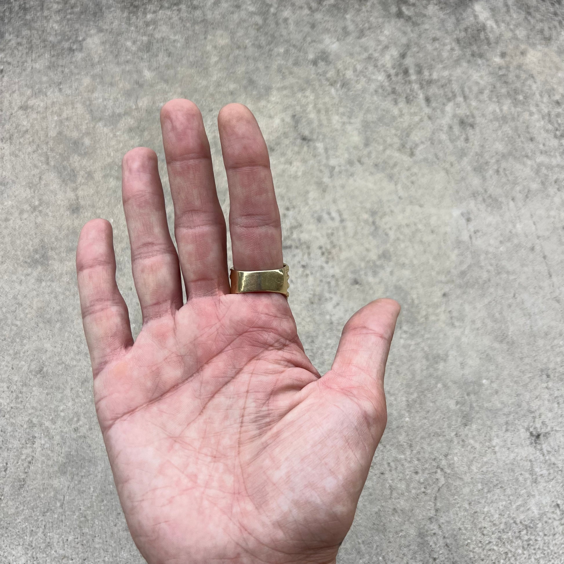 Custom made sometime in the 1980’s to 90’s is this meticulously crafted heavyweight solid 14k large Nugget ring. Beefy and broad with a very brutalist look it is set with 4 Natural diamonds each sized at approximately .15ct and graded at some of the best diamonds you can get on the market at VVS1 E-F in color as well as 5 natural rubies making it look almost as a playing dice that rolled to a #5. This ring is for a large hand at a size 12.5 and weighs 17.4g but it can be sized up or down.