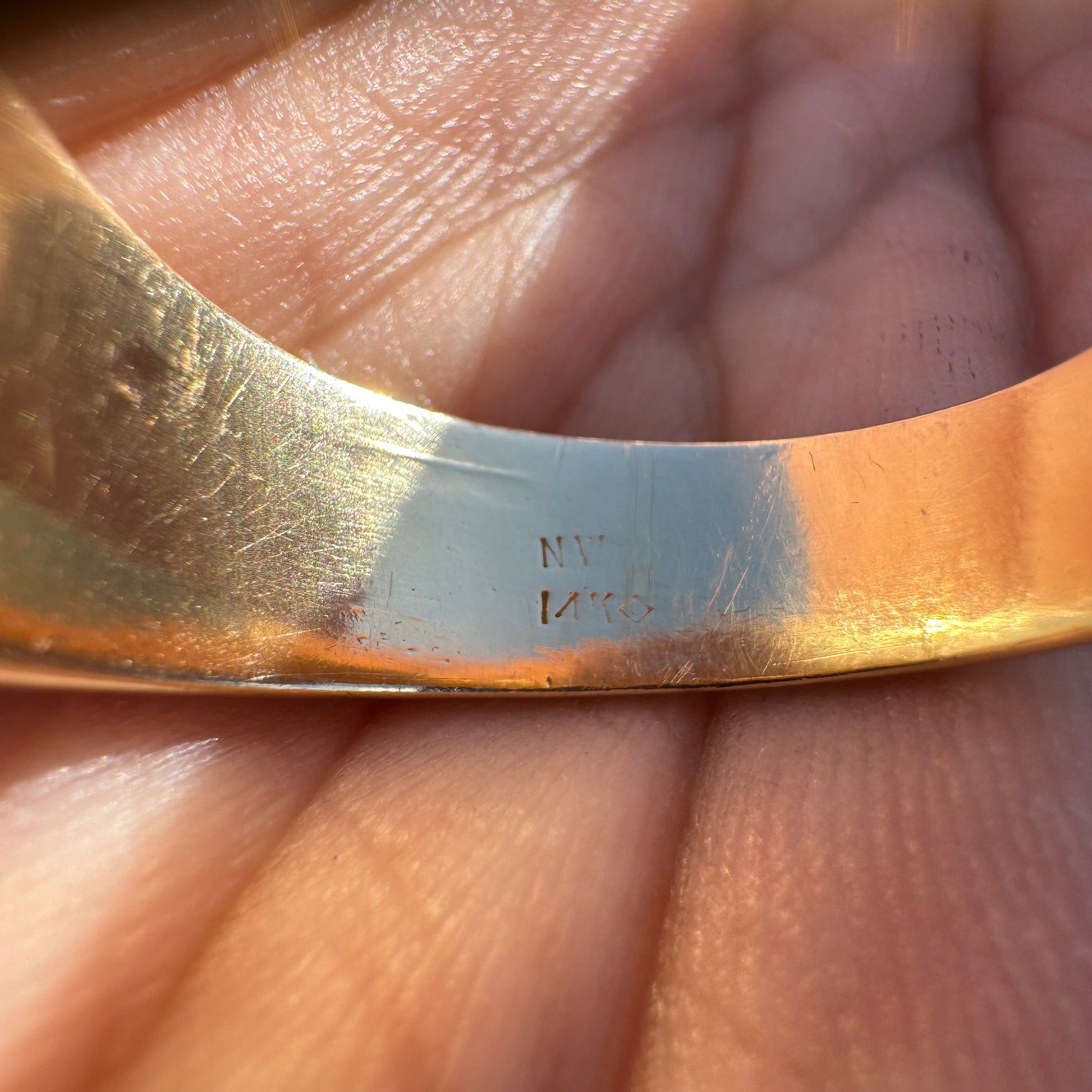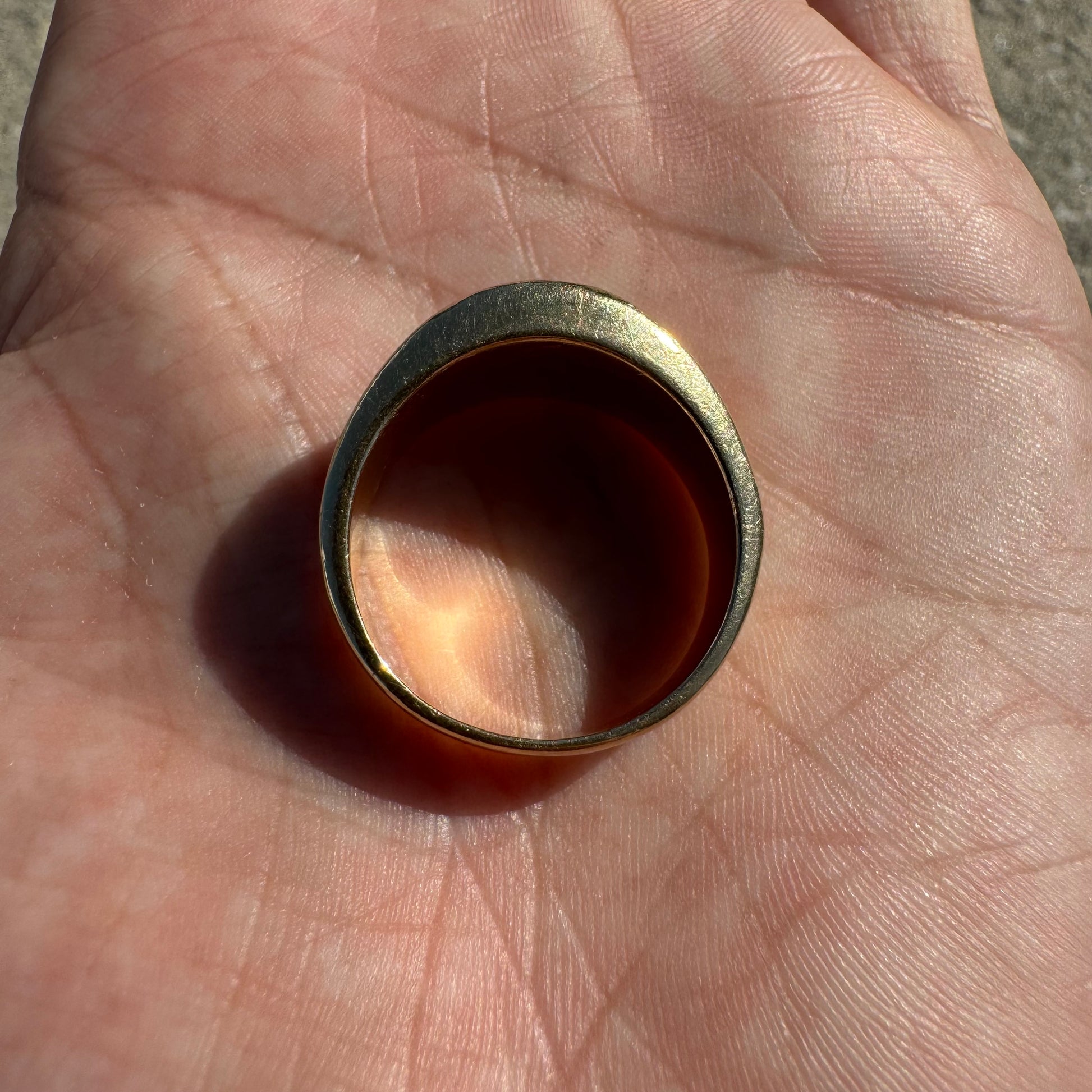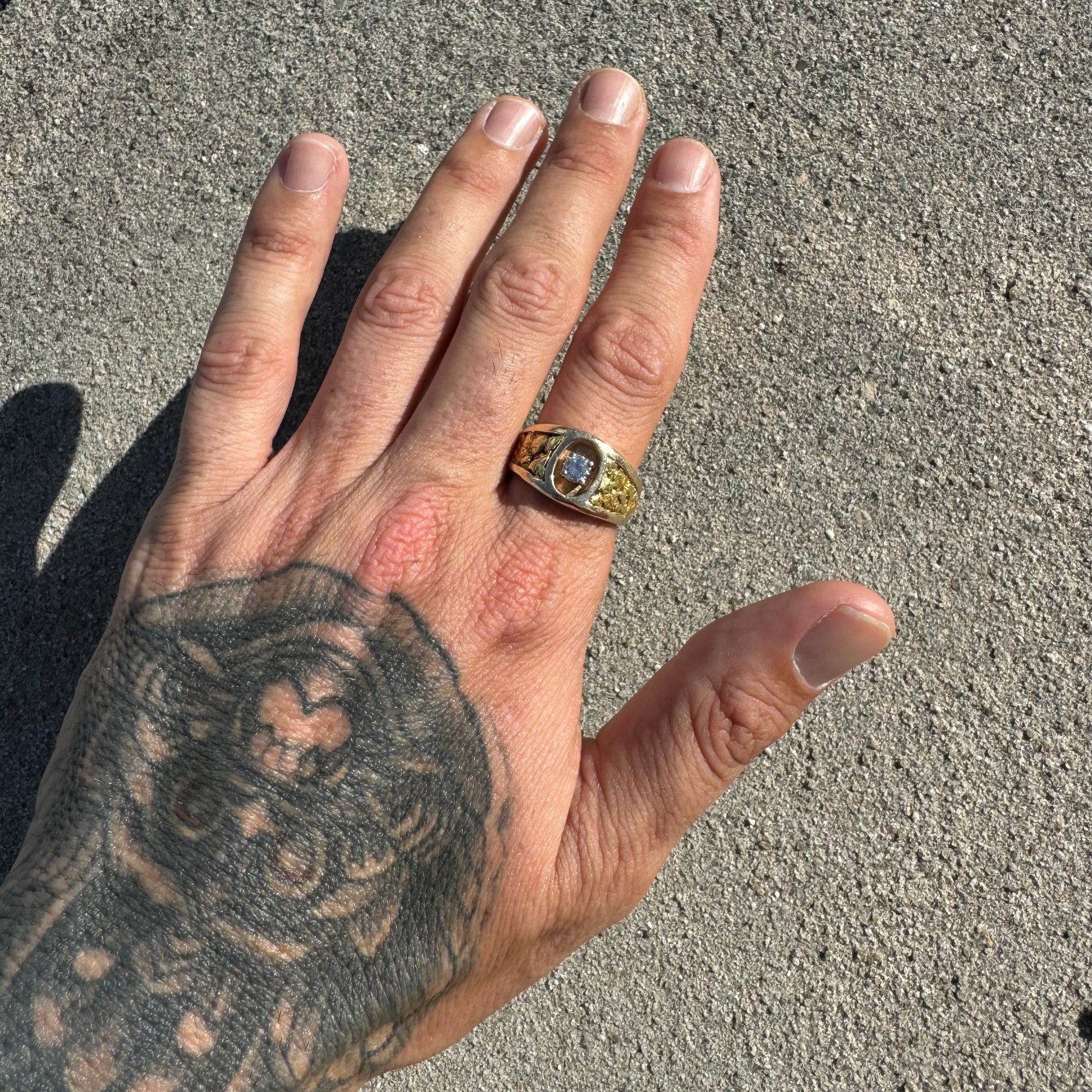 Fetching some of the highest premiums on the open market these one of a kind custom made inlaid rings are straight bad ass. 4 prong Set with a near VS quality super clean large .50ct natural diamond deep inside the valley in the center of the ring and crafted out of a thick and heavy 14k yellow gold each side of the shank is inlaid with raw 24k gold nuggets mined straight from Mother Earth. At a size:11.5 and weighing in at 15.2g it has a very smooth and comfortable fit on the inside with a chunky thickness and a wide take up of the finger at 13mm. You’re getting this piece at an incredible price, if you just do a quick search for less than 2 minutes you will find comparable rings of this caliber selling for upwards of $5000 with an average price of $3000. This is an heirloom piece that will continue to escalate in value while being passed down for generations with timeless class and style.