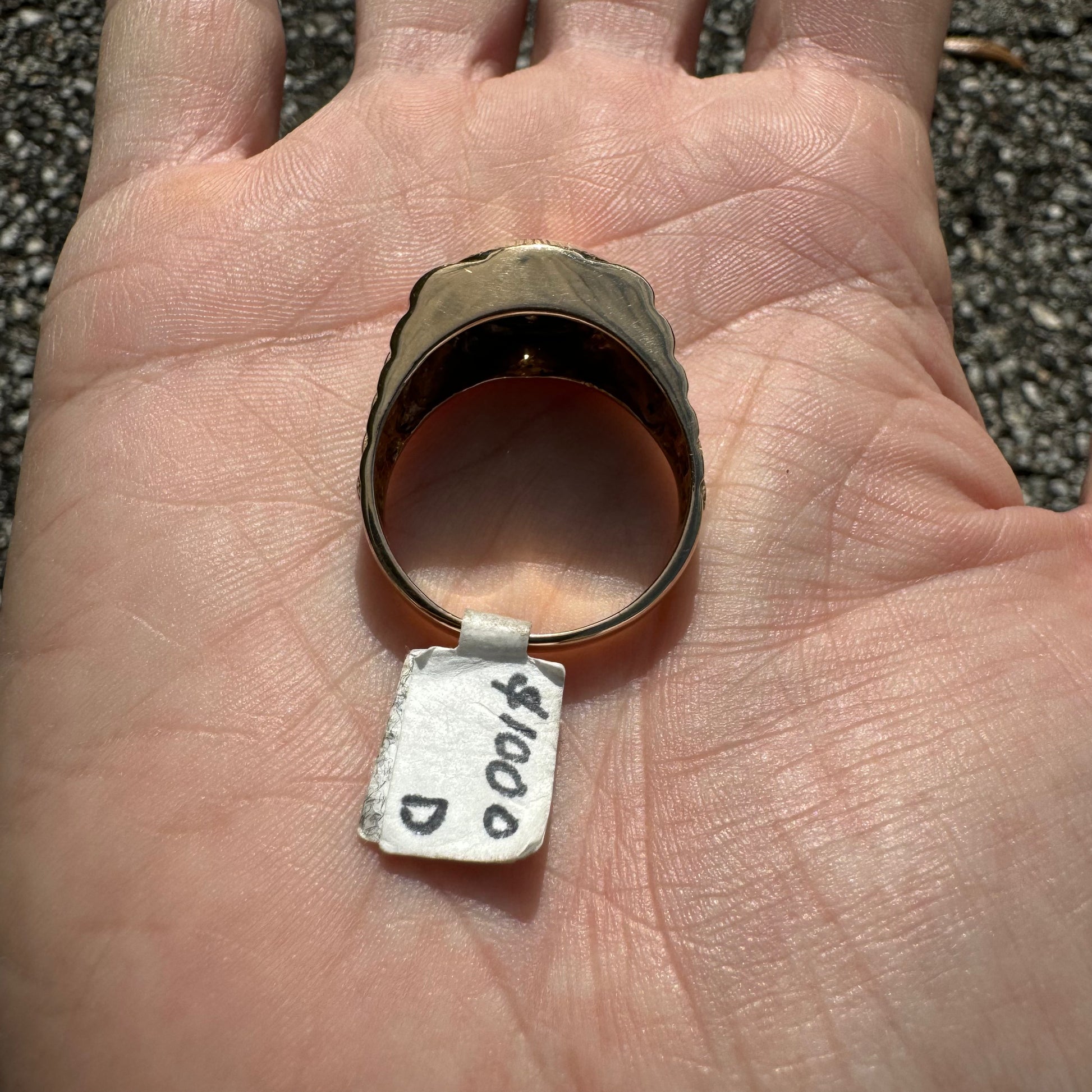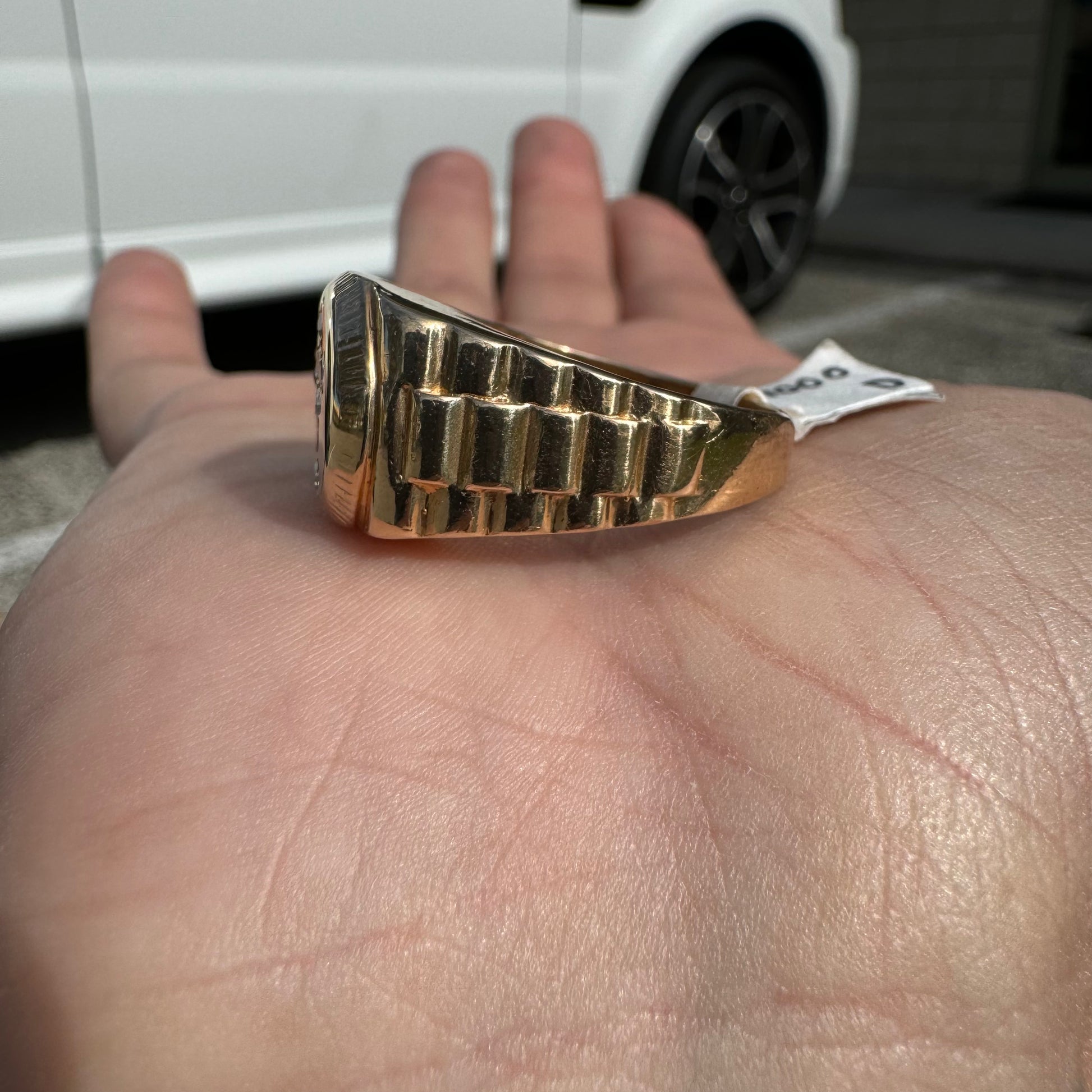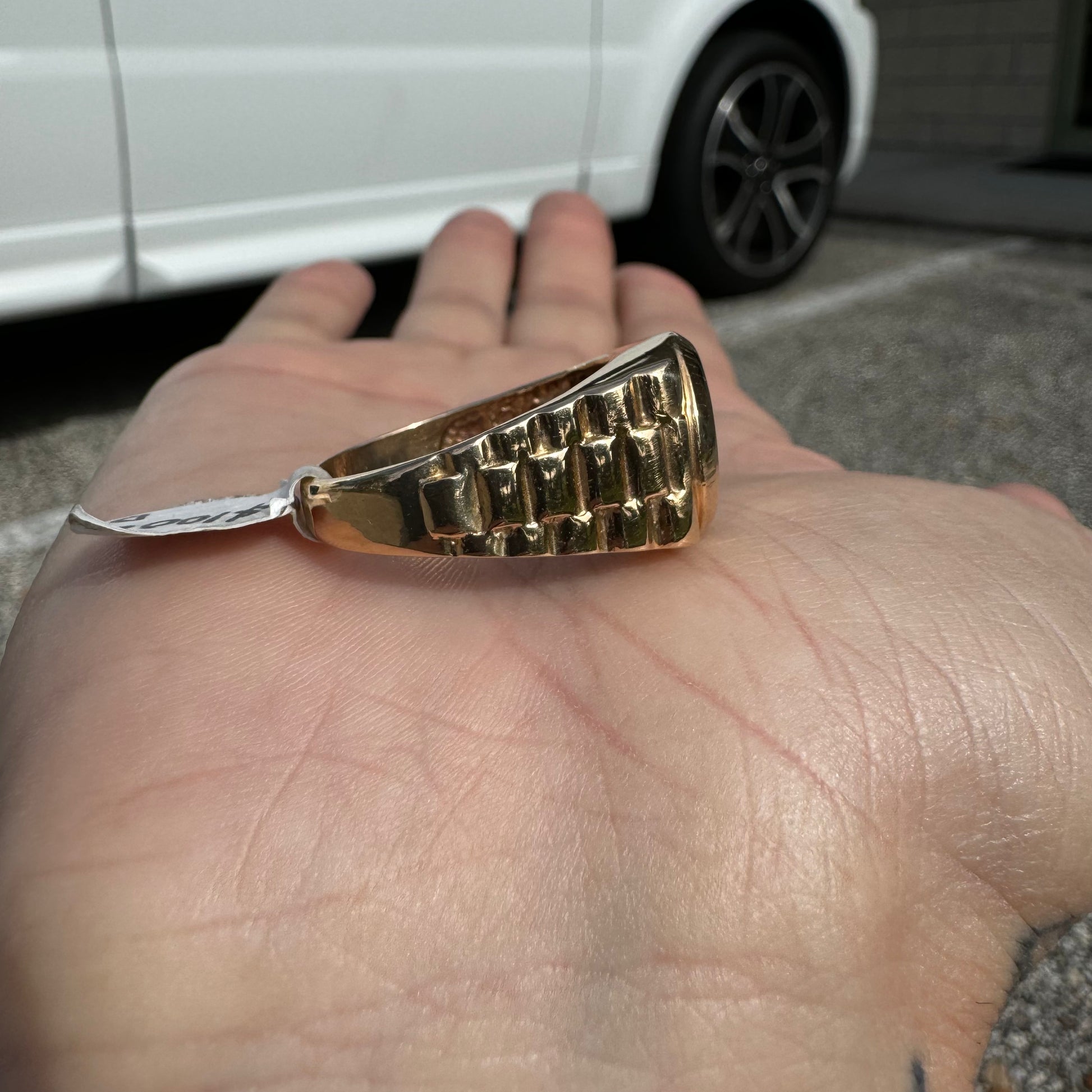 Another ring in immaculate condition that looks to have never been worn is a very unique 14k yellow gold Rolex style signet ring. Starburst set with 7 natural .04ct diamonds of super clean color and clarity totaling approximately .25ctw in the shape of a cross this is a very cool and custom hand set ring. Made with the bigger hands in mind this one is a size:13.5 and weighs in at 11.4g. With the original price tag from the jewelry store on it at $1000 you’re getting an excellent deal on this piece.