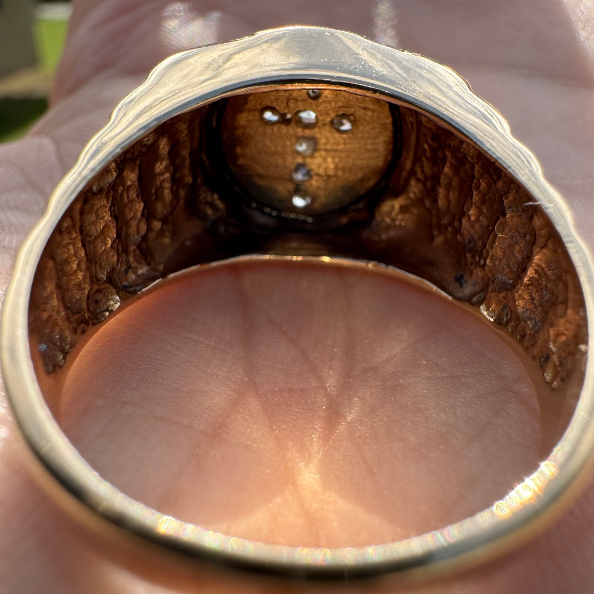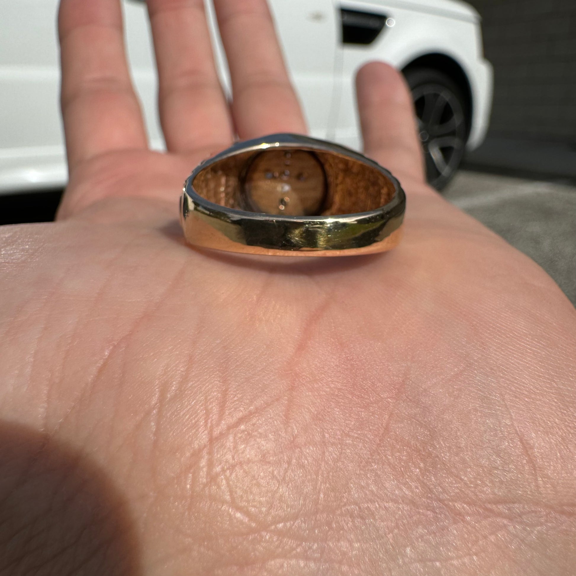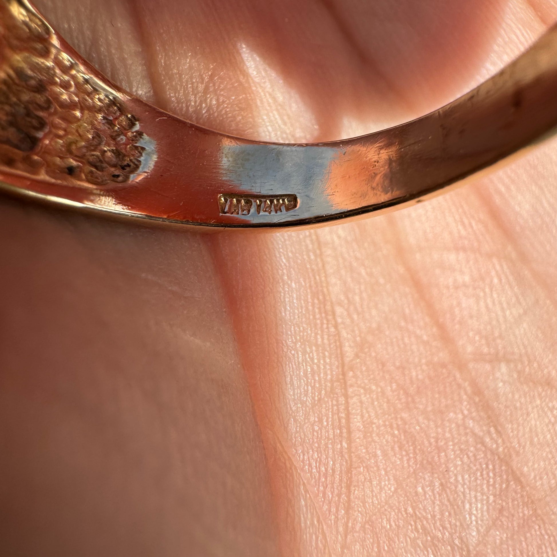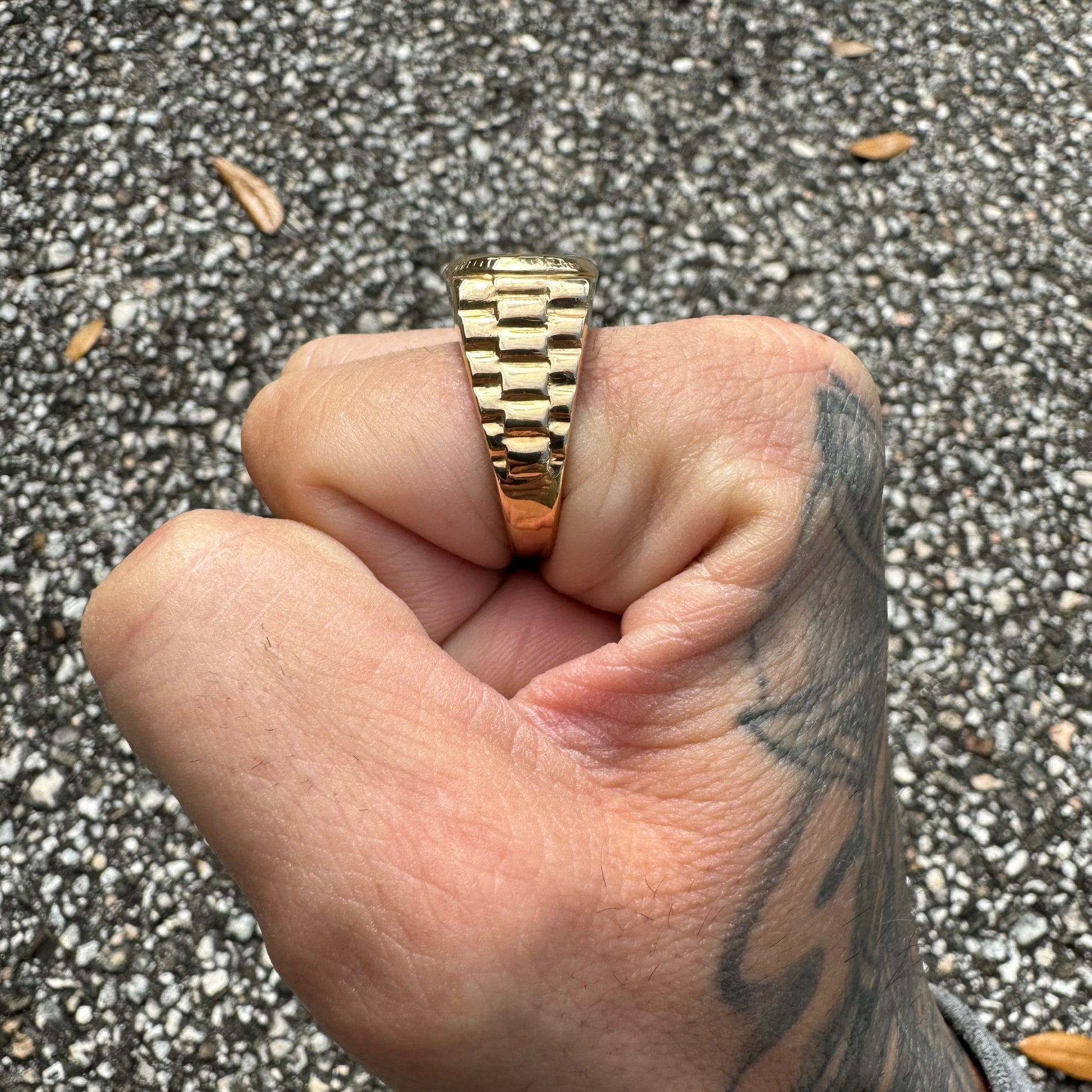 Another ring in immaculate condition that looks to have never been worn is a very unique 14k yellow gold Rolex style signet ring. Starburst set with 7 natural .04ct diamonds of super clean color and clarity totaling approximately .25ctw in the shape of a cross this is a very cool and custom hand set ring. Made with the bigger hands in mind this one is a size:13.5 and weighs in at 11.4g. With the original price tag from the jewelry store on it at $1000 you’re getting an excellent deal on this piece.