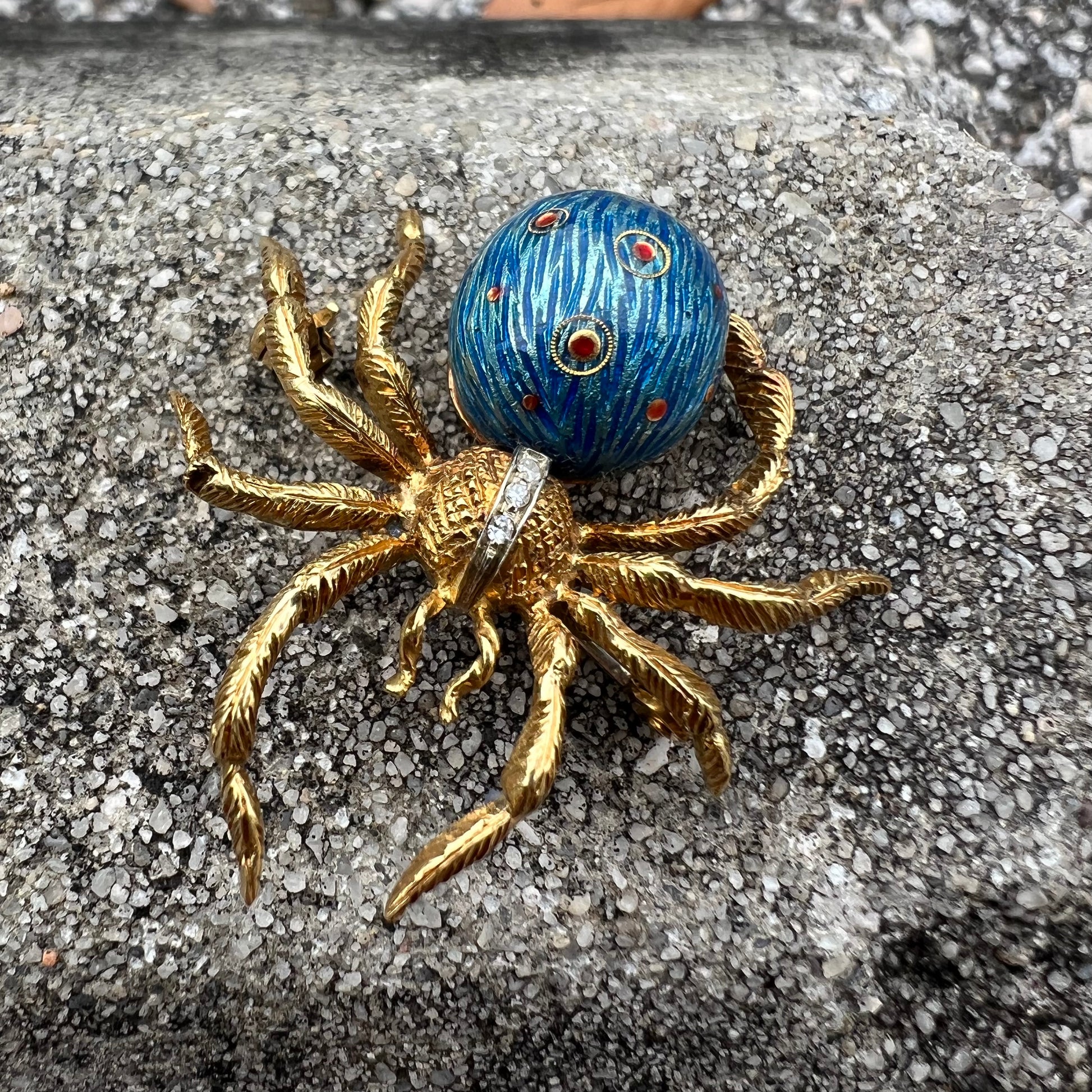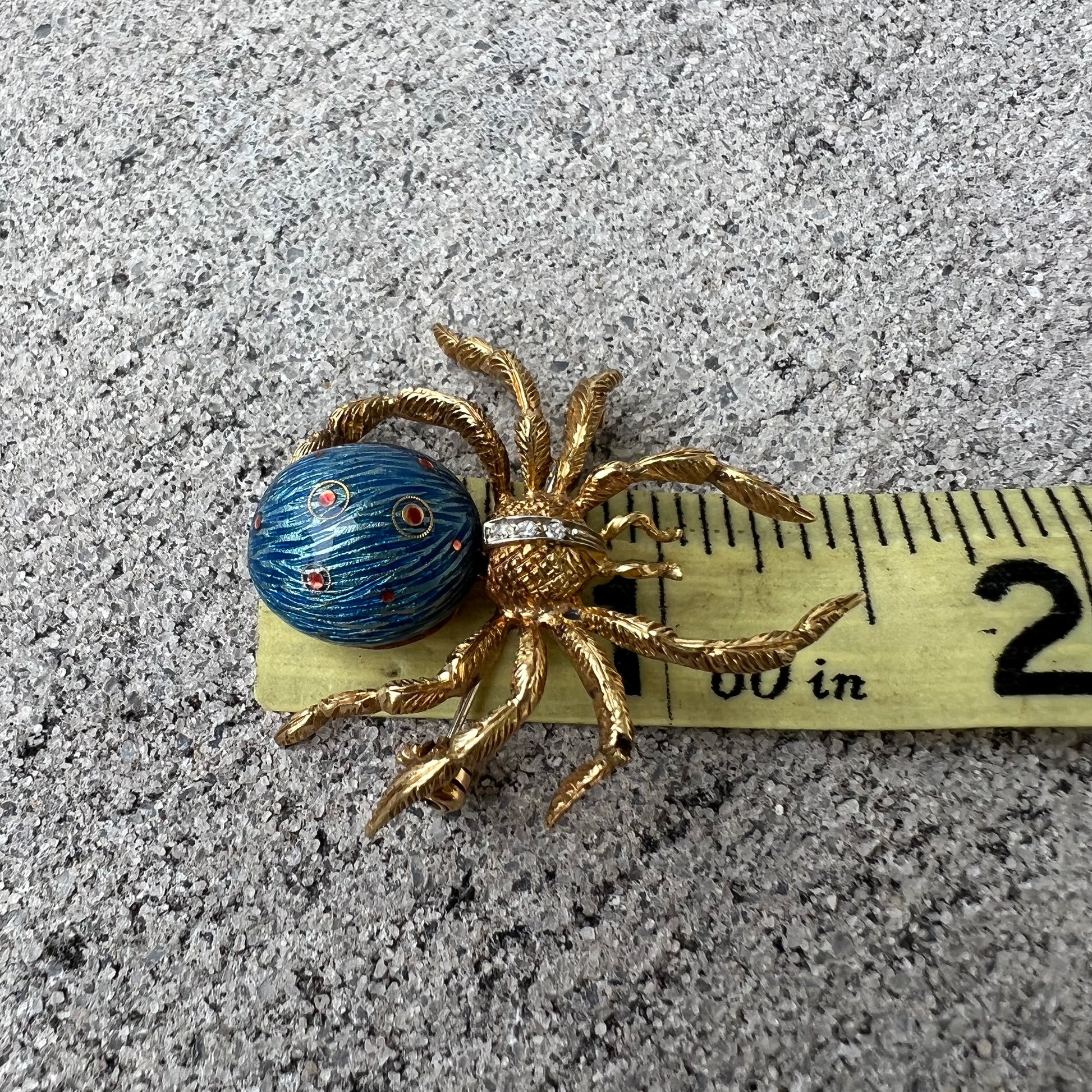 Pure artistic craftsmanship and beauty in this vintage 18k yellow gold finely detailed lifelike spider brooch. Fire enameled with a beautiful blue body and 3 natural single cut diamonds across the top this brooch can be worn as a pendant on a necklace as well. Very rare and a great price. Weighs 12g and measures about 1.5” by famed Italian jeweler Corletto.