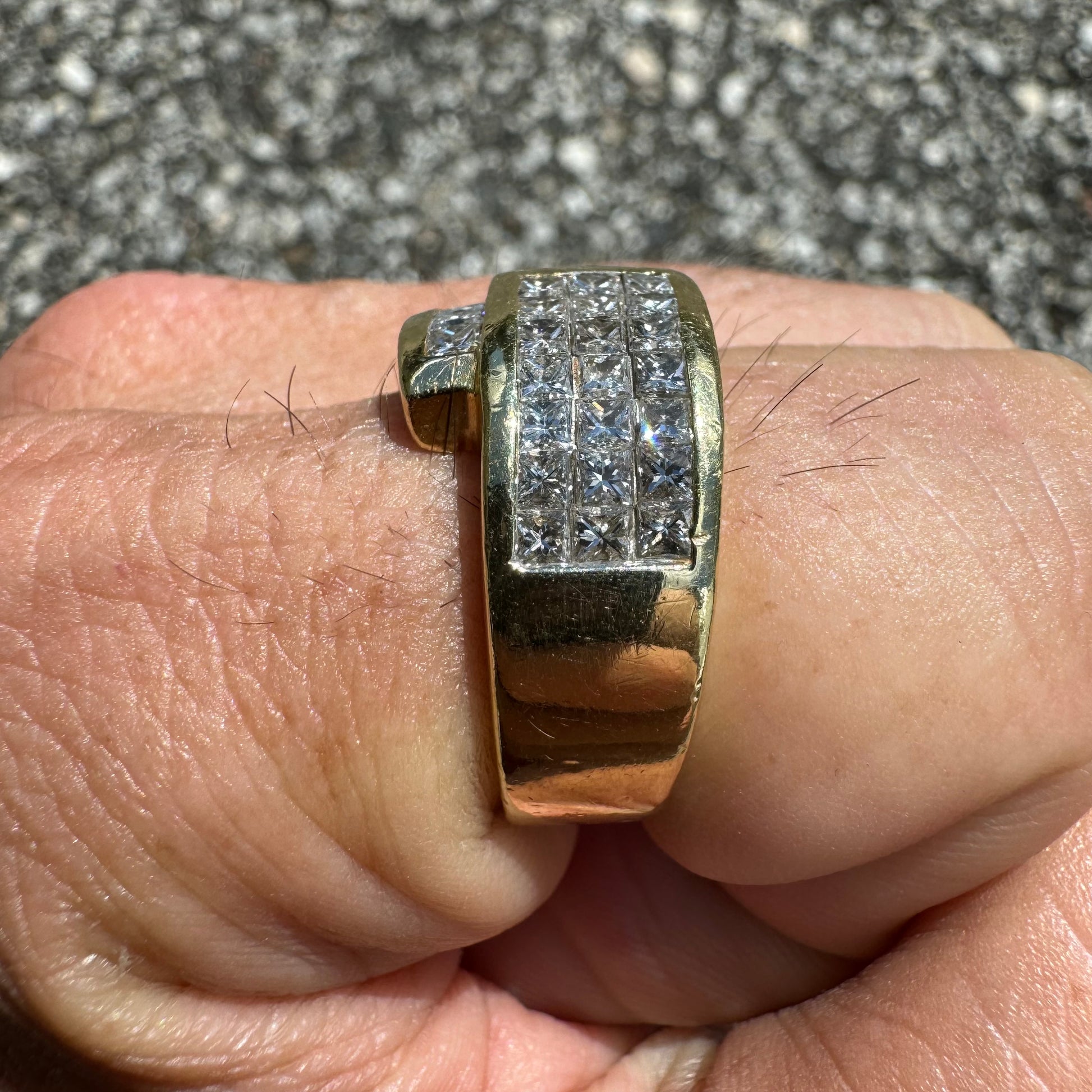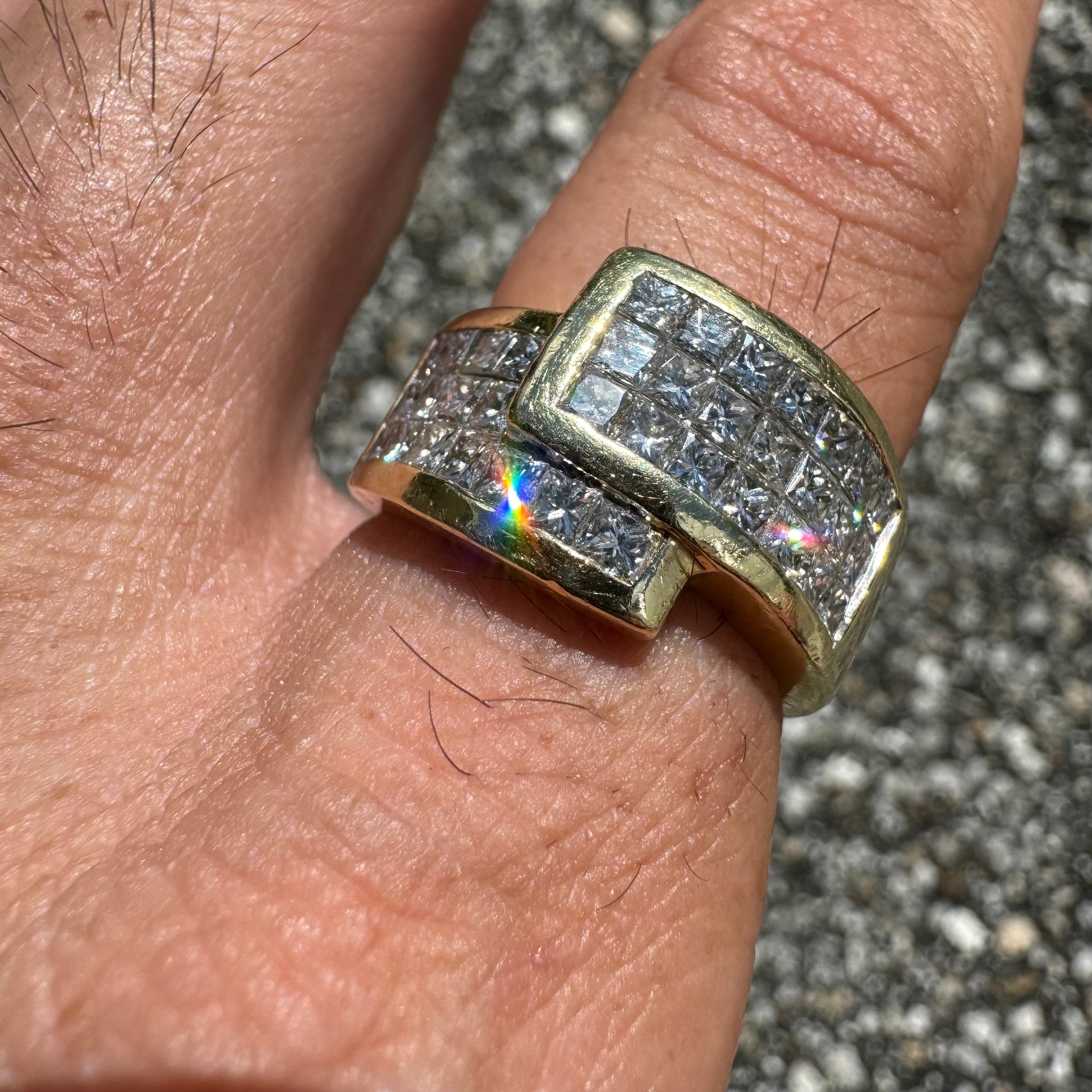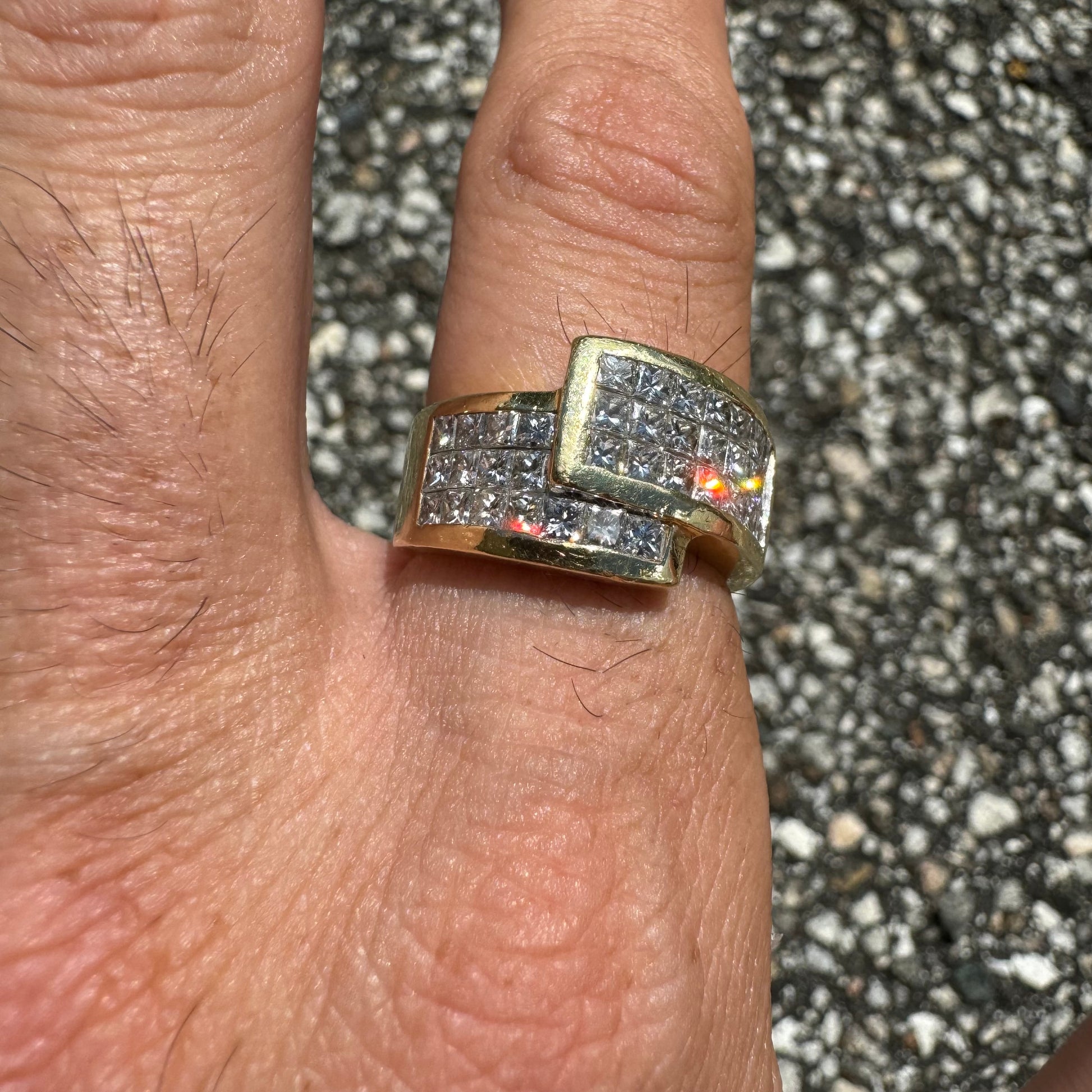 Let’s start this one off by saying i was able to find this exact ring but only one other on the entire web and they’re asking a mind blowing $9575 for this same piece (last picture shows the listing). Now of course anybody can ask any price they want for anything and it doesn’t mean they will get it but on the other hand that’s the price you’re going to pay when you walk into any high end jeweler and have them custom make a ring just like this one. This vibrant piece is all handmade with a total of 36 fiery natural VS quality F-G in color princess cut diamonds totaling approximately 3.25ctw. Set in a heavyweight 18k yellow gold bypass wraparound setting it weighs a total of 14g and a size:8.5. With a broad diameter taking up quite a bit of your knuckle when on the finger measuring 12.5mm. There’s no doubt in my mind you’re finding a ring like this anywhere else cheaper than what you can buy this one for.