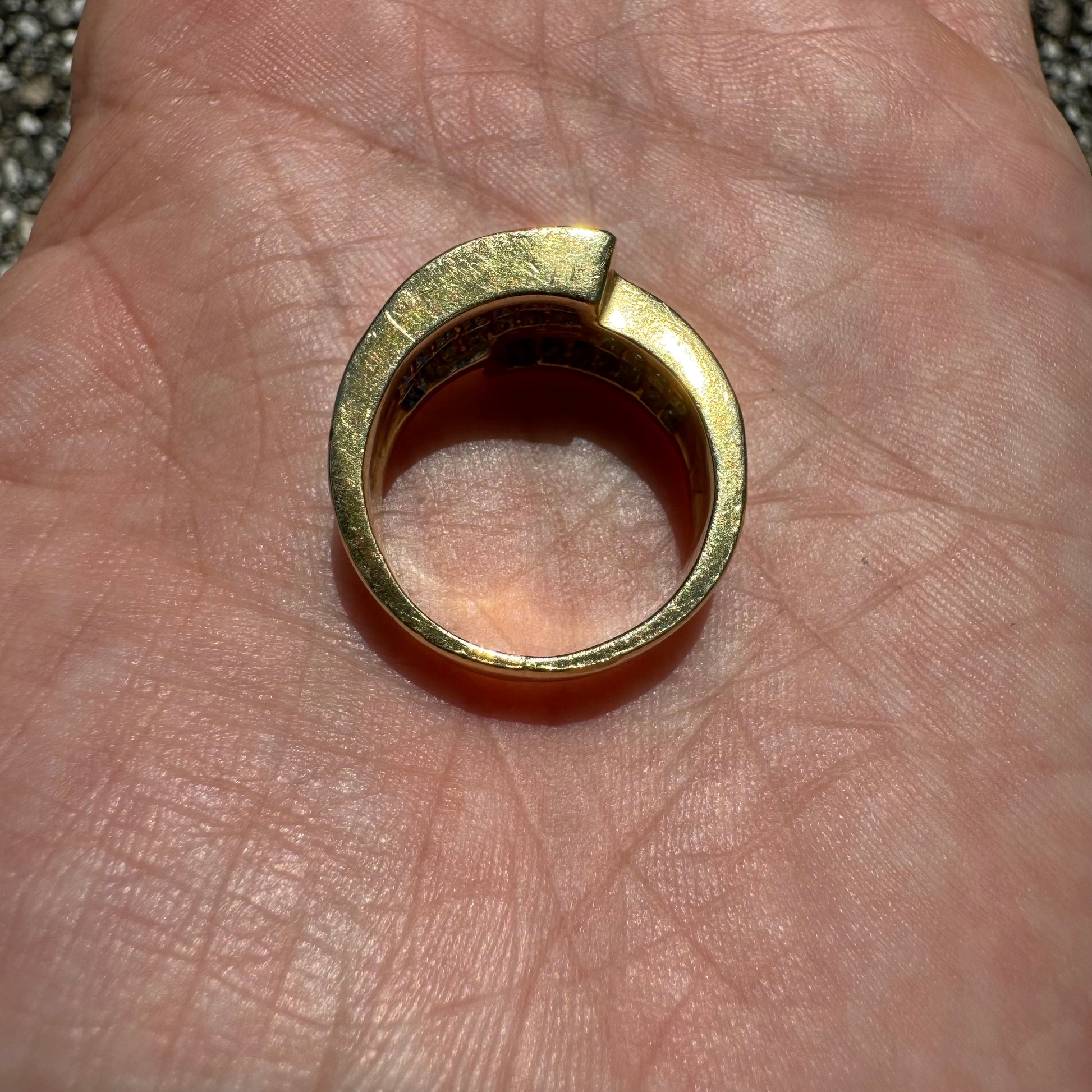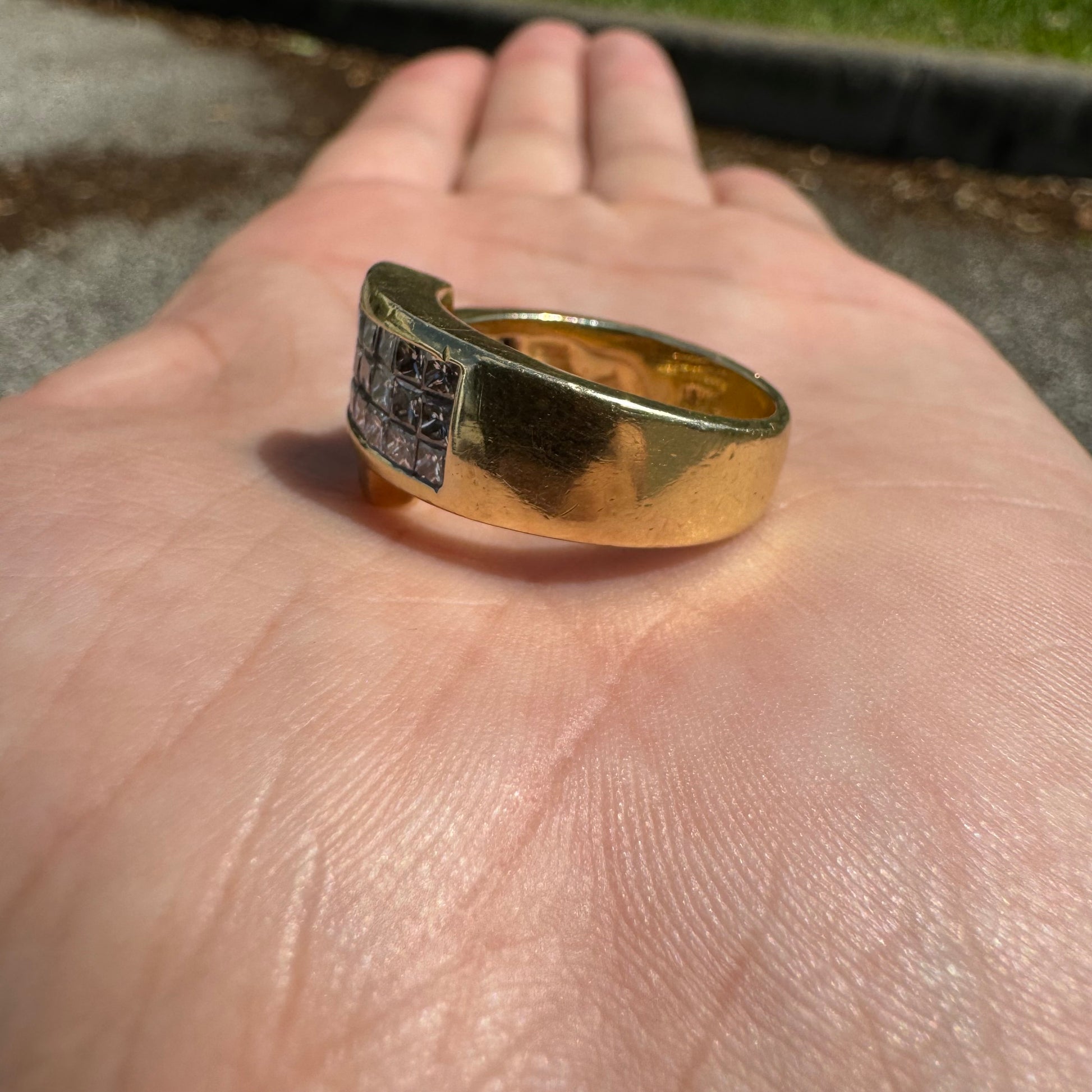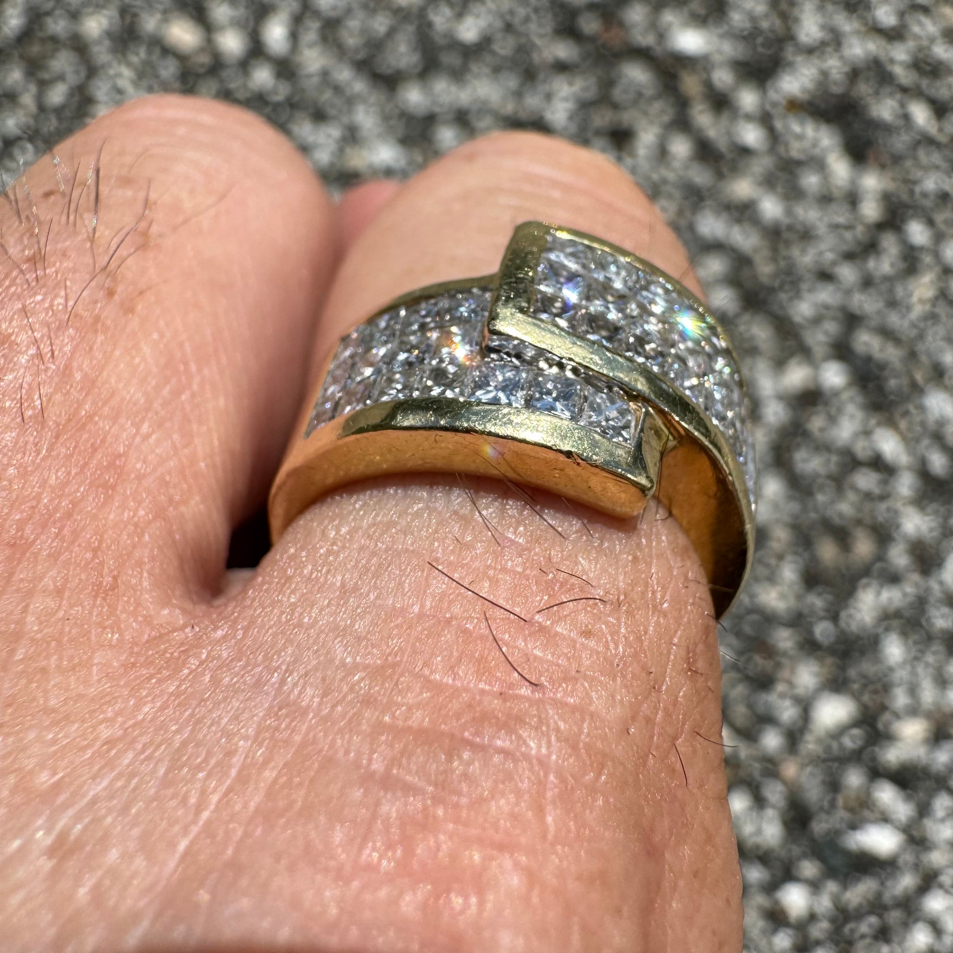 Let’s start this one off by saying i was able to find this exact ring but only one other on the entire web and they’re asking a mind blowing $9575 for this same piece (last picture shows the listing). Now of course anybody can ask any price they want for anything and it doesn’t mean they will get it but on the other hand that’s the price you’re going to pay when you walk into any high end jeweler and have them custom make a ring just like this one. This vibrant piece is all handmade with a total of 36 fiery natural VS quality F-G in color princess cut diamonds totaling approximately 3.25ctw. Set in a heavyweight 18k yellow gold bypass wraparound setting it weighs a total of 14g and a size:8.5. With a broad diameter taking up quite a bit of your knuckle when on the finger measuring 12.5mm. There’s no doubt in my mind you’re finding a ring like this anywhere else cheaper than what you can buy this one for.
