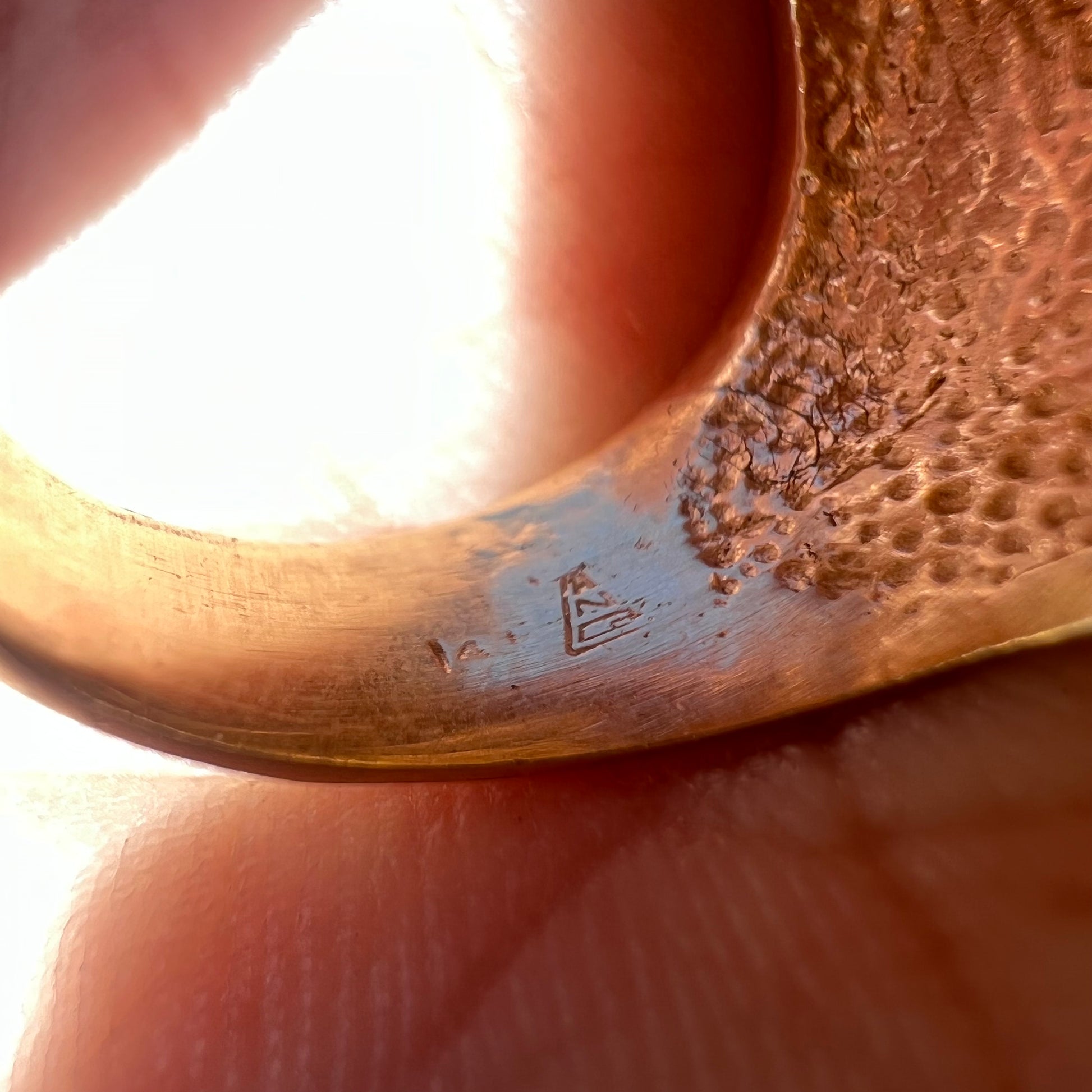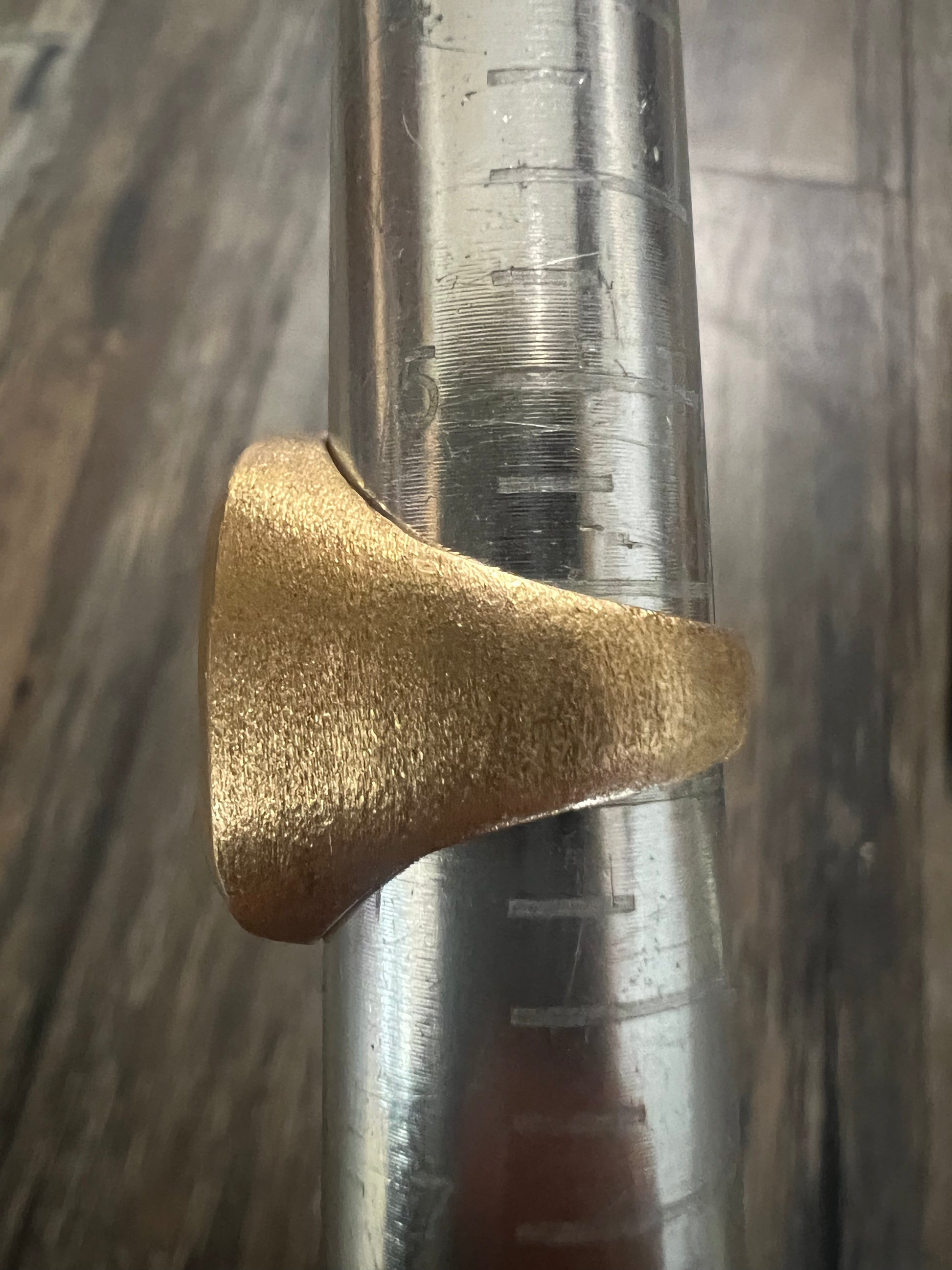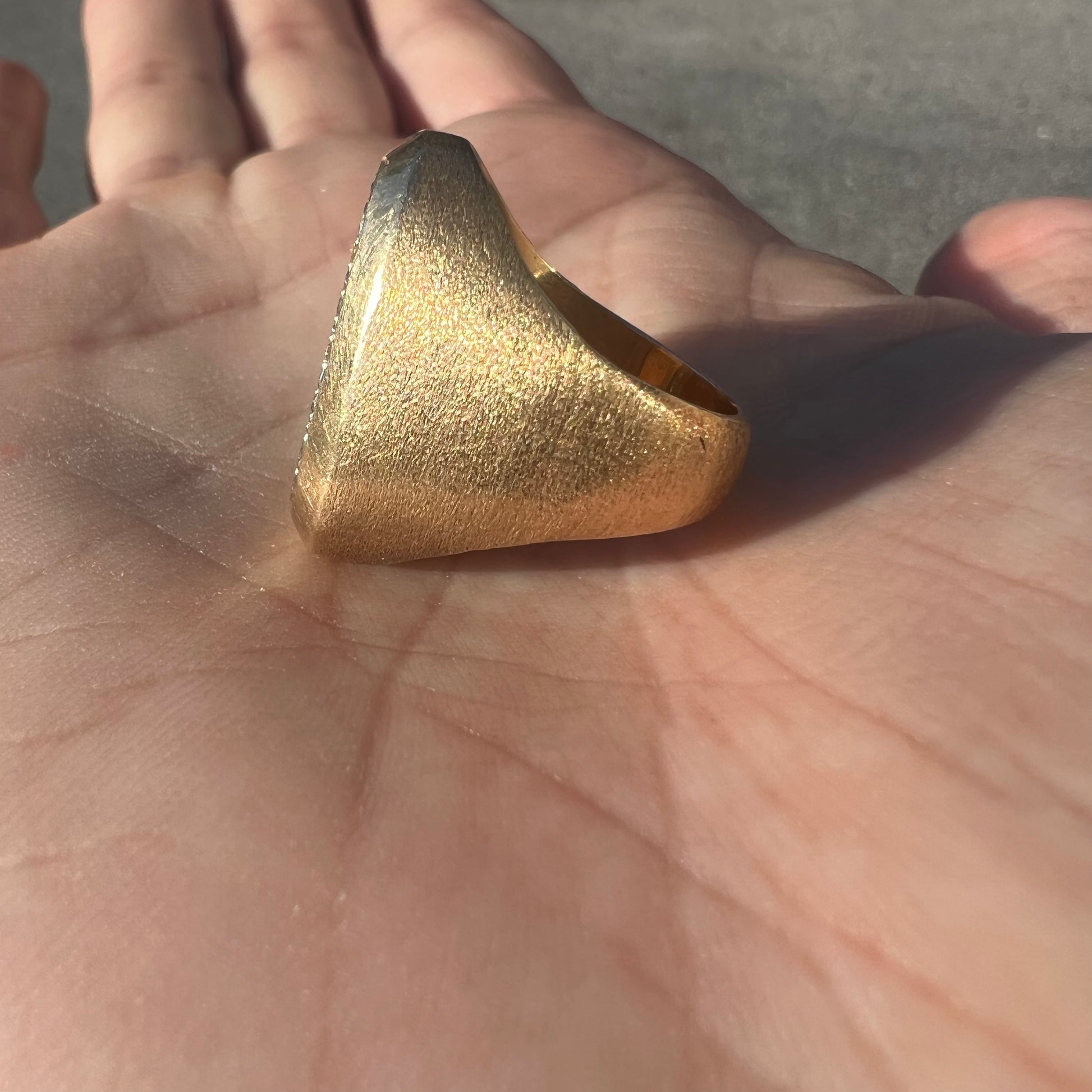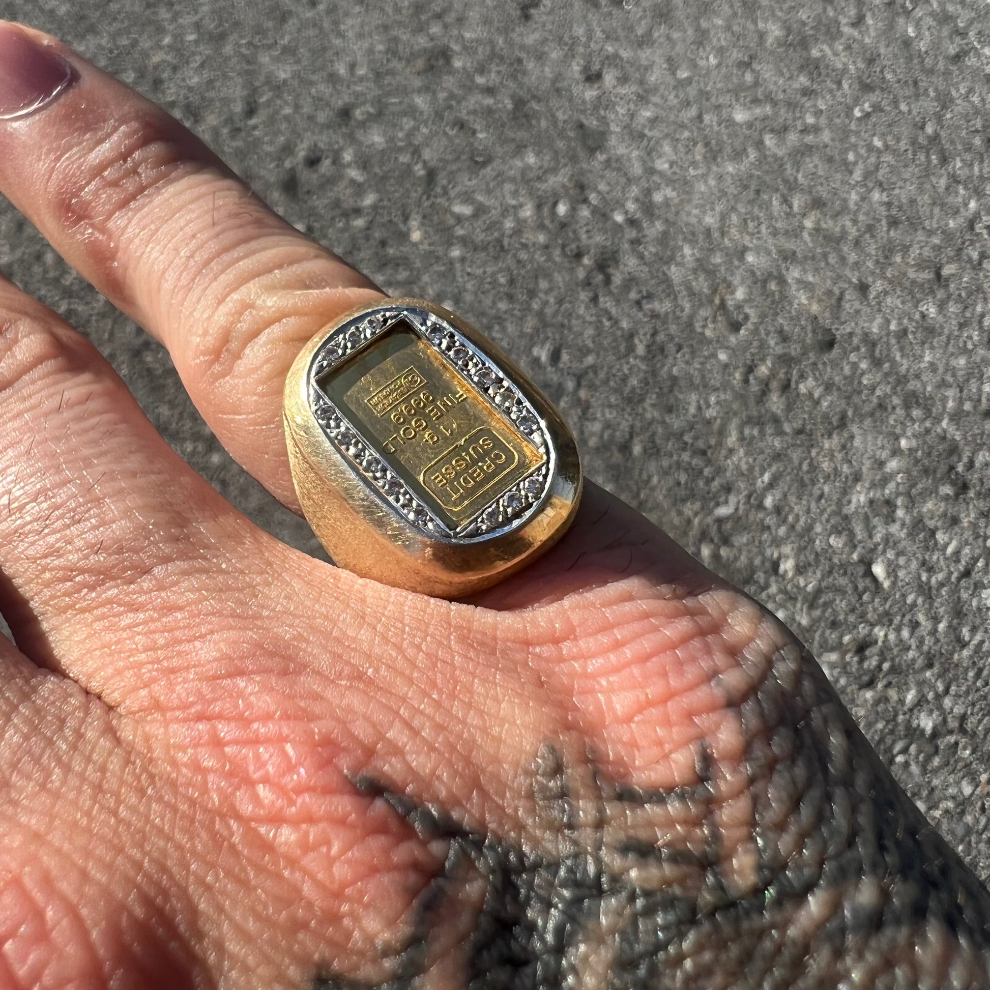 Vintage solid 14k brushed finish signet style heavy ring with border face surrounded by 16 natural diamonds (approximately .30CtW) enclosing a pure 24k .999 1 gram credit sussie bar. Fits a size:6 with a weight of just under 10g