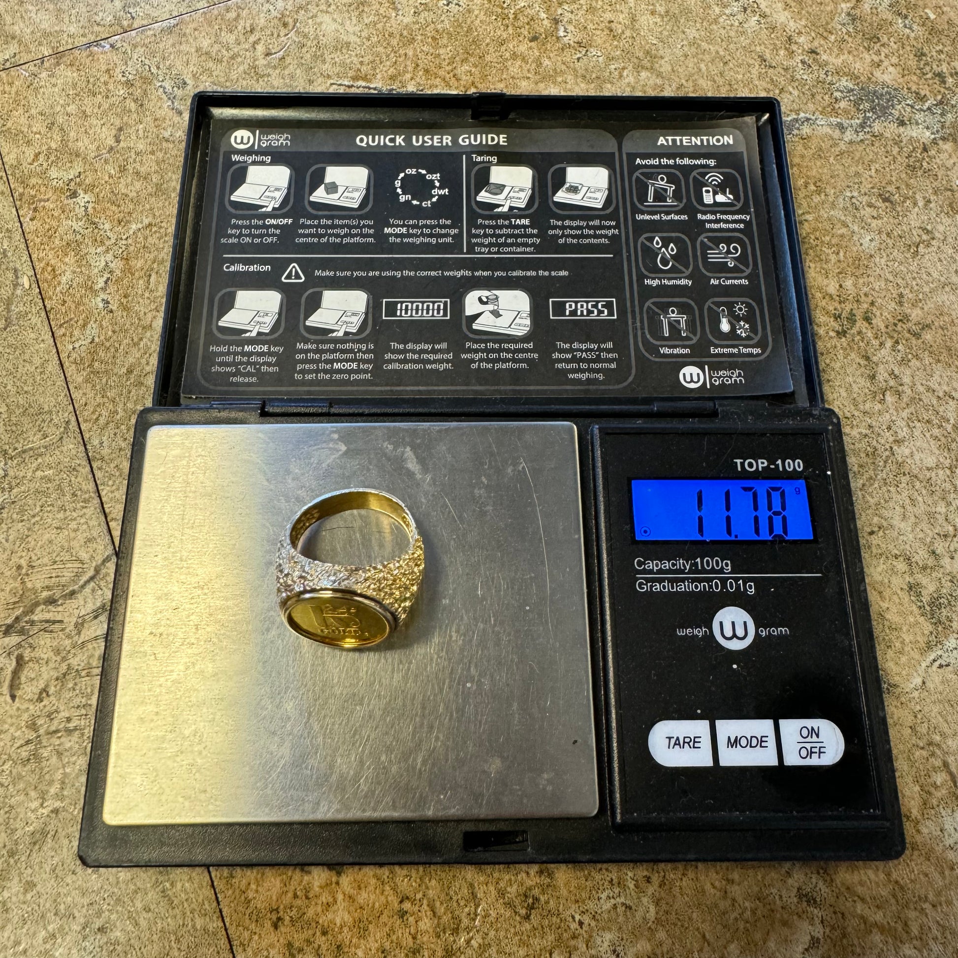 One of my favorite pick ups over the last few weeks is this special collectors issue 24k gold credit suisse 3g coin piece. Meticulously set in a heavy 14k yellow gold chunky heavyweight Nugget ring. With a total weight of 11.8g and the coin itself weighing 3g that brings the 14k ring weight to 8.8g and fitting of a size:8.75 (can be resized up or down due to the bottom shank of the ring being left as a flat texture). This one is for those who love their jewelry and want to show off a little bit. It will get a lot of discussions started especially by other gold enthusiasts.
