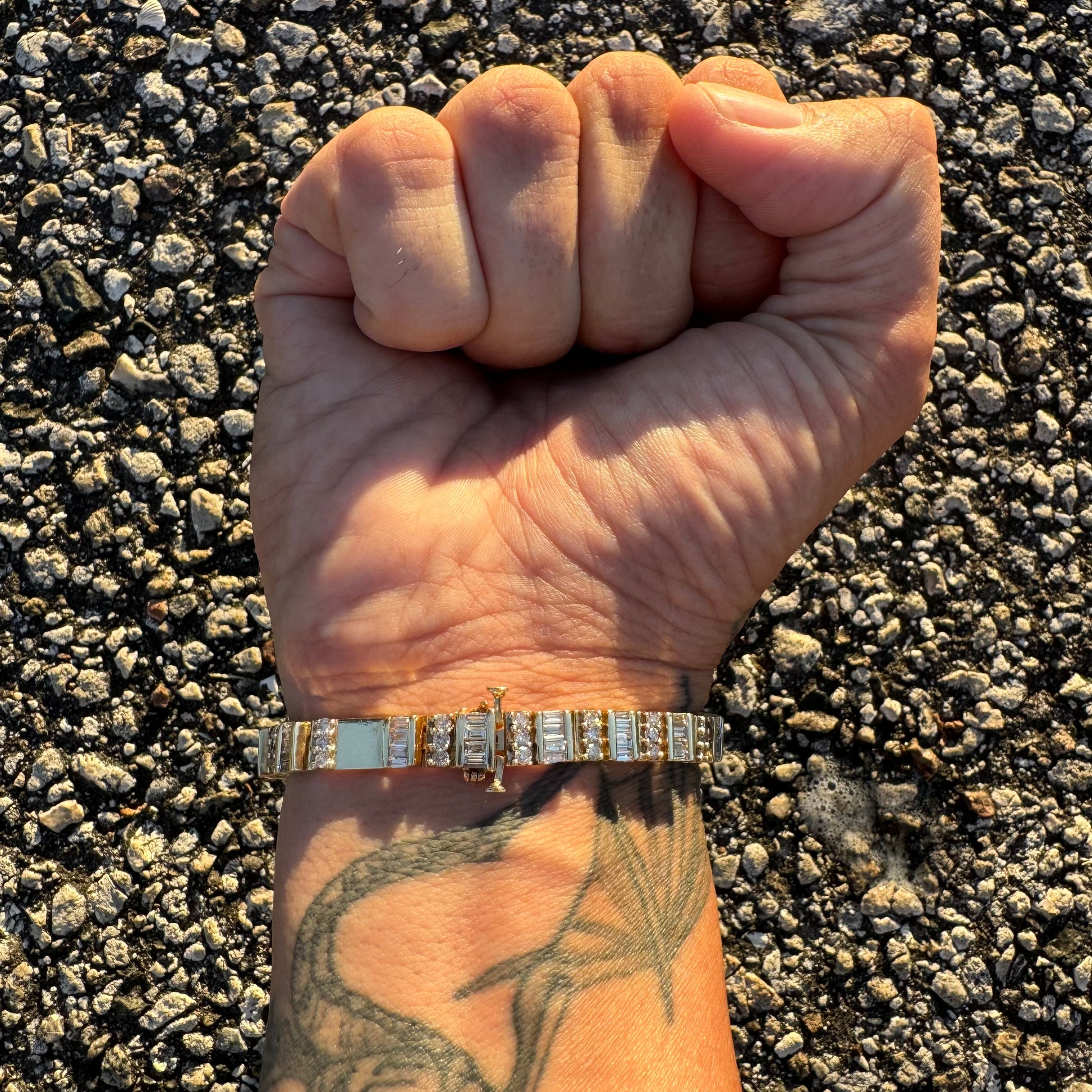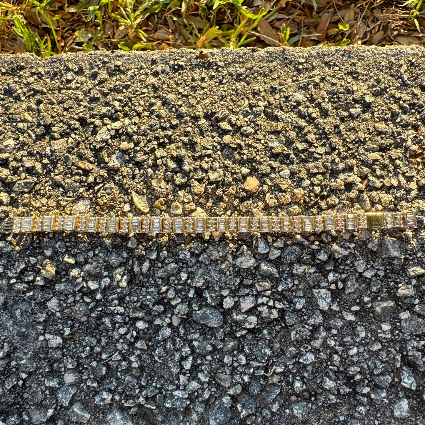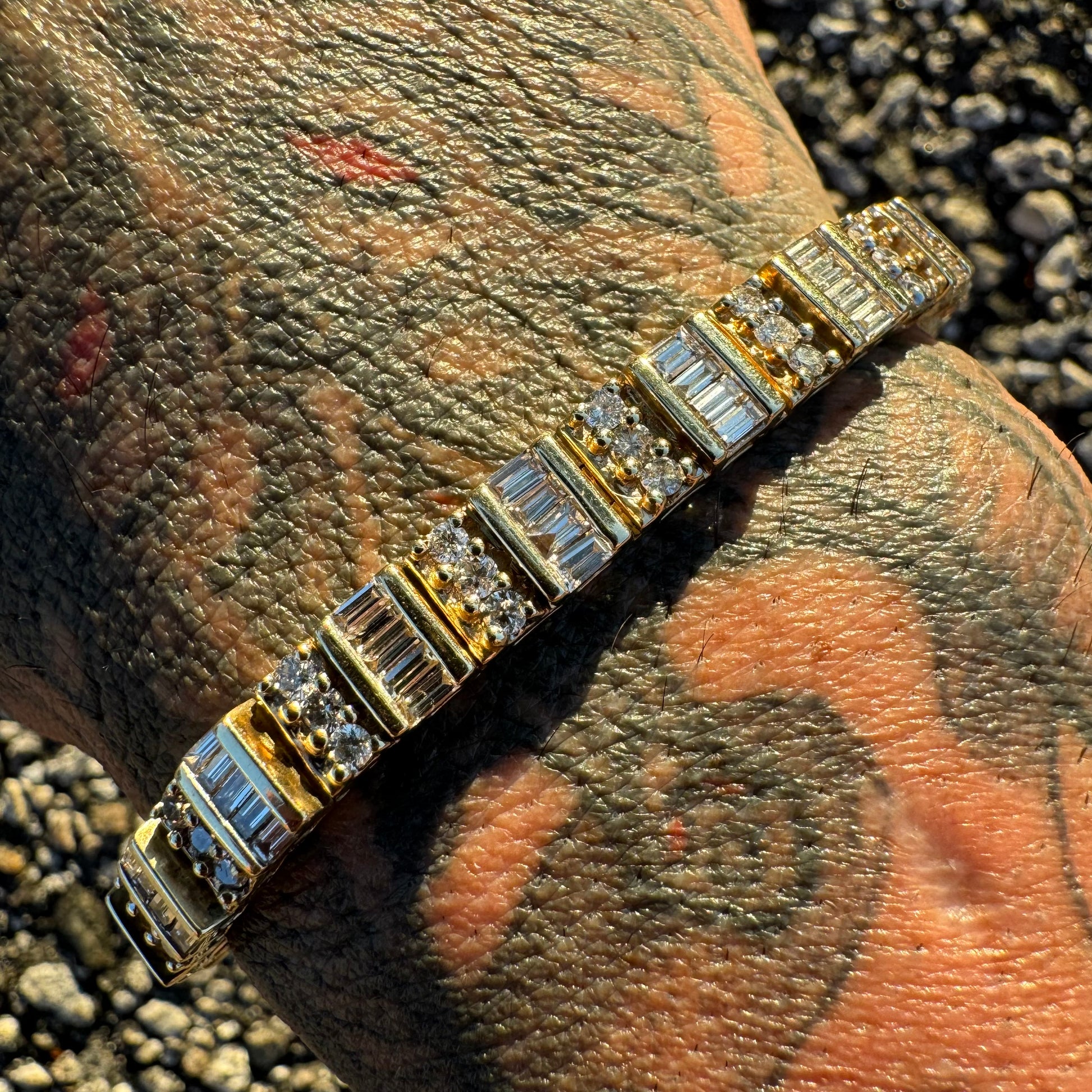 I’ve been after this bracelet from another jeweler plug of mine for quite a while and finally was able to make it happen at a great sellable price for you which is always my main goal.The combination of 18 rows each of natural channel set baguette and prong set round brilliant cut diamonds truly make this piece a force to be reckoned with. There are a total of 54 round brilliant cut diamonds of approximately .03ct each and approximately 72 baguette cuts at .05ct each flooding this astounding bracelet with a total of 5.2ctw of natural diamonds. Double sided push block locks with an extra underside security latch keeps this bracelet safe and secure. With a heavyweight of 23.13g of high mirror polished finish 14k yellow gold thick and wide at 7mm by 4.5mm you’re looking at what was a $5000 bracelet retail priced at any high end jewelry store.