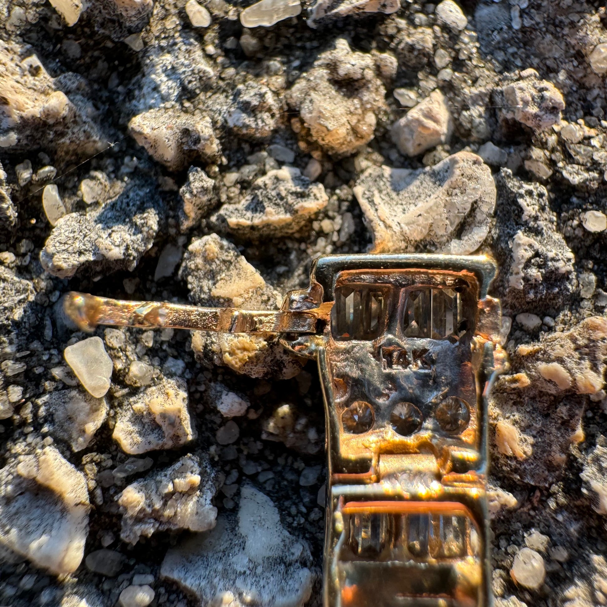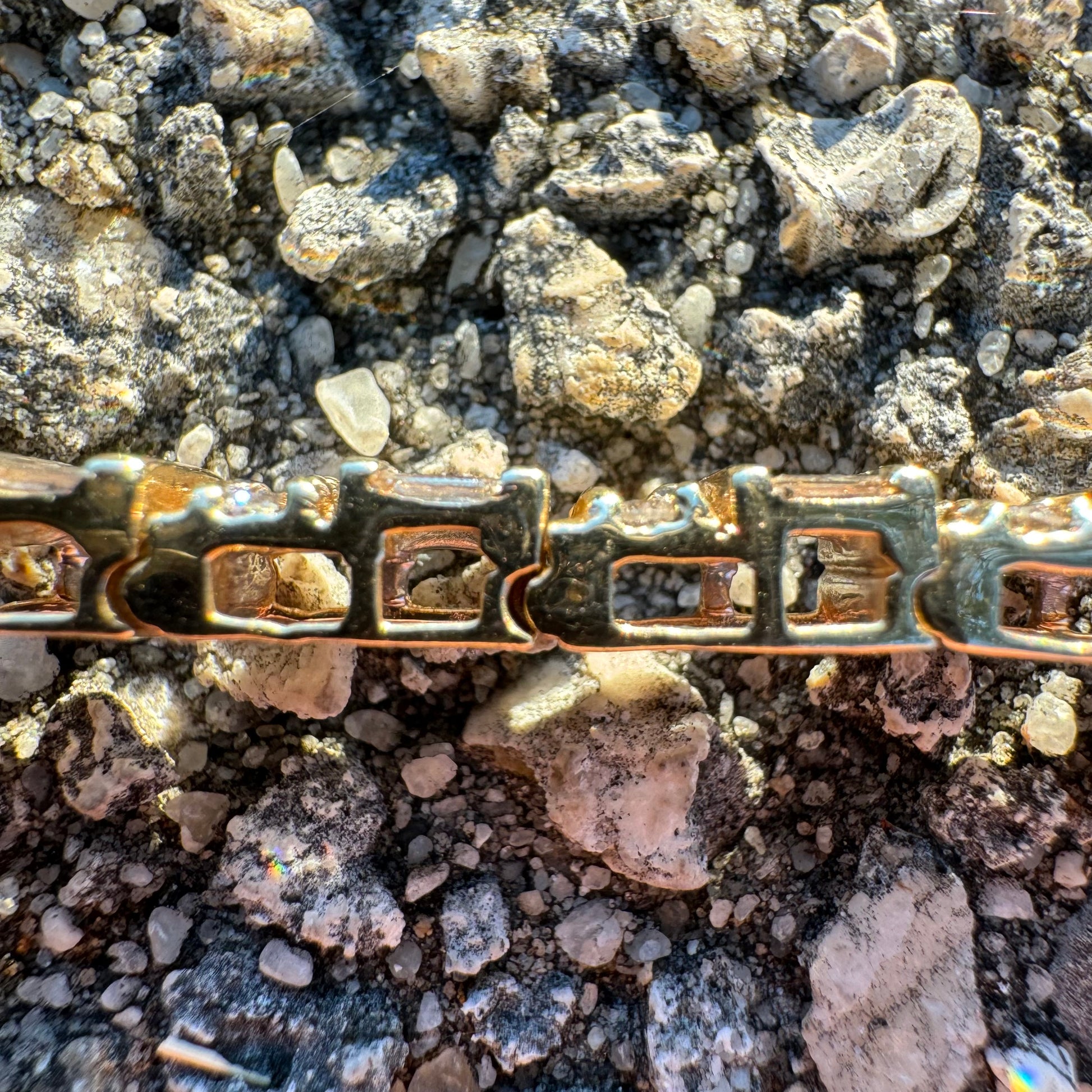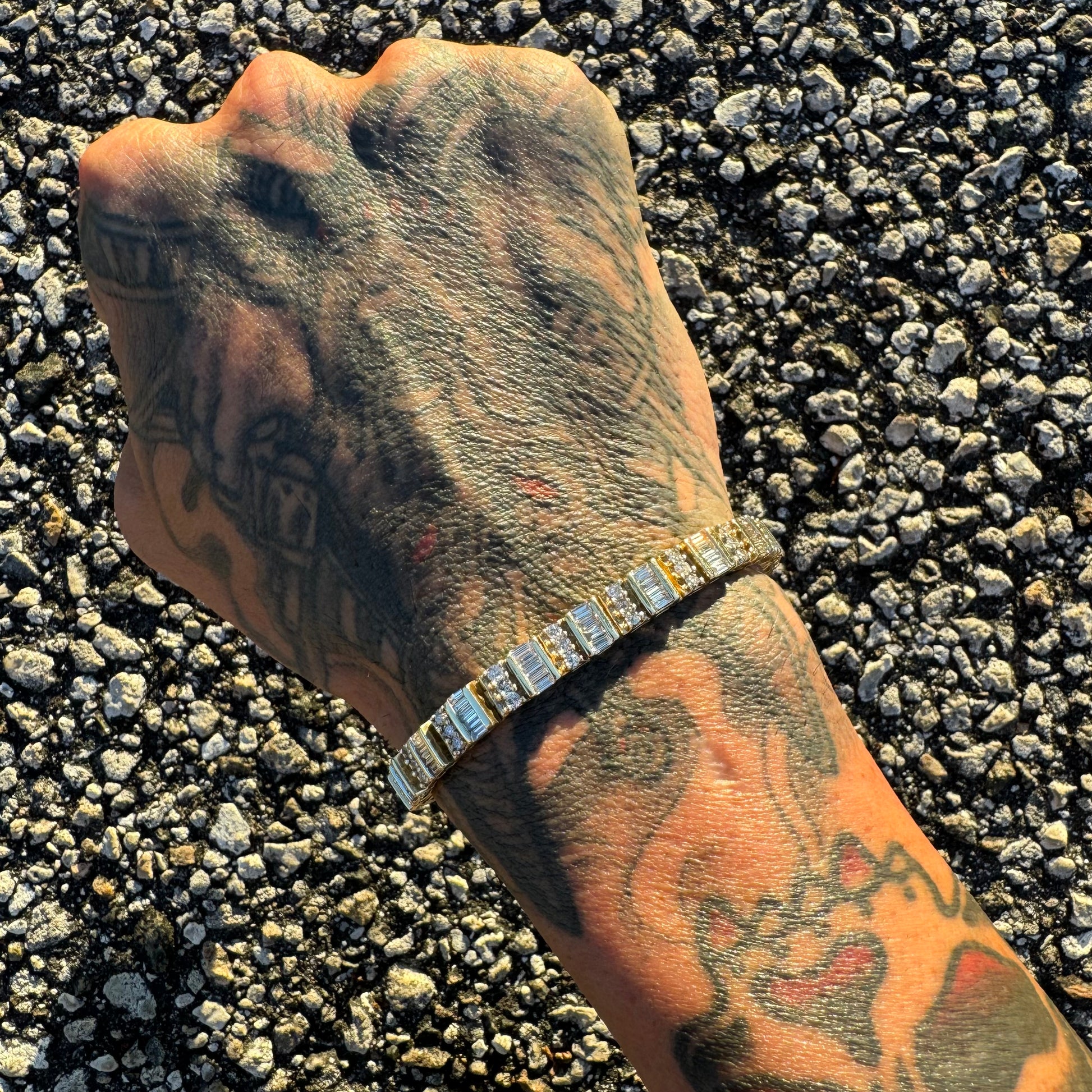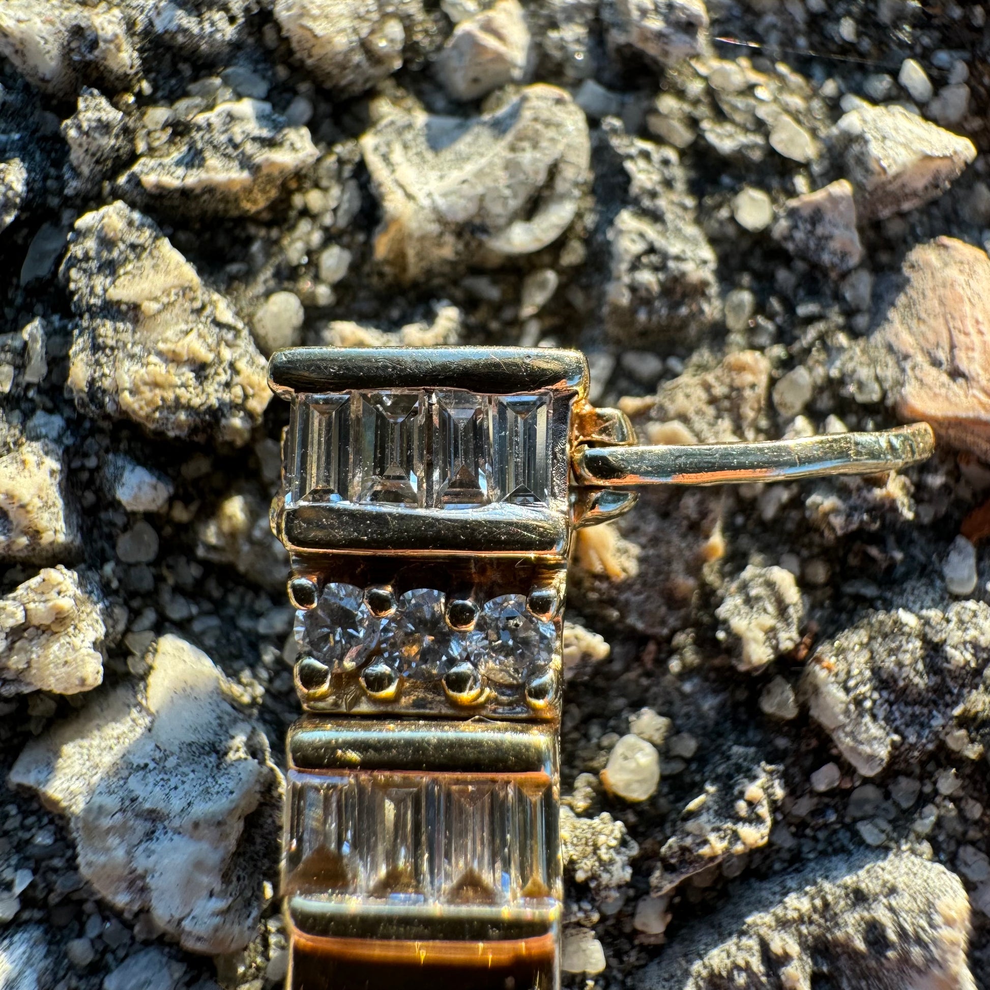 I’ve been after this bracelet from another jeweler plug of mine for quite a while and finally was able to make it happen at a great sellable price for you which is always my main goal.The combination of 18 rows each of natural channel set baguette and prong set round brilliant cut diamonds truly make this piece a force to be reckoned with. There are a total of 54 round brilliant cut diamonds of approximately .03ct each and approximately 72 baguette cuts at .05ct each flooding this astounding bracelet with a total of 5.2ctw of natural diamonds. Double sided push block locks with an extra underside security latch keeps this bracelet safe and secure. With a heavyweight of 23.13g of high mirror polished finish 14k yellow gold thick and wide at 7mm by 4.5mm you’re looking at what was a $5000 bracelet retail priced at any high end jewelry store.