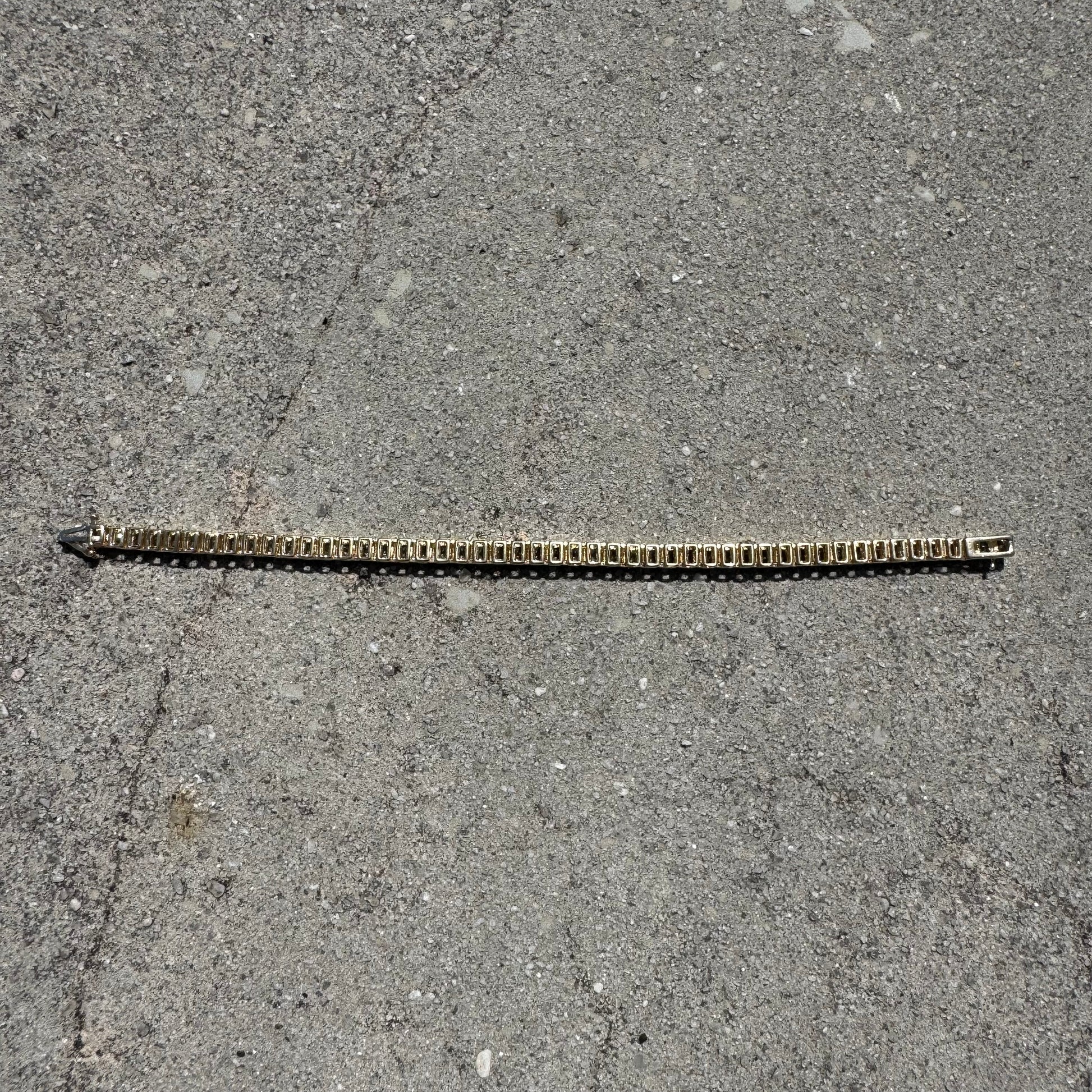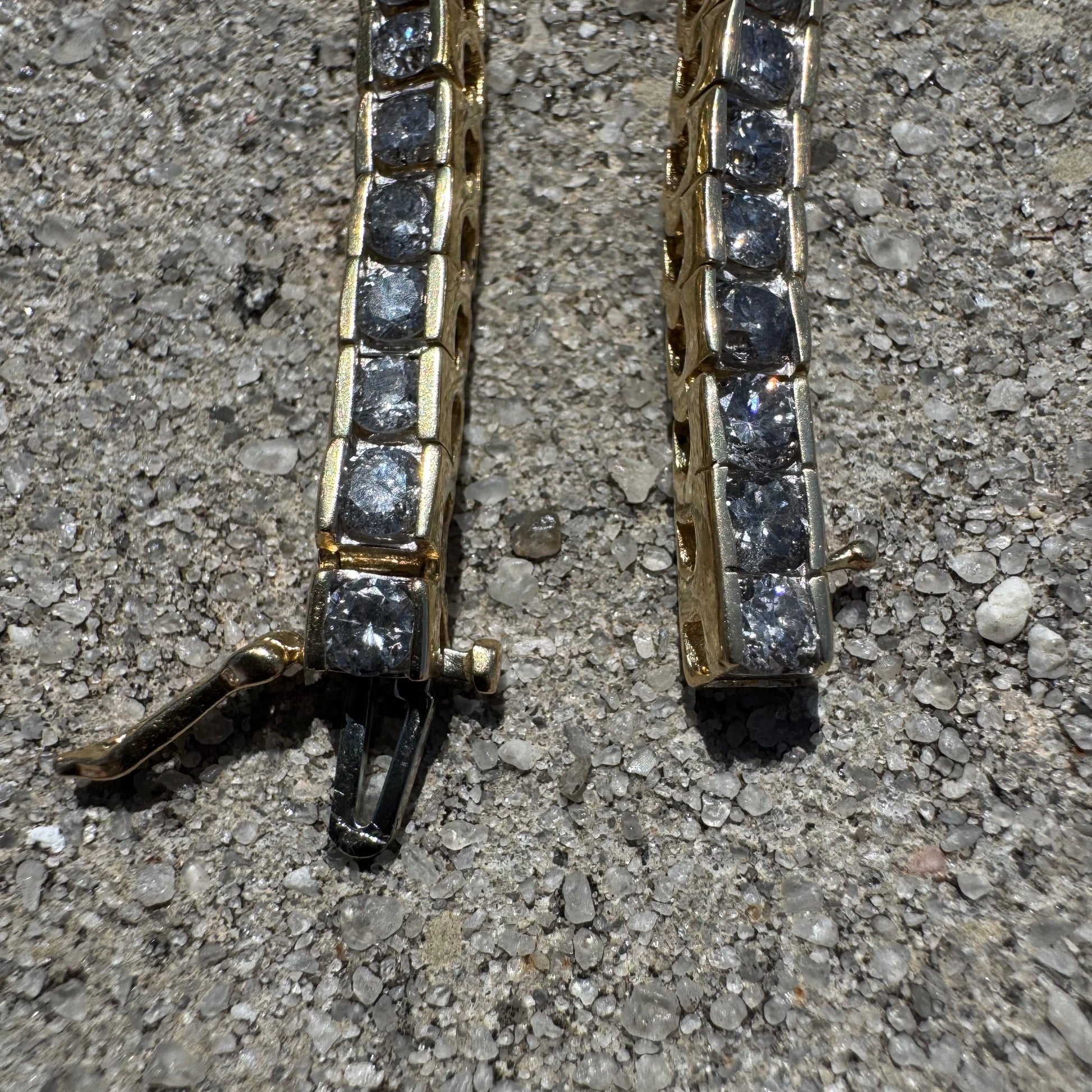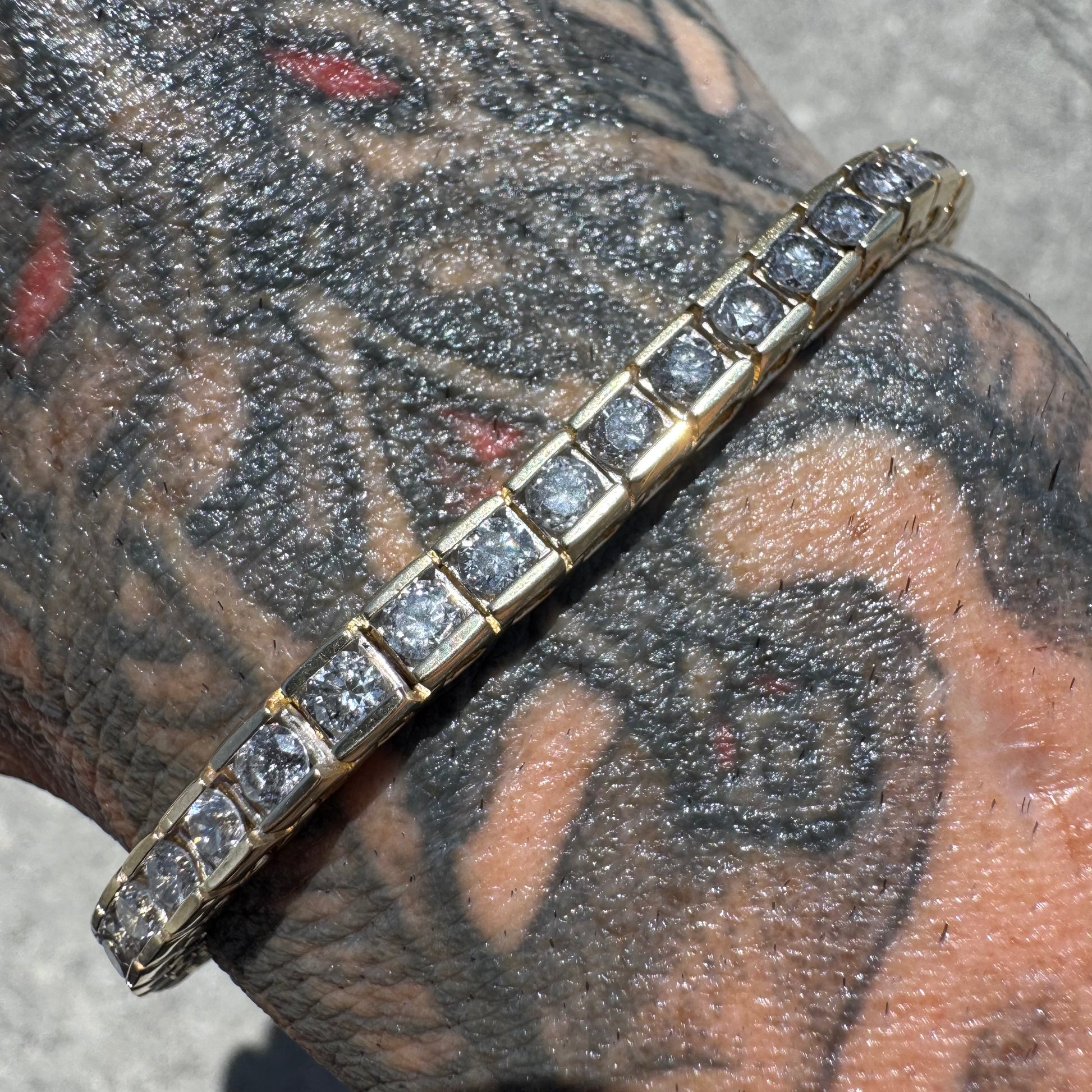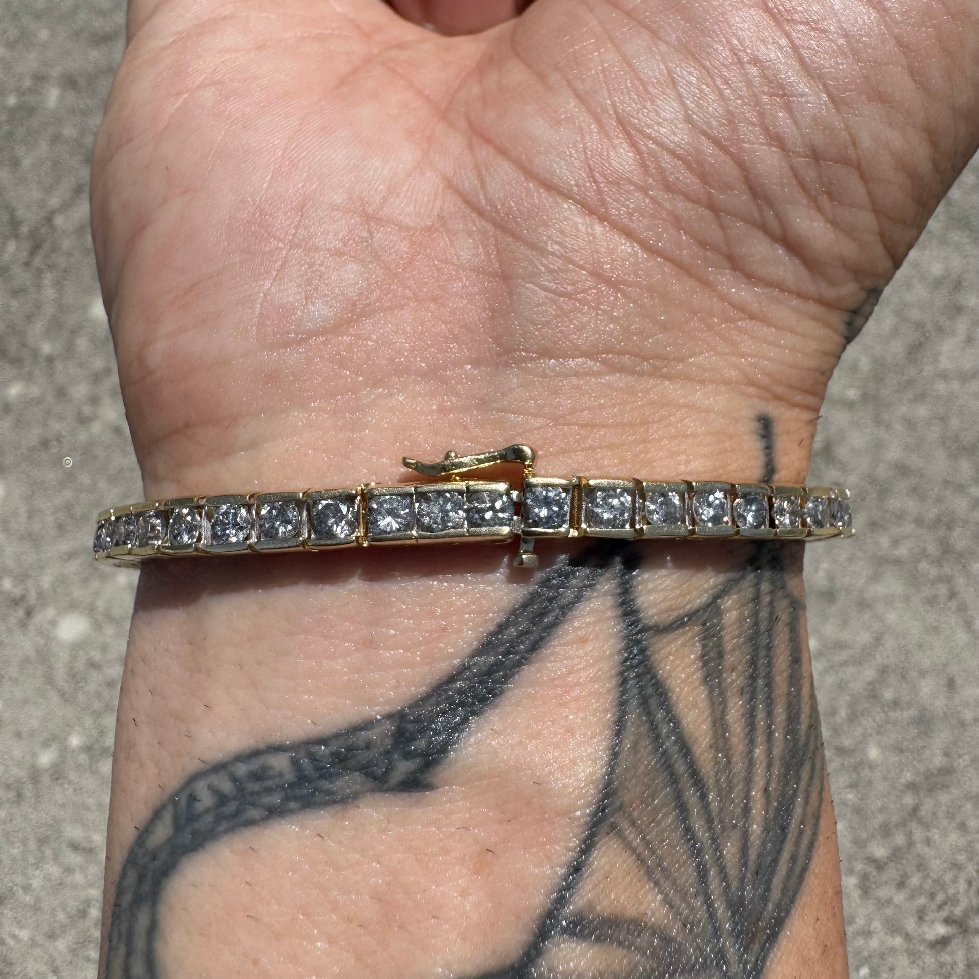 I must start out by saying these picture do absolutely no justice to how beautiful this bracelet is in person. To be quite frank the pictures I took suck and it was 100 degrees out so I did it very quickly. Now with all of that being said this one is an absolute stunner, In the sun and on the wrist it looks like a disco ball in full effect. With 49 natural diamonds all at approximately .15ct each this pretty lady jumps up to a total of approximately 7.0CTW. Crafted out of a heavy and high quality 14k yellow gold channel set vertebrae style bracelet setting weighing a heavyweight of 20.52g by 4.5mm wide and a wearable length of 7.35”. Very comfortable and form fitting the bracelet forms to your wrist and moves with your movement just like the vertebrae in your spine would. If you look close at the back and side construction of the bracelet you’ll see exactly the analogy I mean. This is an insane deal on an amazing piece. If sold at at any retail jewelery establishment they would be asking around $10000 for this exact bracelet.