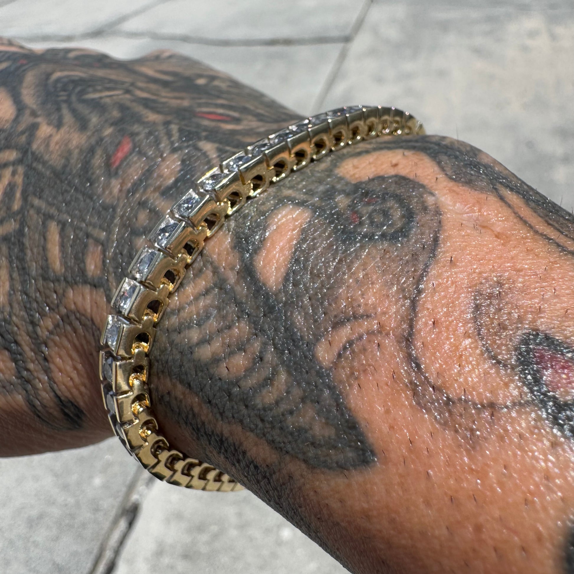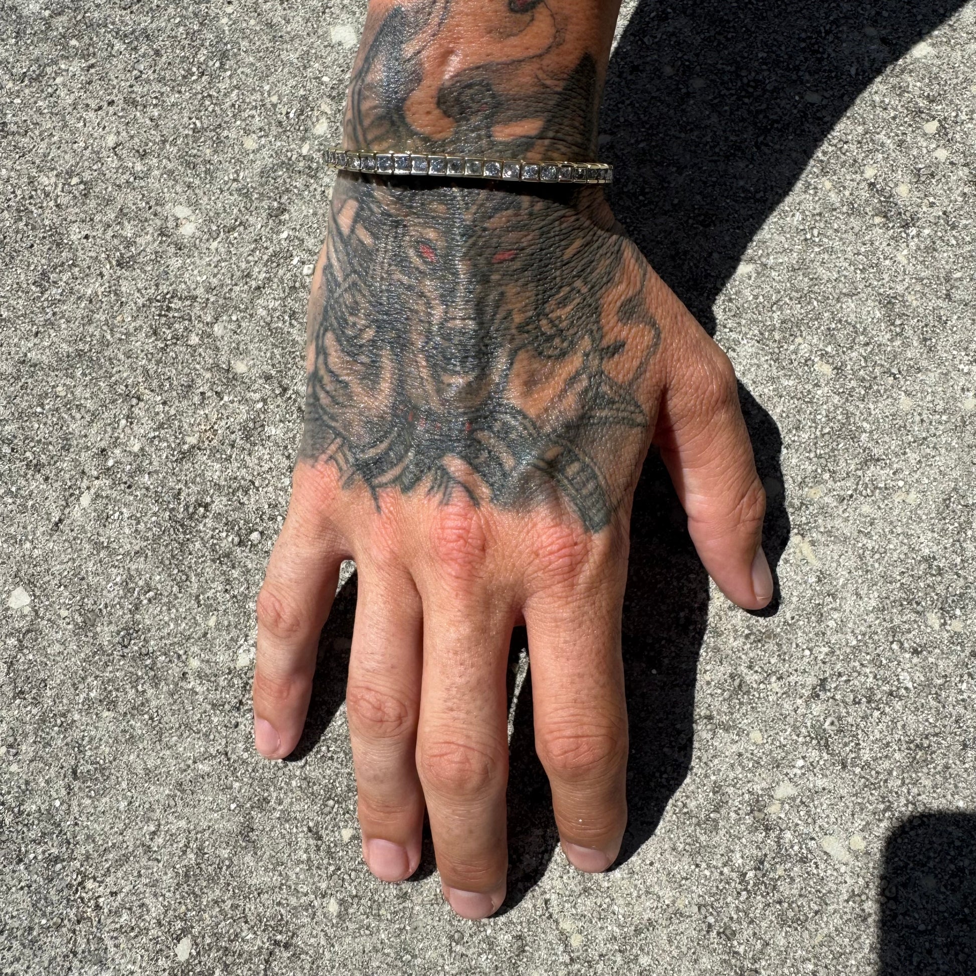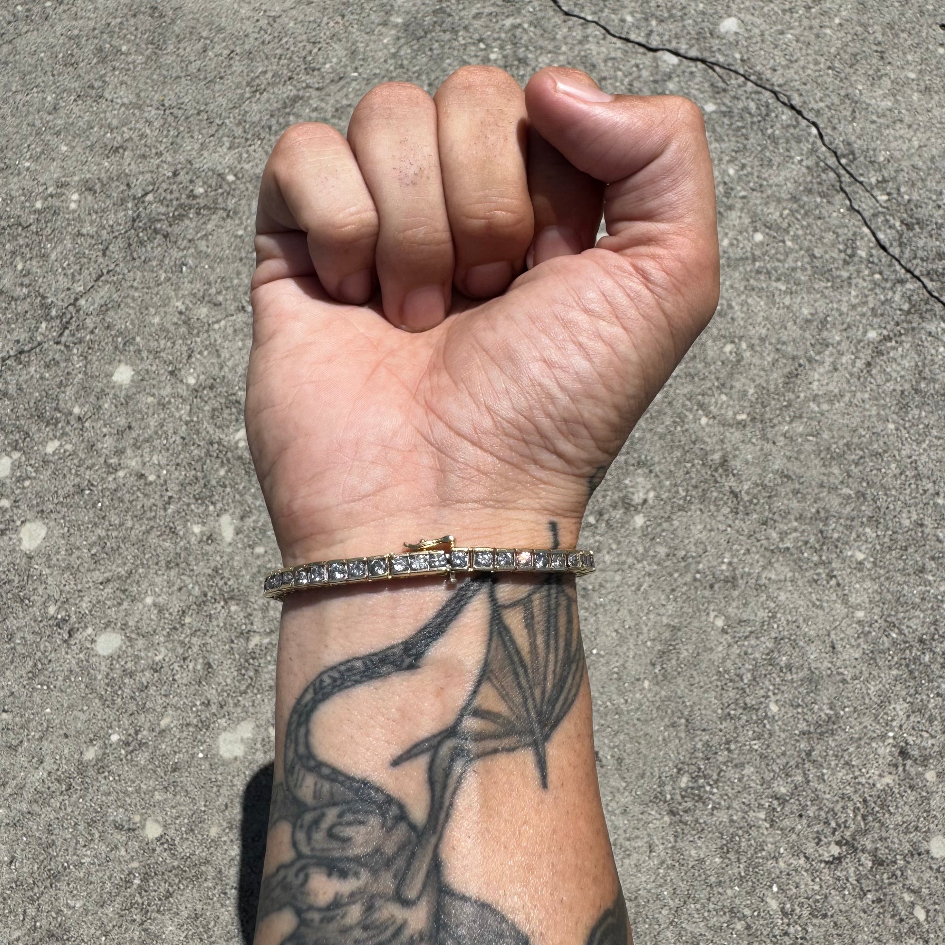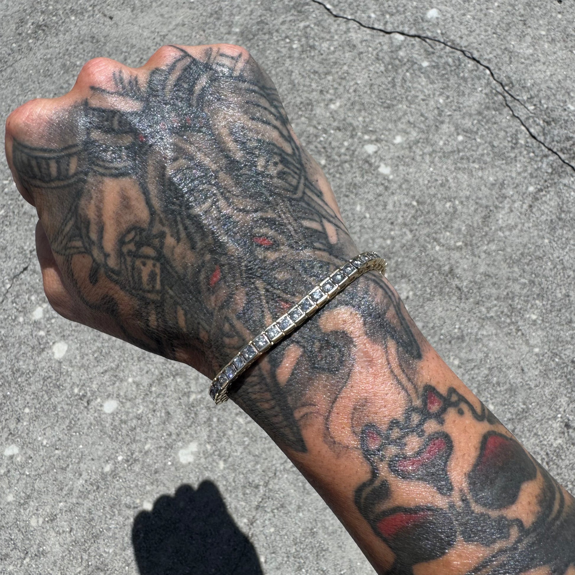 I must start out by saying these picture do absolutely no justice to how beautiful this bracelet is in person. To be quite frank the pictures I took suck and it was 100 degrees out so I did it very quickly. Now with all of that being said this one is an absolute stunner, In the sun and on the wrist it looks like a disco ball in full effect. With 49 natural diamonds all at approximately .15ct each this pretty lady jumps up to a total of approximately 7.0CTW. Crafted out of a heavy and high quality 14k yellow gold channel set vertebrae style bracelet setting weighing a heavyweight of 20.52g by 4.5mm wide and a wearable length of 7.35”. Very comfortable and form fitting the bracelet forms to your wrist and moves with your movement just like the vertebrae in your spine would. If you look close at the back and side construction of the bracelet you’ll see exactly the analogy I mean. This is an insane deal on an amazing piece. If sold at at any retail jewelery establishment they would be asking around $10000 for this exact bracelet.