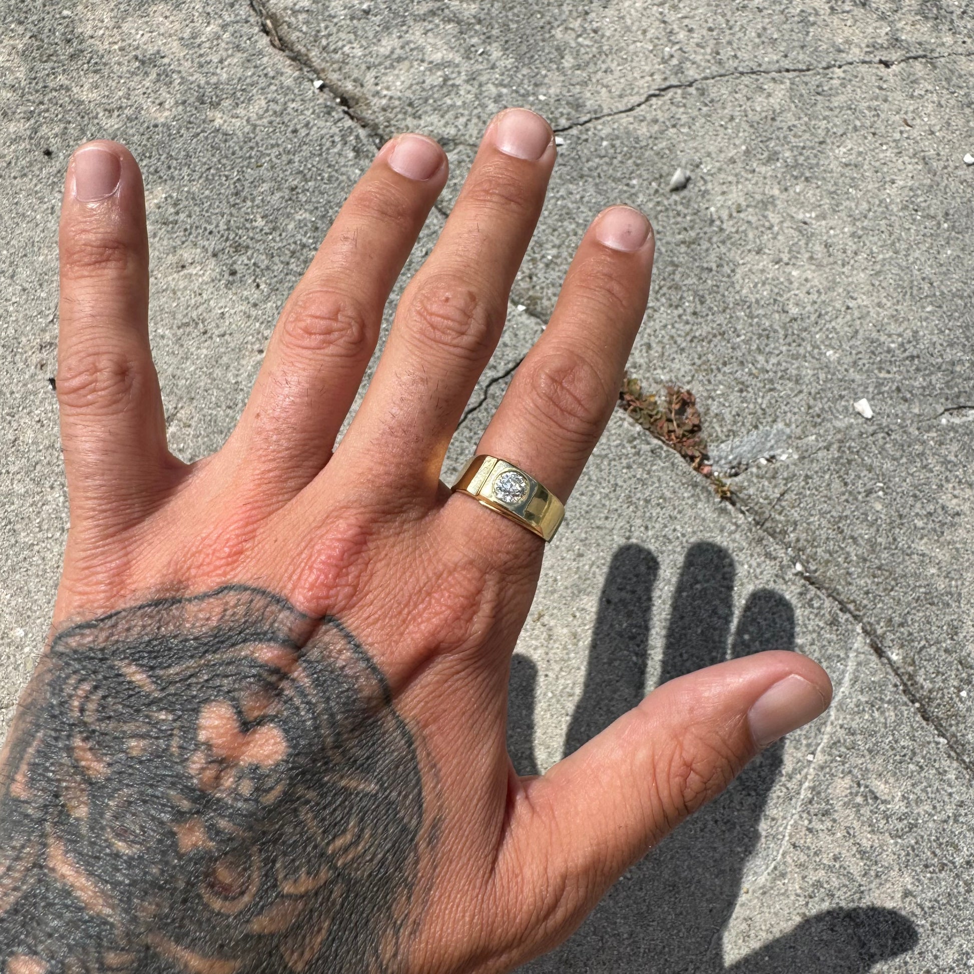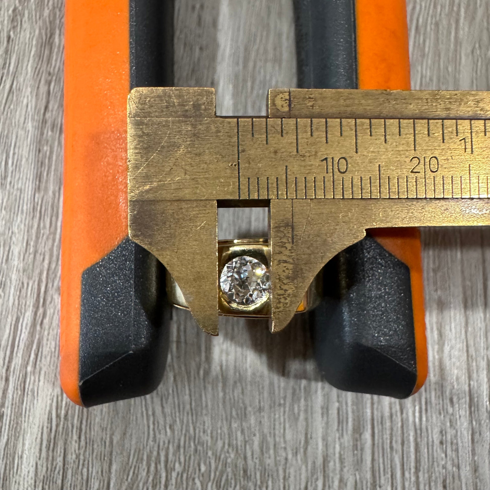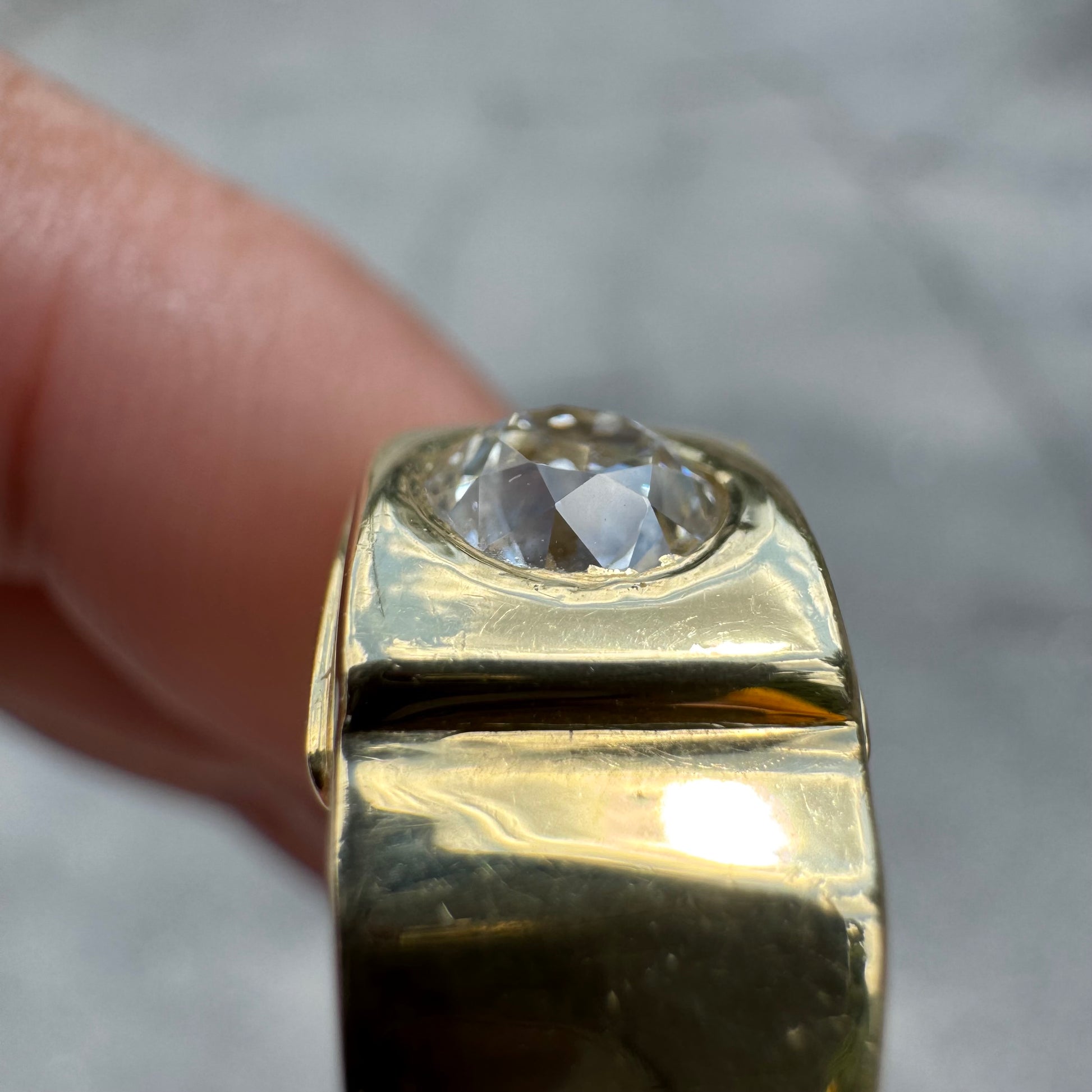 This piece is absolutely stunning. Set into a vibrant and all solid backed heavyweight 18k buttery yellow gold. This unique style band with the left side having a boxy step down and the top edges a rounded taper gives off a more elegant yet fierce look of depth as opposed to just a plain basic band. Securely set in the center is a beautifully clean natural diamond from the past, a .73ct old euro cut diamond. With dimensions of approximately 5.5mm x 5.5mm x 4mm this is a large stone with amazing color and flashes of color. All handcrafted with substance the ring weighs in at a hefty 10.55g and a chunky width on the finger of 9.5mm wide as it fits a size:9.5. This ring is extremely versatile as it will look great no matter which finger you decide to wear it on.