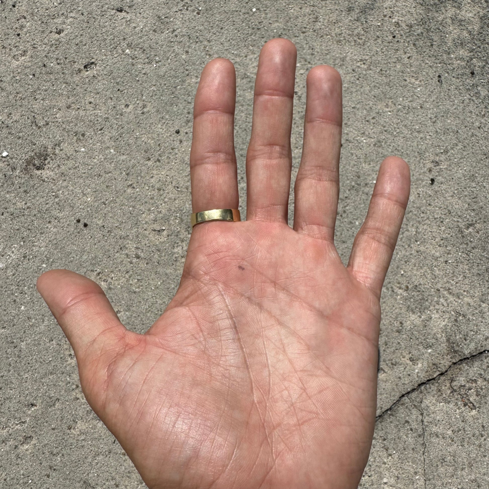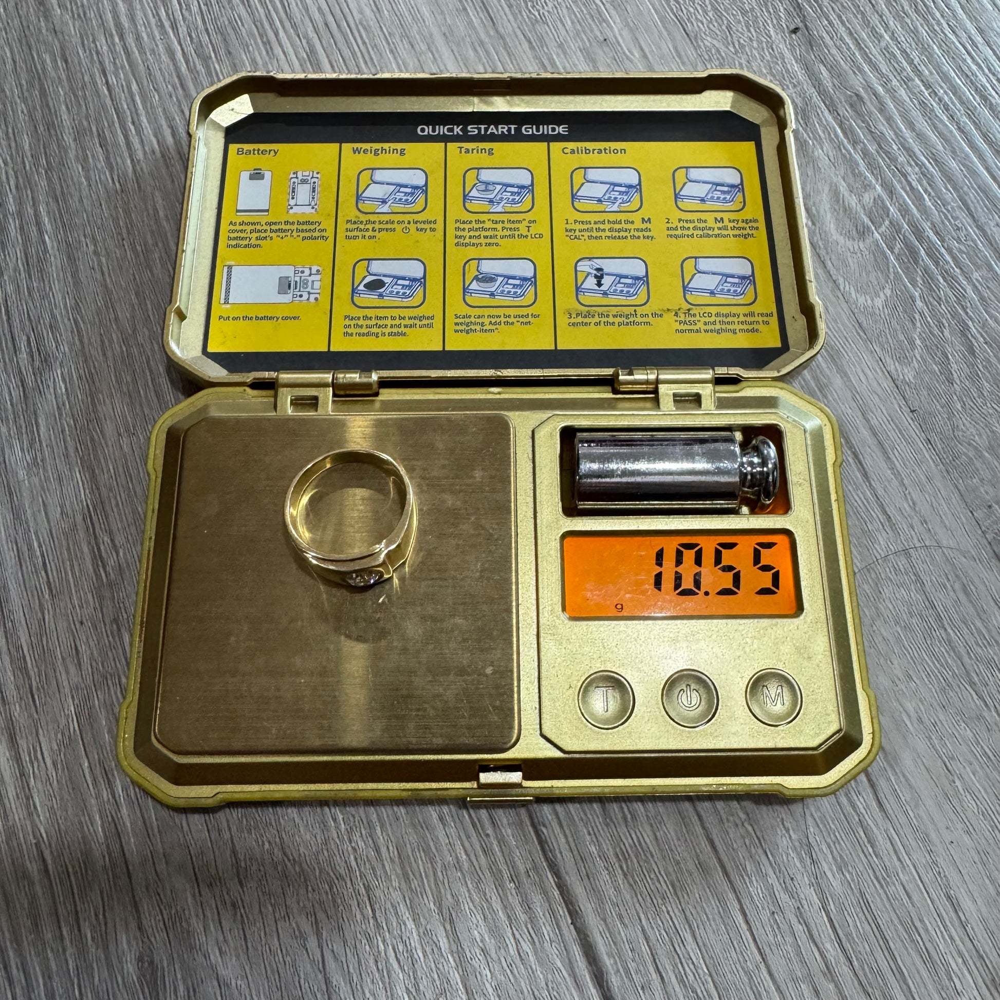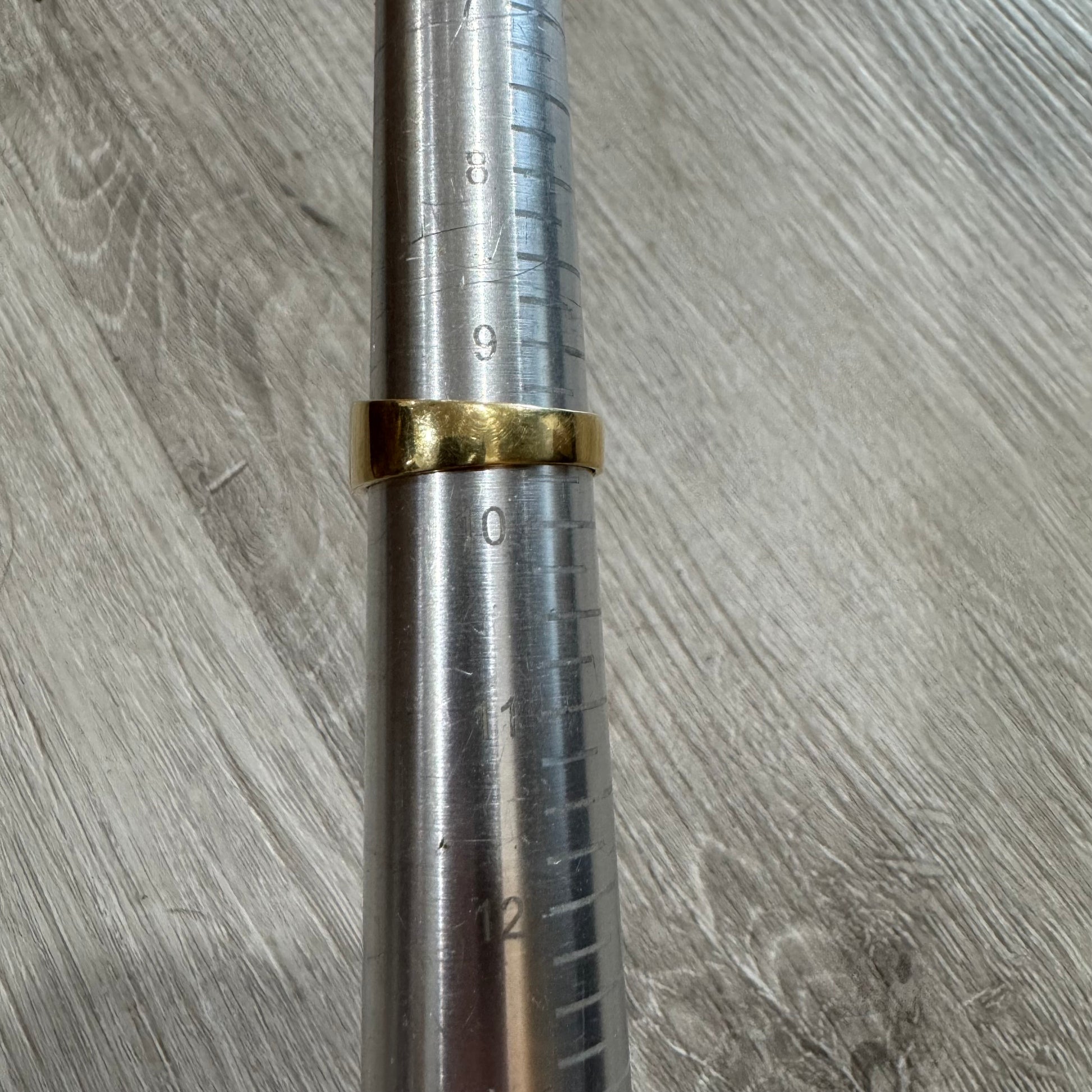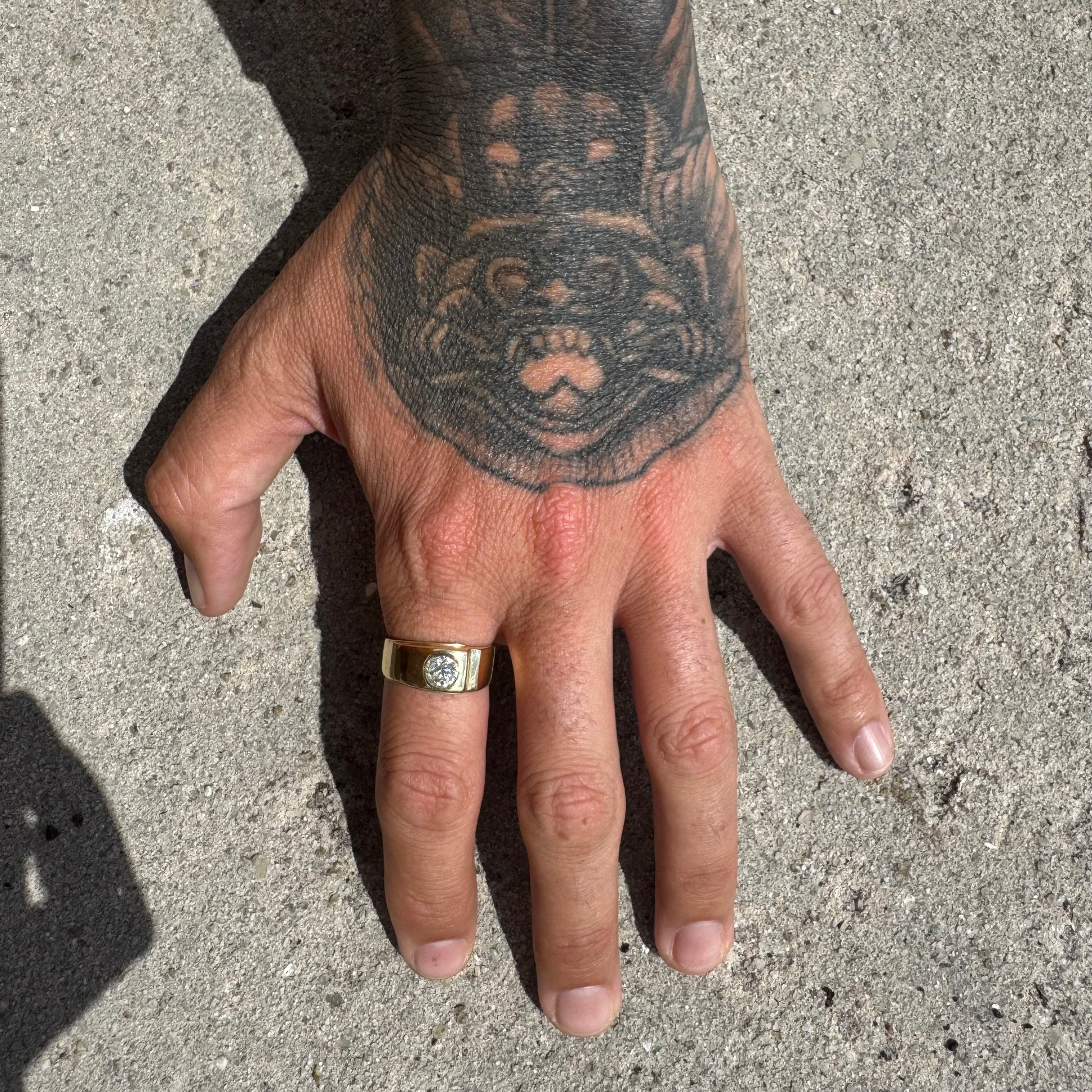 This piece is absolutely stunning. Set into a vibrant and all solid backed heavyweight 18k buttery yellow gold. This unique style band with the left side having a boxy step down and the top edges a rounded taper gives off a more elegant yet fierce look of depth as opposed to just a plain basic band. Securely set in the center is a beautifully clean natural diamond from the past, a .73ct old euro cut diamond. With dimensions of approximately 5.5mm x 5.5mm x 4mm this is a large stone with amazing color and flashes of color. All handcrafted with substance the ring weighs in at a hefty 10.55g and a chunky width on the finger of 9.5mm wide as it fits a size:9.5. This ring is extremely versatile as it will look great no matter which finger you decide to wear it on.