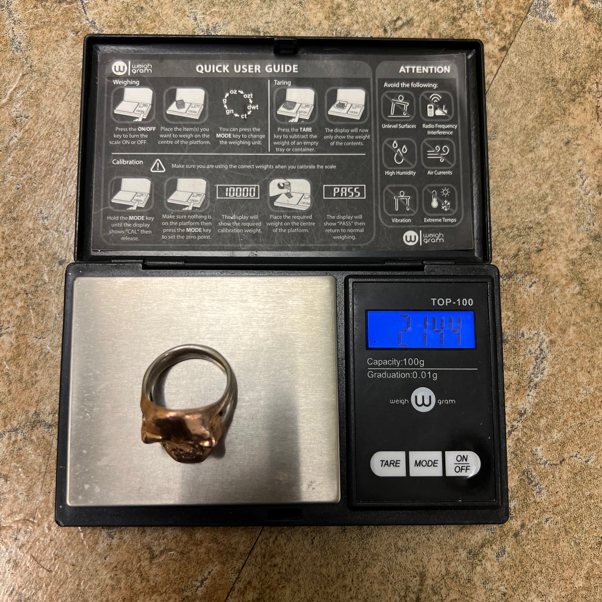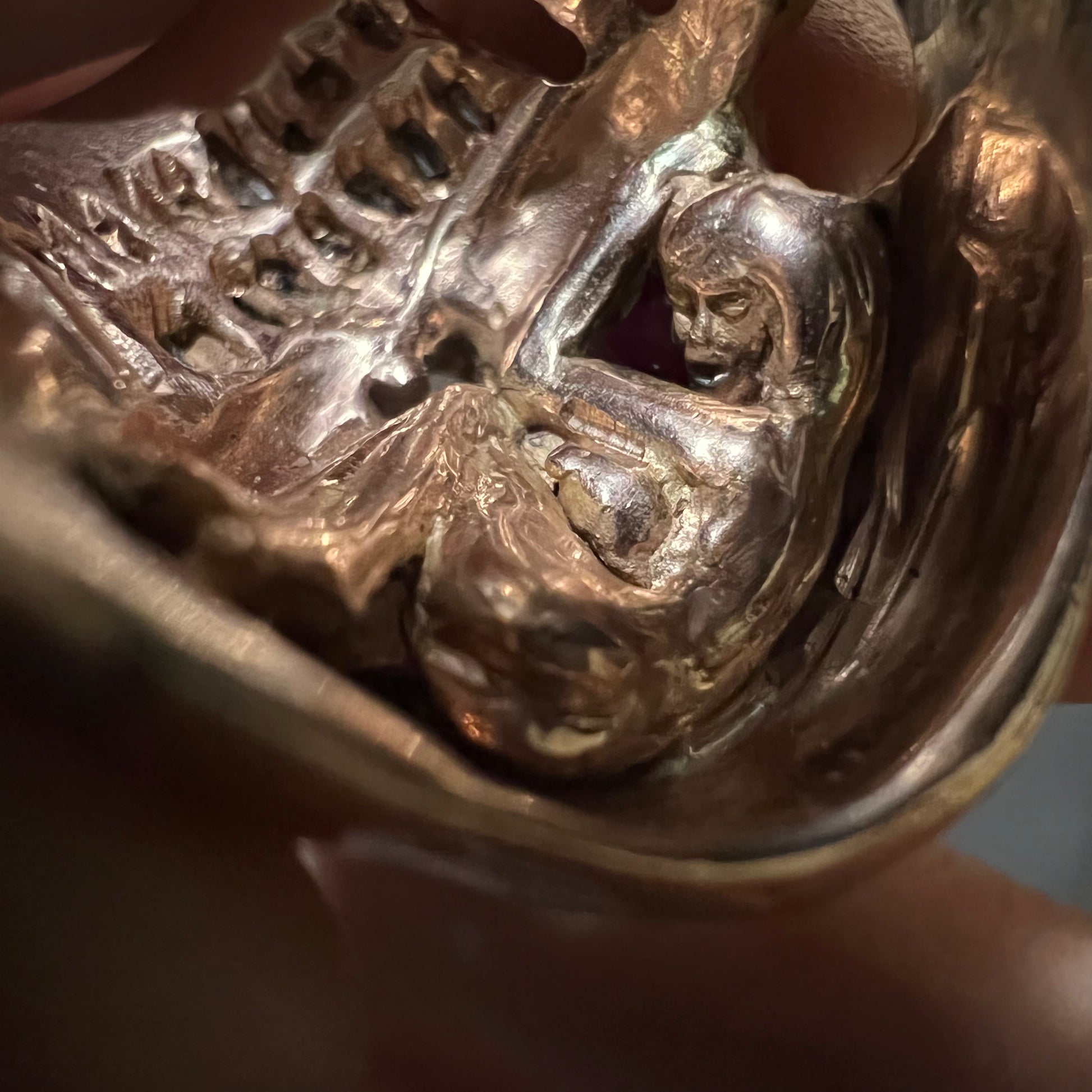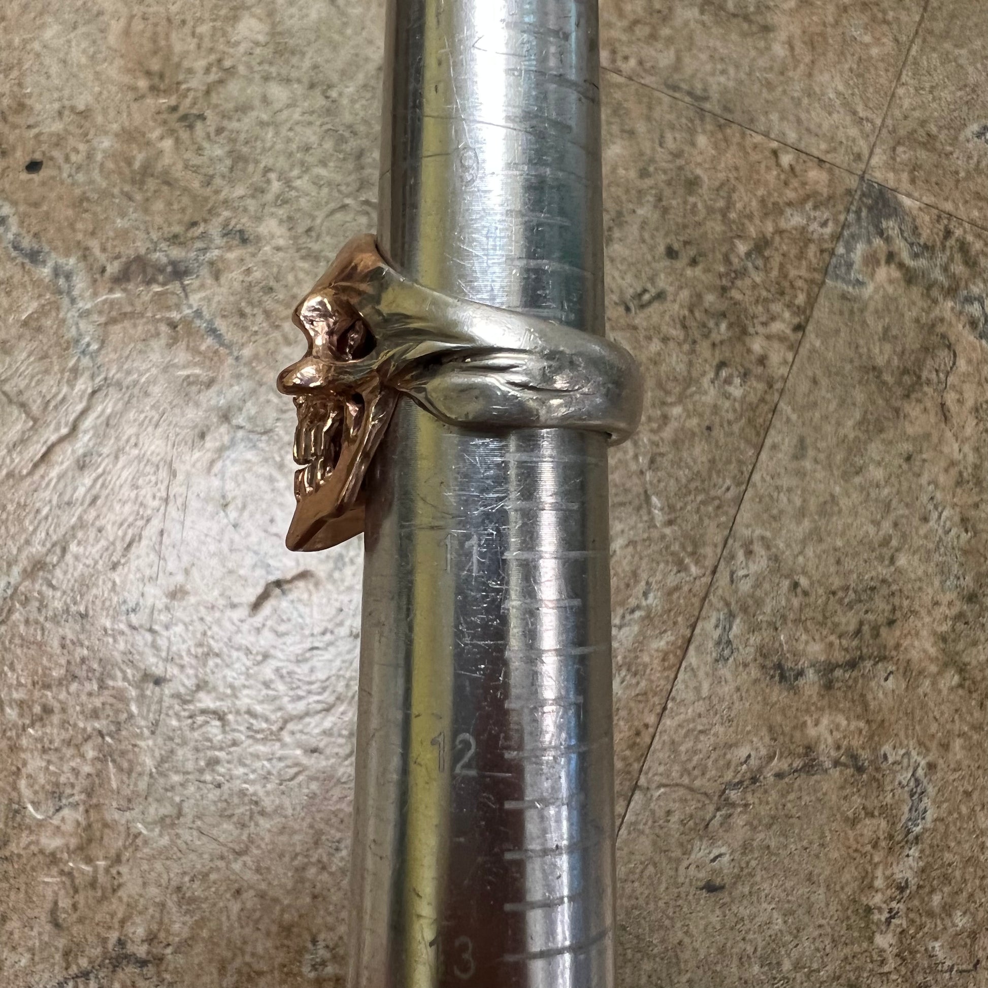By far the raddest skull ring I’ve ever come into contact with. This heavy monster was all custom made with the skull being fashioned out of solid 14k rose gold and the shank part of the ring being formed out of strong sterling/.925 silver to all morph into one heavy and durable piece. The skull part has been Xray tested and considered right in between 13-14k gold and weighs approximately 15.04g while the sterling silver shank of the ring weighs about 6.43g. With the teeth being made up of 16 natural diamonds of various baguette, Princess, and round cut diamonds giving and originality unlike any other you’ve seen. The firing glow of the natural red Ruby eyes as it stares deep into your soul. The absolutely best part about this piece of art I saved to talk about last and that is the hidden naked woman lying behind the back of the skull in the fetal position. This one speaks for itself, I mean come on. On the mandrel and due to the shape of the ring it’s sized like a 9.75-10
