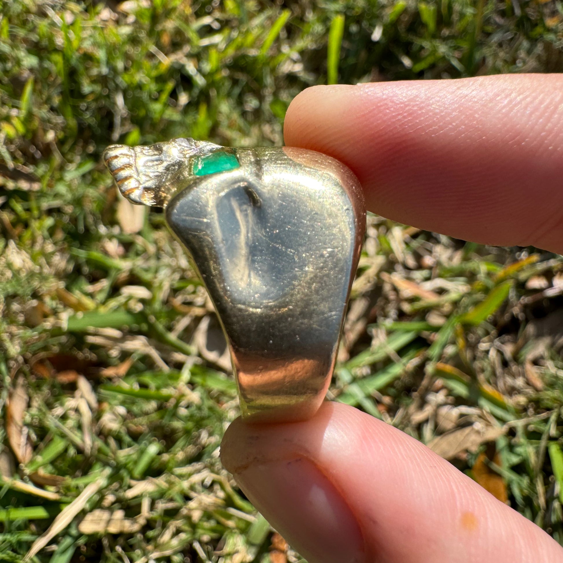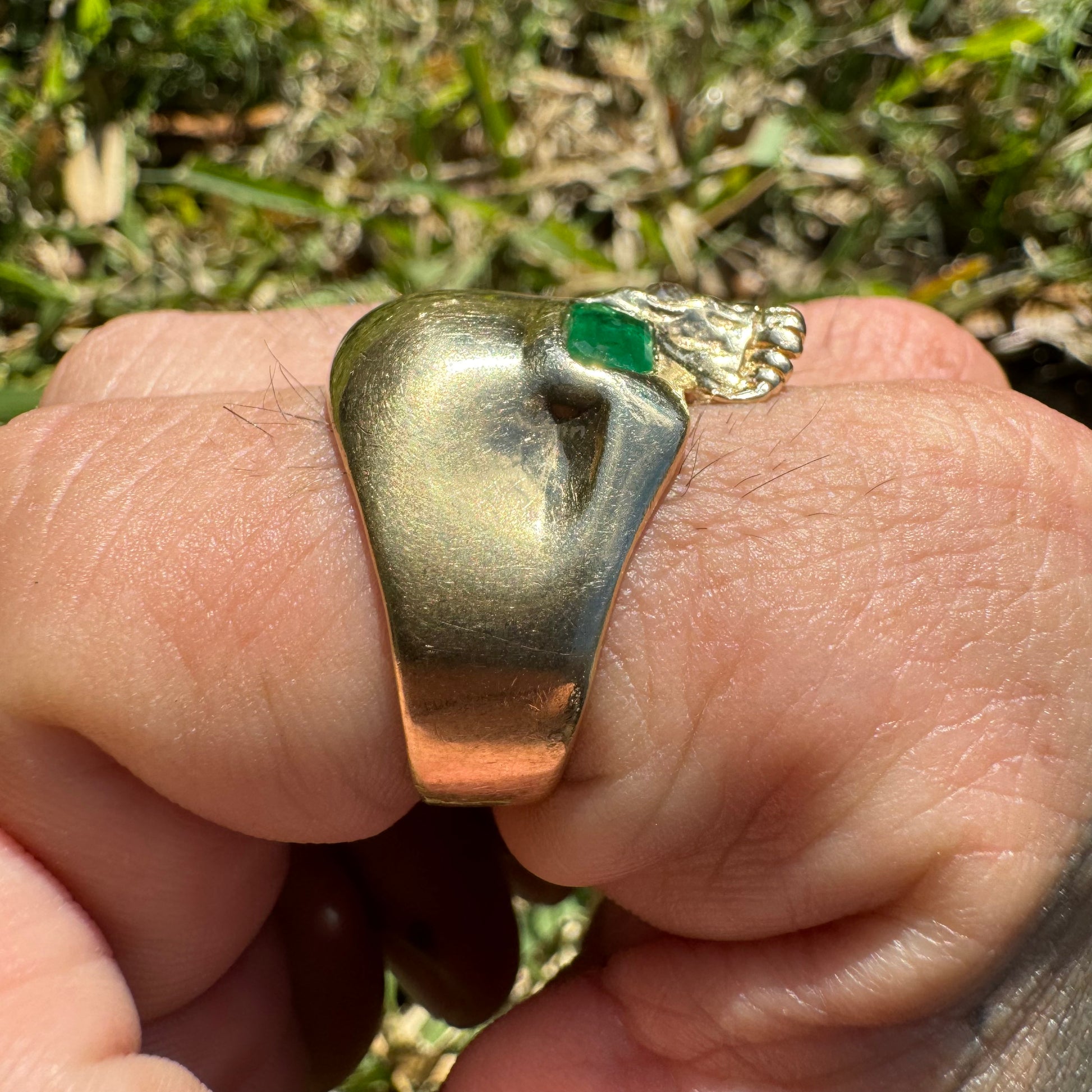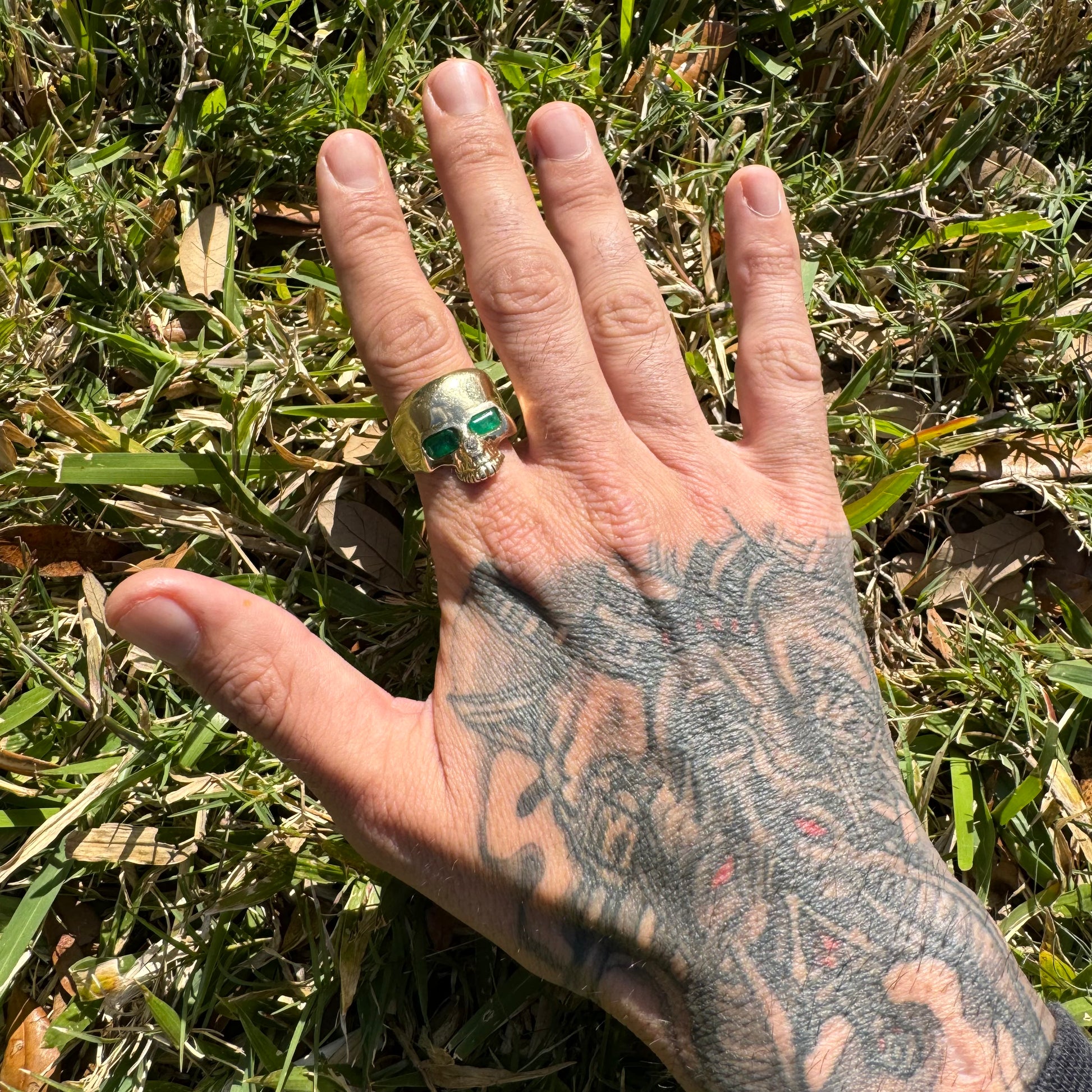 This one belonged for years to one of my buddy’s who is part of an infamous outlaw motorcycle club. I’ve had tried for years to buy it off him with no luck, when he pulled it out the other day and told me I could buy it because he was moving I was definitely taken a back. This one is bad ass with large clean natural emerald eyes totaling close to 1.0ct each And then to set it off with that old euro cut diamond in the nose this one is pure old school originality. Crafted out of a glowing 14k yellow gold size:12 and weighing 13.3g it’s a piece you’ll have everyone gawking over and trying to buy right off your finger for more money than you even bought it from me at.