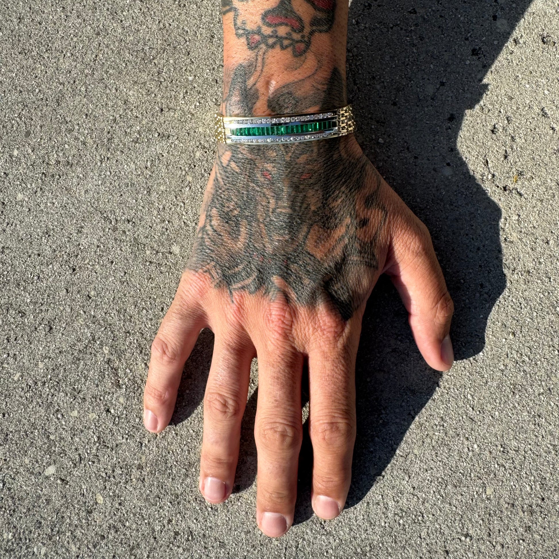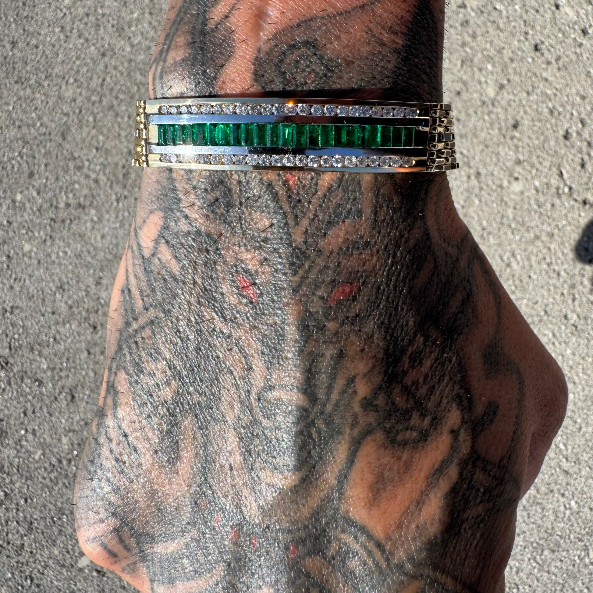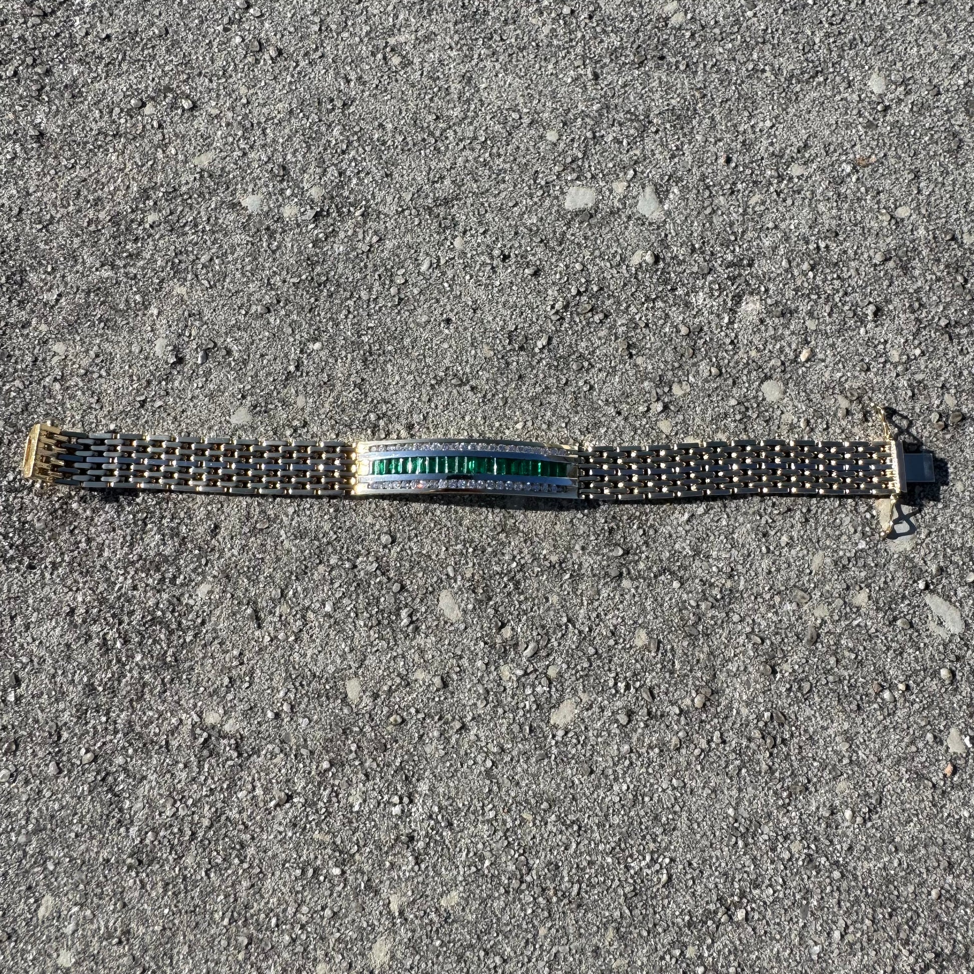 This piece is in near mint condition, though these pictures are great and the bracelet speaks for itself it truly does no justice to how beautiful and even better it is in person. Encrusted with 22 super clean and vibrant natural baguette cut emeralds at around .11ct each (2.5ctw) and 44 crisp and colorful natural round brilliant cut diamonds strongly channel set on each other side of just about .035ct each (1.5ctw) bringing the whopping total up to around 4.0ctw. This is a commanding, strong, durable, heavyweight, yet elegant panther link style bracelet with double sided safety latched clasp (if you look at picture #17 you can see the female side of the clasp has little to no scratches revealing that this bracelet looks to hardly have ever been worn). Measuring approximately 8.25” end to end the bracelet fits at a 7.75” with a heavy build of 49.7g and a thick and wide 12mm x 2.5mm. When you put this bracelet on you truly feel your spirits lift up, your shoulders elevate into a confident position, and your enlightenment boost with this gorgeous yet fierce vibe that this piece of jewelry delivers. A timeless piece that will be passed down in the family for generations to come, whoever is wearing it will be complimented no matter what crowd they encounter or room they enter.