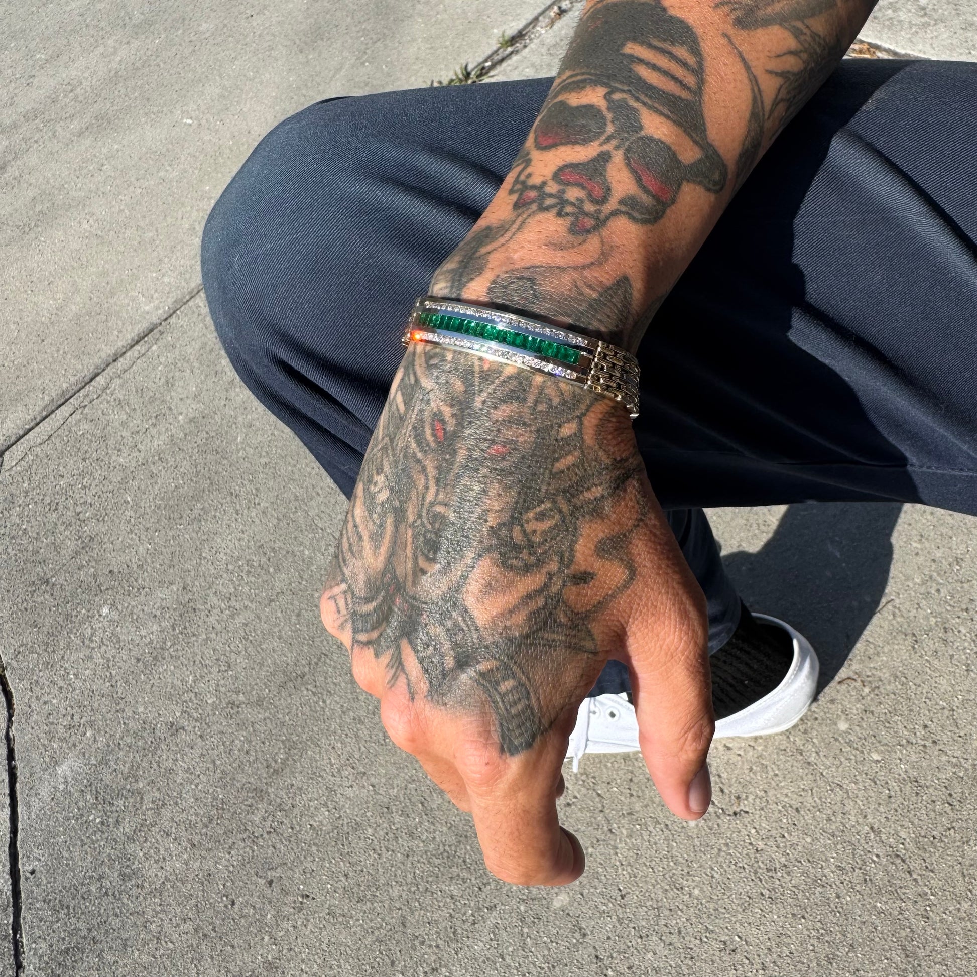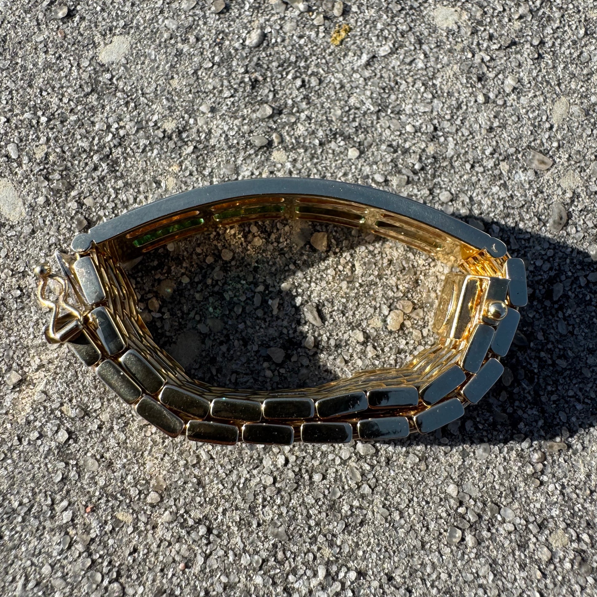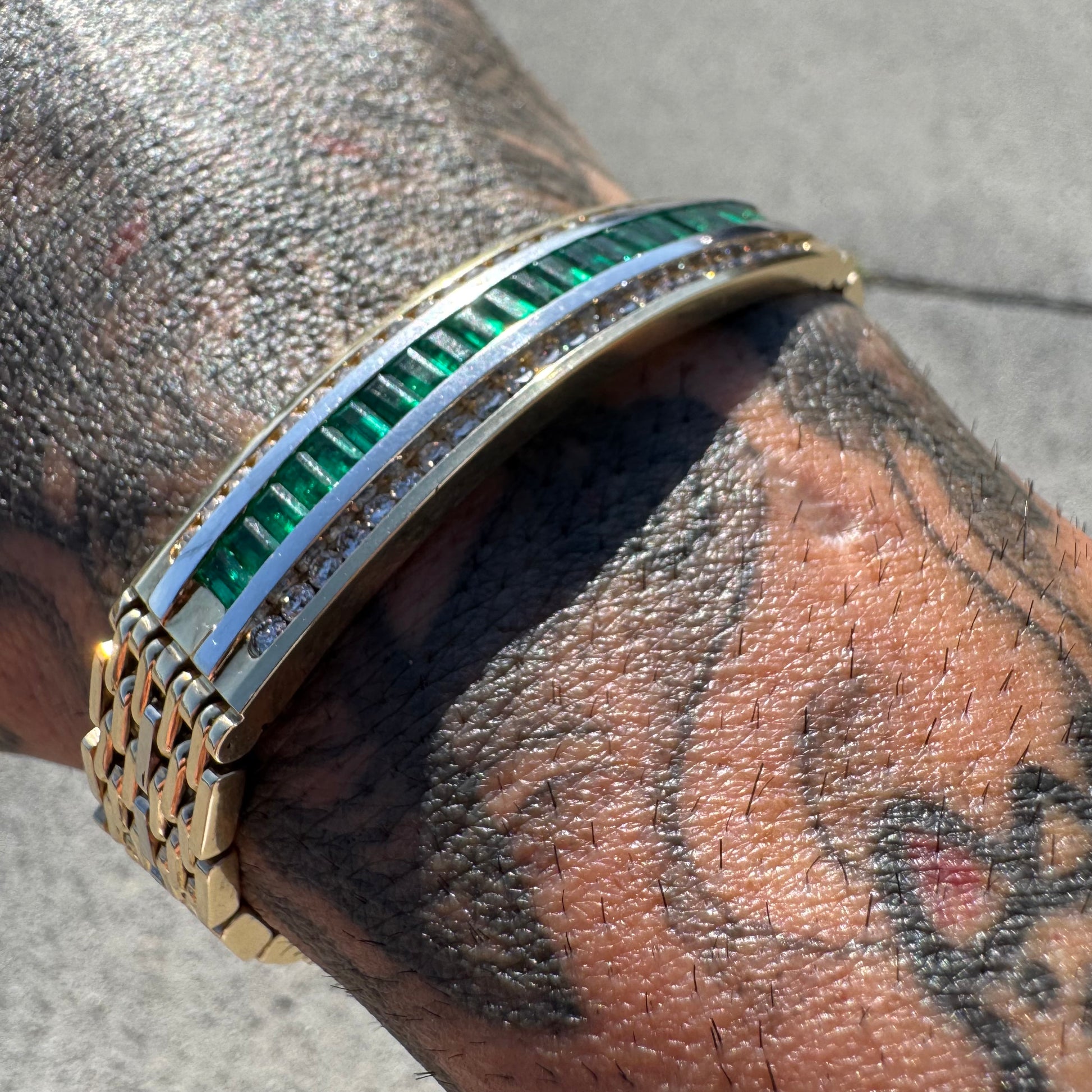 This piece is in near mint condition, though these pictures are great and the bracelet speaks for itself it truly does no justice to how beautiful and even better it is in person. Encrusted with 22 super clean and vibrant natural baguette cut emeralds at around .11ct each (2.5ctw) and 44 crisp and colorful natural round brilliant cut diamonds strongly channel set on each other side of just about .035ct each (1.5ctw) bringing the whopping total up to around 4.0ctw. This is a commanding, strong, durable, heavyweight, yet elegant panther link style bracelet with double sided safety latched clasp (if you look at picture #17 you can see the female side of the clasp has little to no scratches revealing that this bracelet looks to hardly have ever been worn). Measuring approximately 8.25” end to end the bracelet fits at a 7.75” with a heavy build of 49.7g and a thick and wide 12mm x 2.5mm. When you put this bracelet on you truly feel your spirits lift up, your shoulders elevate into a confident position, and your enlightenment boost with this gorgeous yet fierce vibe that this piece of jewelry delivers. A timeless piece that will be passed down in the family for generations to come, whoever is wearing it will be complimented no matter what crowd they encounter or room they enter.
