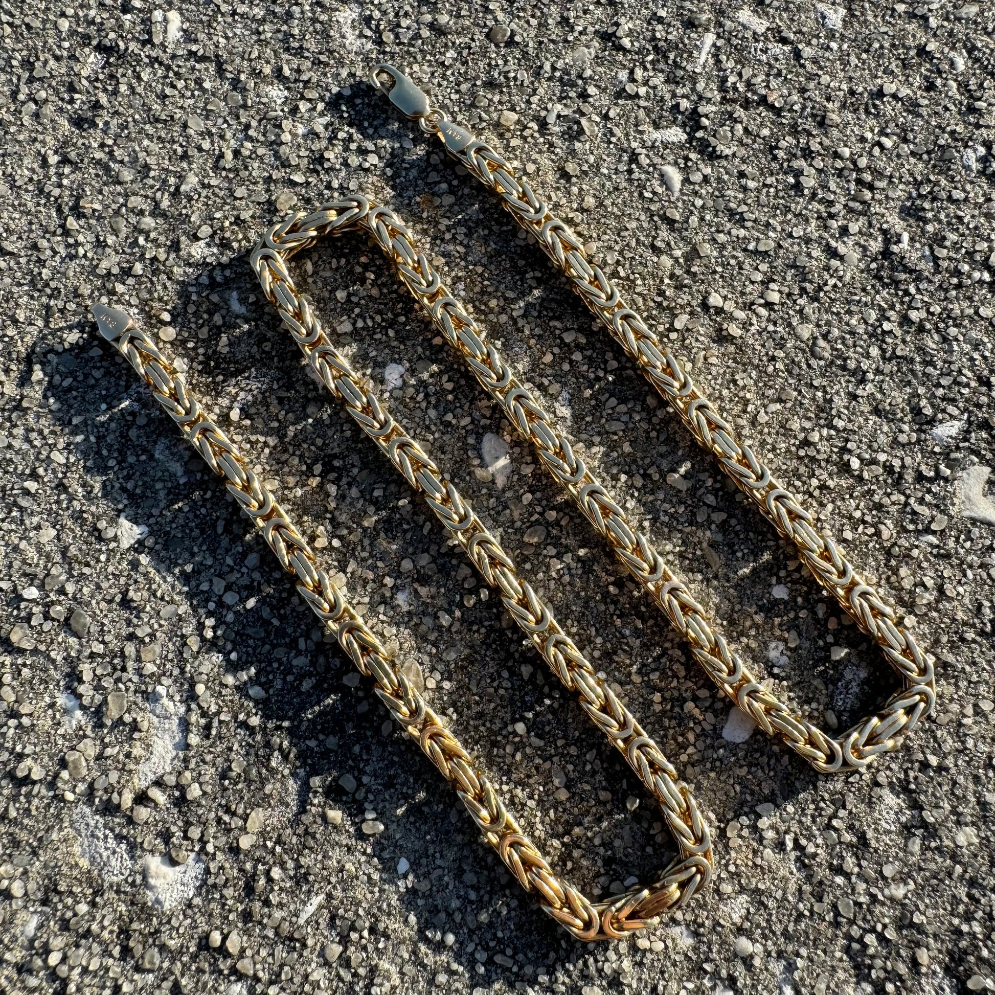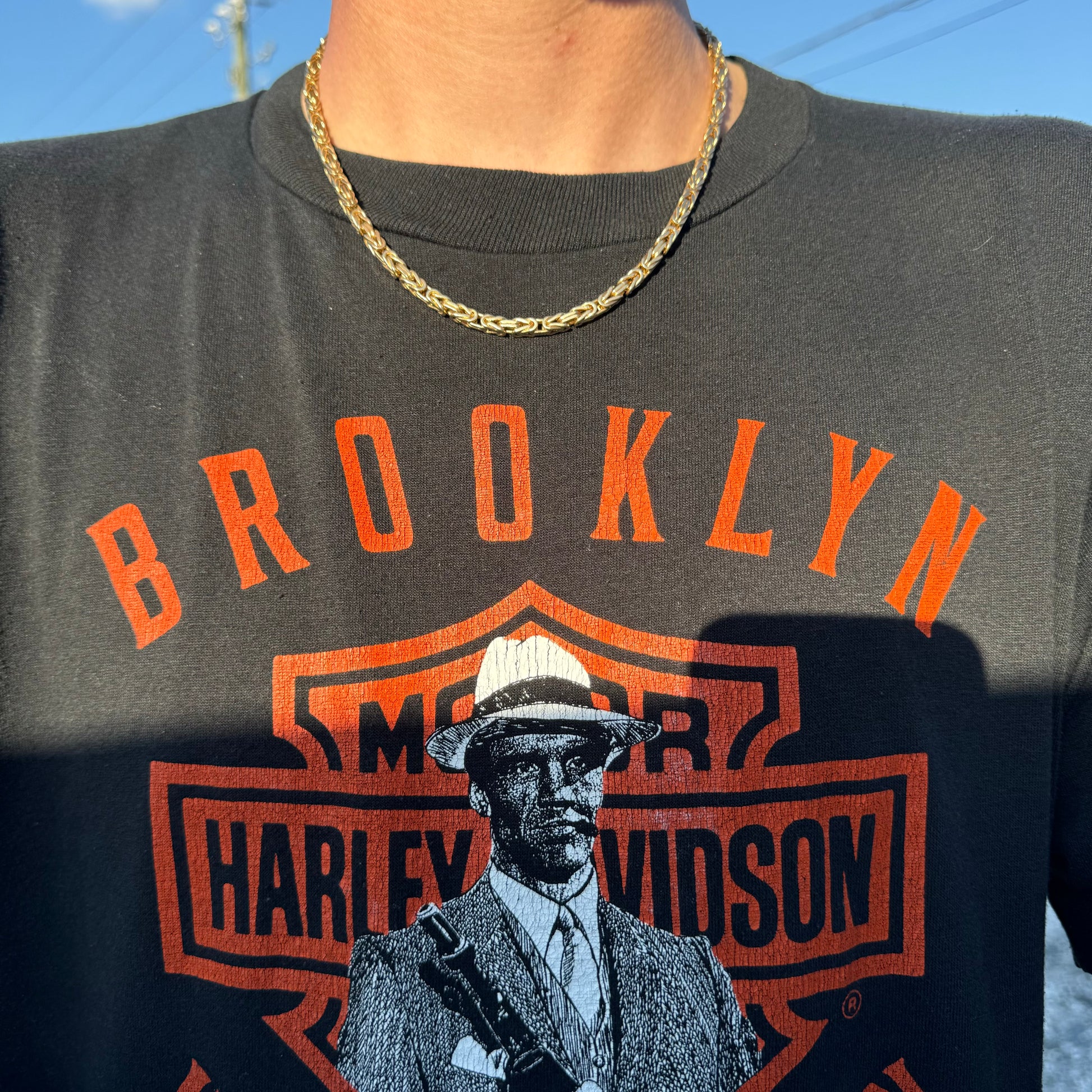 In my opinion this is one of the best necklaces I have available site wide. It hits all the checkmarks and is one of my most sought after link styles when I’m sourcing my inventory. The Byzantine link is the hardest and least cost effective link for any jeweler to make and one that is not often made anymore because of this. Due to this fact you don’t see them unless looking at older estate jewelry and when you find them and they have higher premiums than any other link style. This piece was crafted out of all solid 14k yellow gold some time around the 1990’s with Italian hallmarkings and strong lobster clasp. At an unusually hard to find middle of the road size at 19” long with a thick circumference at 4mm x 4mm and weighing in at a heavyweight of just under 52g. With a very buttery yellow gold tone the high mirror polish finish gives that added flash of sunlight and glow to the necklace as it bounces of its classic rounded edges. This one stands the test of time, is in excellent condition now and will continue to stay in excellent condition as you pass it down from family member to family member and watch it grow in value exponentially.