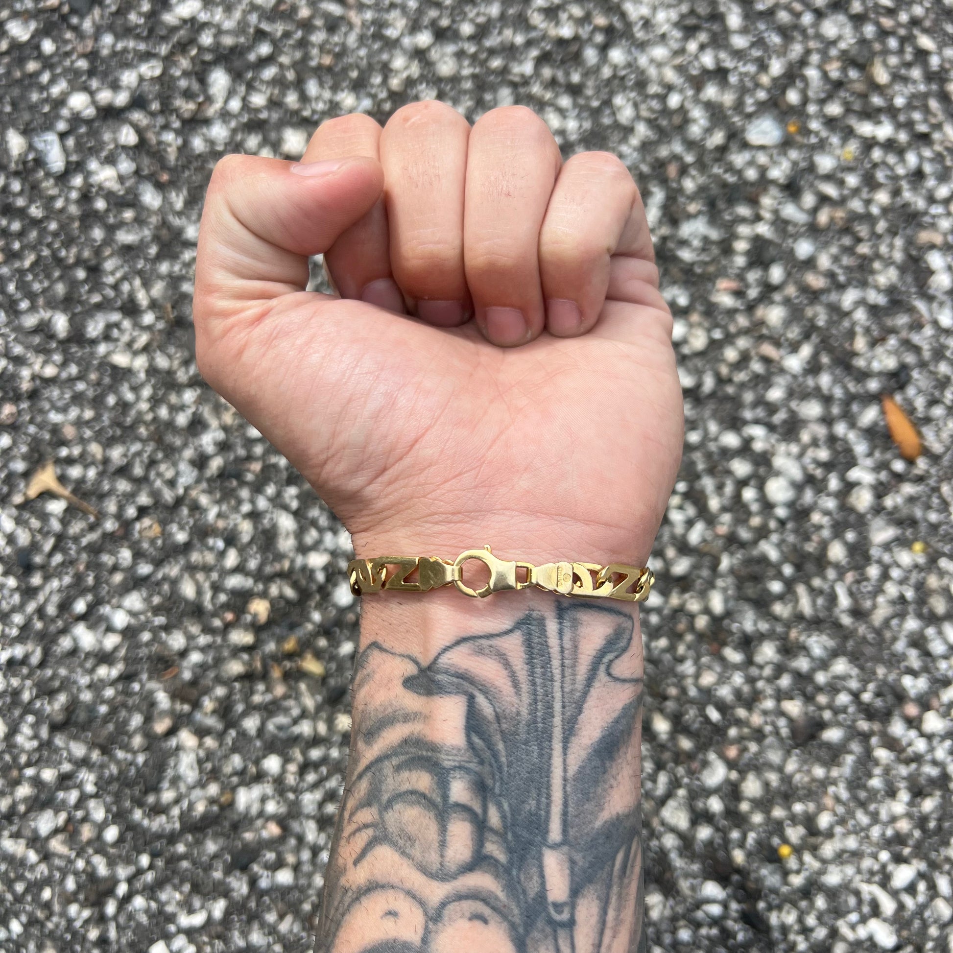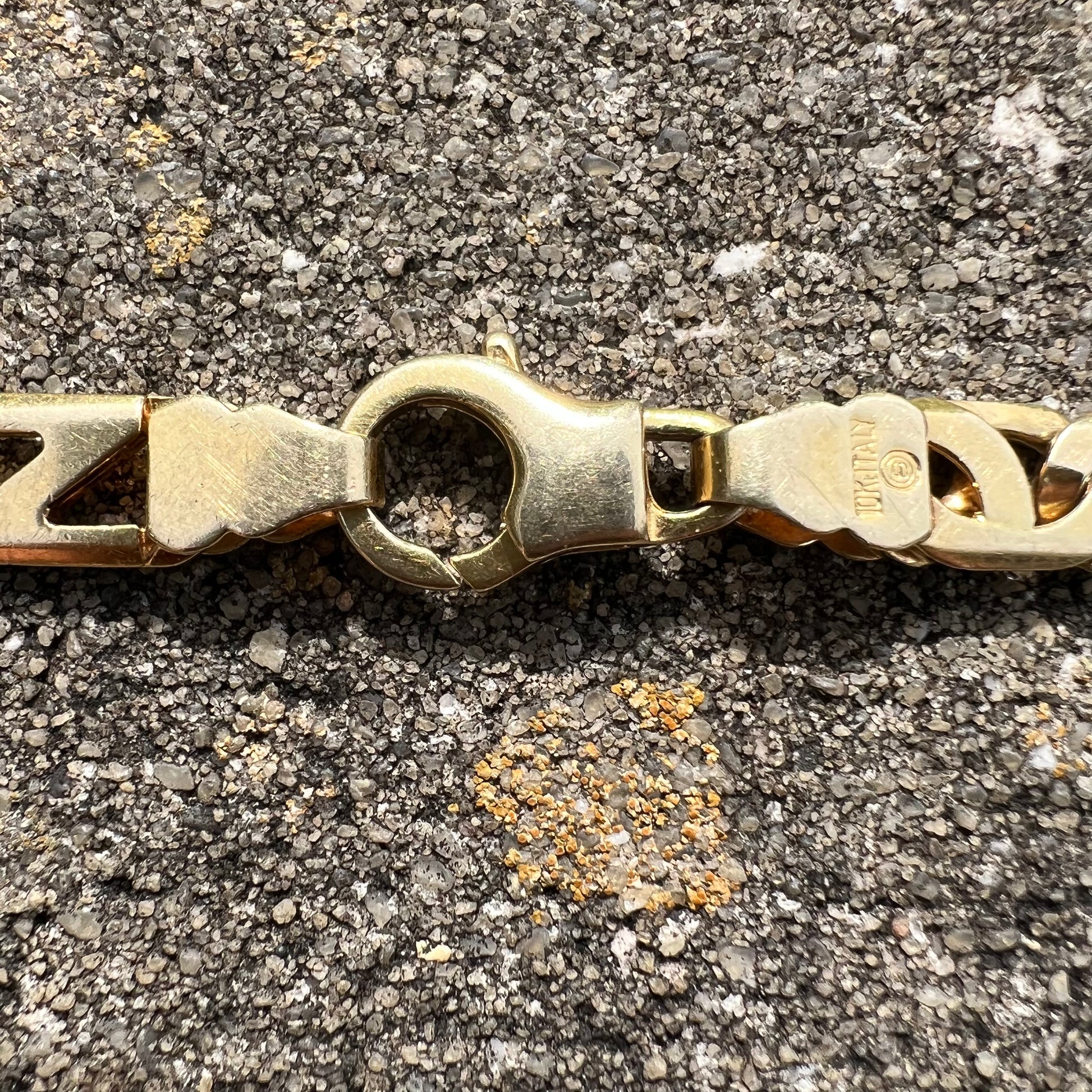 Produced with the strongest purity of gold alloy at 10k this vintage tigers eye mariner link bracelet is extremely heavy duty. With a beautiful deep Italian golden yellow, chunky, and strong bubble backed lobster clasp this is a bracelet for daily wear for those who work with their hands and aren’t afraid to get it banged around because trust me, this bracelet could take whatever pressure that gets thrown at it. A very unique and cool link style this bracelet weighs a hefty 19.61g and is a longer length at 8.5” by 7mm.