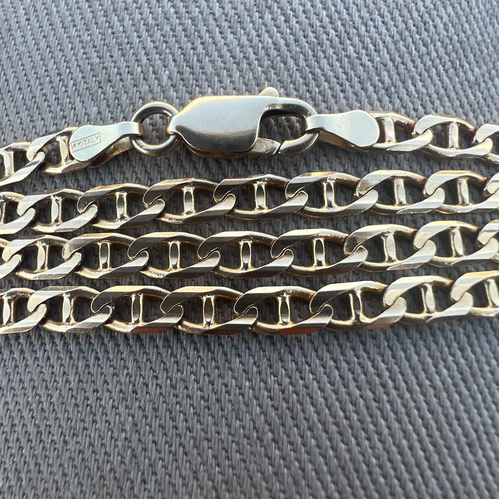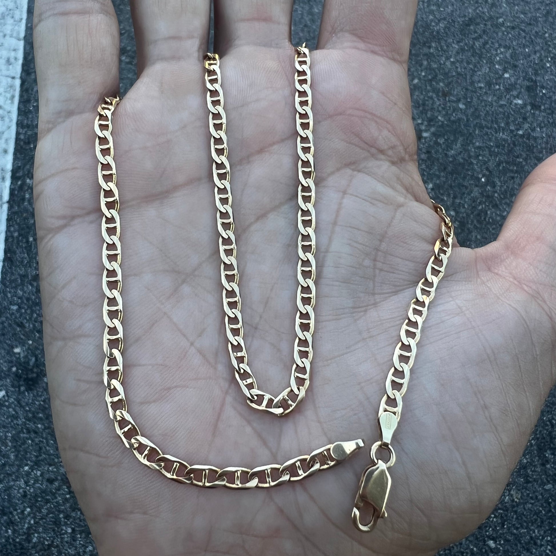 Finely crafted out of solid 14k Italian gold with beautifully cut beveled edges is this designer made mariner link necklace. Measuring 18.5” and 3.5MM wide and just shy of 11g it really is the perfect size chain in all aspects.