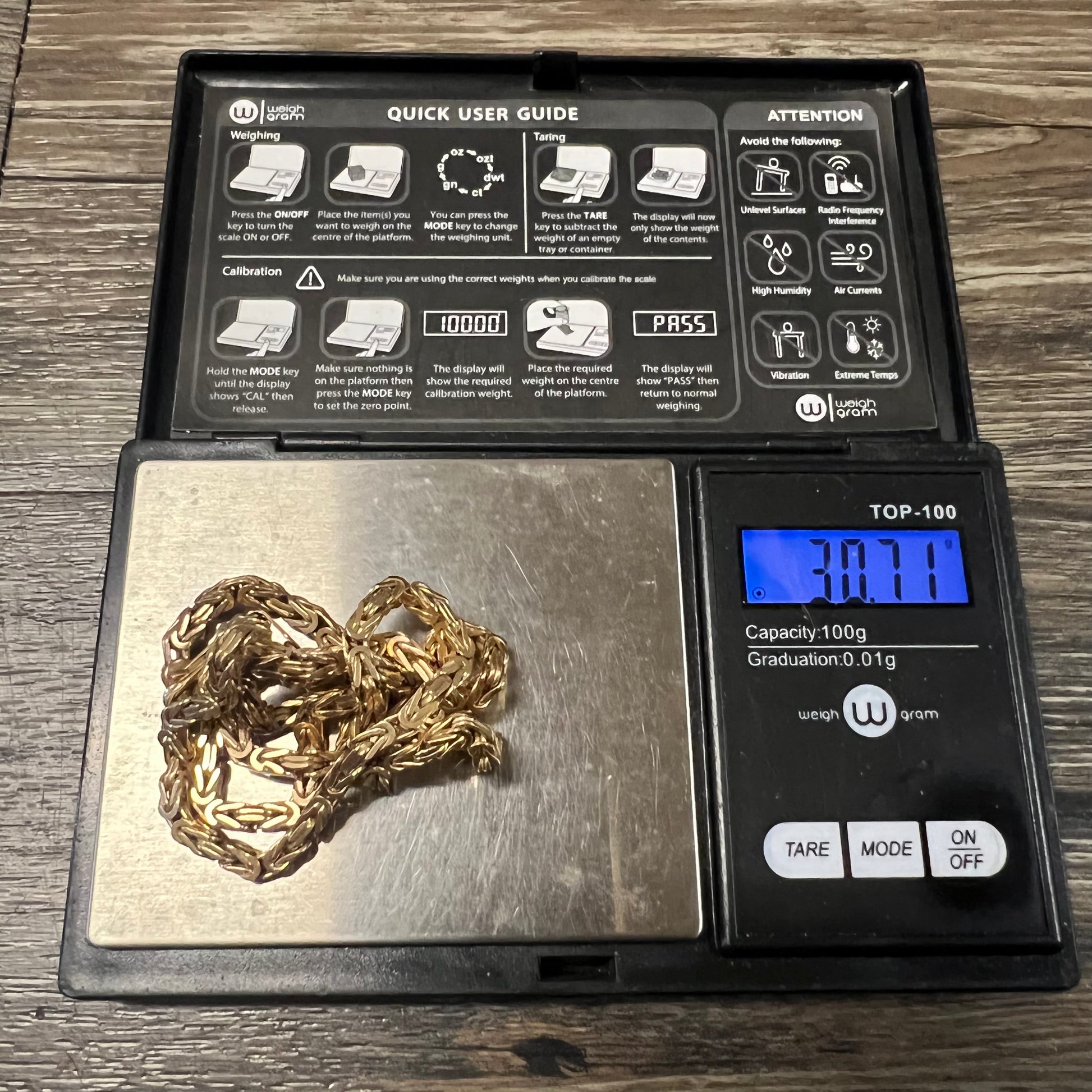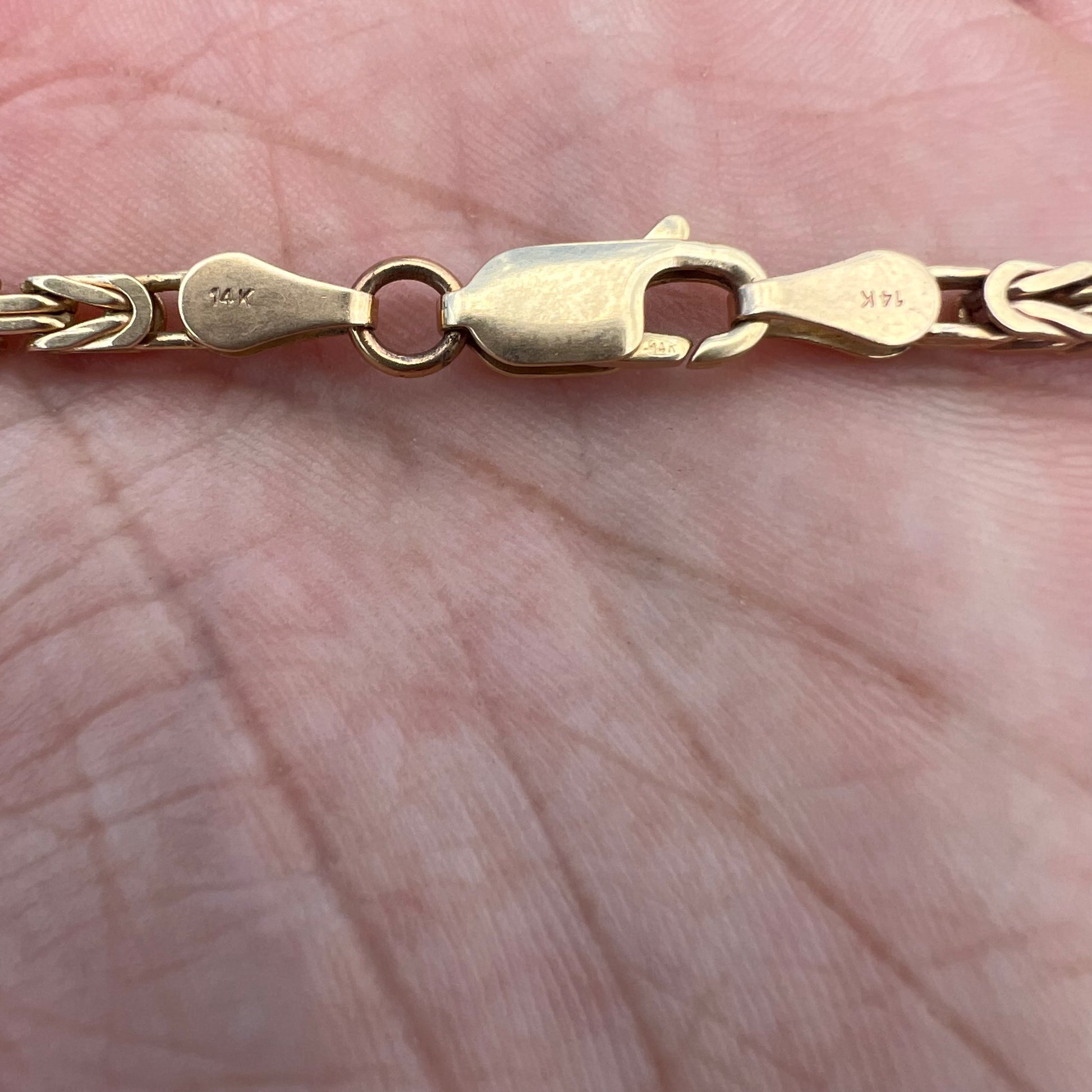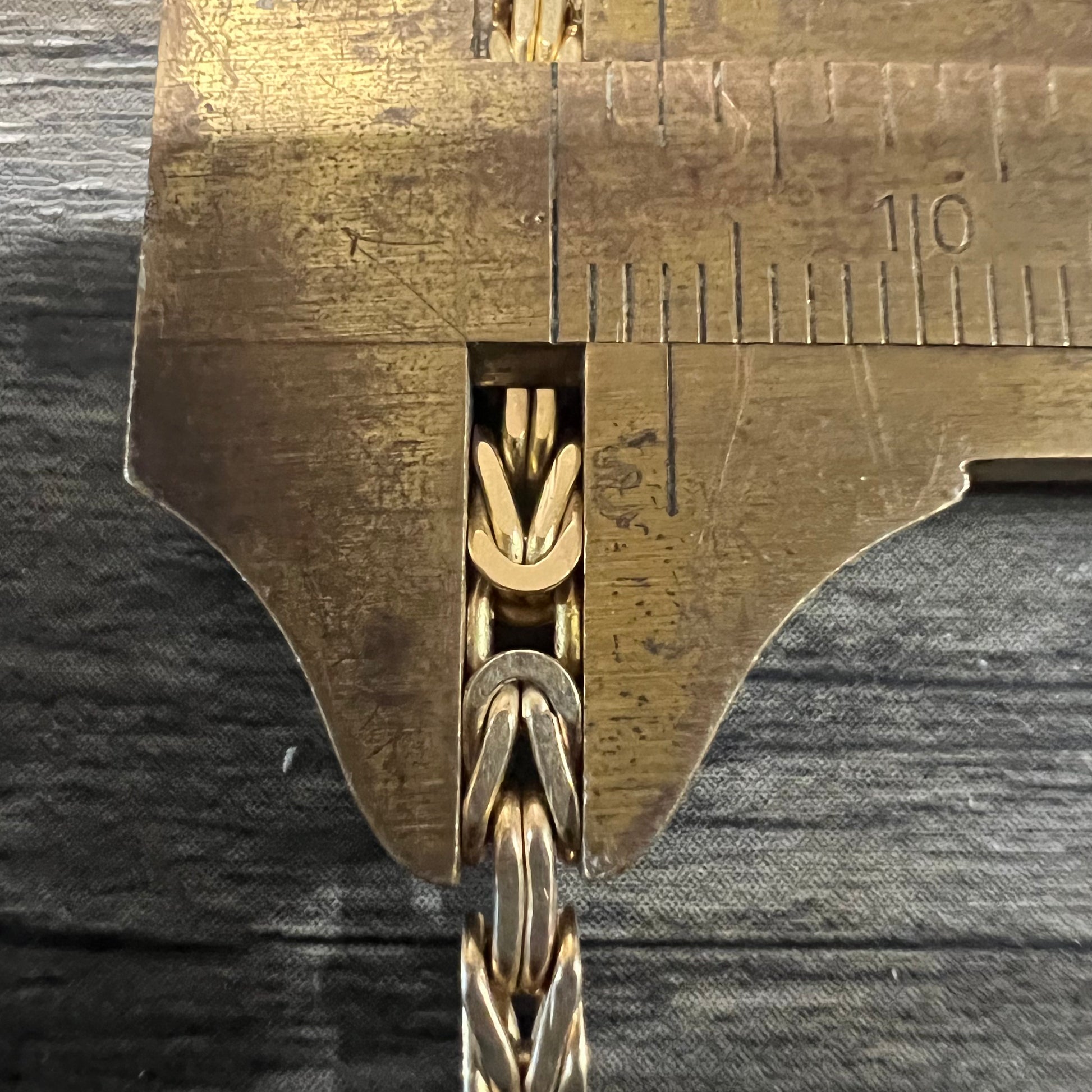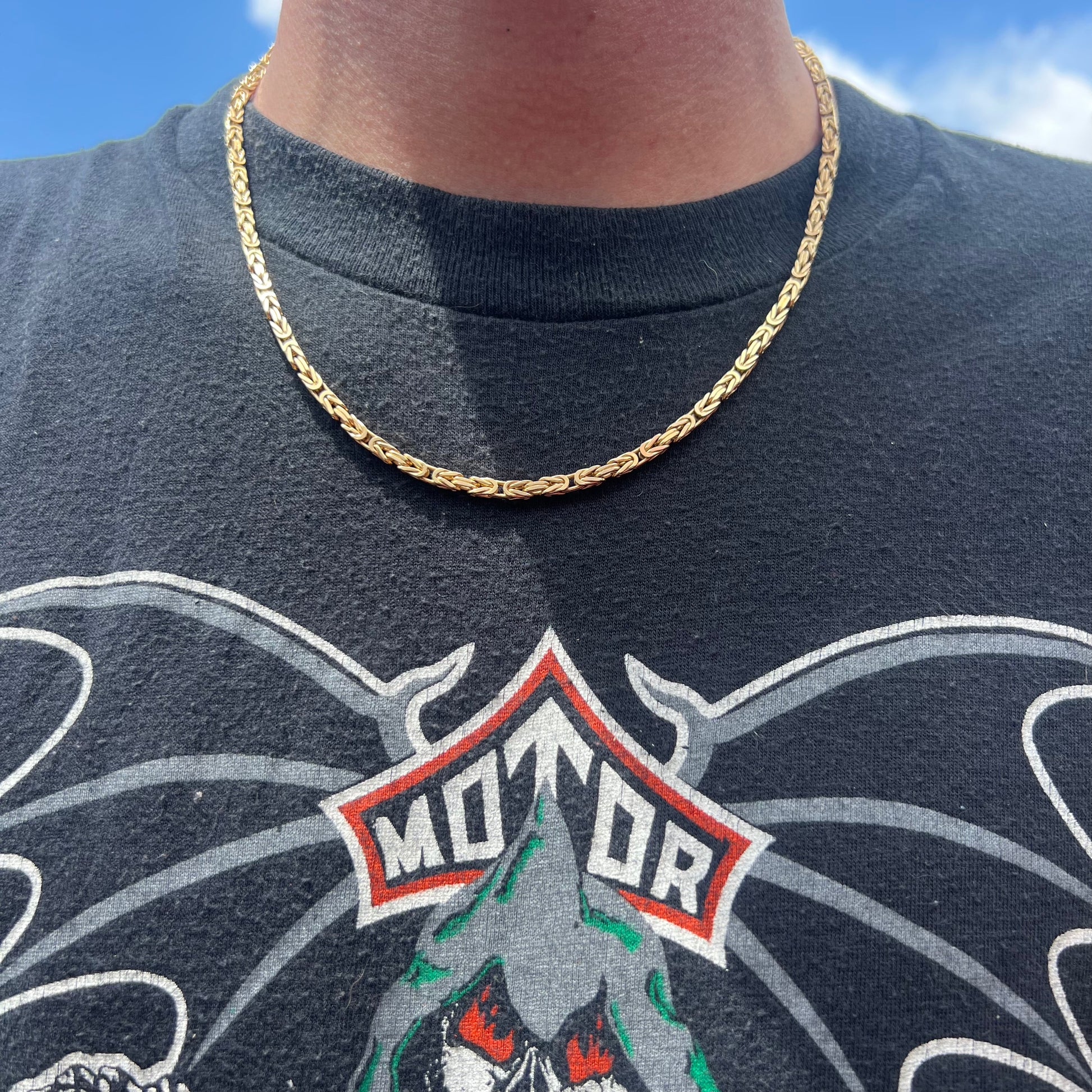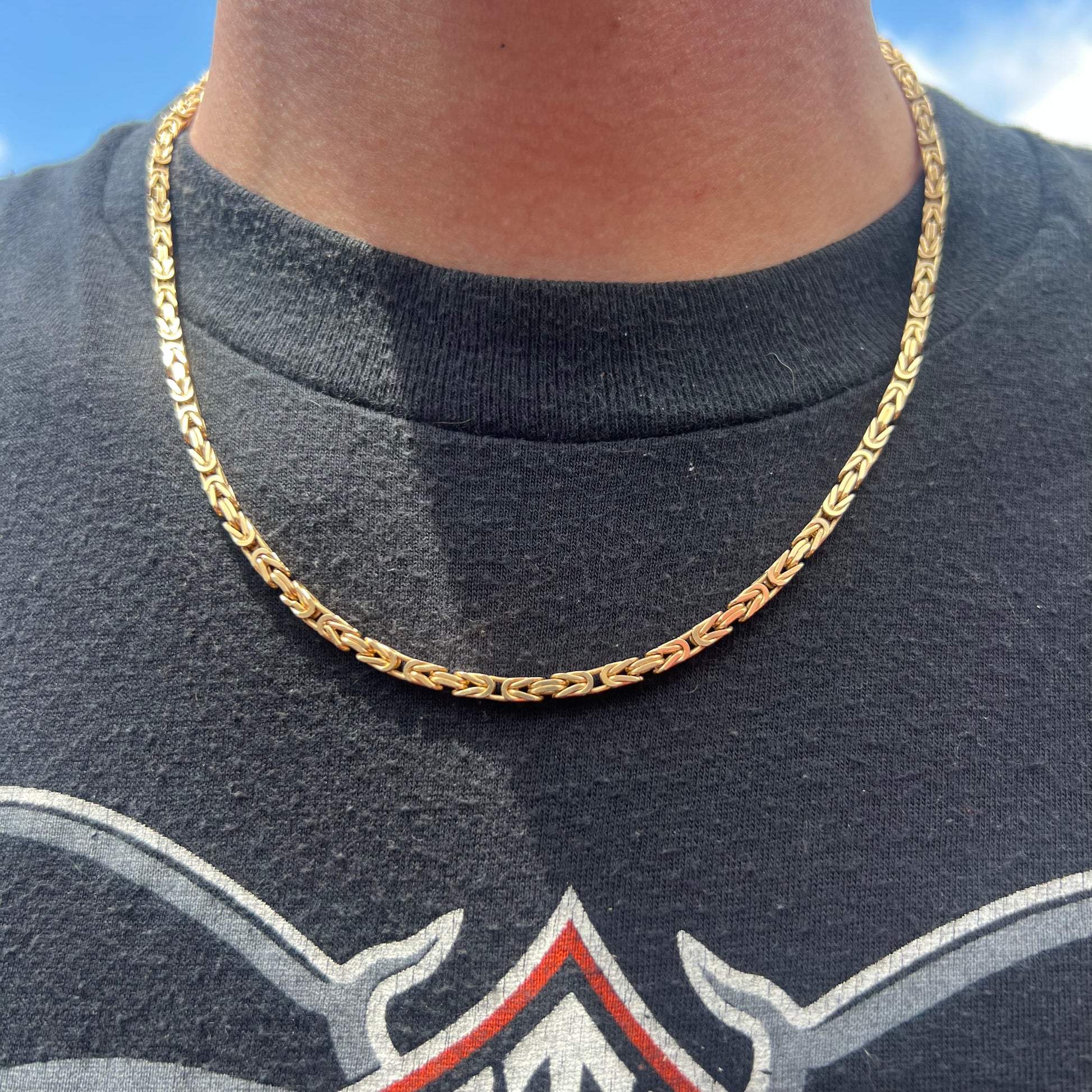 One of the most sought after and demand link styles of the past, present, and future the old school BYZANTINE link. Heavyweight At just under 31 grams, thick and chunky at 3mm X 3mm, measuring at a great average length for everybody at 19.5”. Looks great either worn solo, layered with other chains, or with a pendant on it. This necklace came from my personal jewelry box because it’s just that damn good.